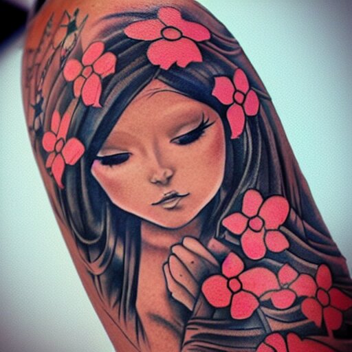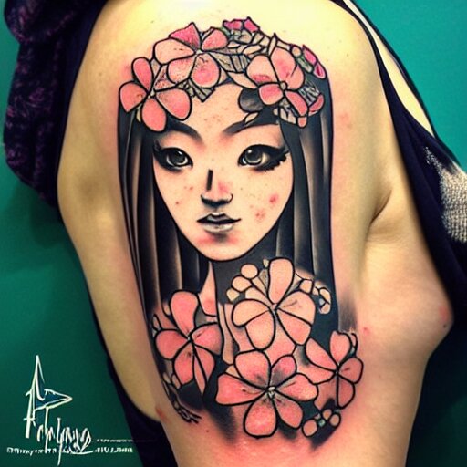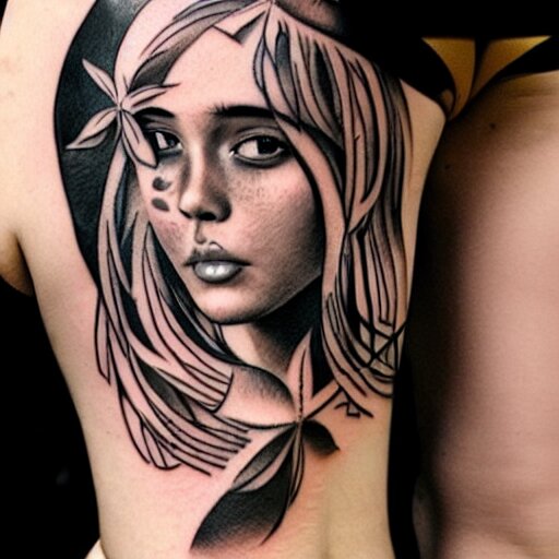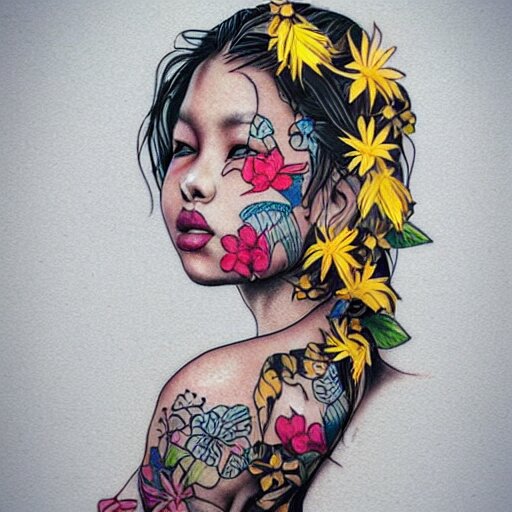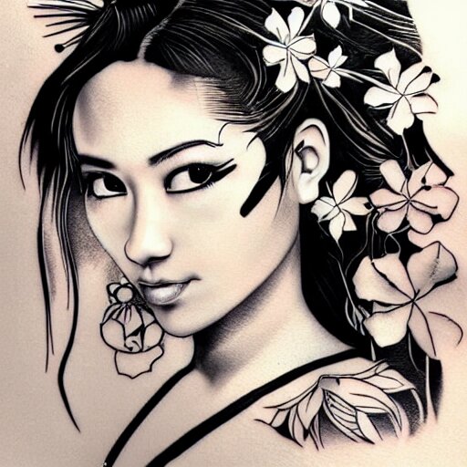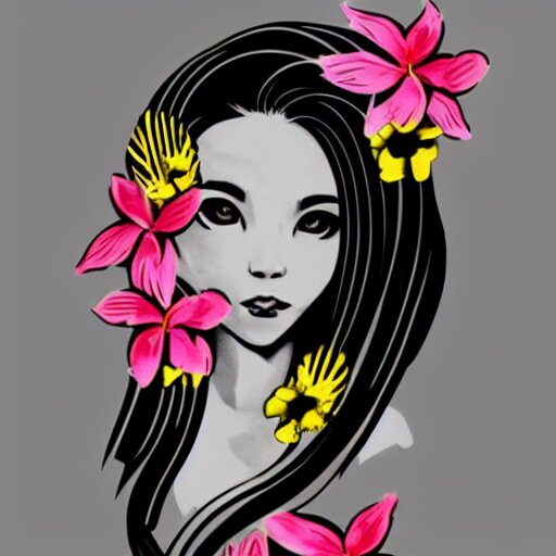 Tattoo design, stencil, beach photography, tattoo stencil, traditional, beautiful portrait of a traditional hawaiian girl with flowers in her hair, upper body, by artgerm, artgerm, artgerm, digital art, cat girl, anime eyes, anime, sexy, super model-s 100