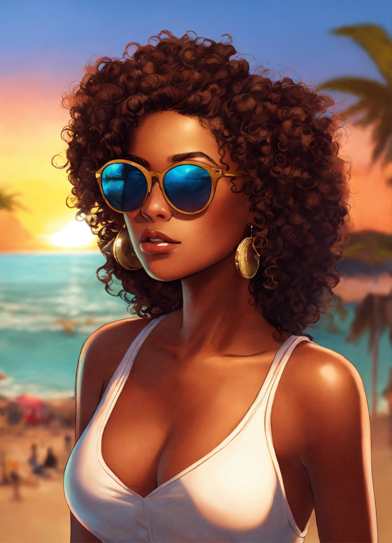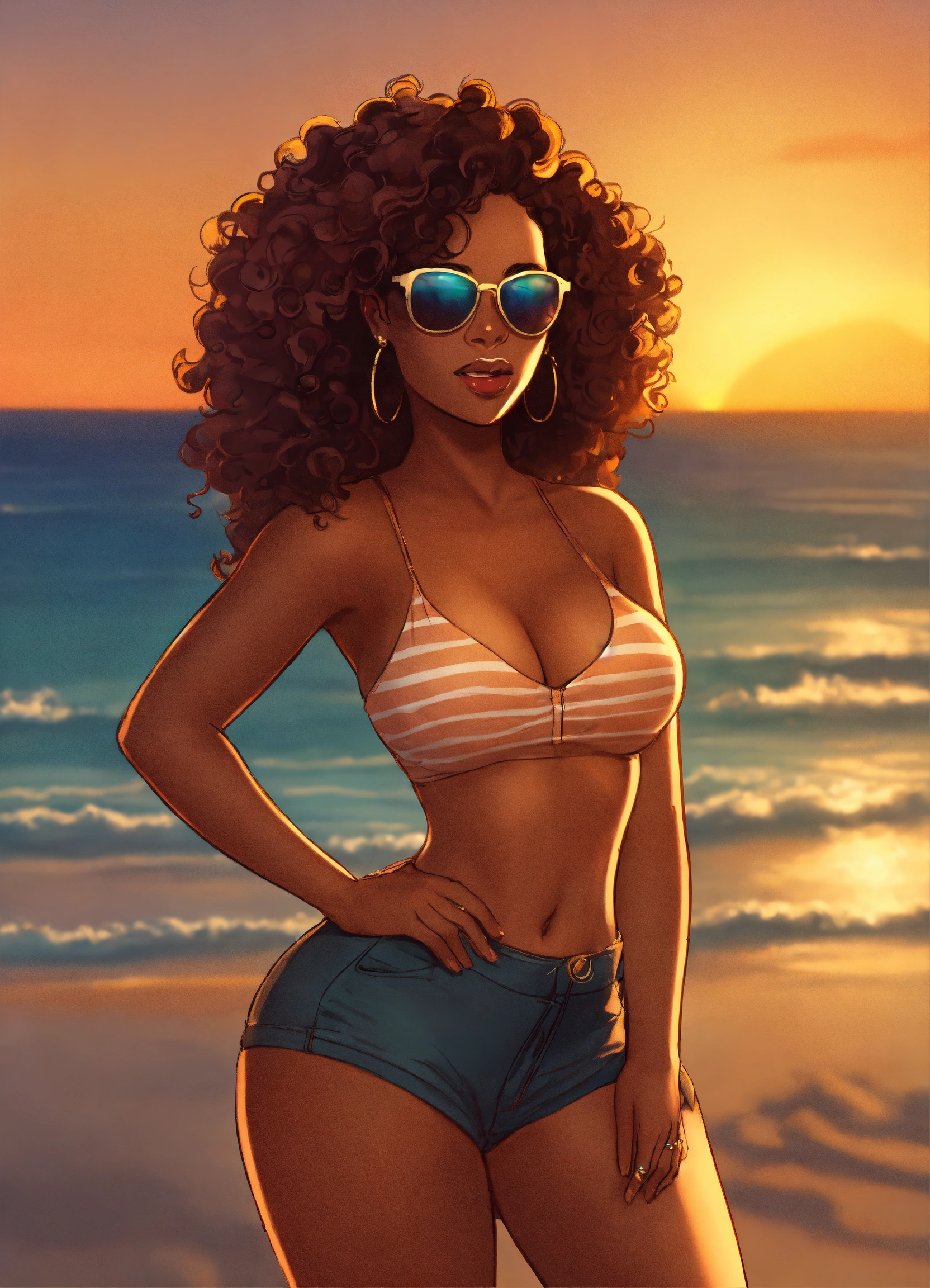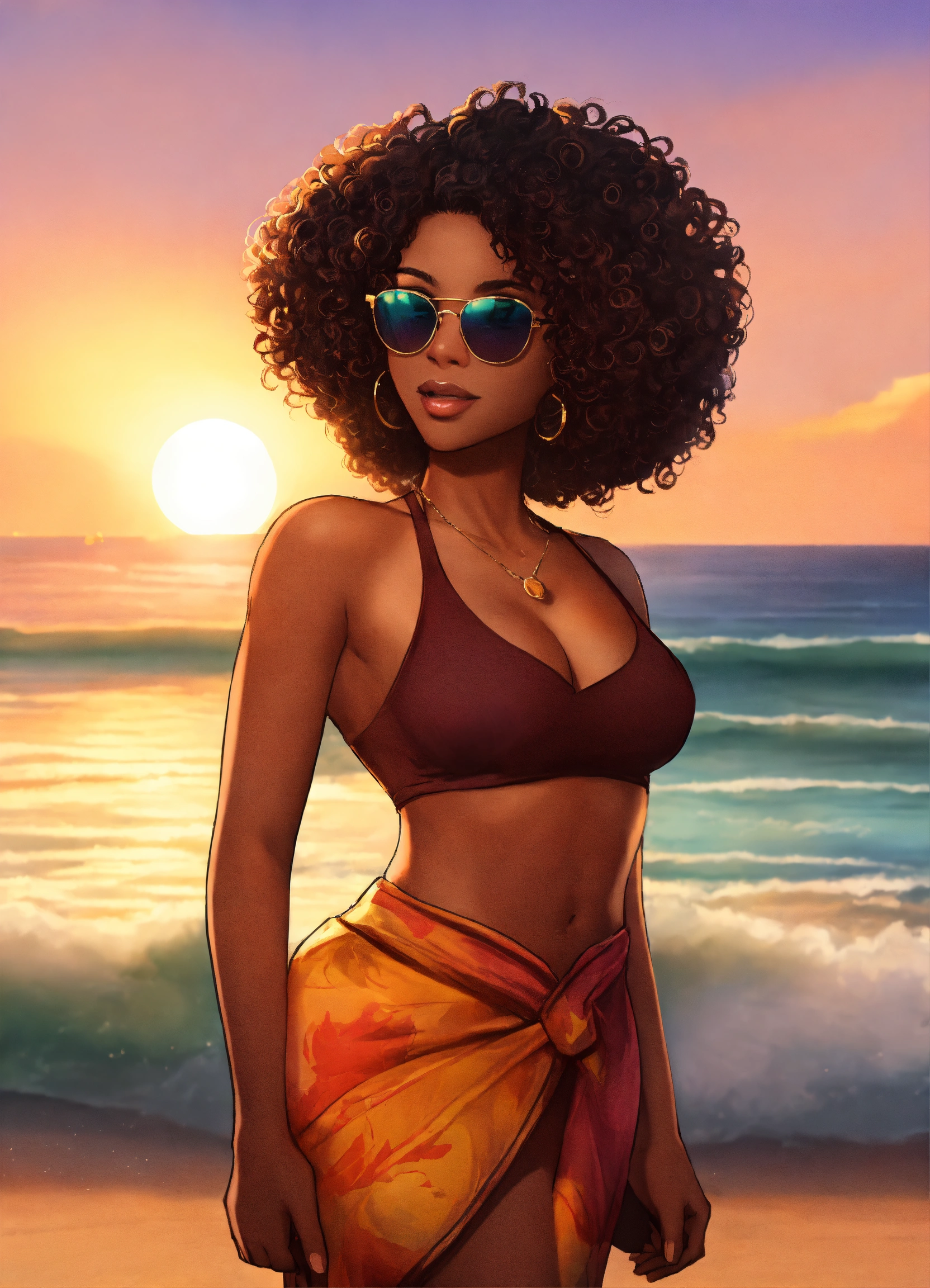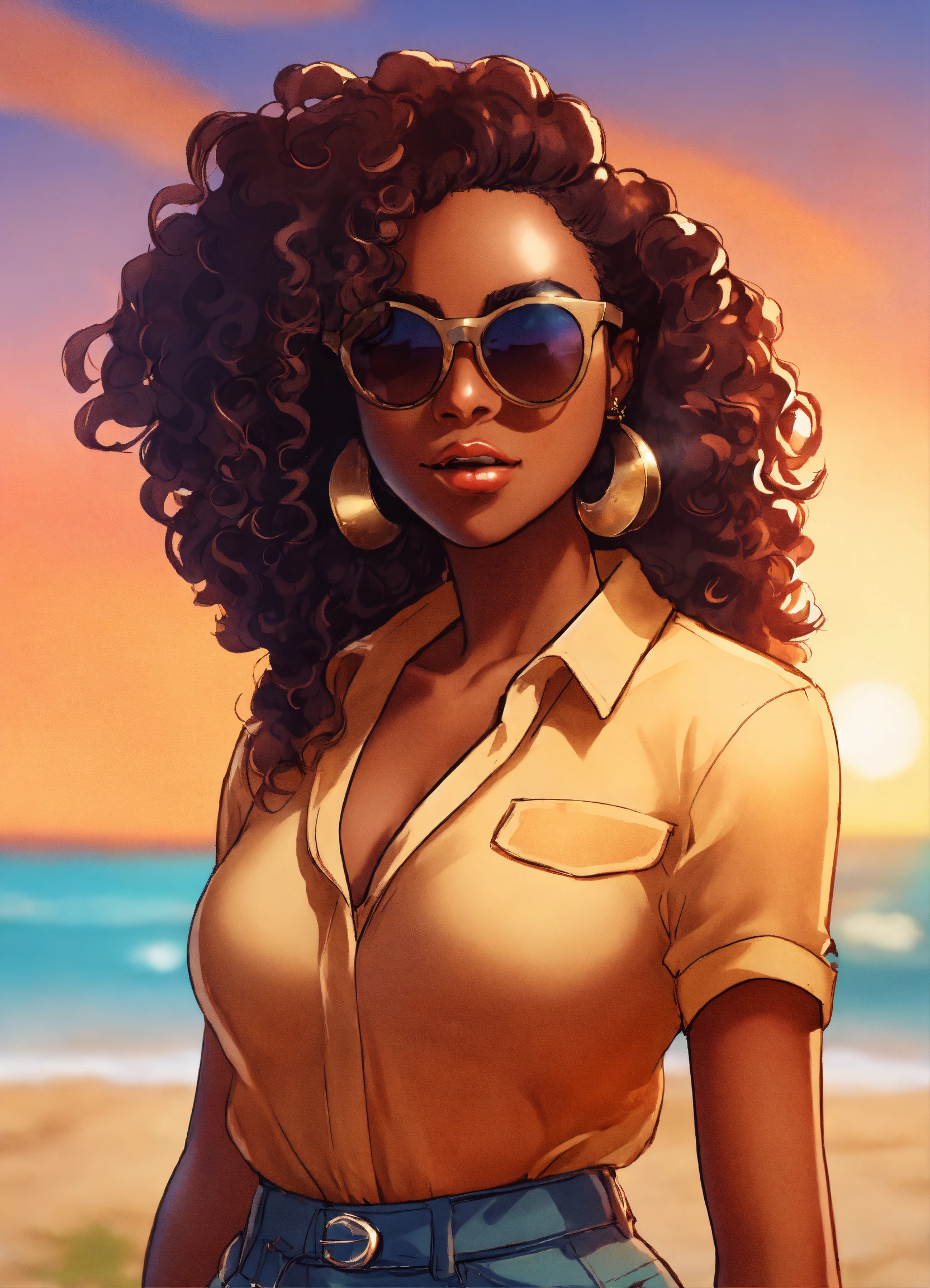 Ebony, gorgeous 40s woman, sunset beach background, curly hair, sunglasses, standing, facing front. hd, cartoon, body asymmetrical