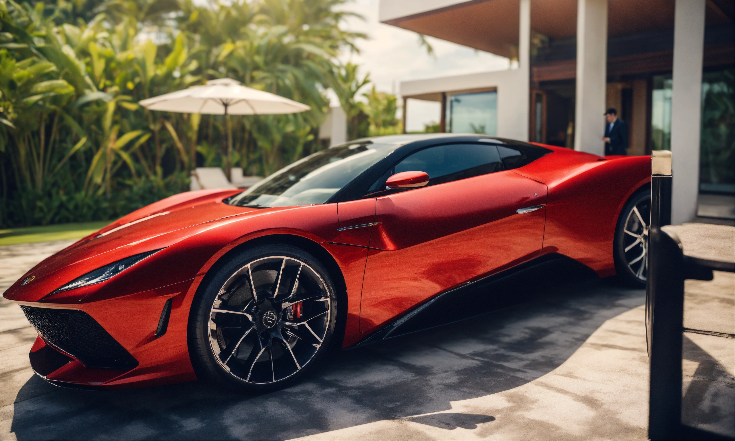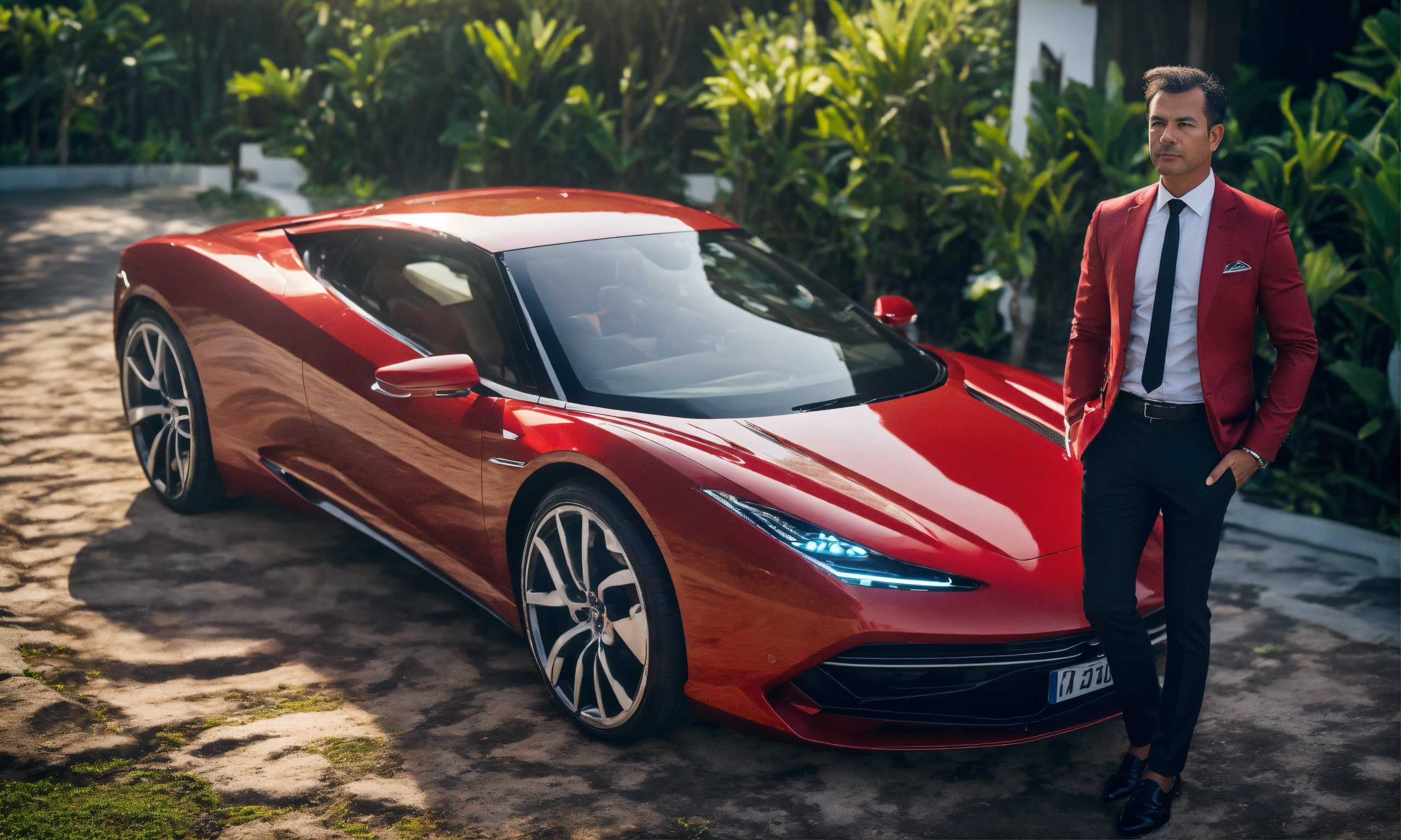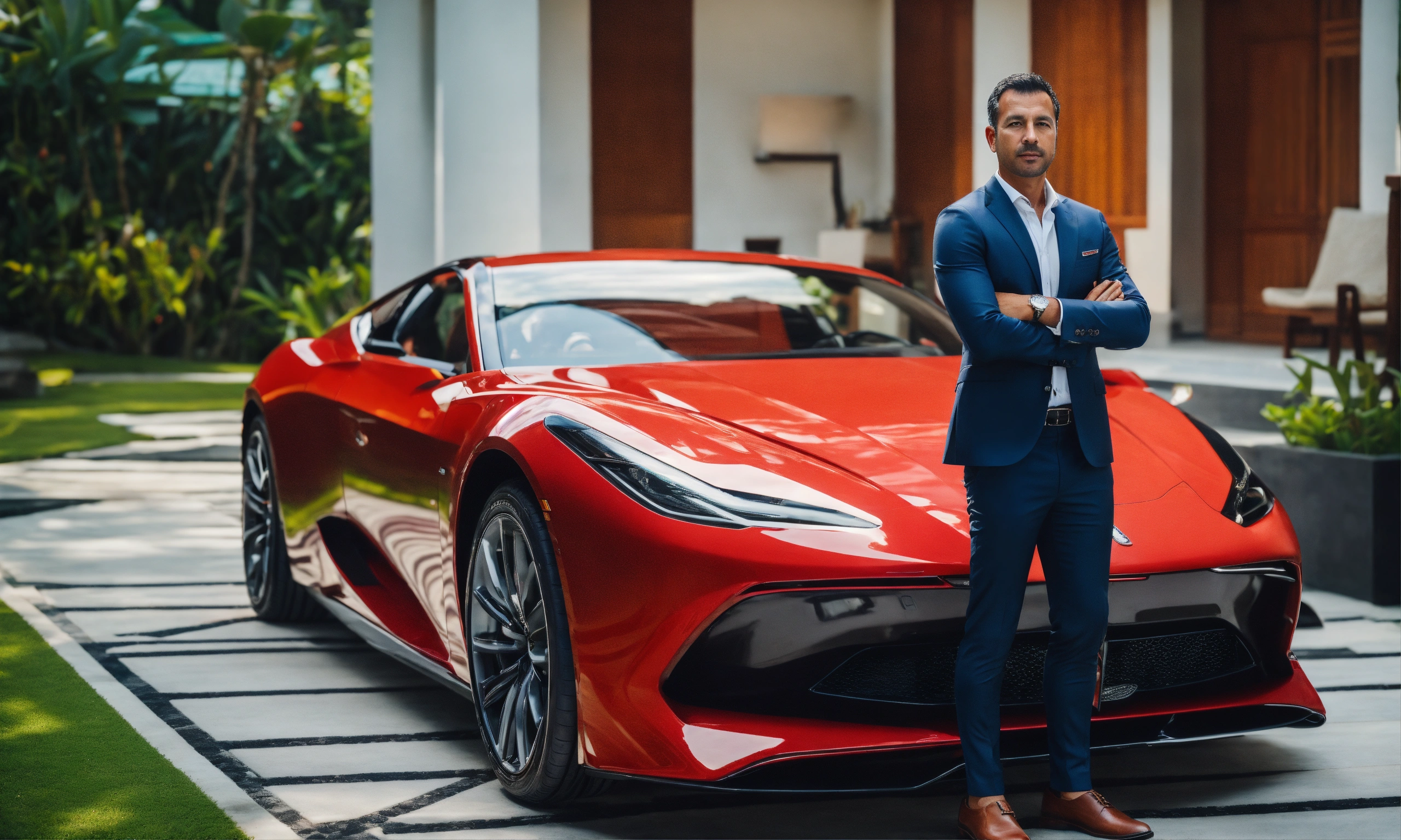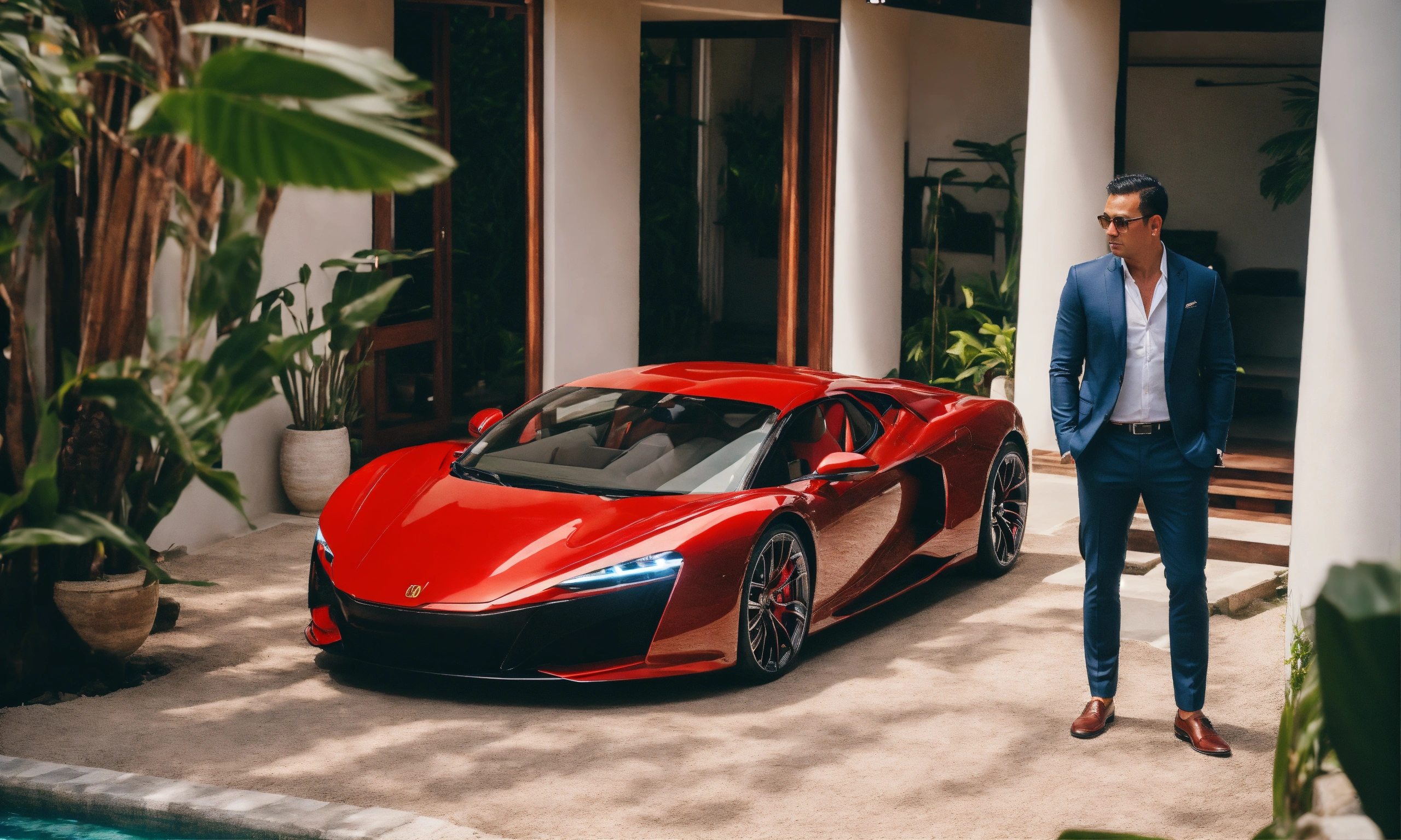 From above on the side european businessman standing at his villa in bali (indonesia), both hands cool in the pants, behind defocus very modern luxus villa, on the side is the red sportcar, 8k realistic, high quality, high resolution