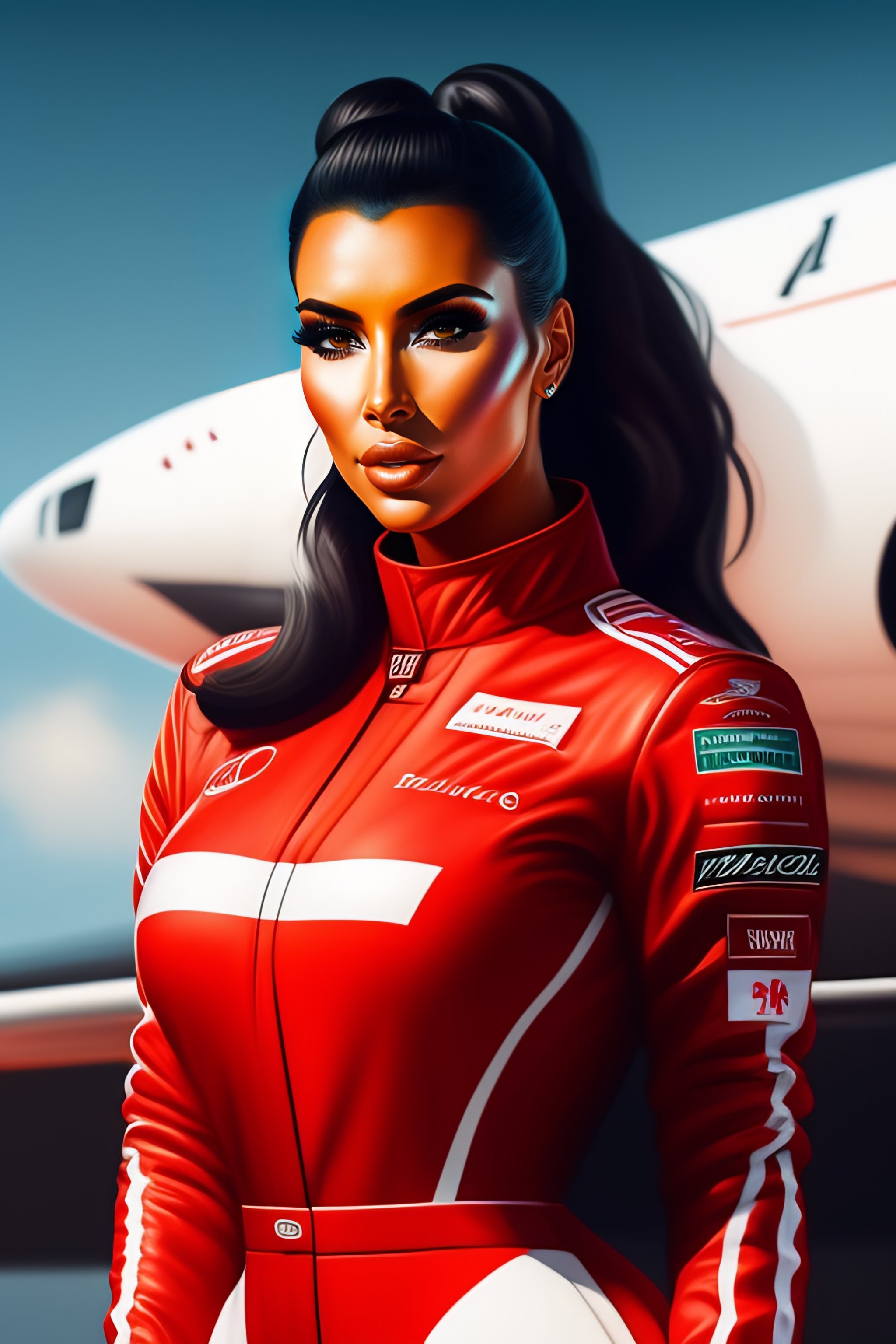 Kim kardashian as a formula 1 professional, full body view, wearing in red pilot suit, little chickens in background, art by caravaggio, rossdraws, artgerm.