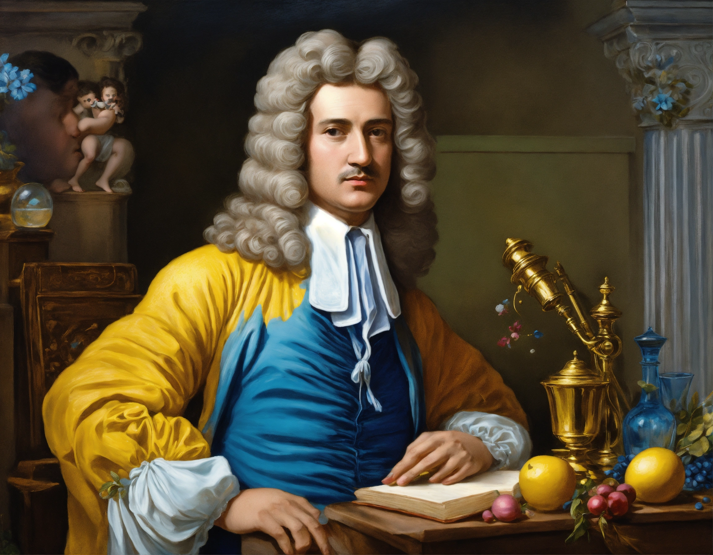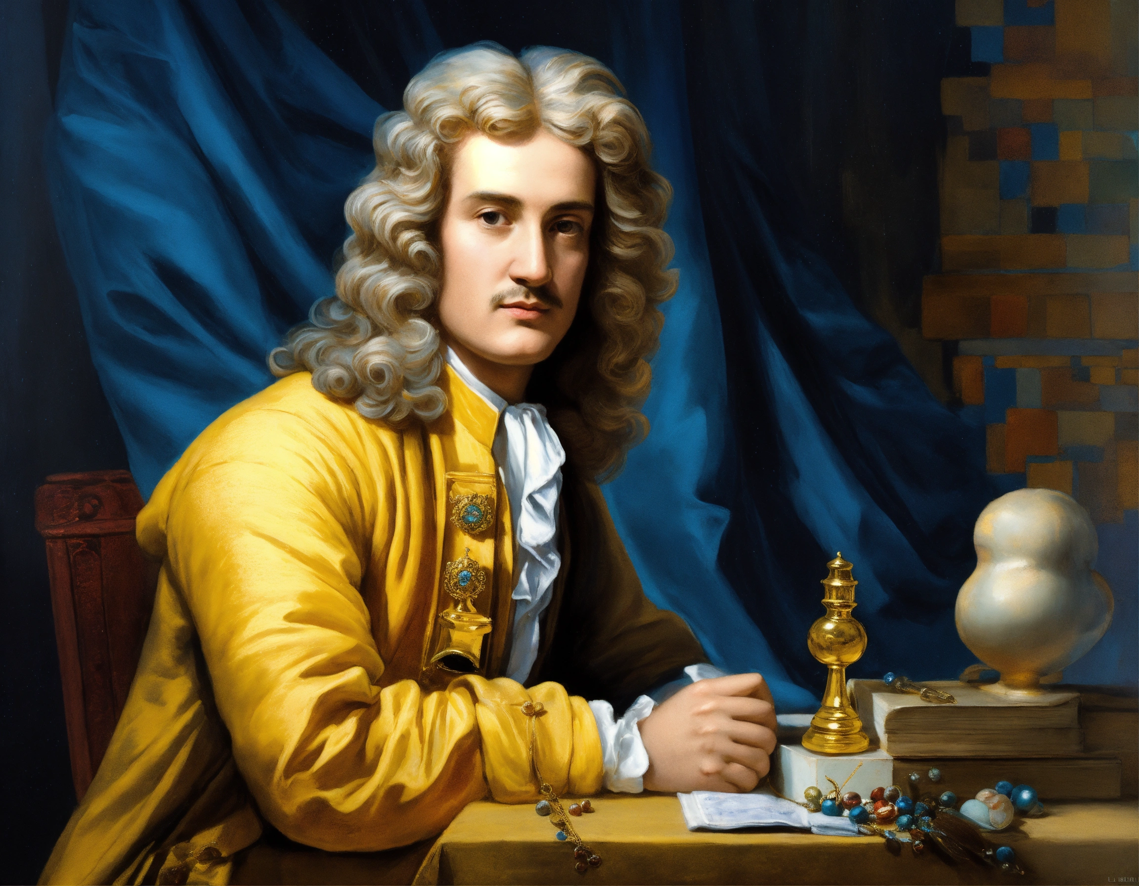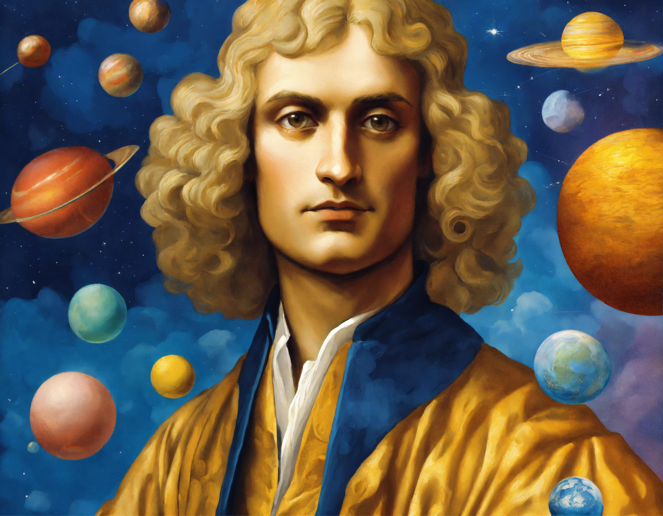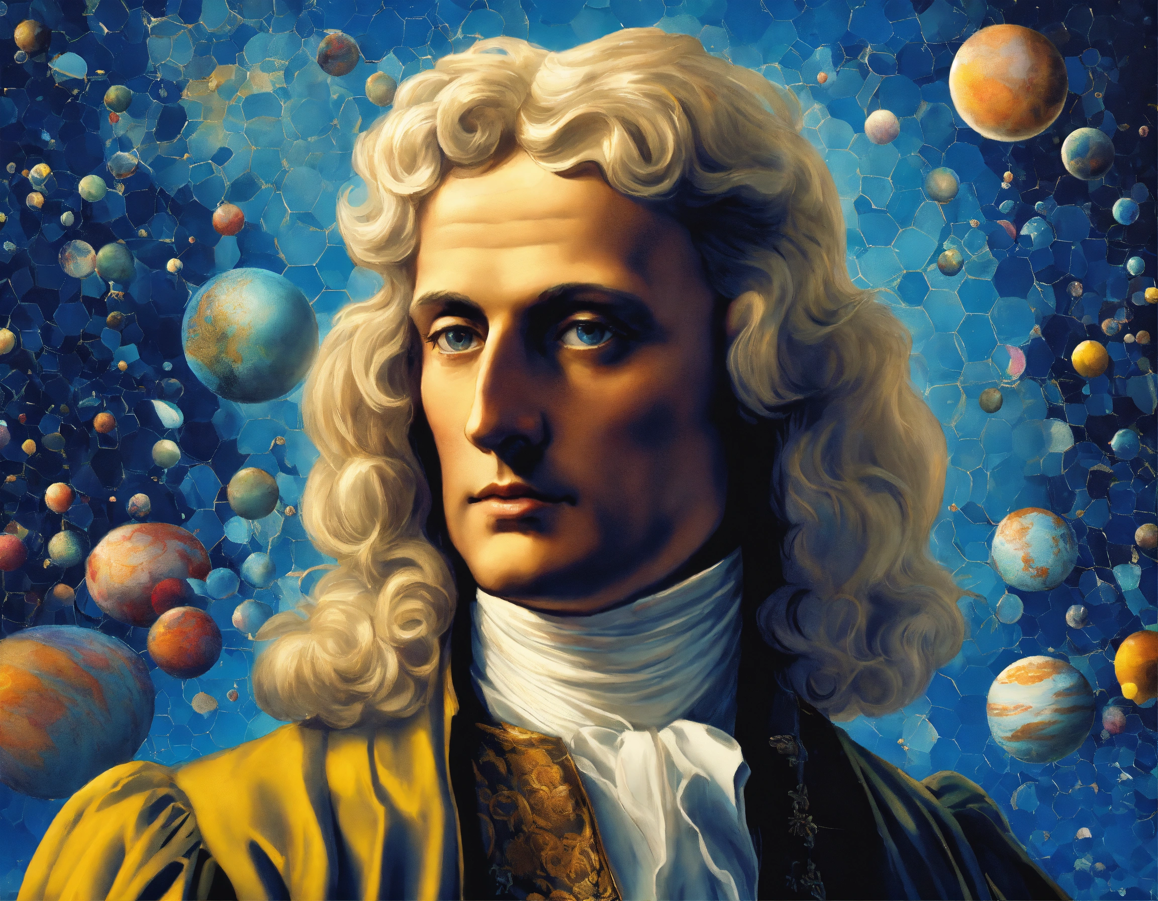 Isaac newton. fondo azul marino, textura brillante, degradado desde el centro. figuras con una apariencia tridimensional utilizando técnicas de sombreado, luz y perspectiva. colores que contrasten con el fondo azul marino, como el blanco, amarillo o colores pastel. figuras claramente visibles. estilo limpio y moderno. todos los elementos deben estar equilibrados y la imagen no esté muy cargada en una parte específica. iluminación sutil que realce las figuras tridimensionales y aporte profundidad a la imagen.