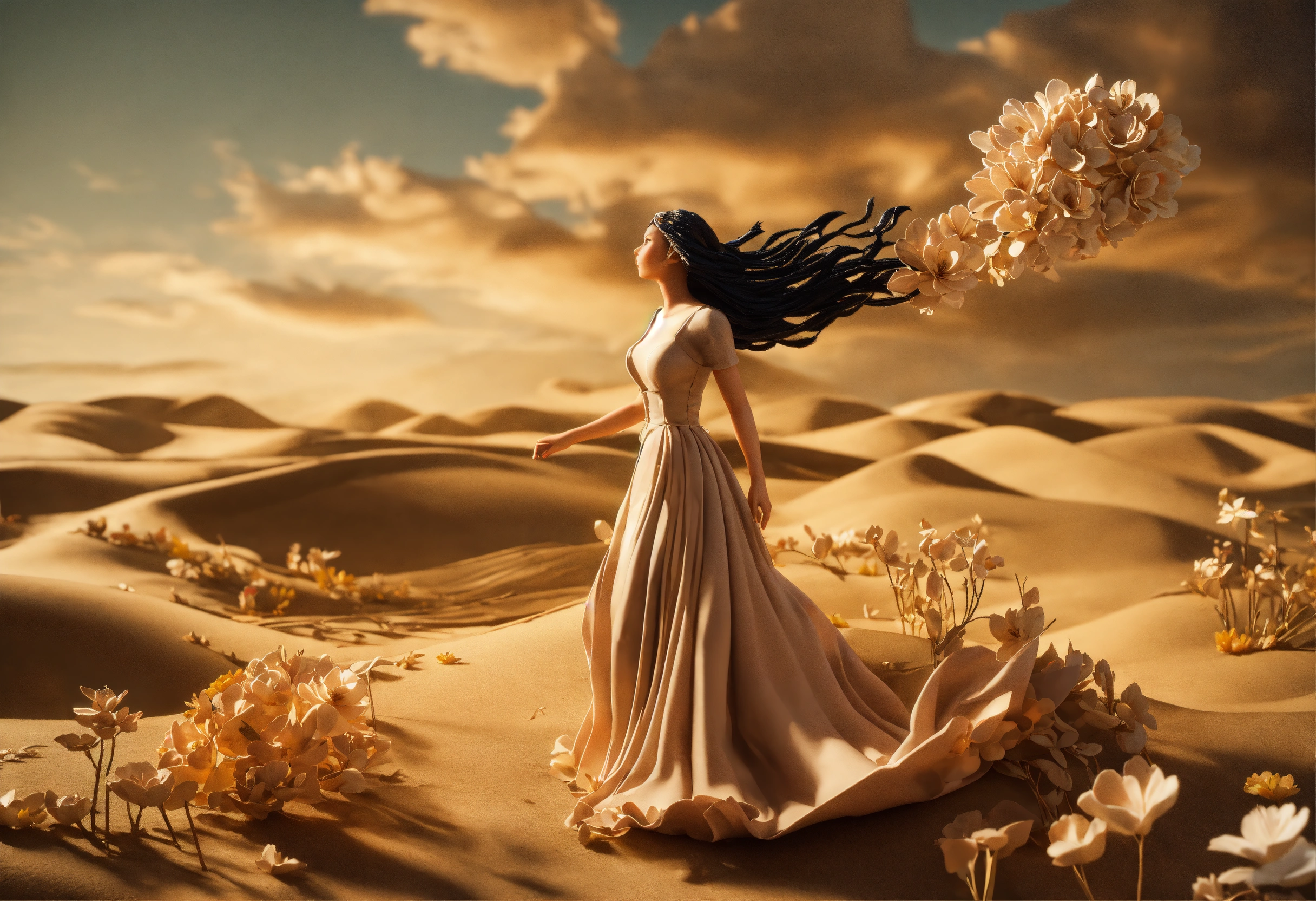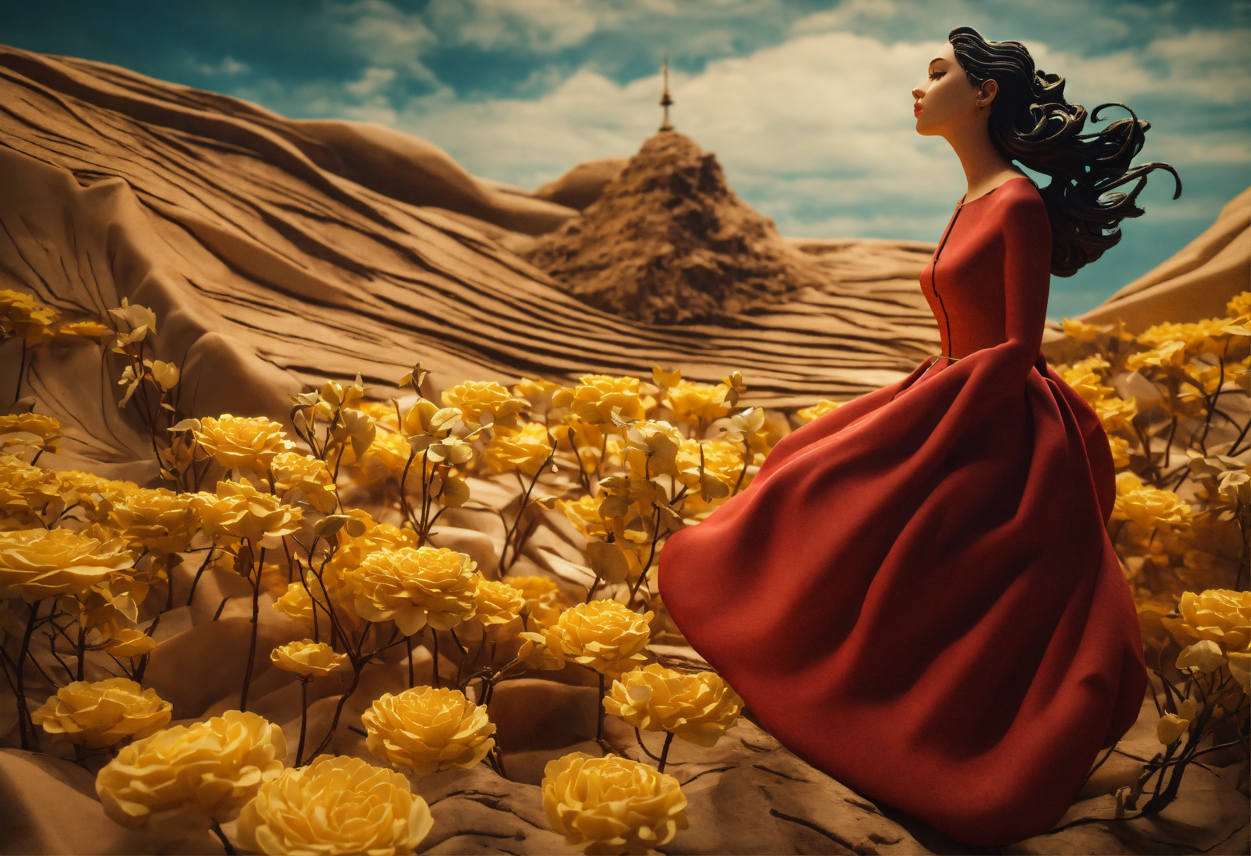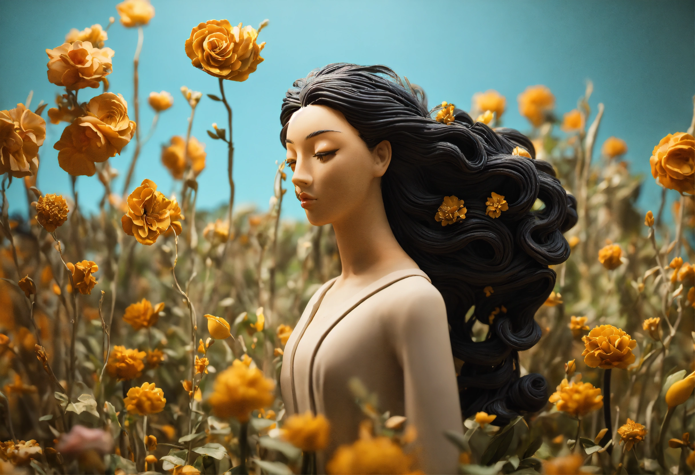 Hand-made artwork 3d, modeling clay, floral-inspired, salvador dali landscape, long dark hair girl blowing in the wind