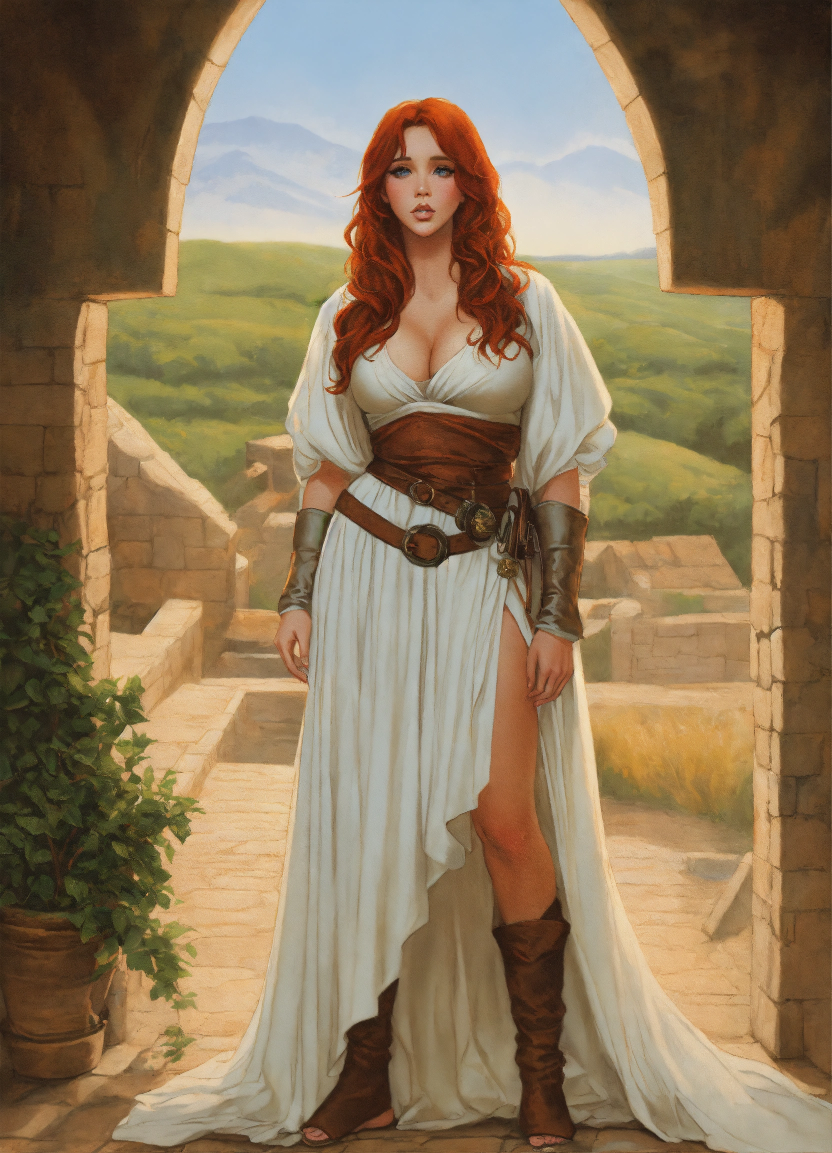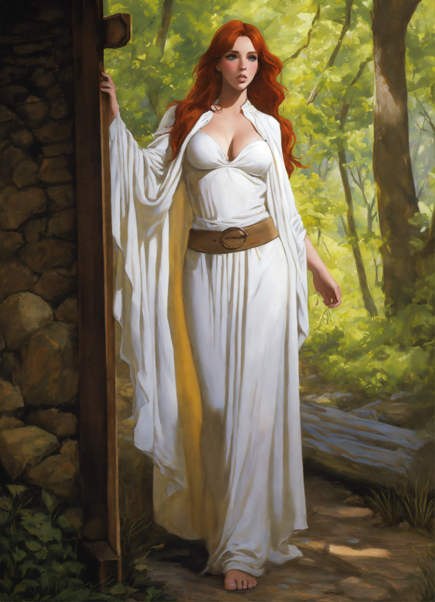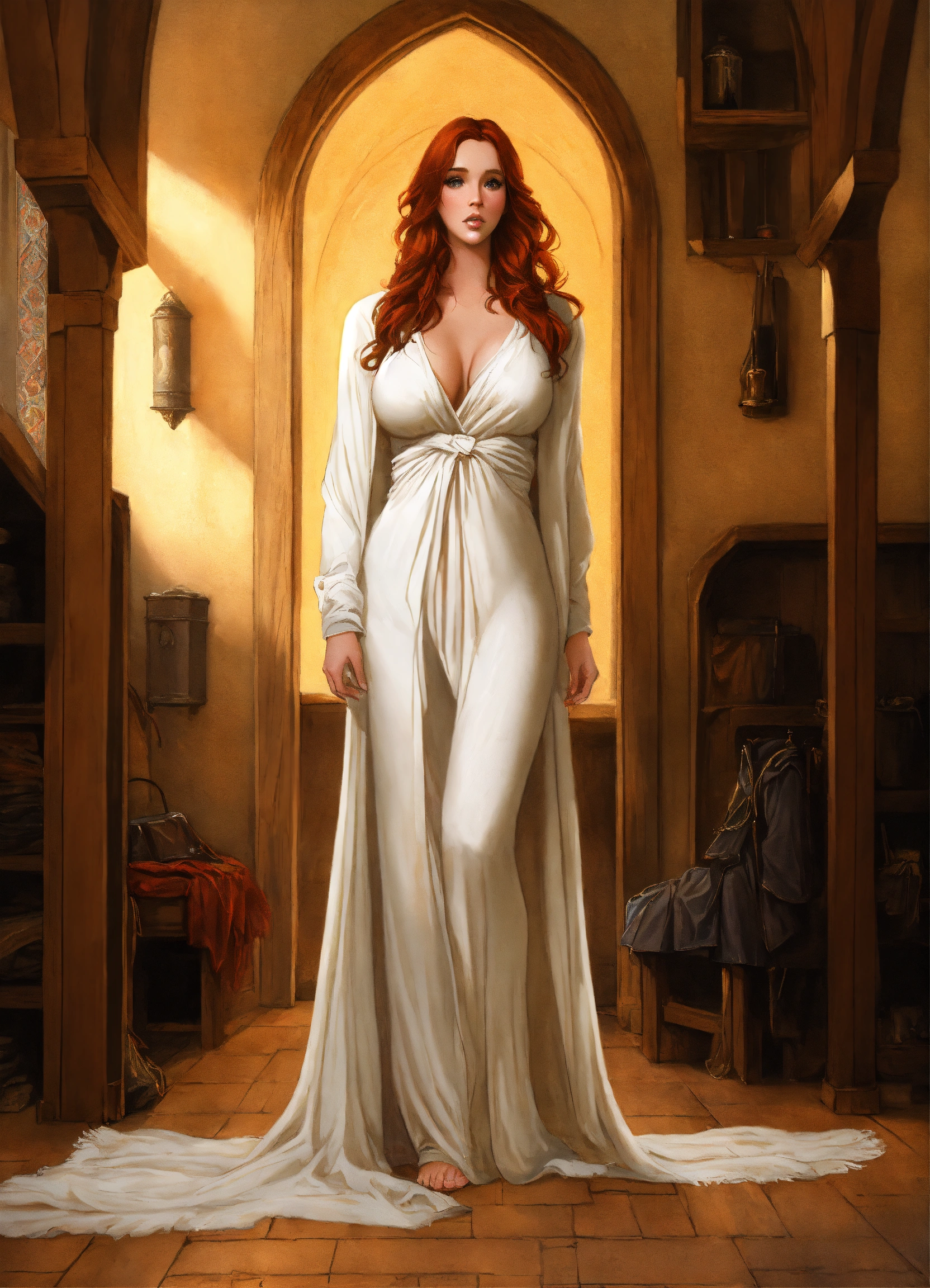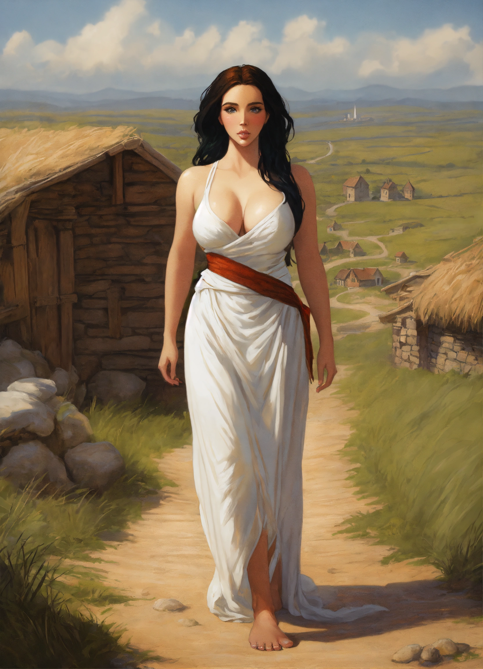 Art by larry elmore, art by jordan grimmer, medieval woman in white rags, minimalist far perspective, peasant rags, christina hendricks as kim kardashian, full body, barefoot