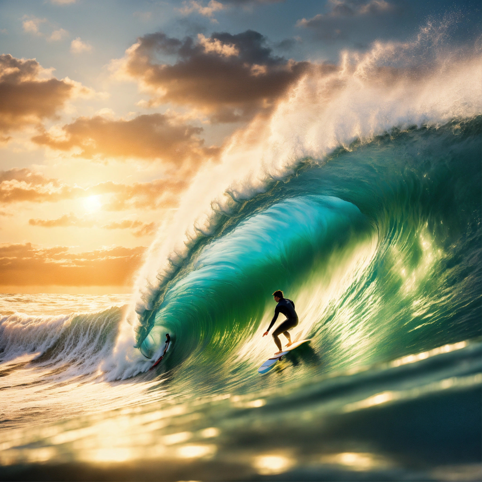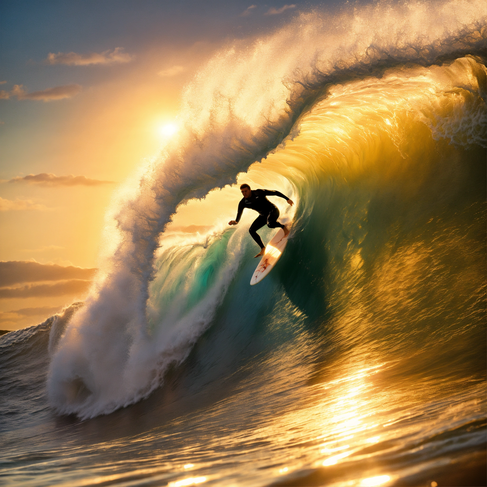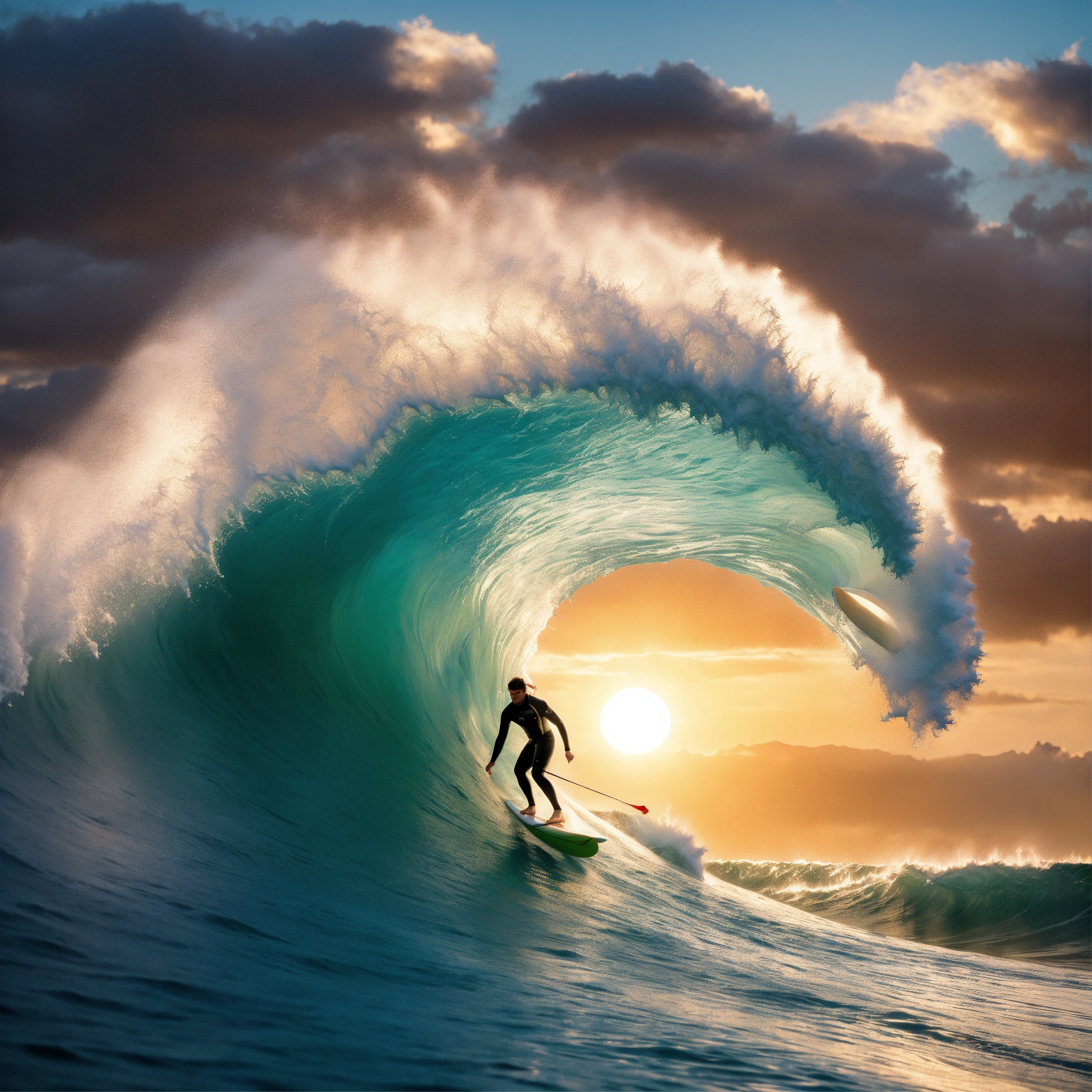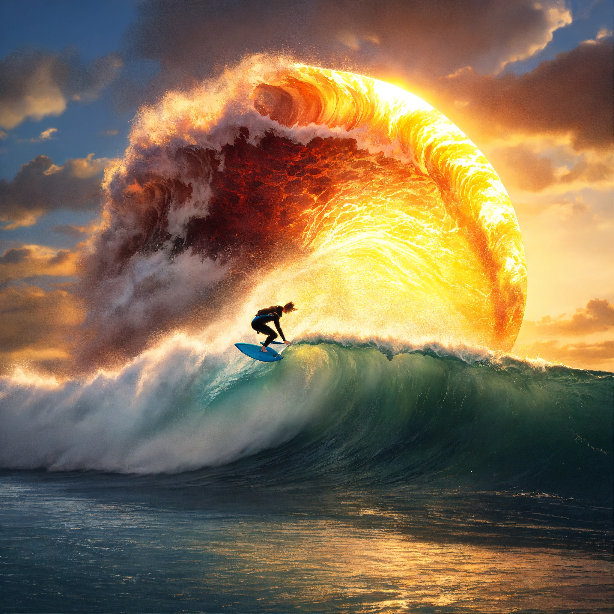 A hyperrealistic image of a surfer riding a tsunami, there is a massive sun behind the surfer, the focus is on the surfer and the claw of the wave he is riding