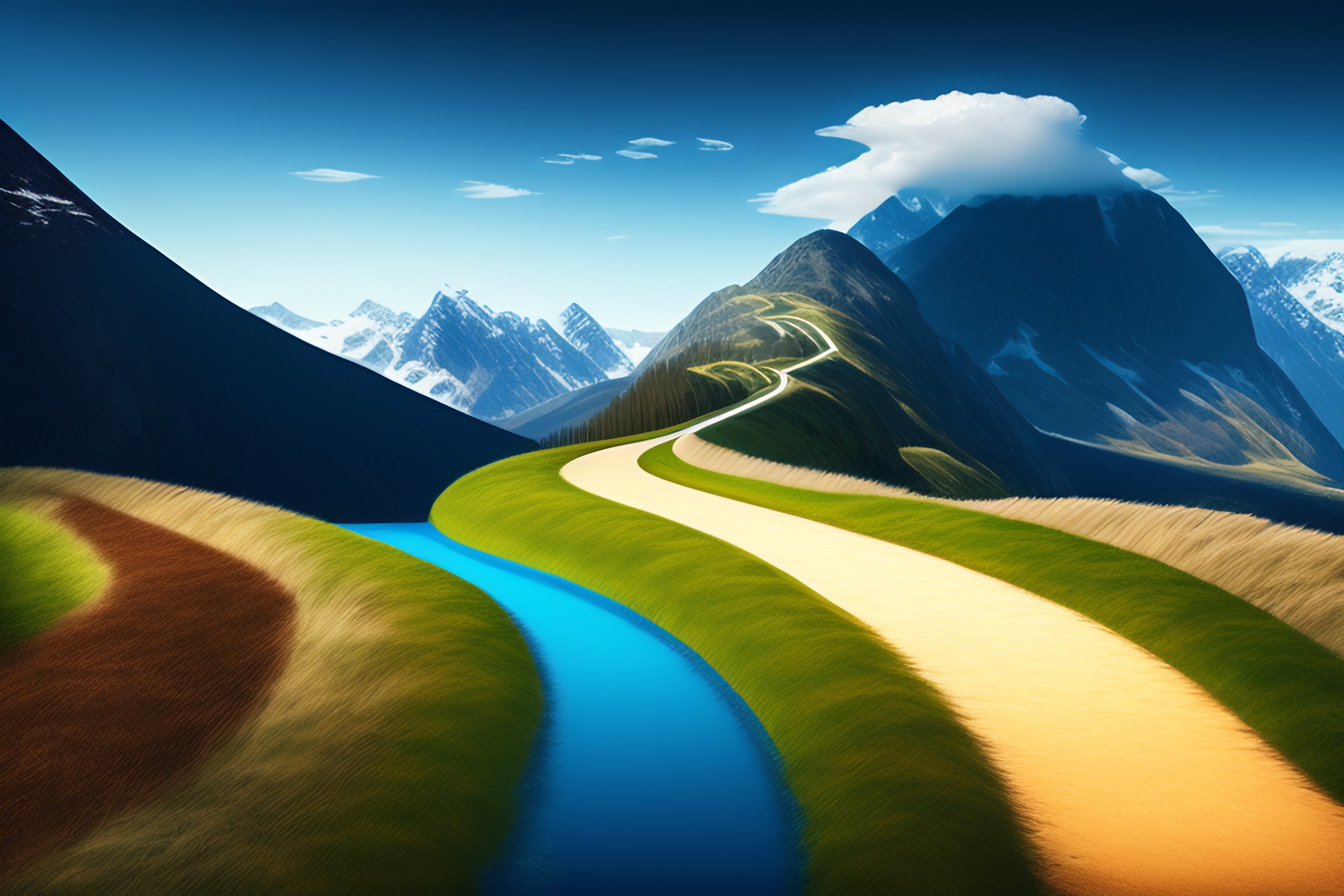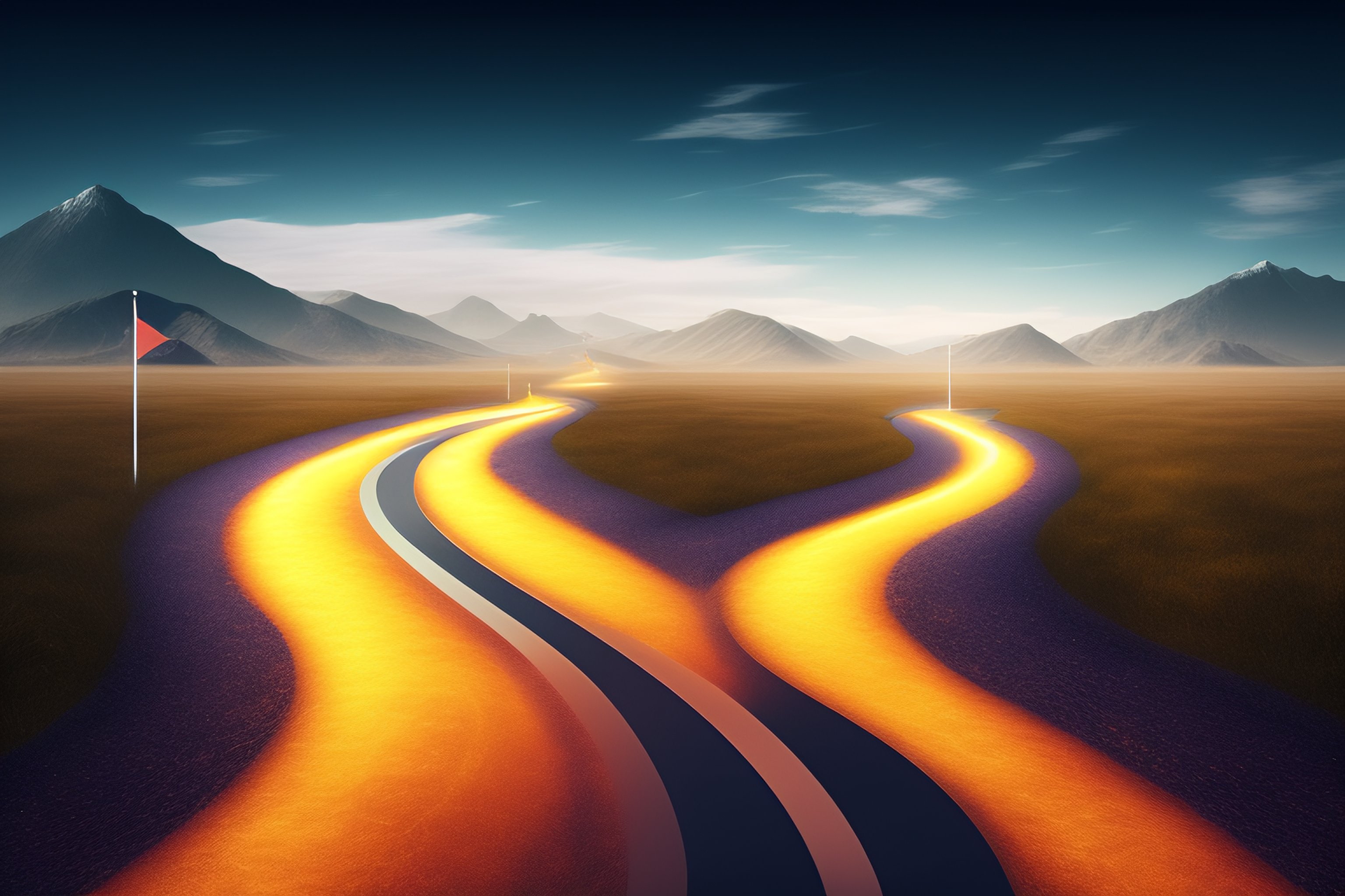 Realistic image of a imaginatio winding path towards the future with various obstacles and challenges along the way. along the path, there would be signs indicating the different goals and objectives we must achieve. the image would convey the idea that the path towards the fulfillment of our goals is a process that requires determination, planning, and action.