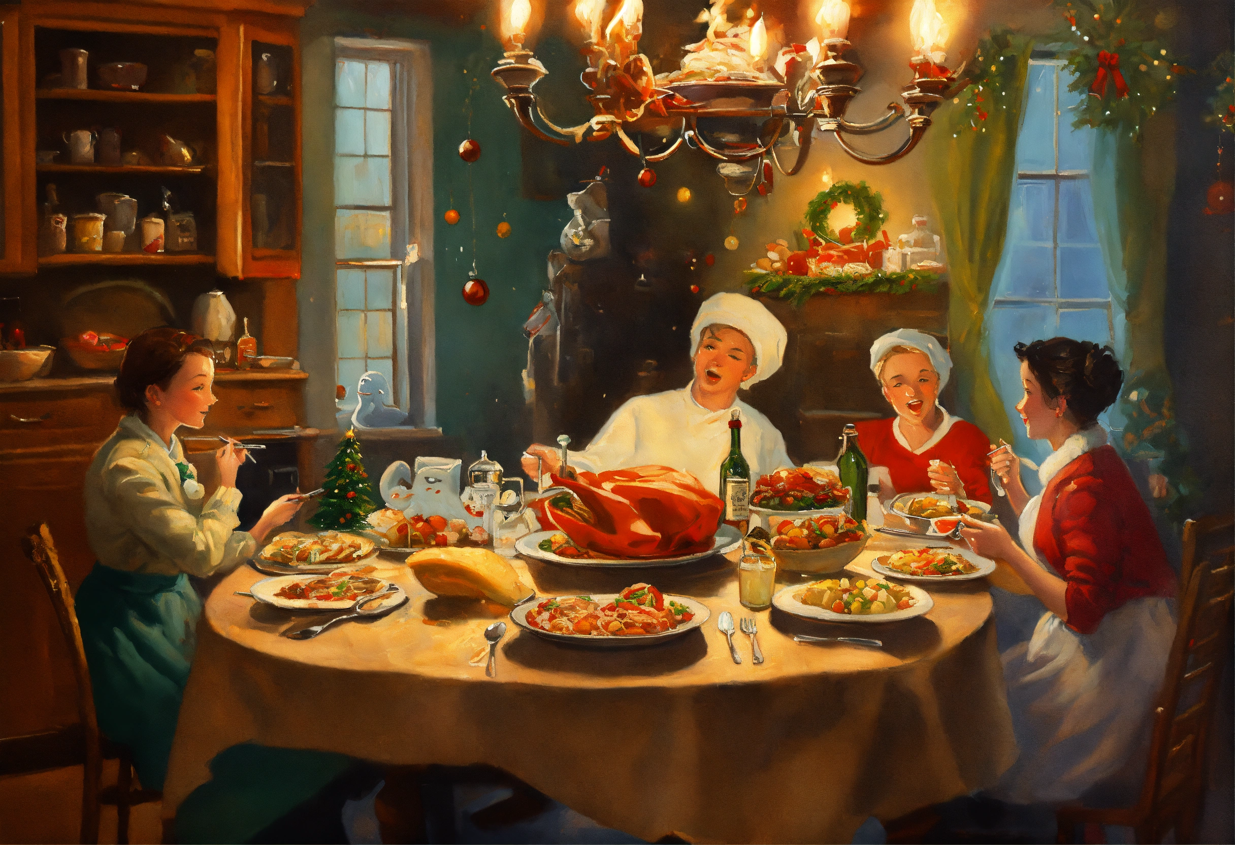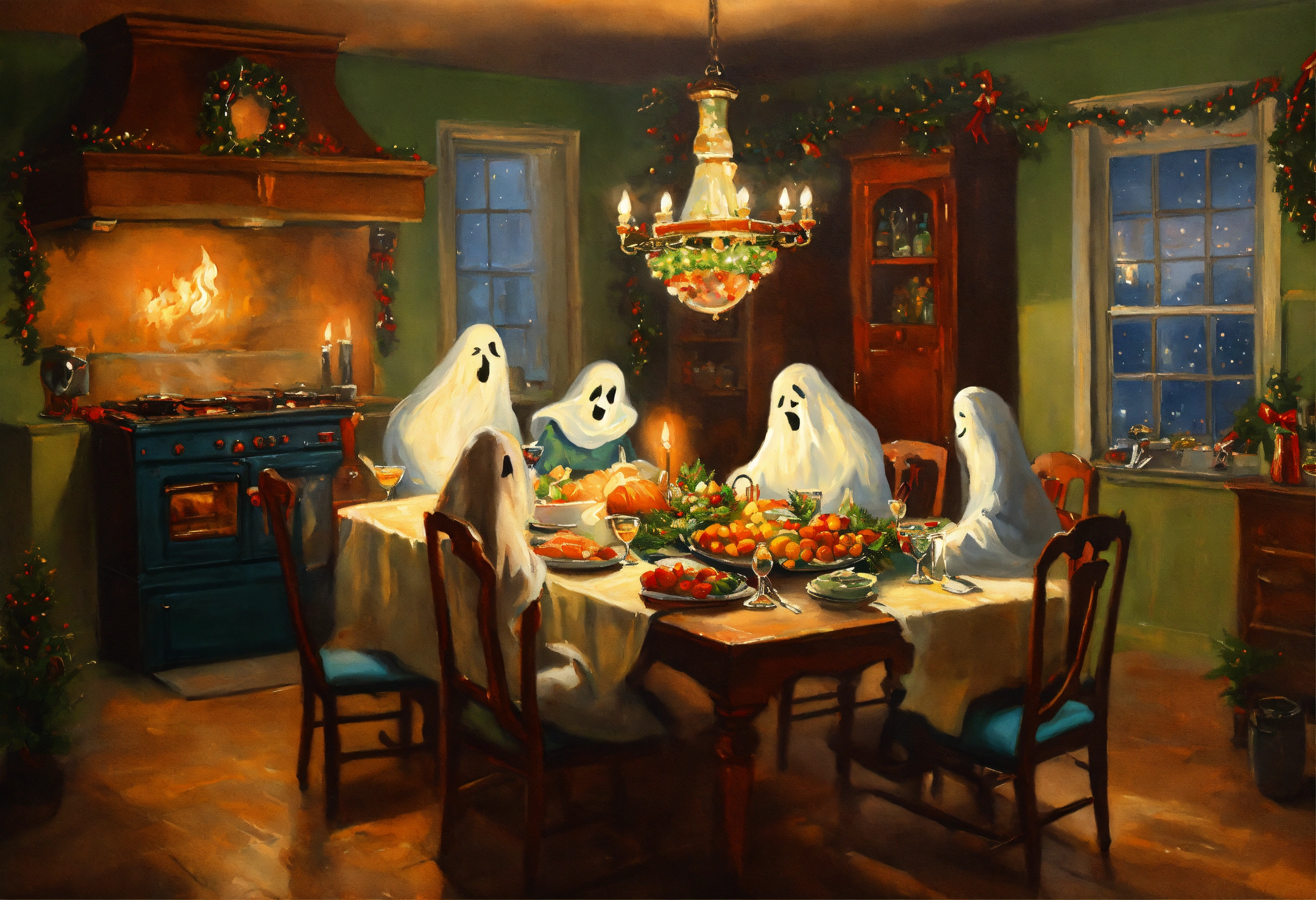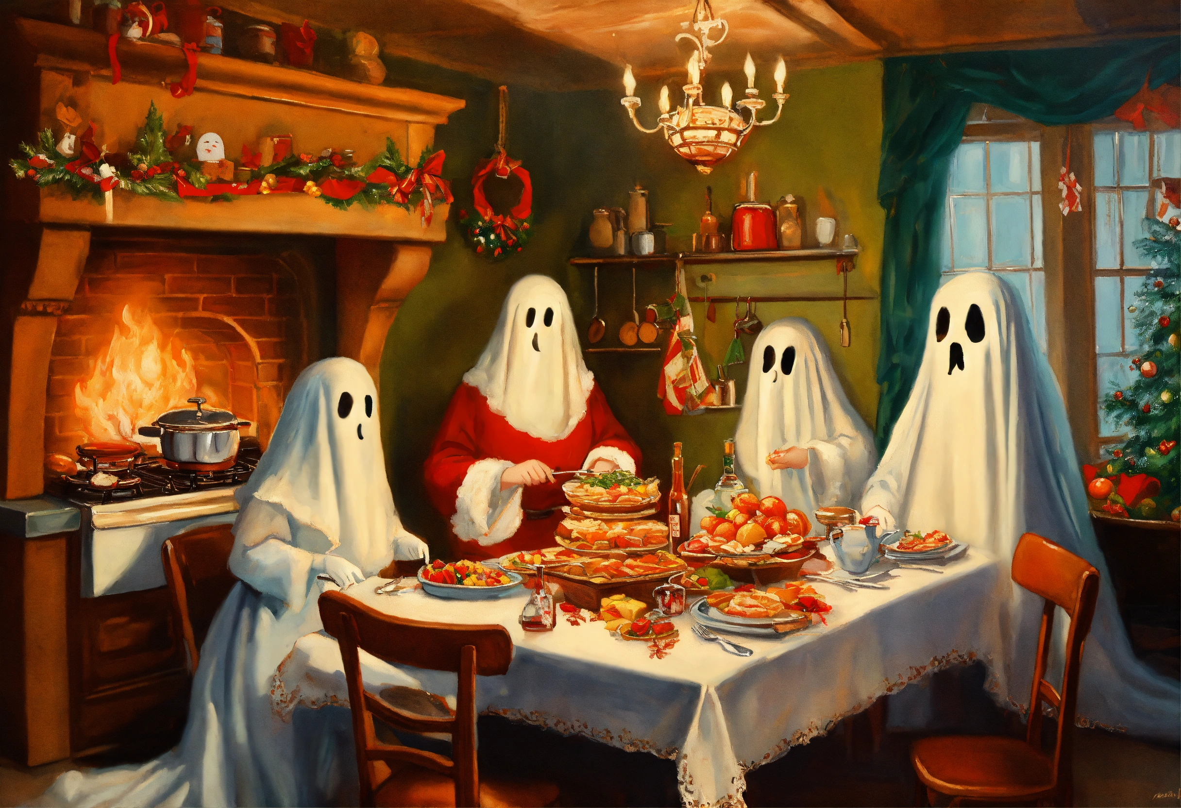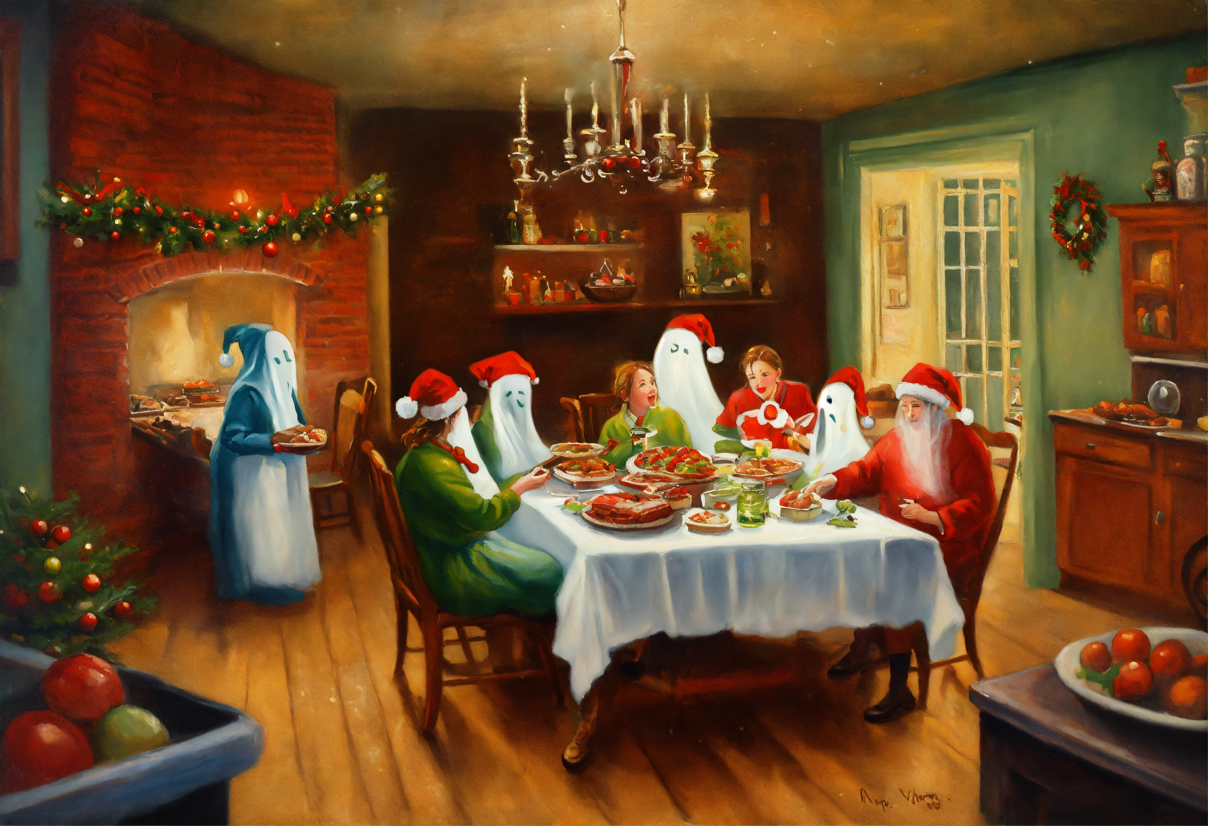 Ghosts in a vintage kitchen enjoying their christmas meals oil painting