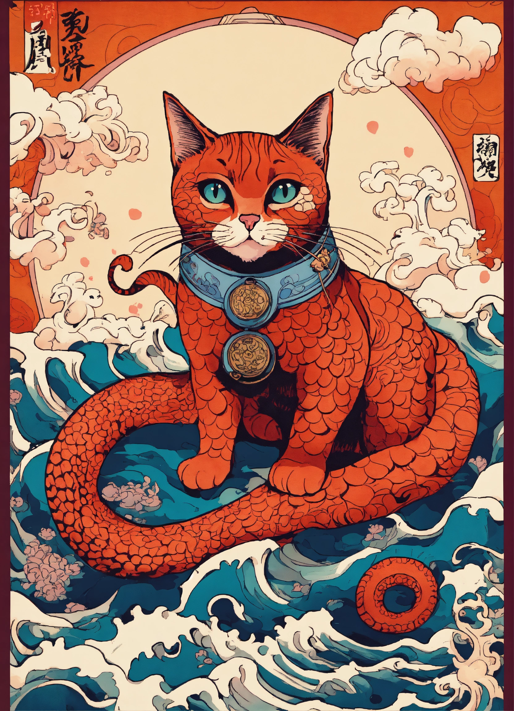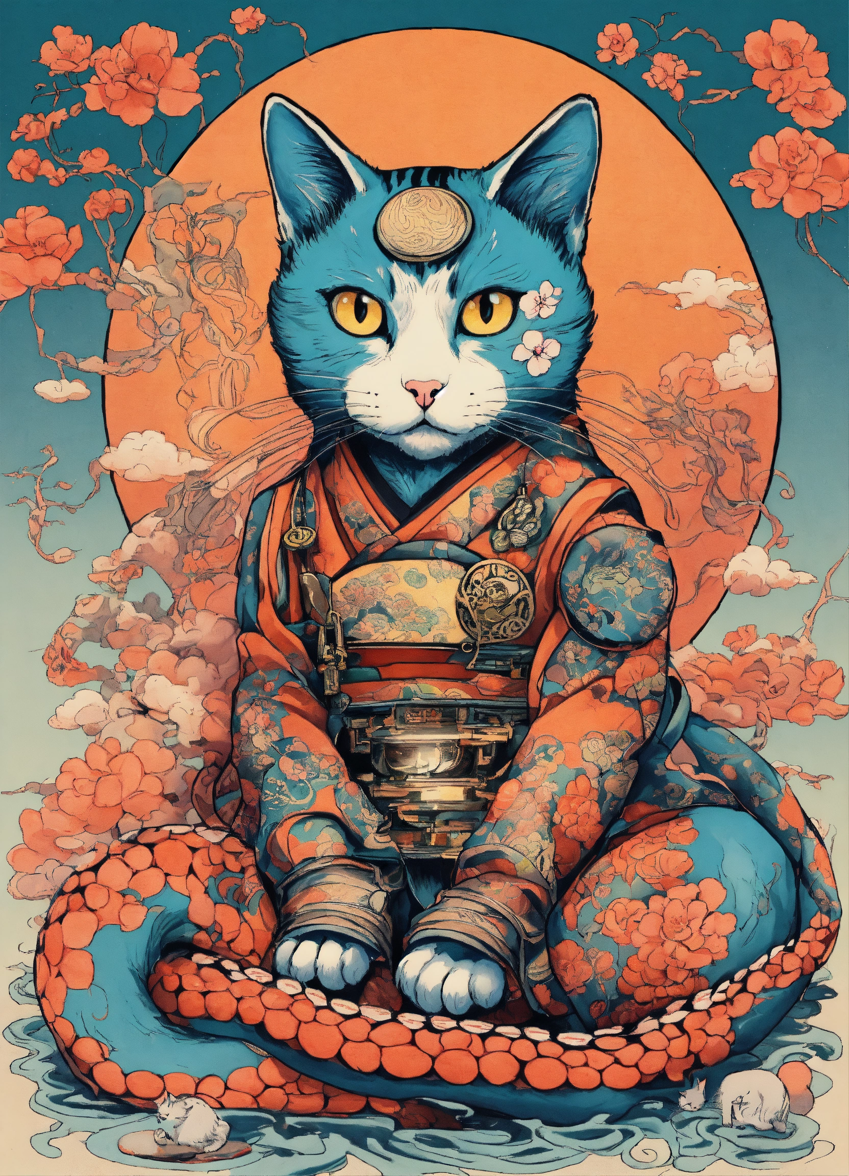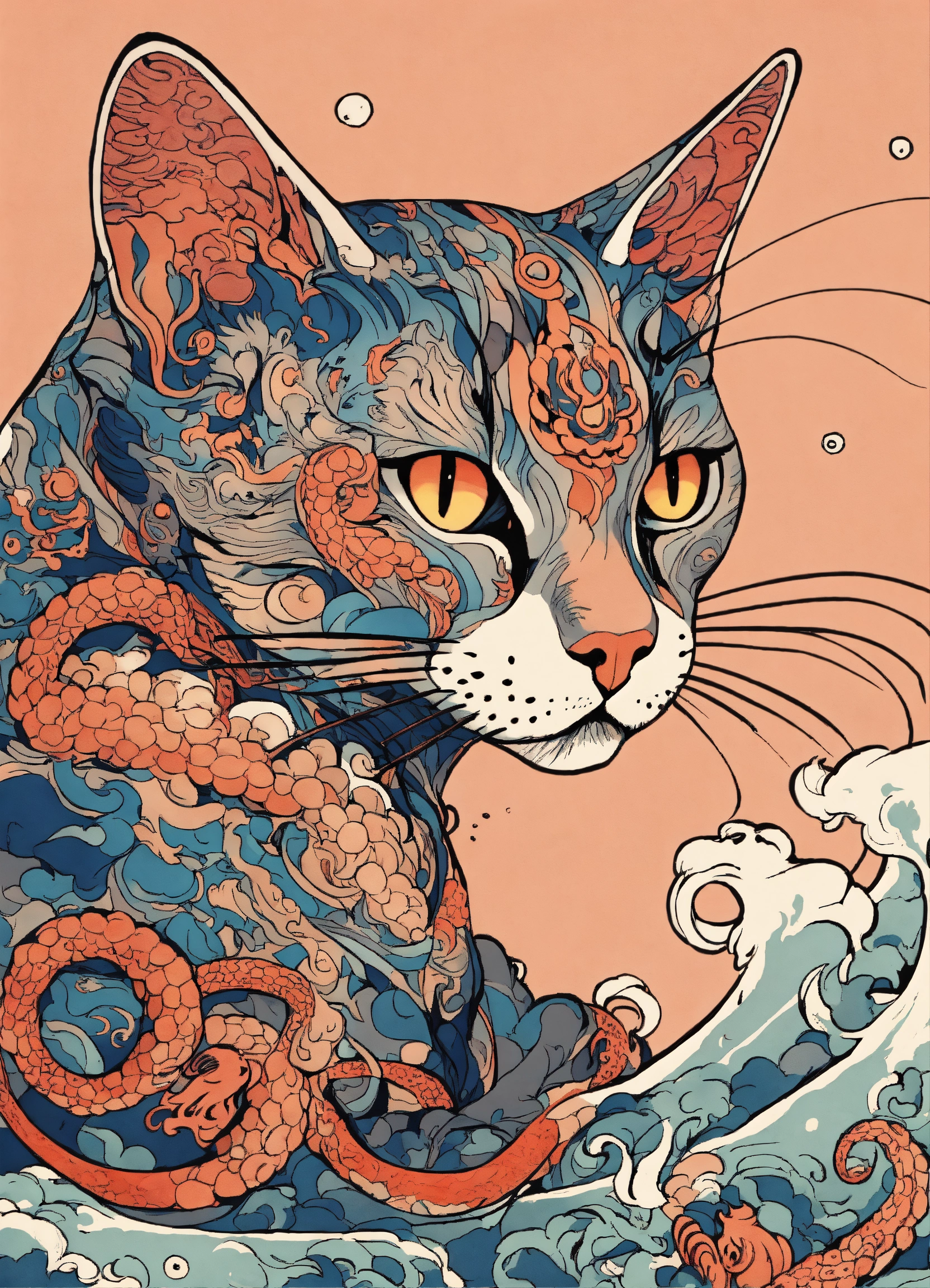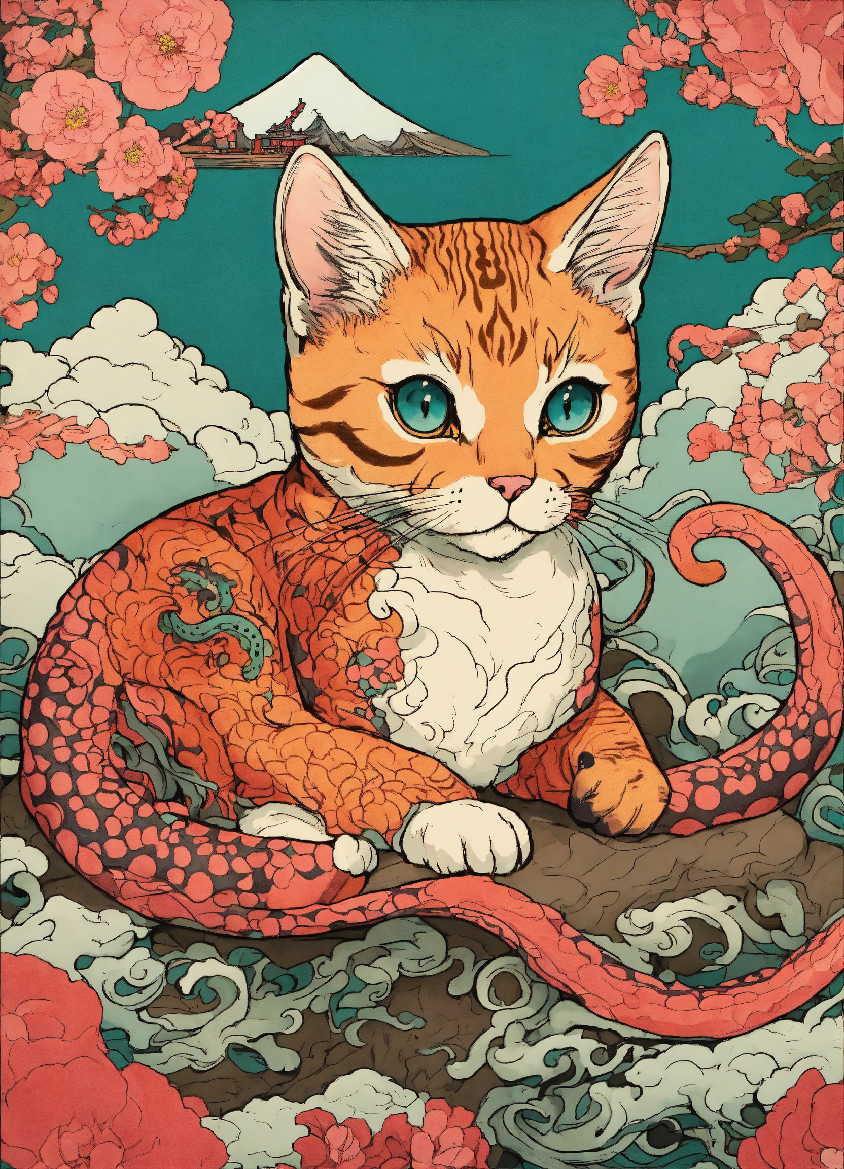 There is a cat with an octopus tattoo on it, cat design, cat detailed, anime manga robot!! cat tattoo, japanese art style, vibrant illustration for tattoo, by sesshū tōyō, ukiyoe style, japanese illustration, by sesshū tōyō, line art illustration