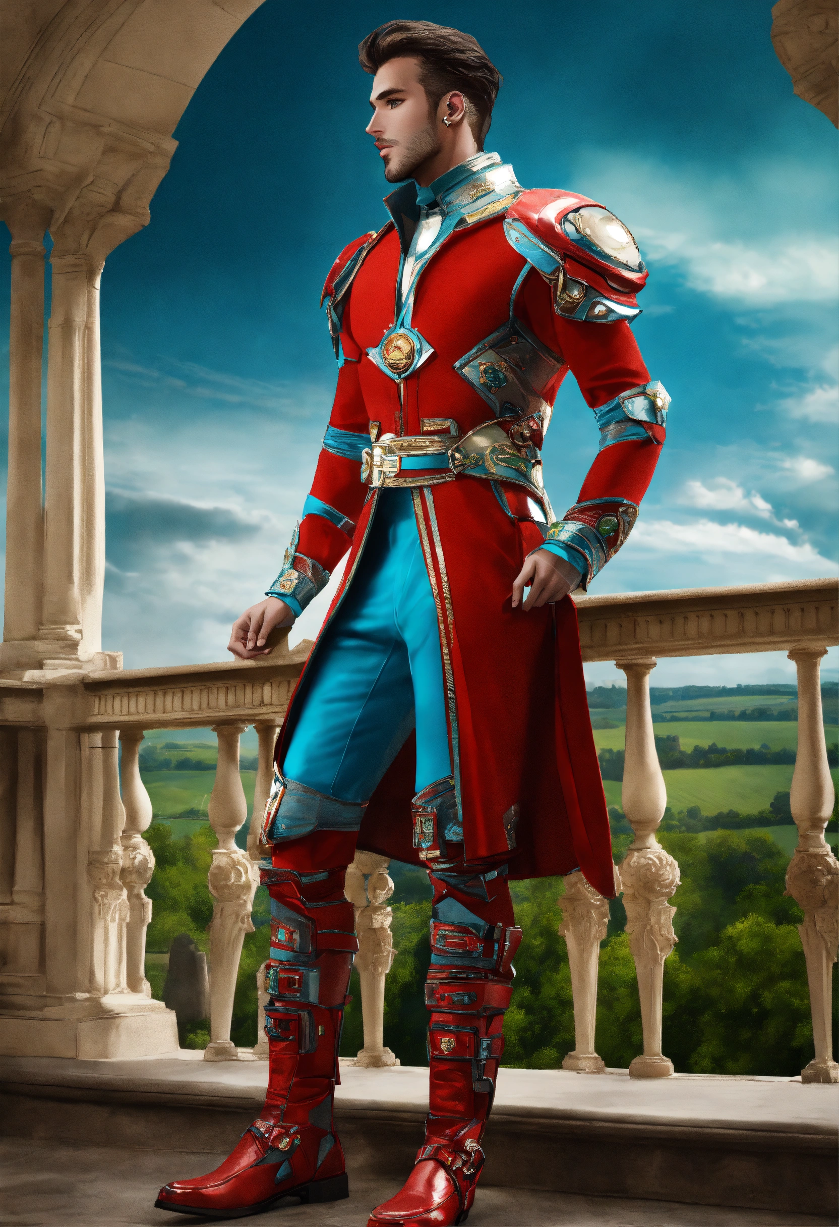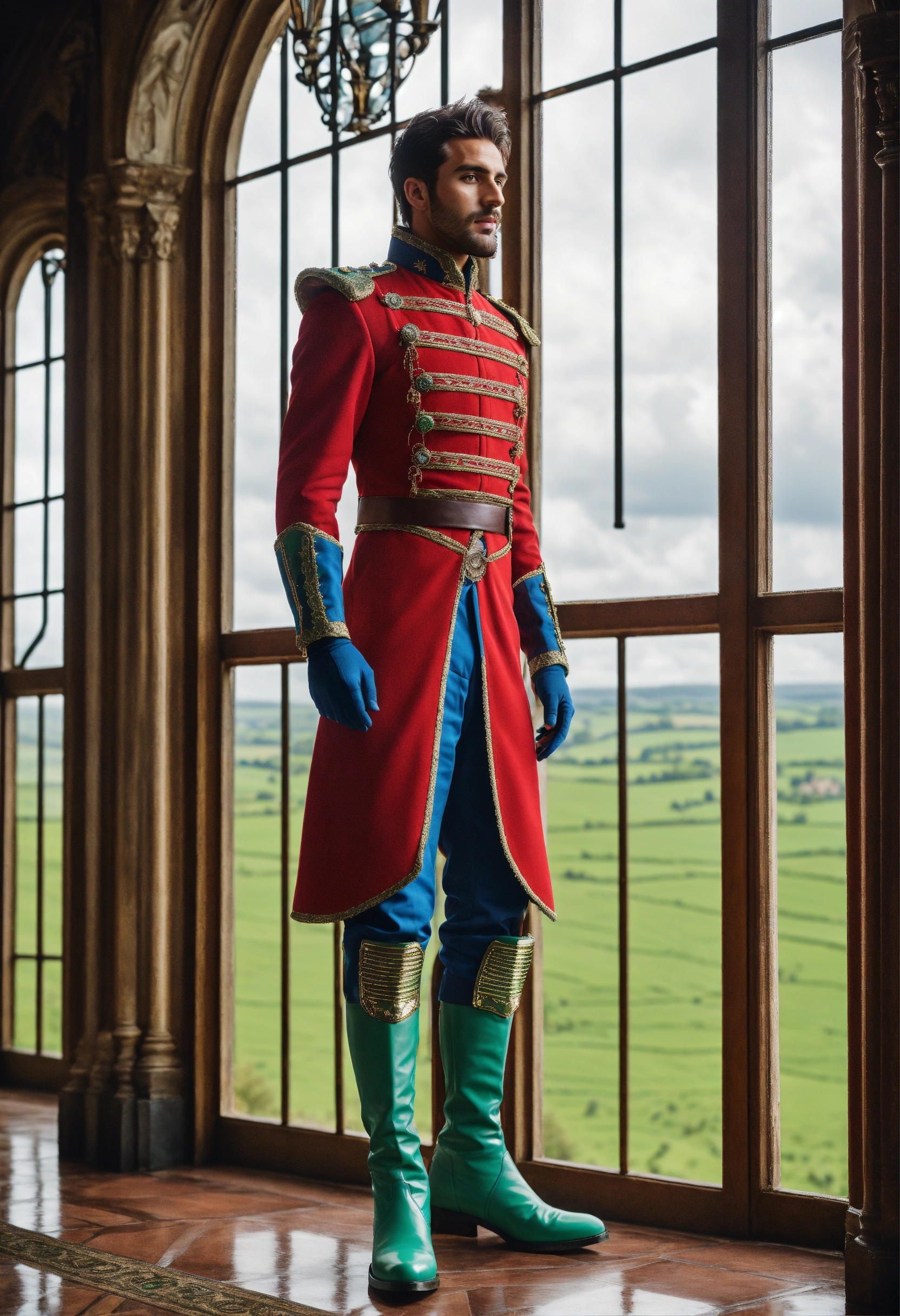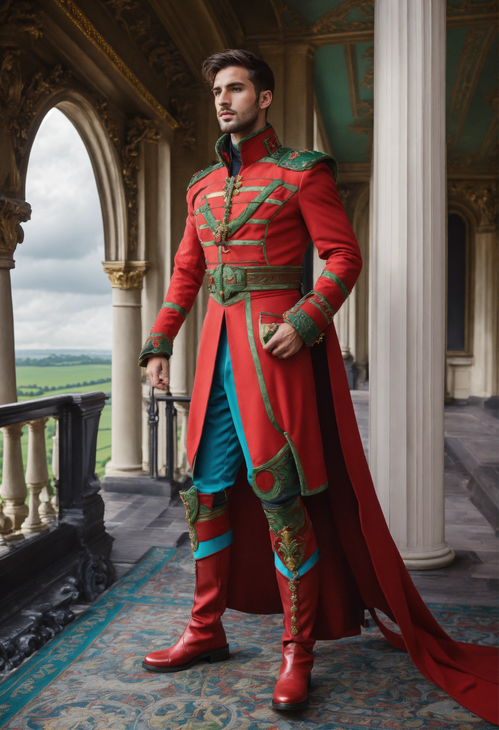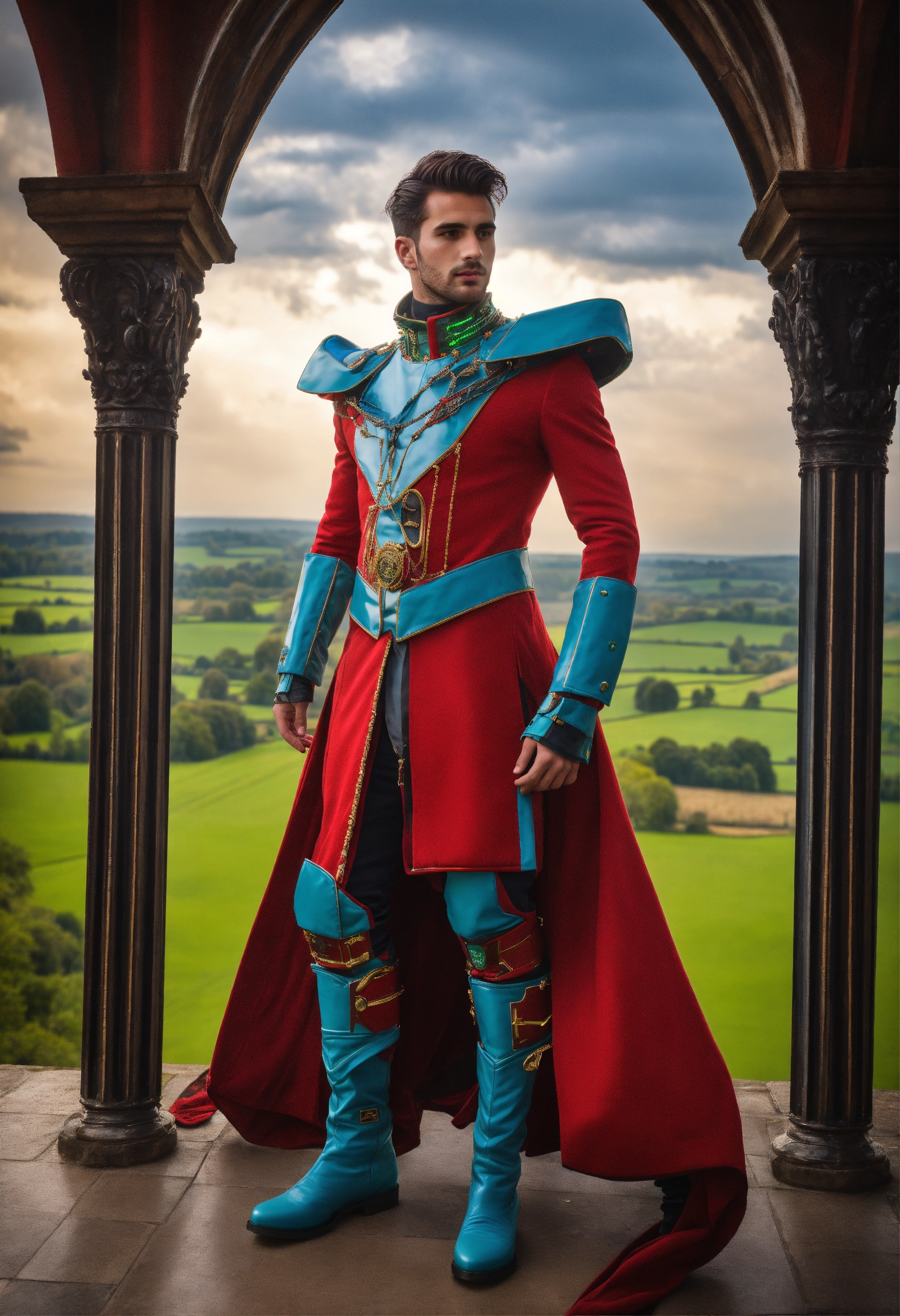 Highly detailed full body of a sci fi aristocrat, royalty, red and light blue and volt green futuristic outfit and boots, standing on palace balcony overlooking the english countryside on a cloudy day, male, handsome, 29 years old, highly detailed