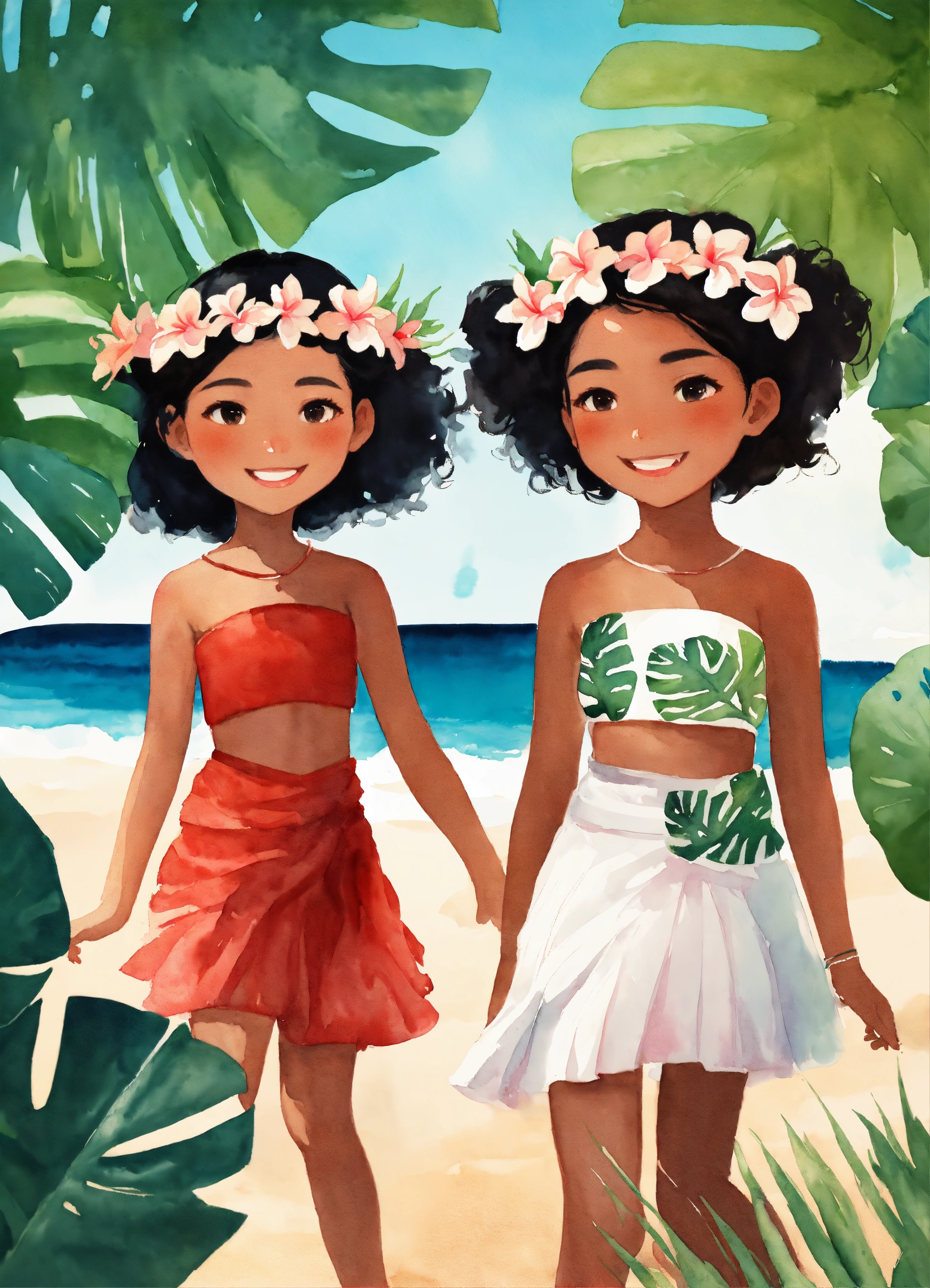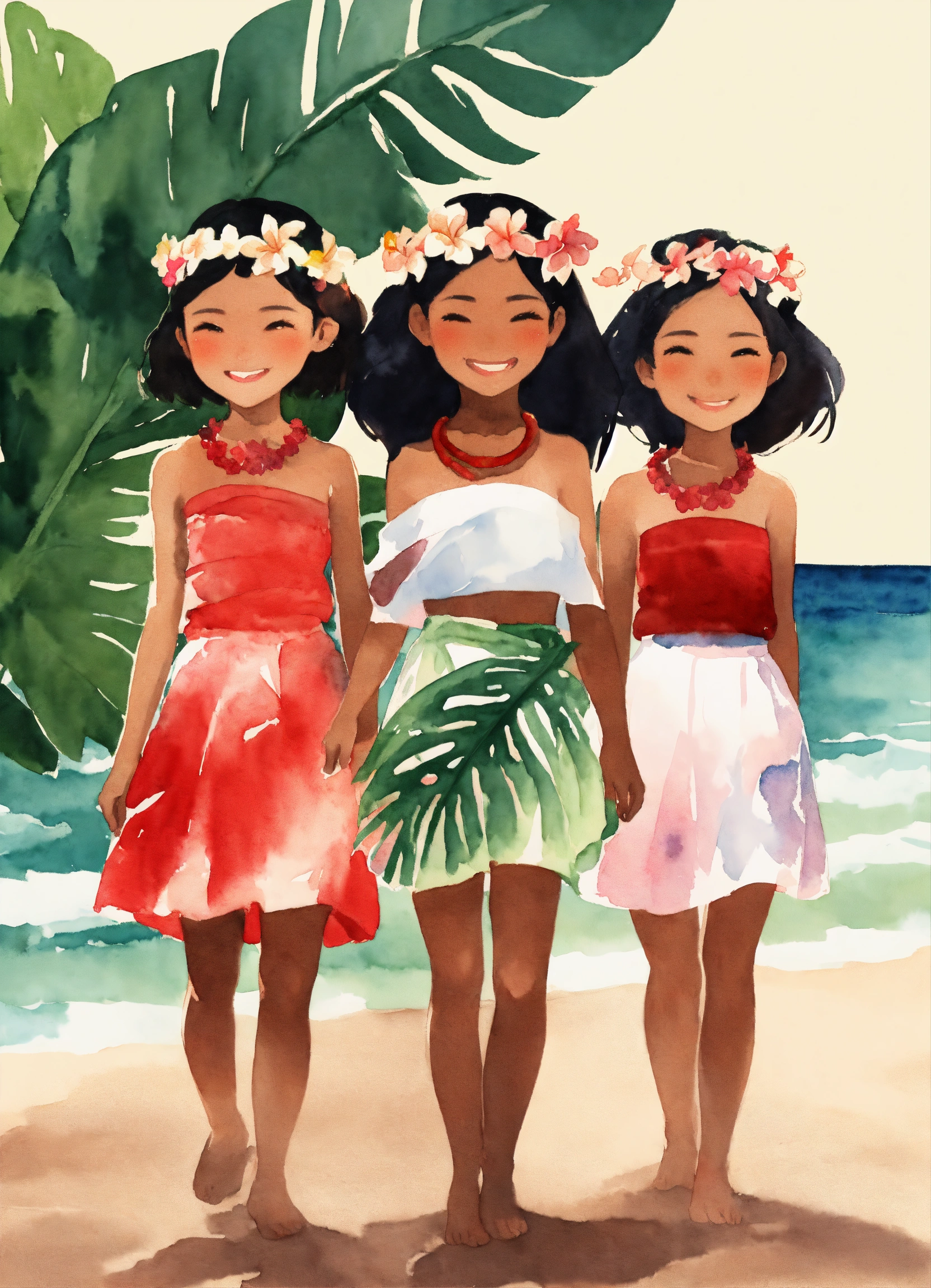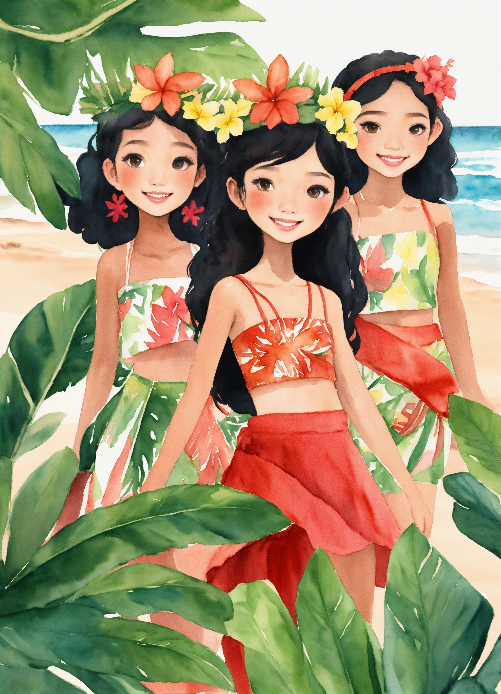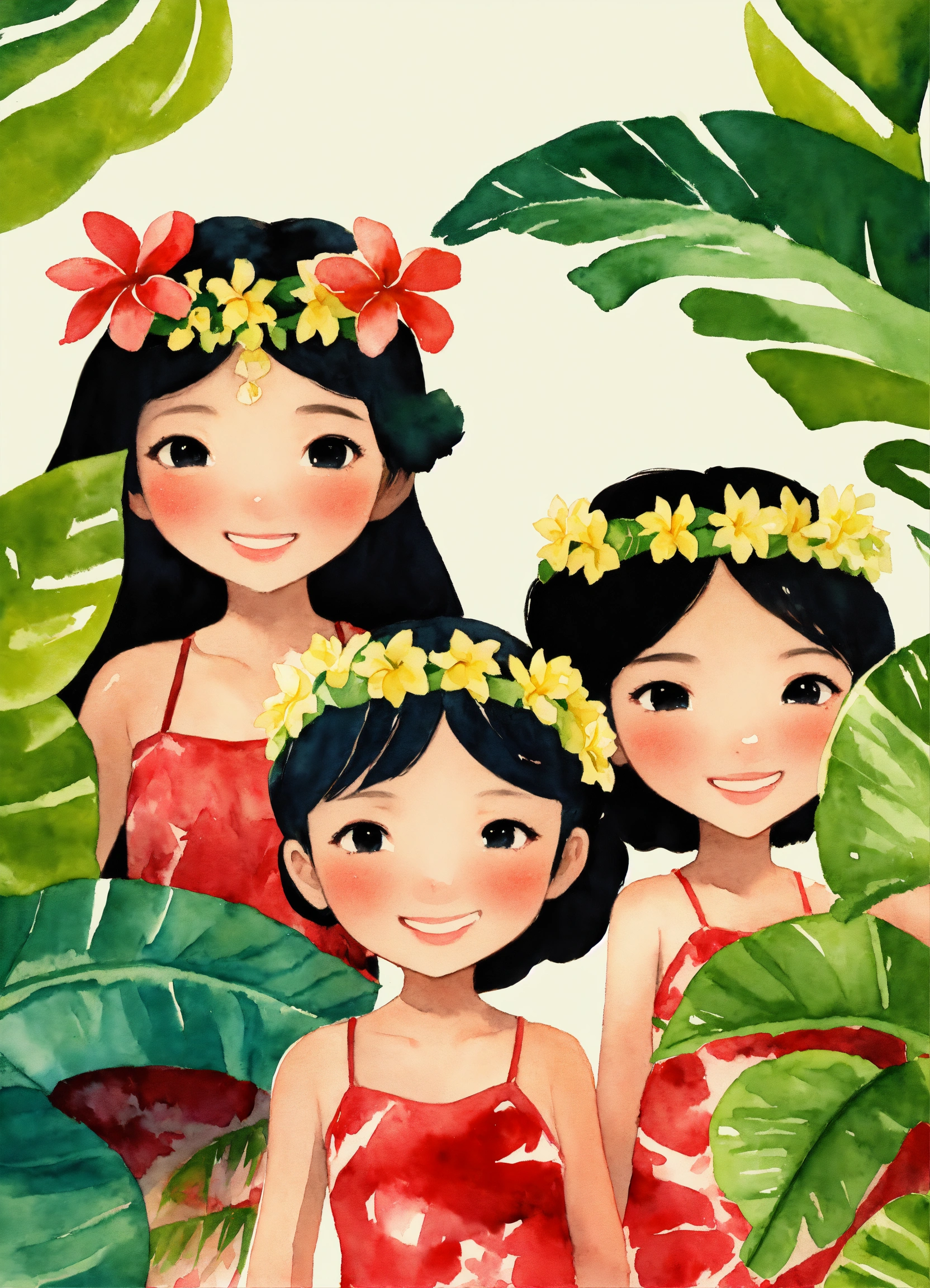 Watercolor style, illustration of three girls, a little girl wearing a plumeria headdress on her head, they wear red tube tops and skirts made of leaves, a confident smile, the background is a beach in hawaii, black hair, white skin, monstera bush, 4k, 8k, asian beauty, moani, for a minimalist style, they are dancing hula