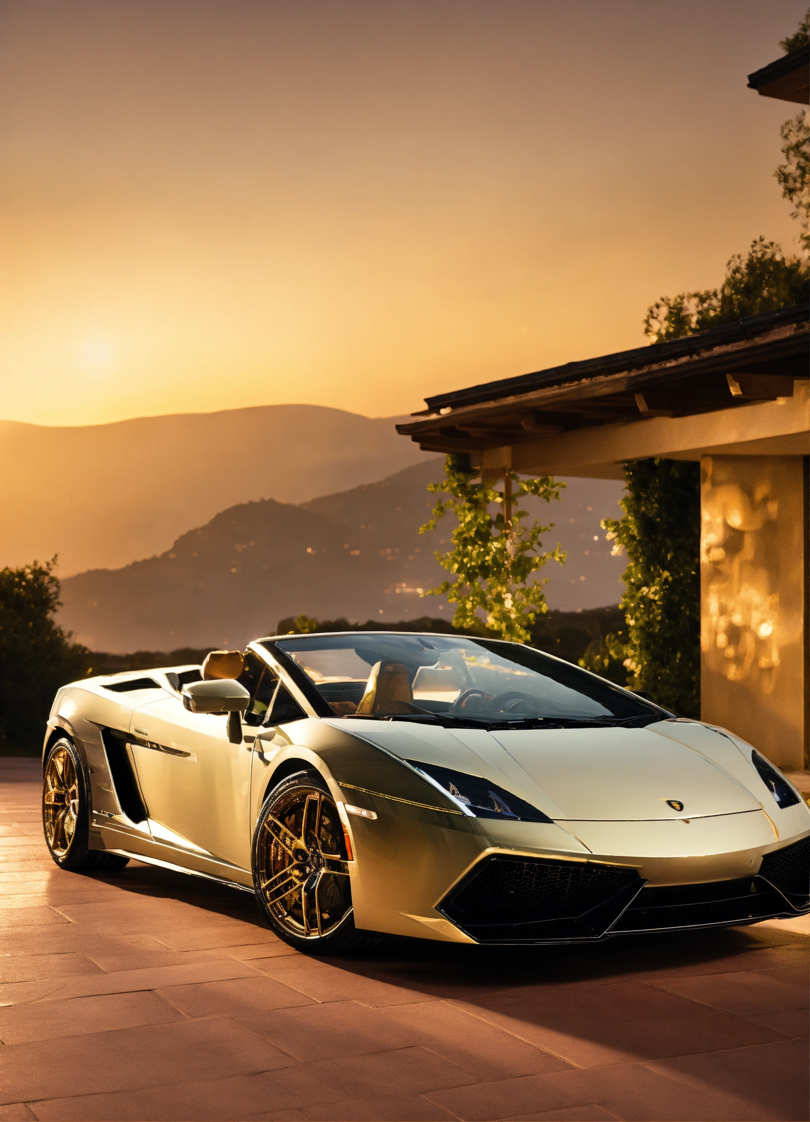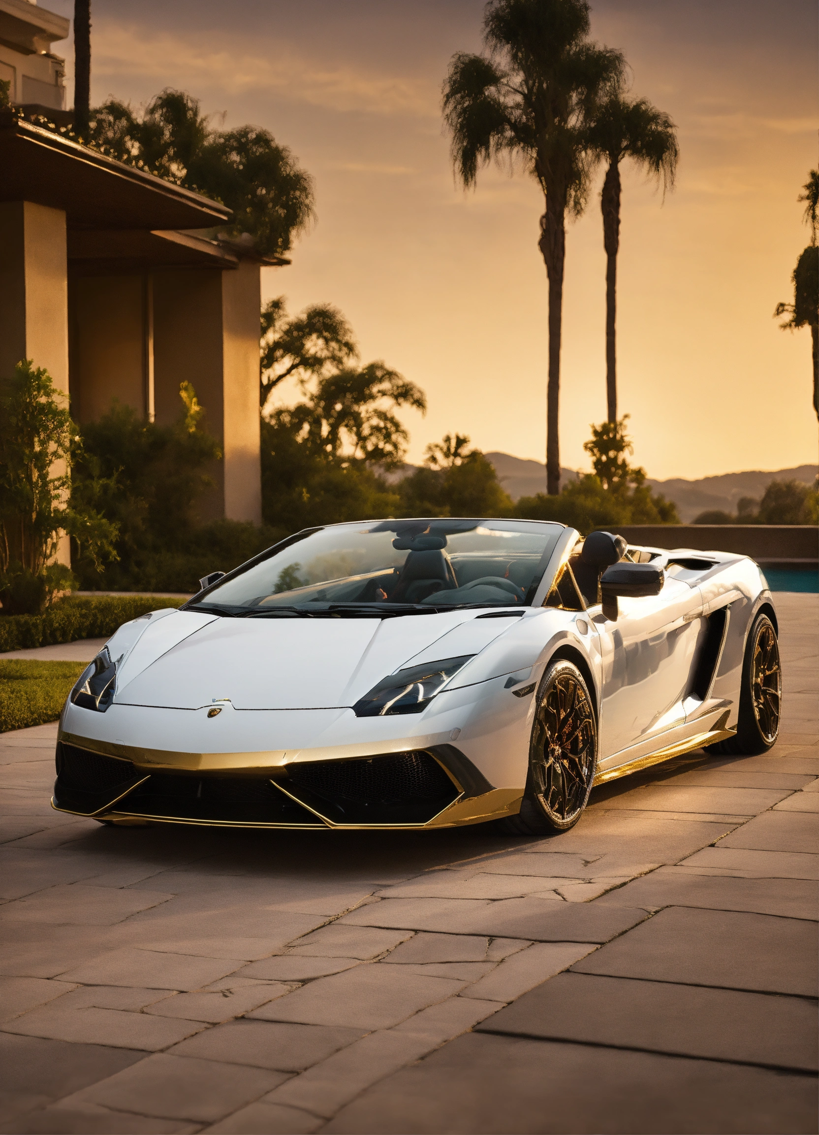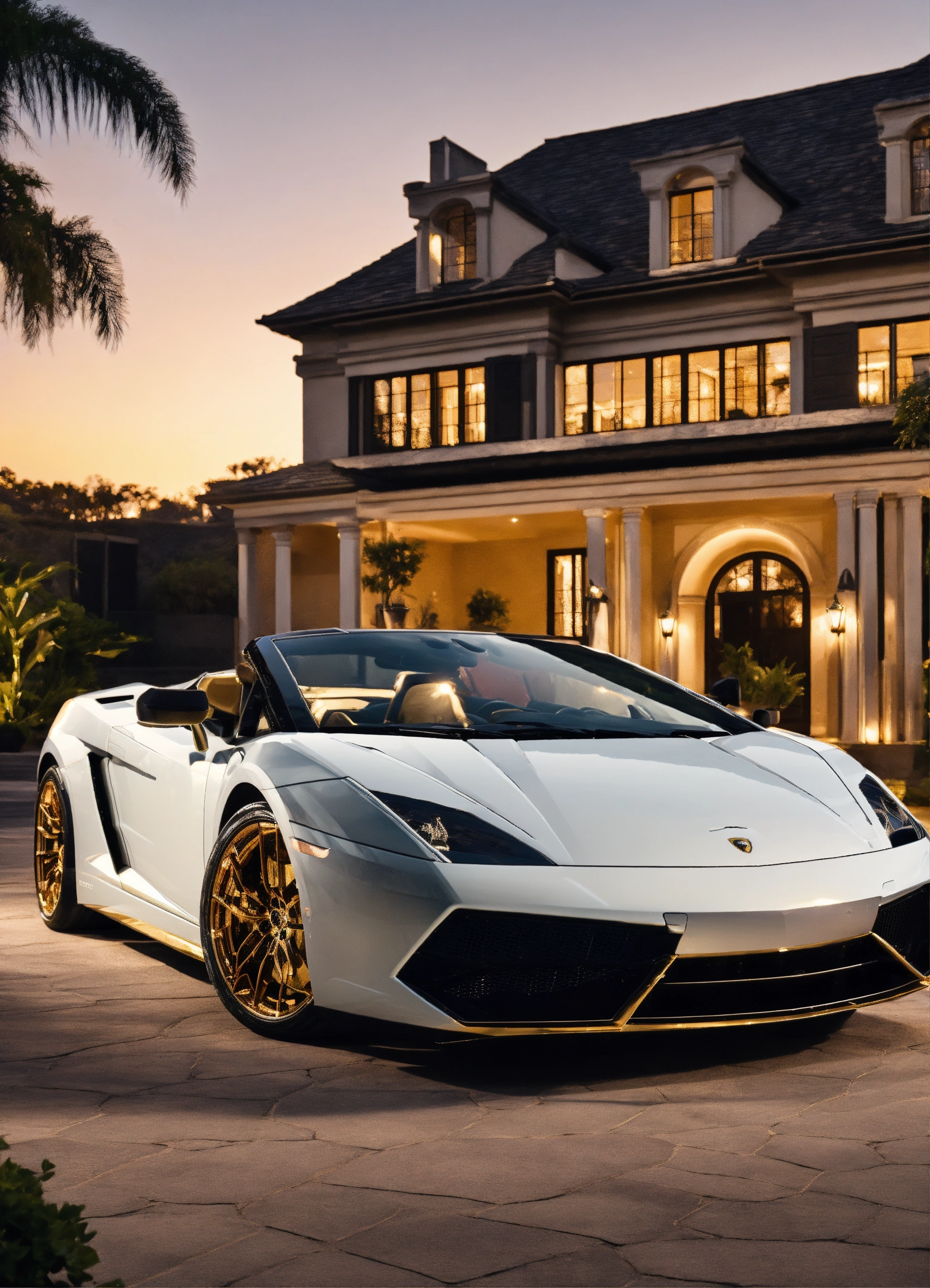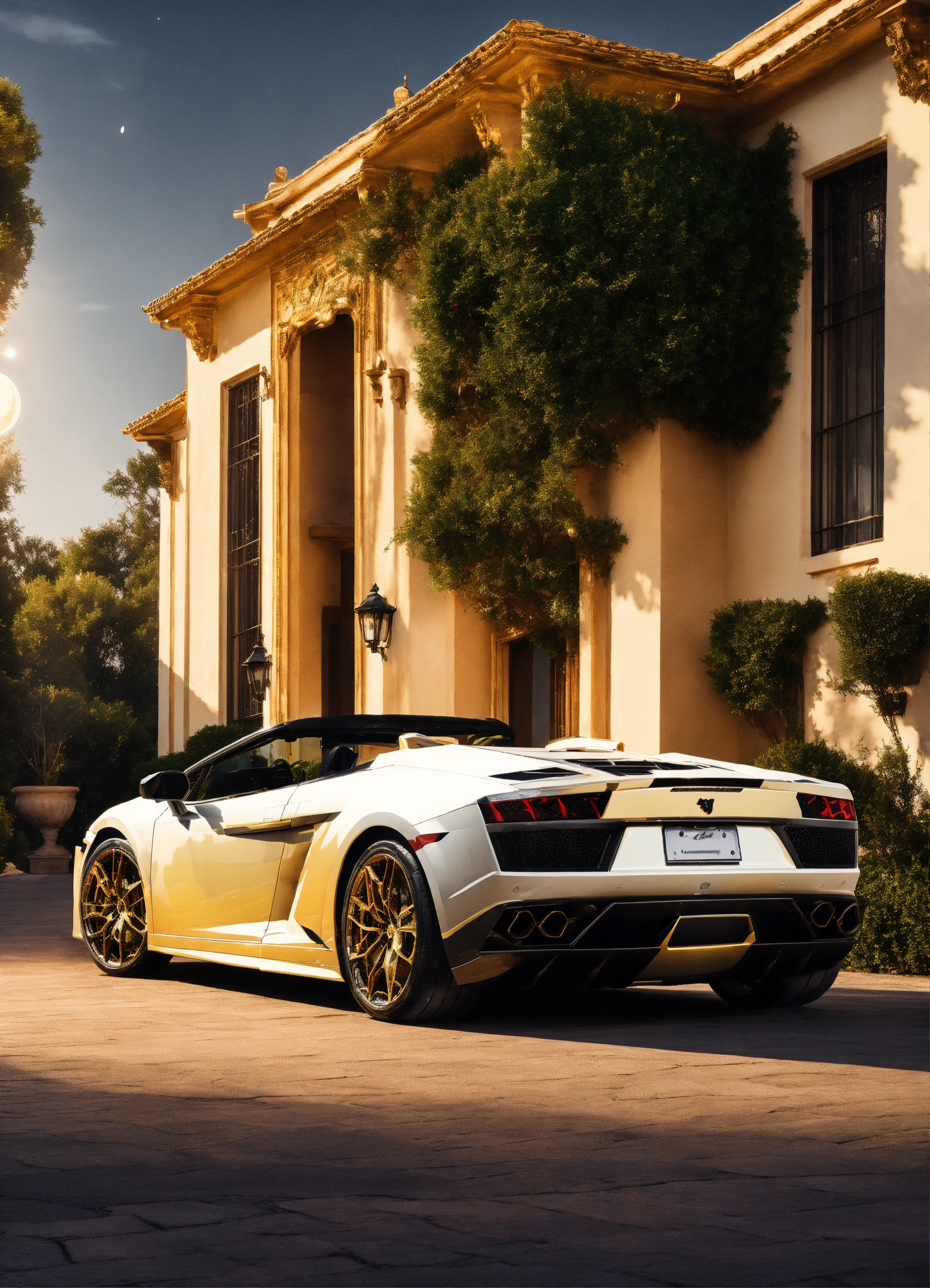 2023 lamborghini gallardo convertible with contemporary mansion white and gold trim and golden moonlight background