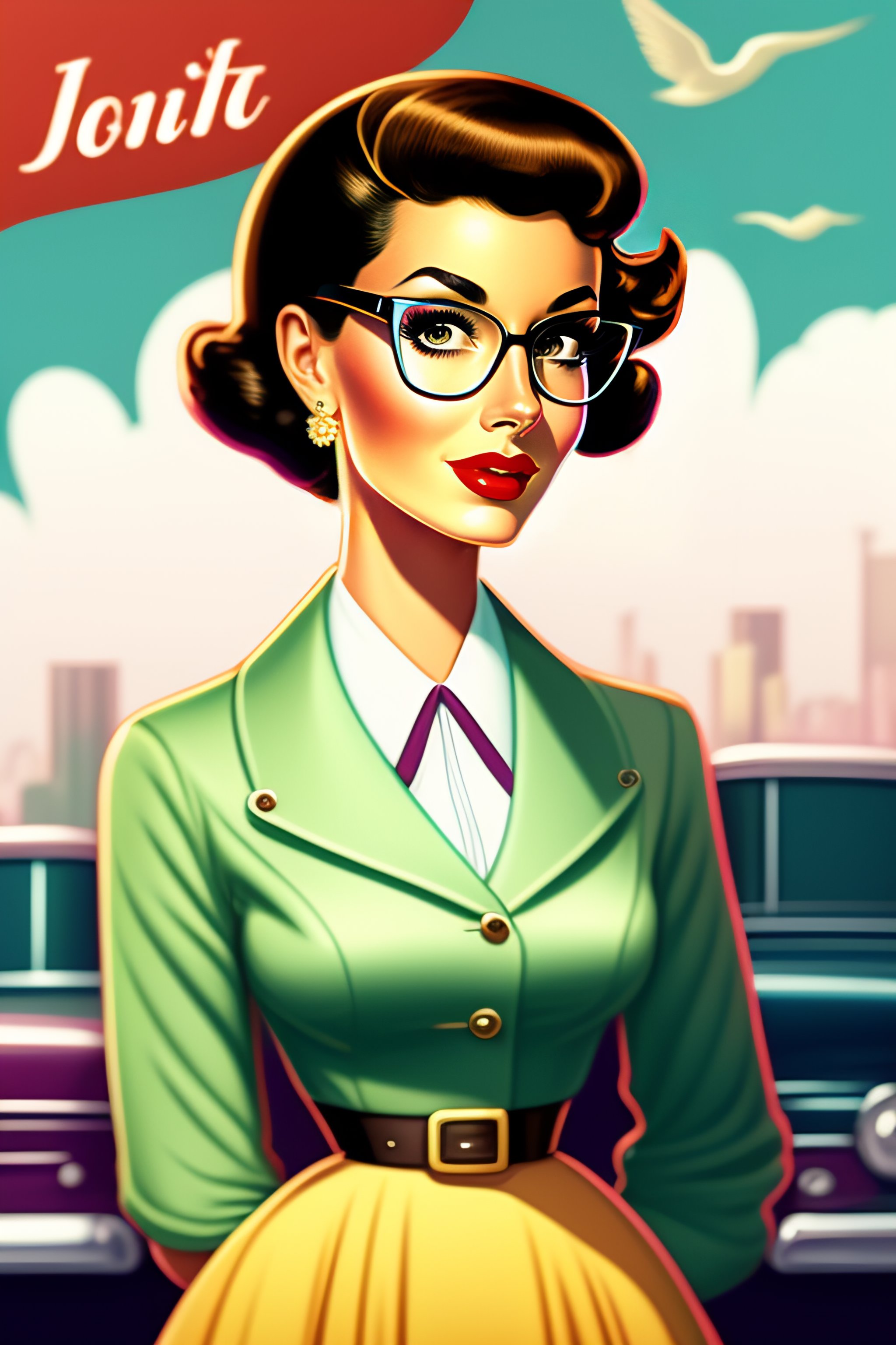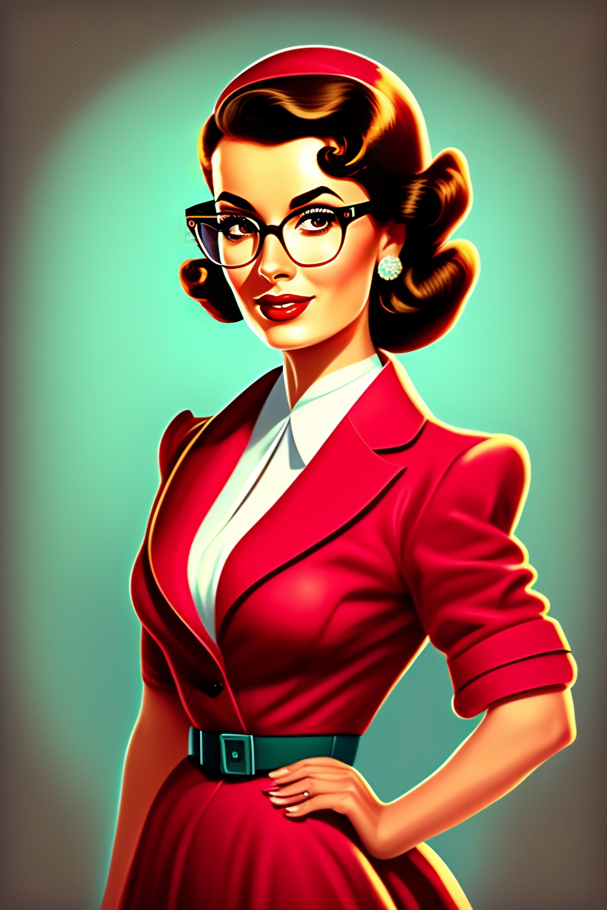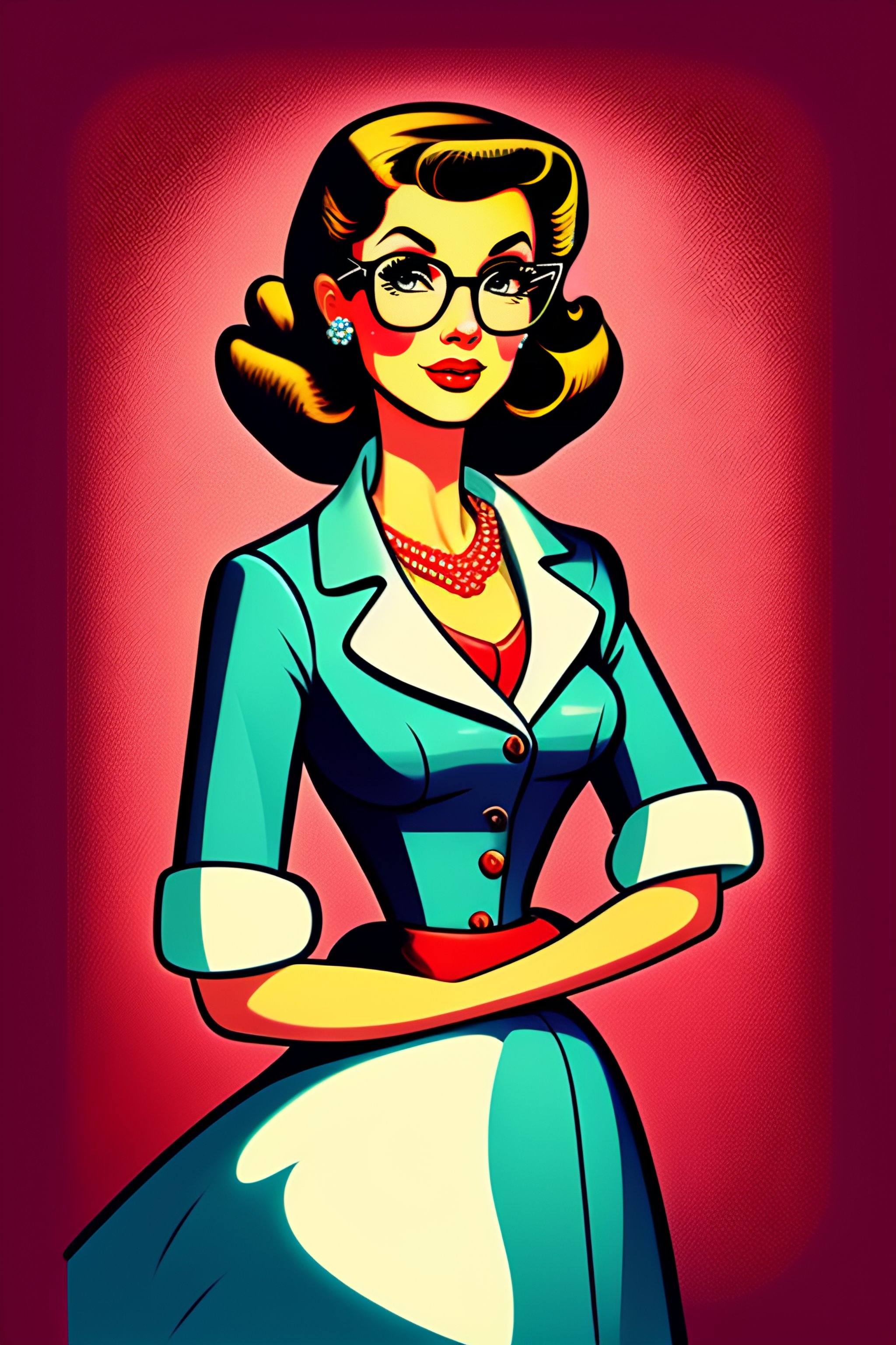 1950s retro style cartoon style of smart young pretty female character who is a psychologist with glasses, elegant modest clothing portrait