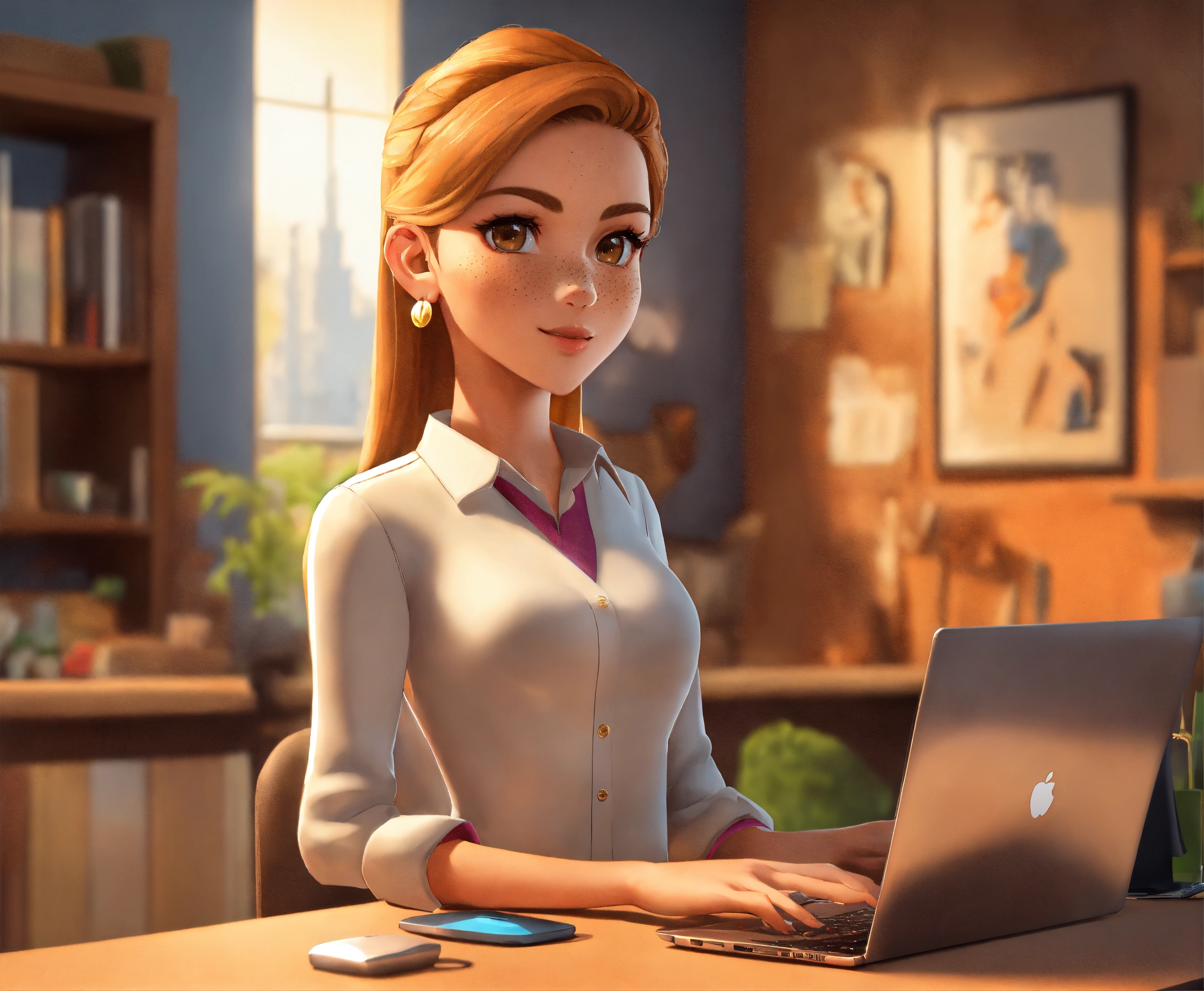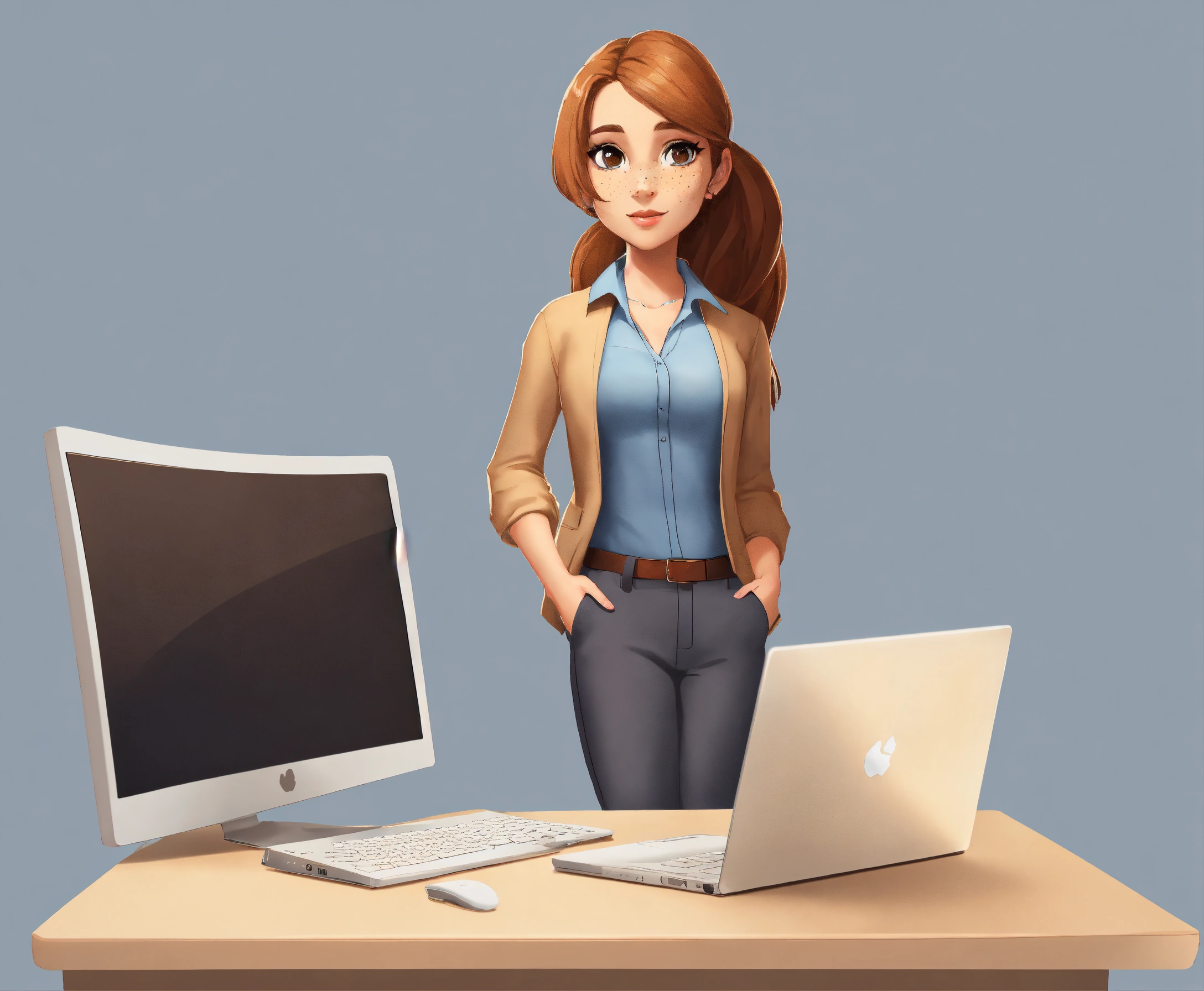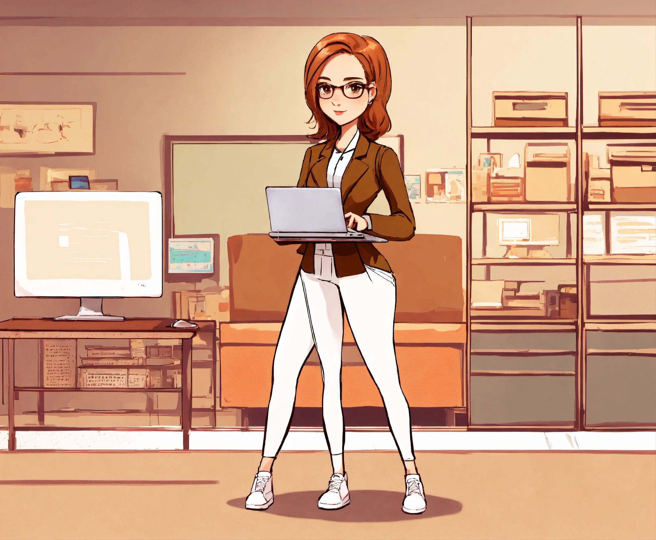 A white intelligent, attractive female cartoon character avatar. you can see her whole body as she is standing upright with nothing in front of her and wearing fashionable, professional clothing. she is standing while holding a laptop in her hand. she has light brown straight hair, brown eyes, and freckles. she is a computer programmer and her features are exaggerated. she is standing on both feet.