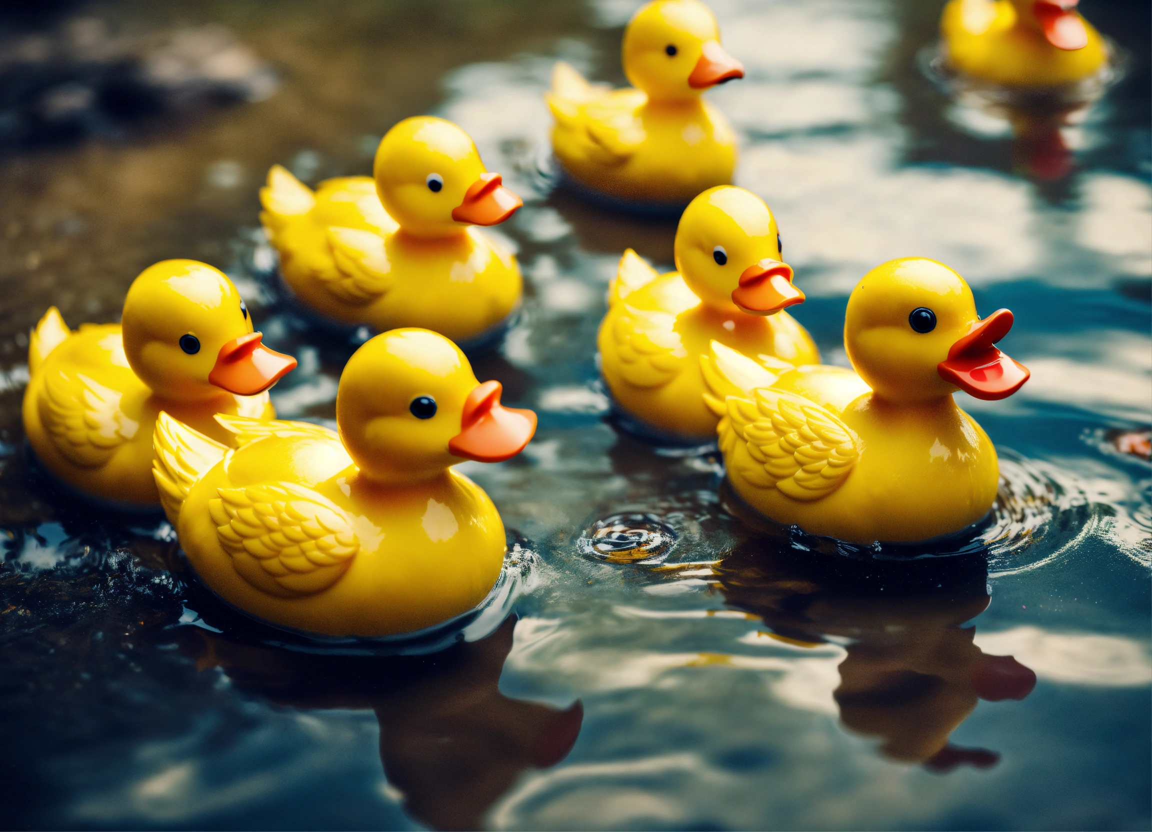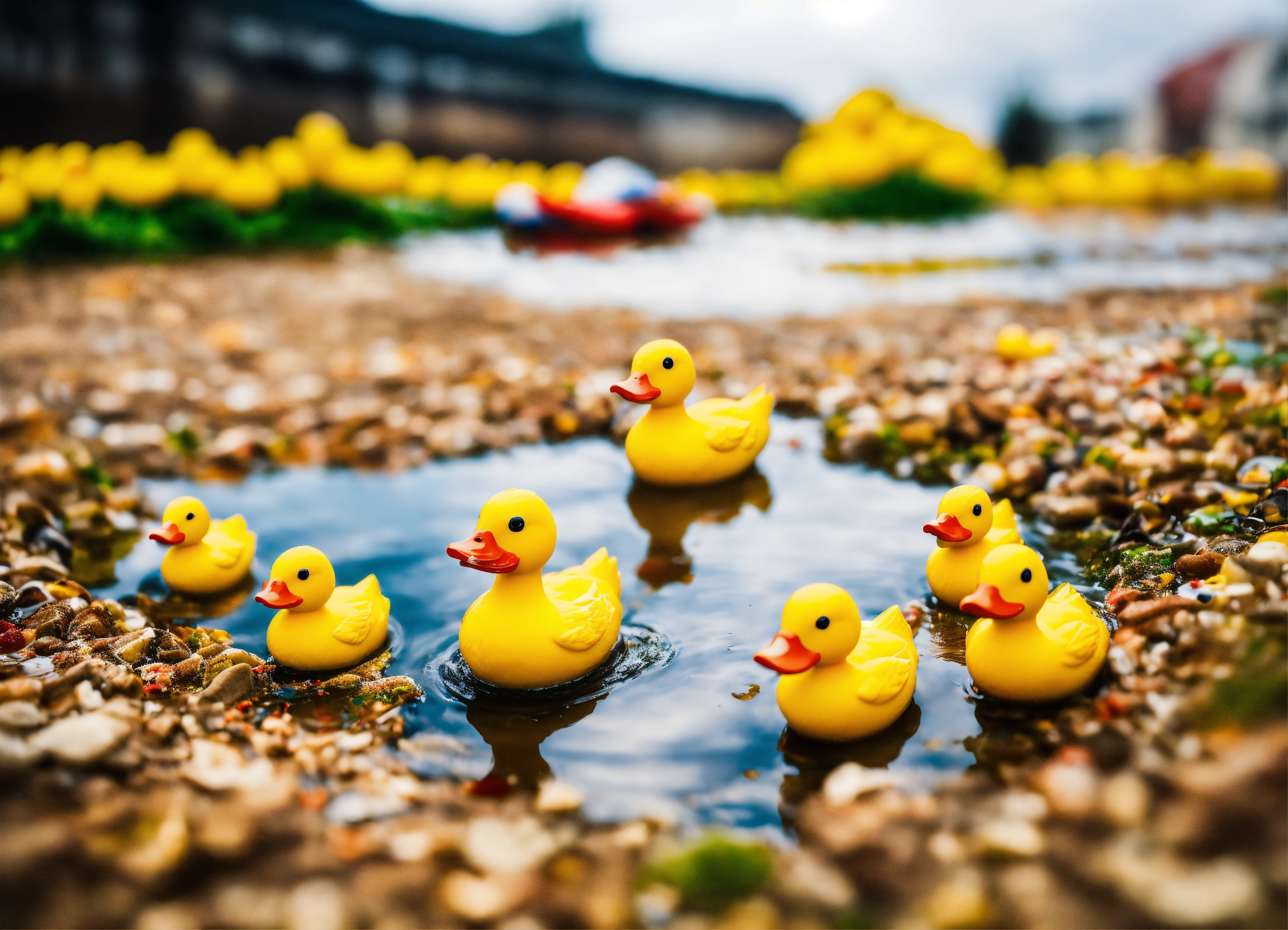 Apply tilt-shift effect to craft a humorous image of a group of rubber ducks navigating through a small puddle as if it’s a vast ocean, with other animals watching in bemusement from the miniature shore.
