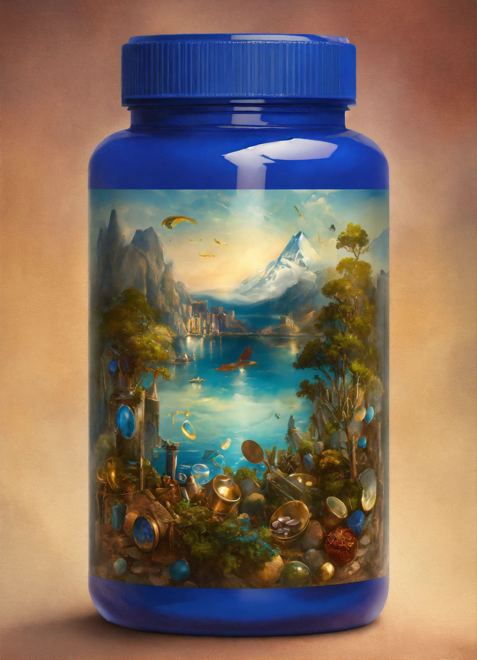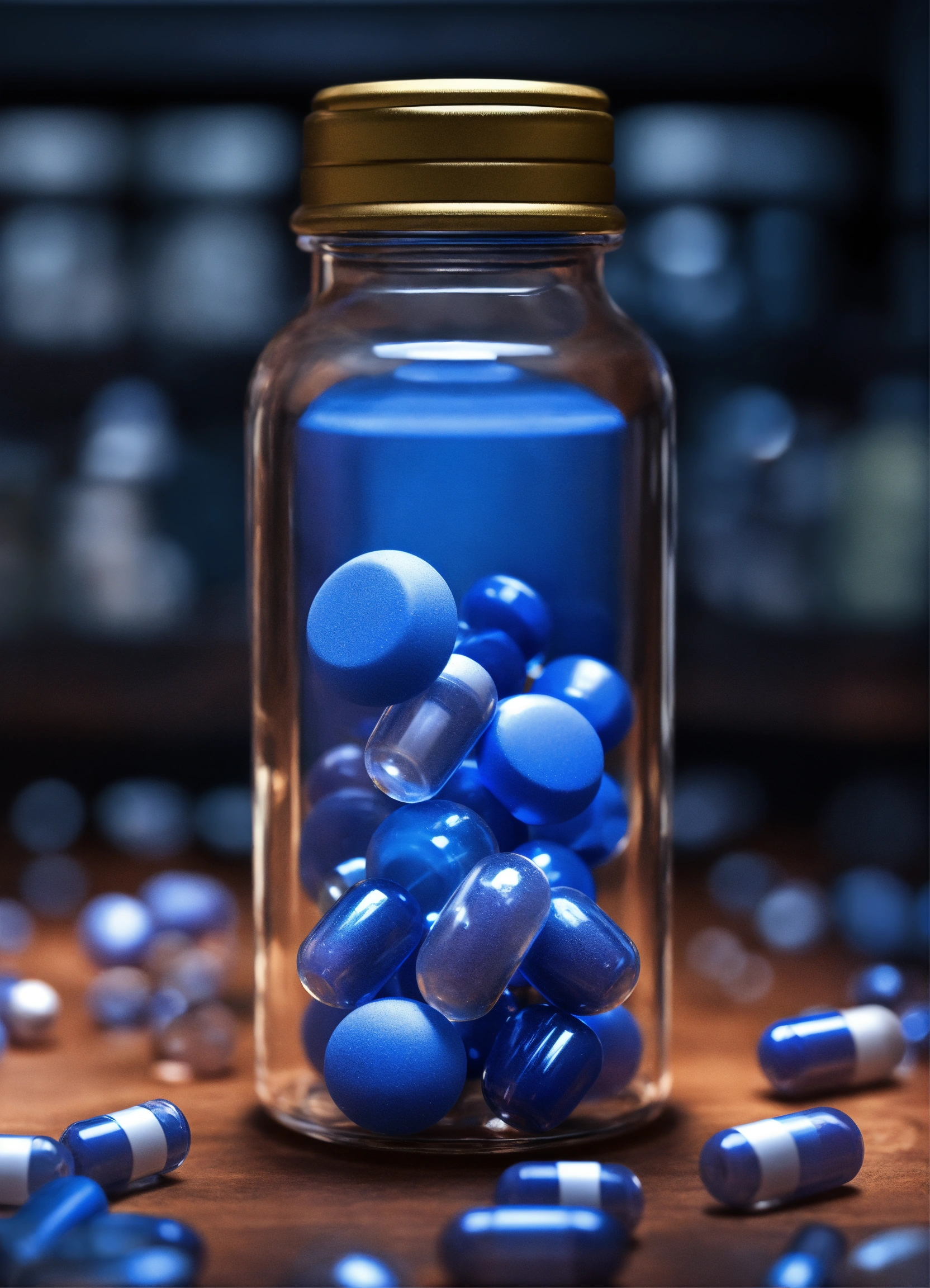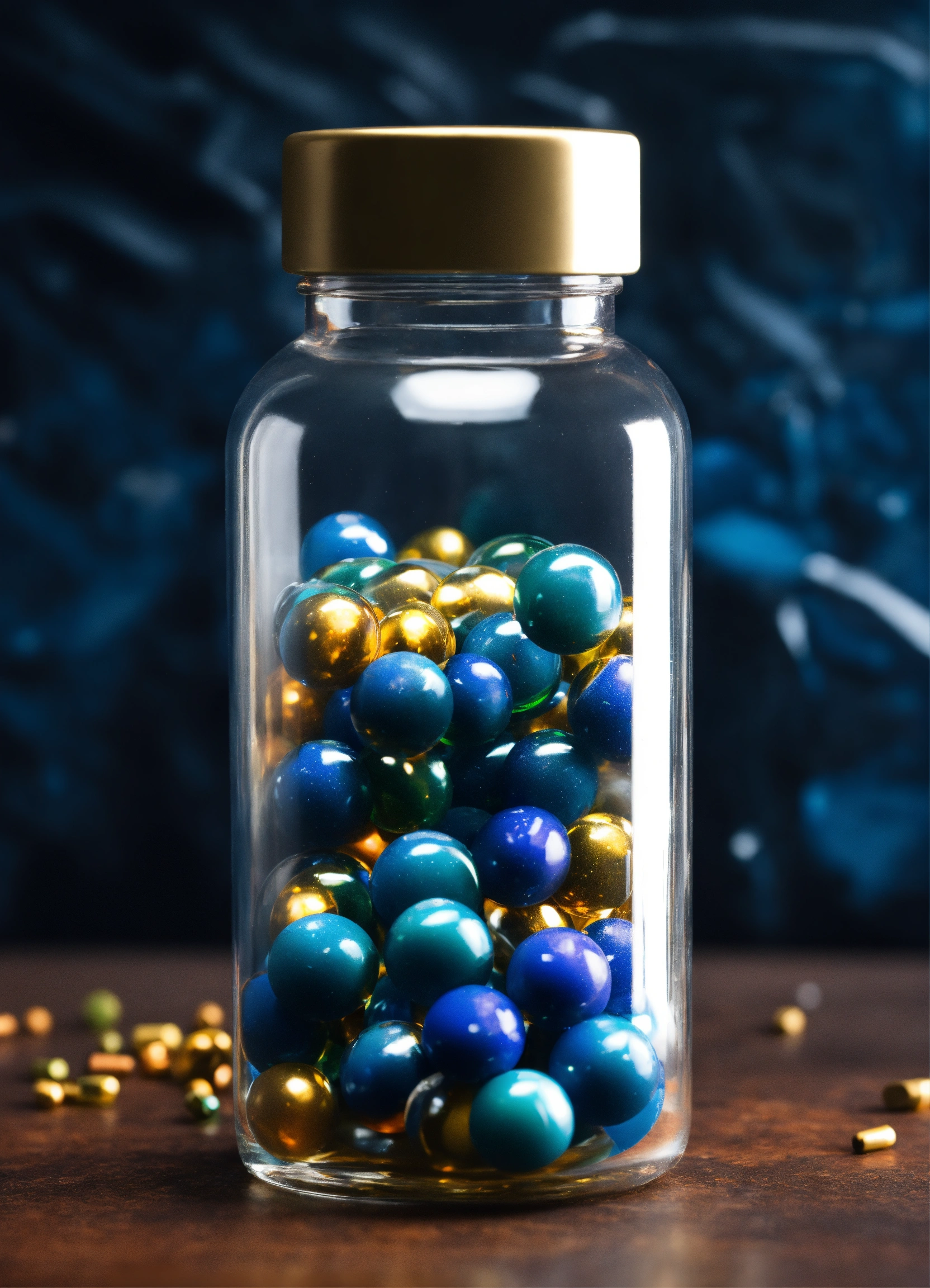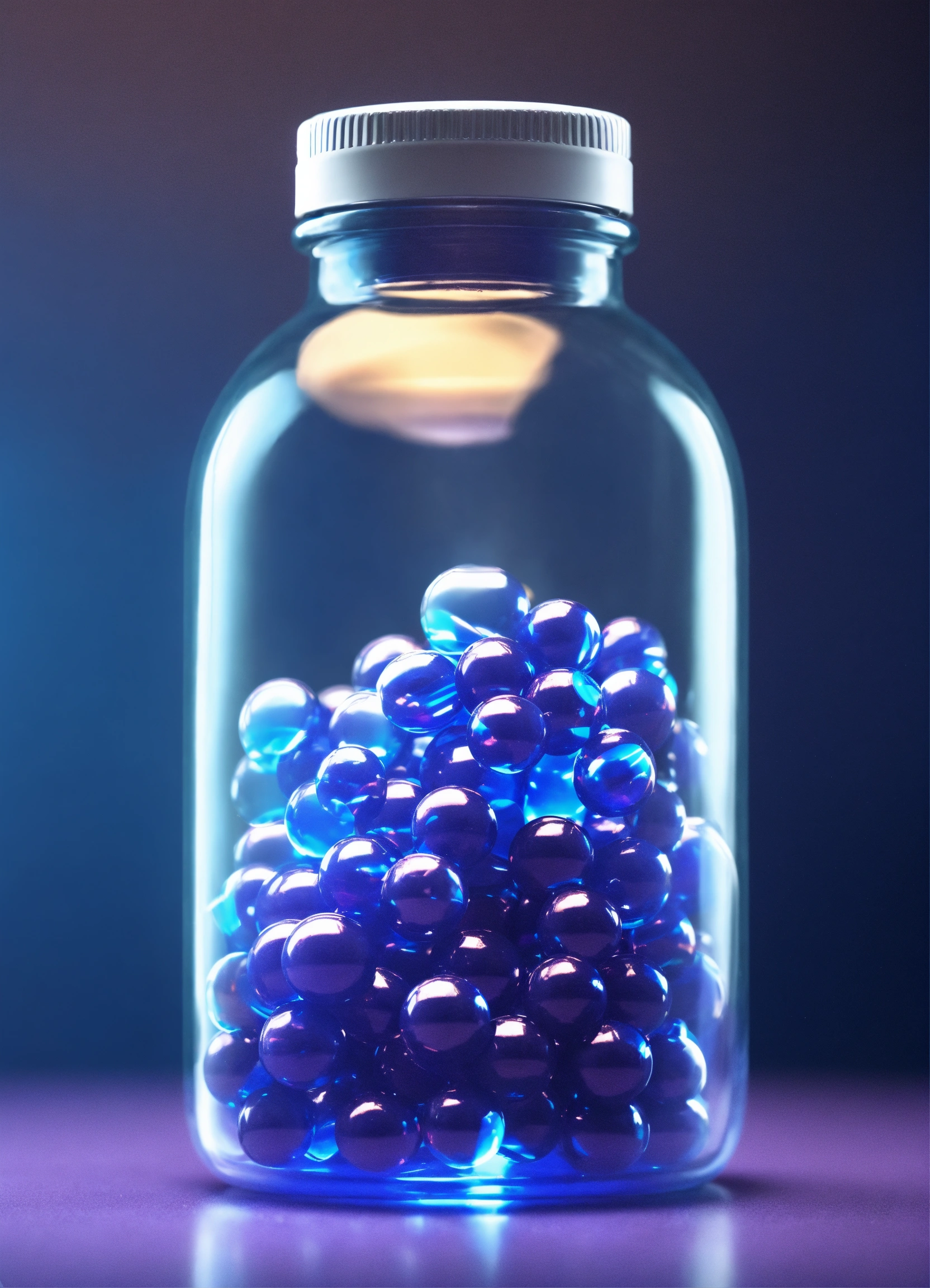 Supplement with high detail capsules inside a tranparent bluen kobalt alchemical bottle