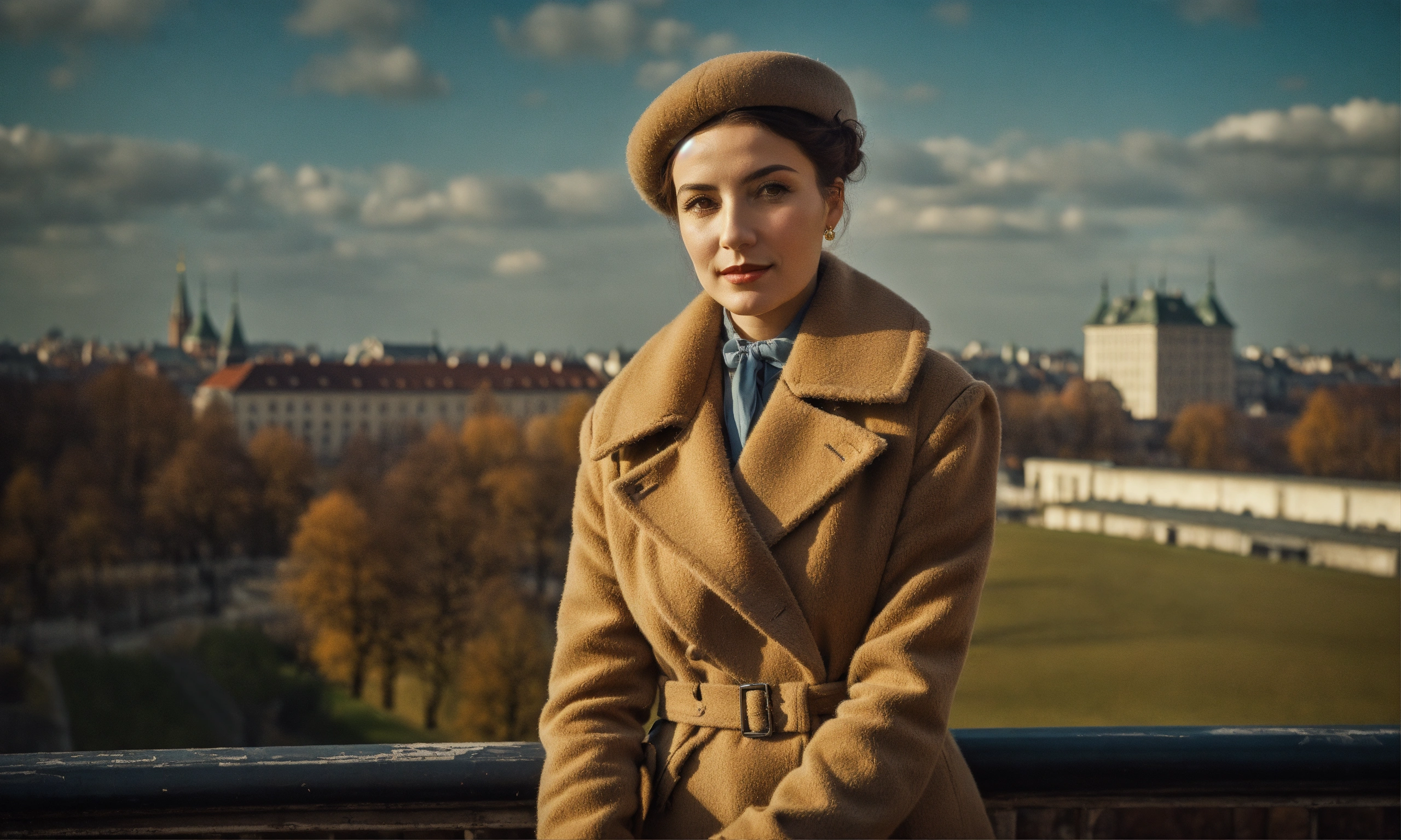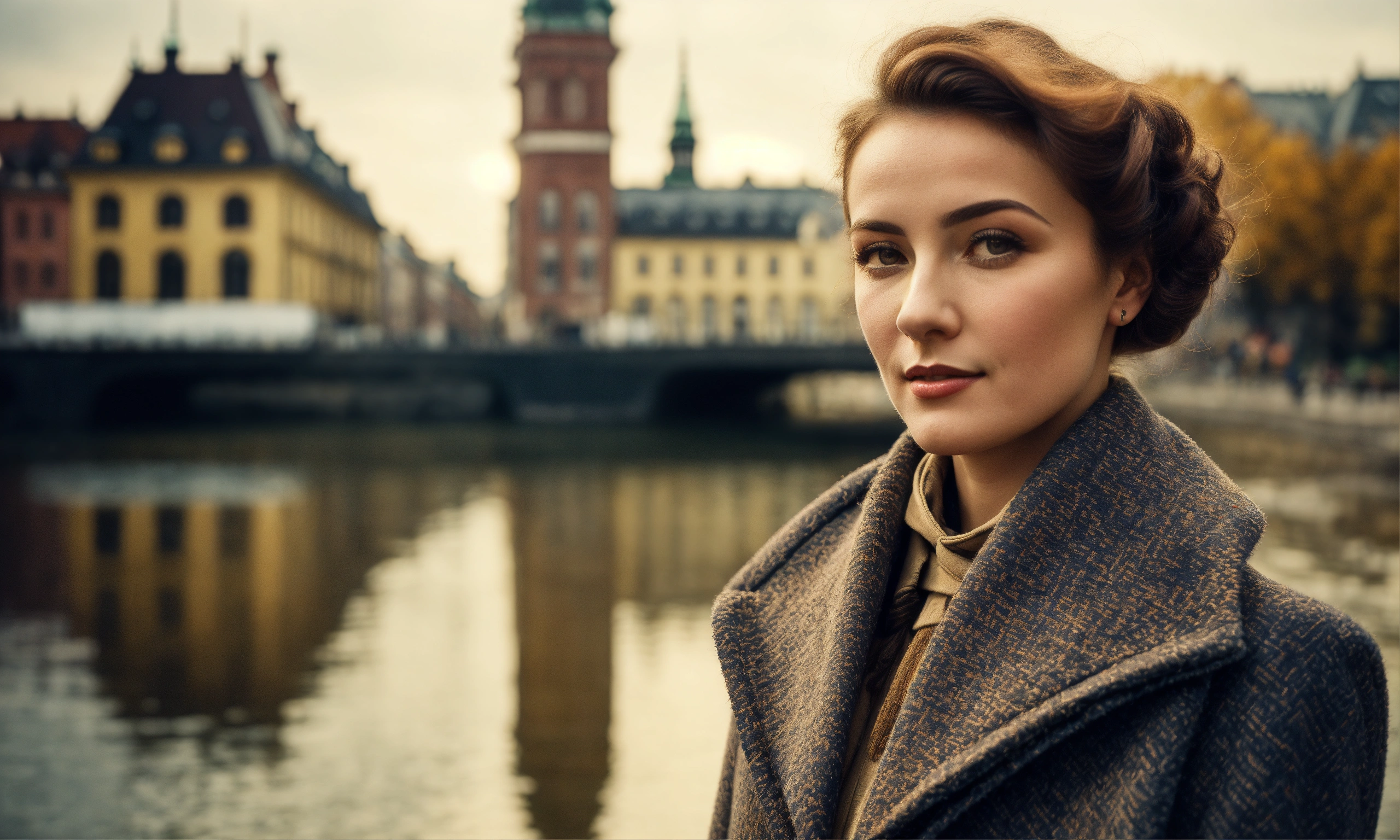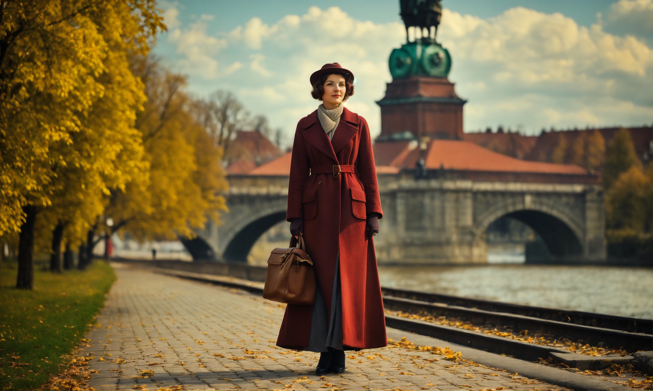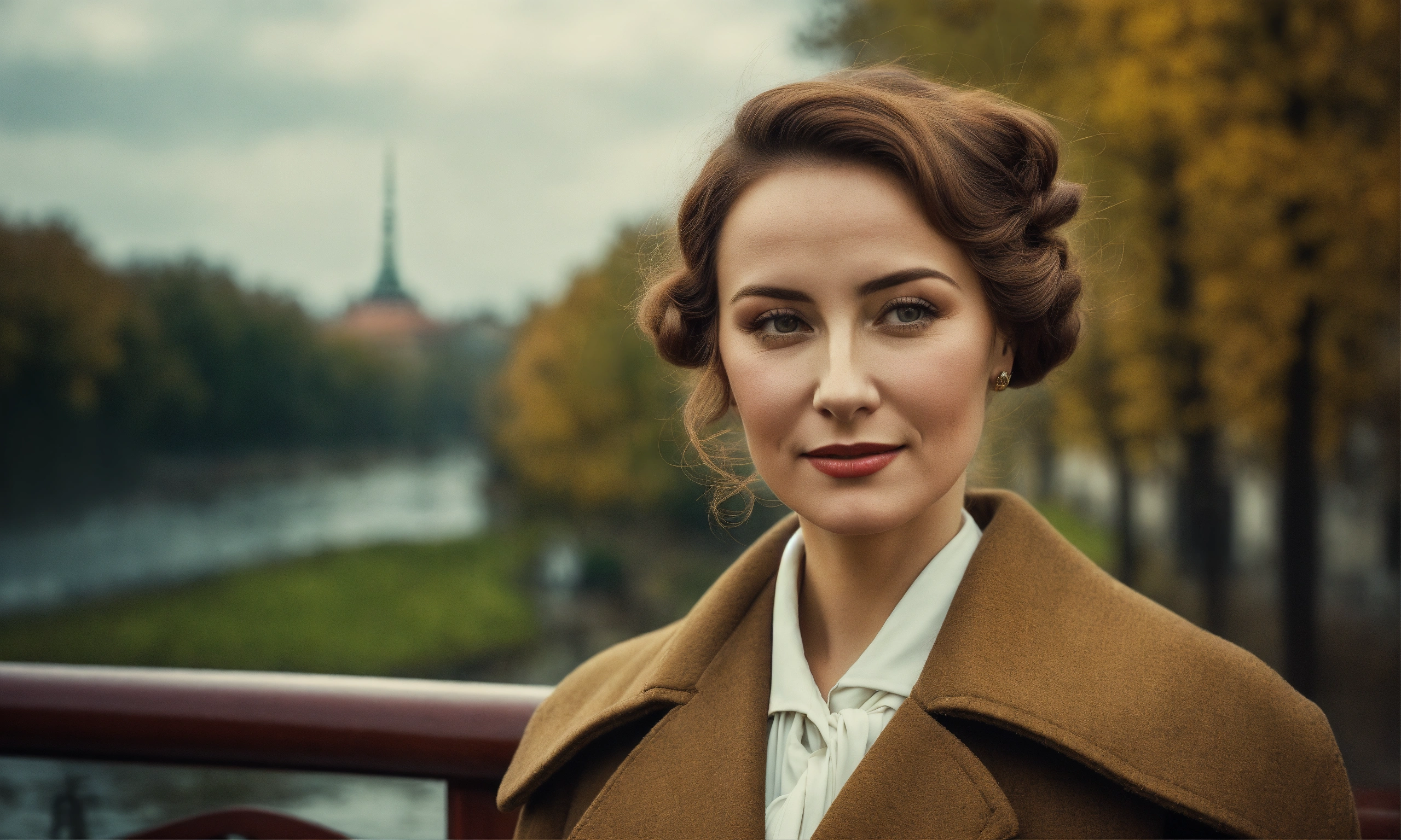 Retro warszawa 1920-1930, сute europian woman, on top of a rievier, looks at the camera at half height, retro style clothing long coat, the woman exudes kindness, calmness and ambition. she has a beard.