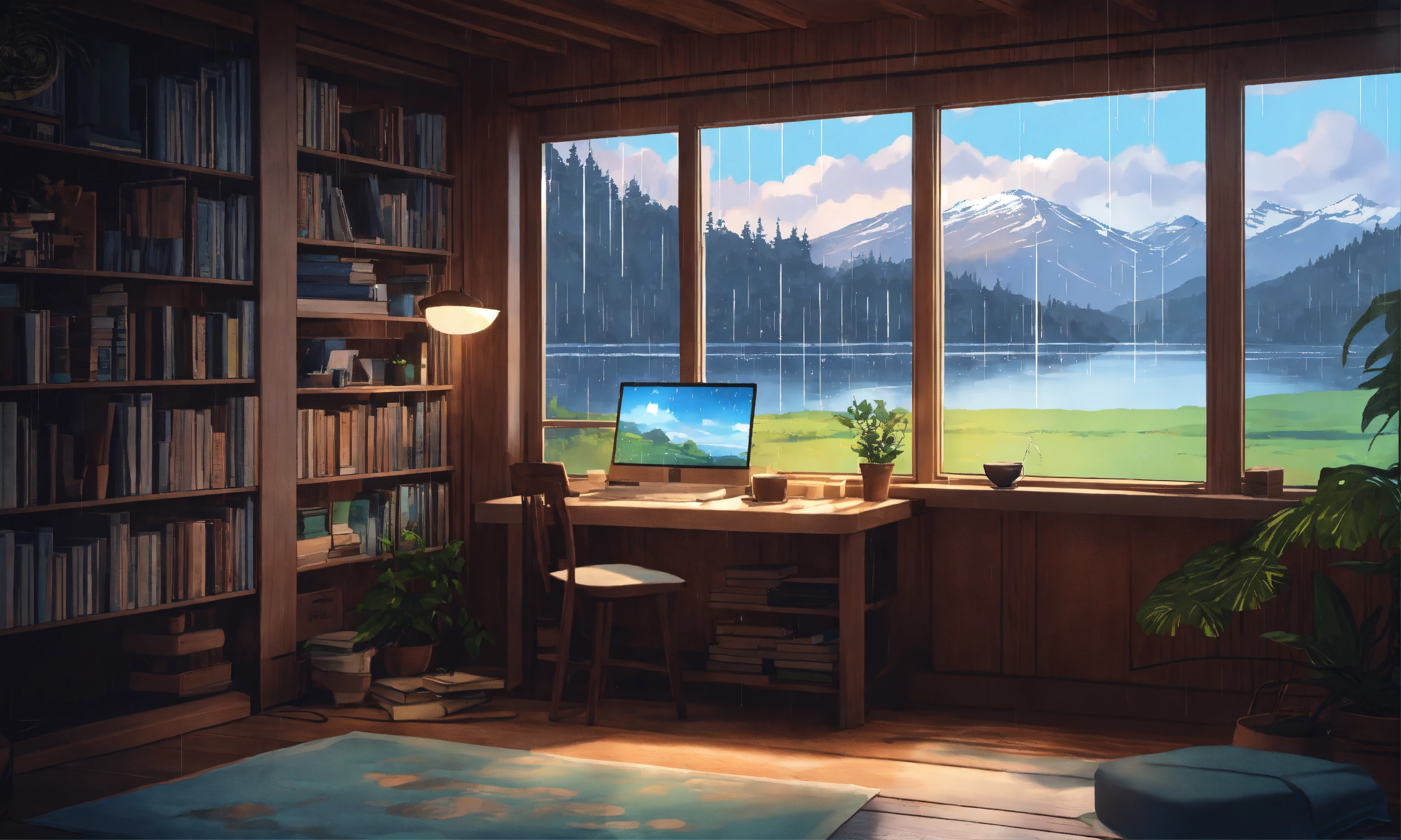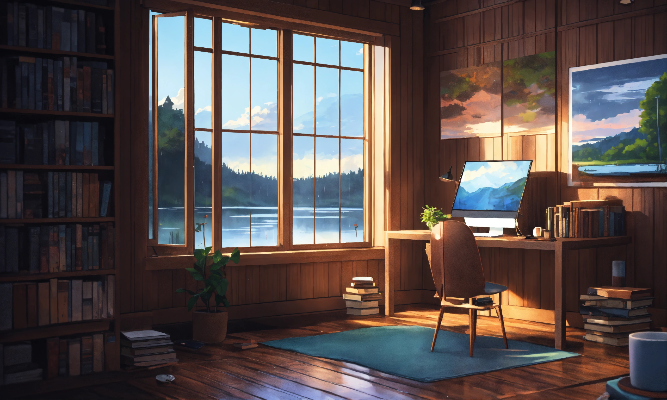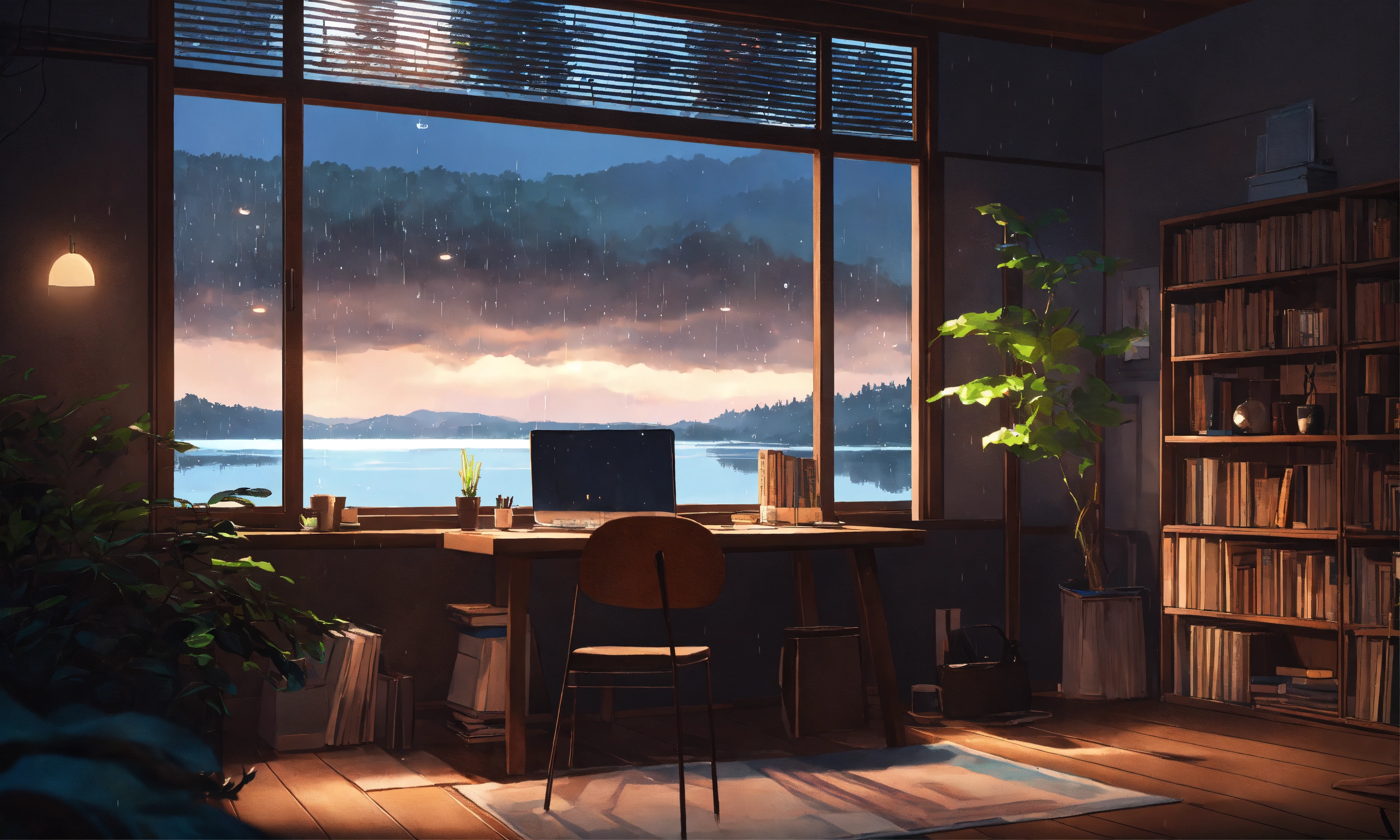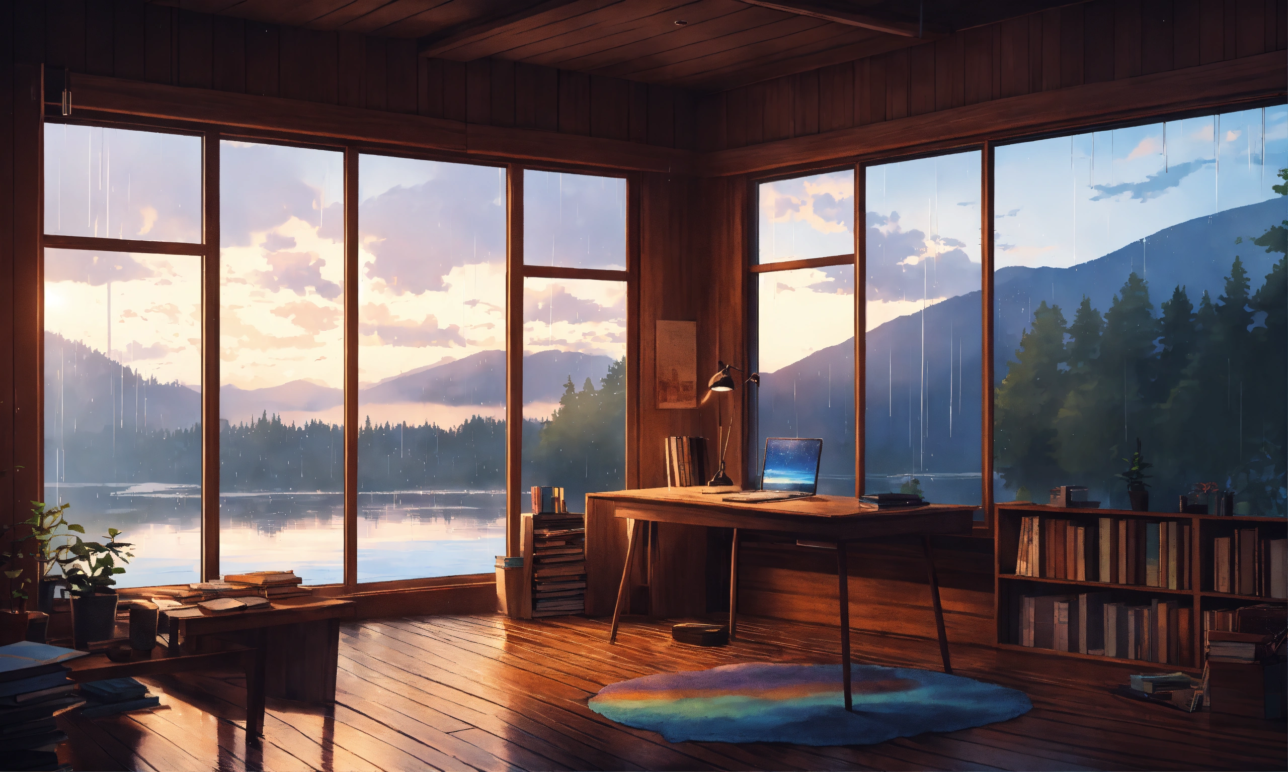 Anime nordic forrest house minimalistic study room, big centered window with view over lake and rain, dark brown wooden study room with blue colored tints, coffee on desk against window, study books, raining evening view, lofi hiphop artwork style, minimalistic