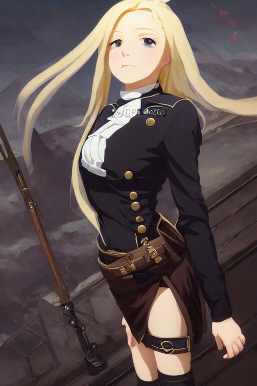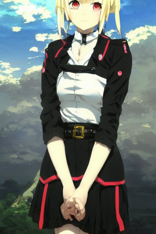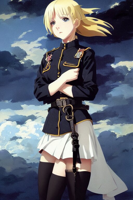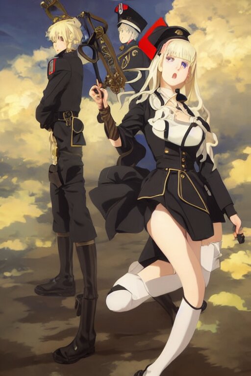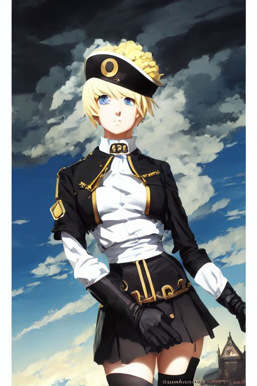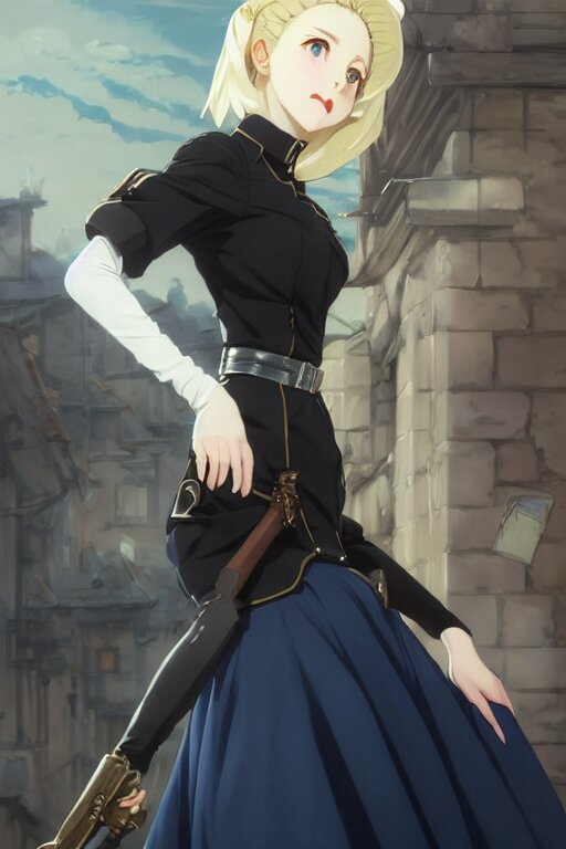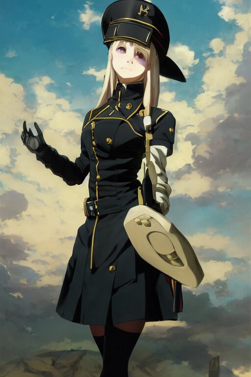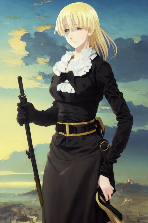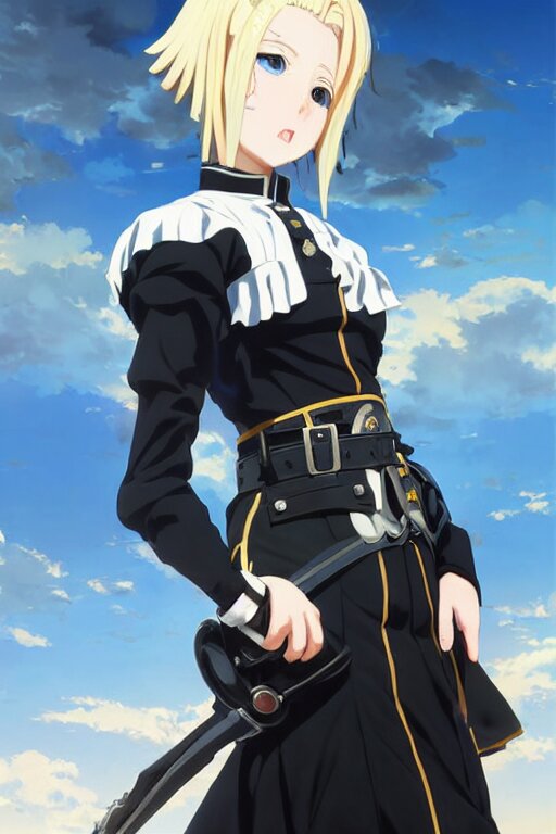 Baroque oil painting anime key visual full body portrait character concept art of young maid nazi secret police, flowing blonde hair blue eyes, tight black leather military commander nazi uniform, garter belt skirt, gap moe kuudere noble grimdark dictator, trending pixiv fanbox, by greg rutkowski makoto shinkai takashi takeuchi studio ghibli jamie wyeth