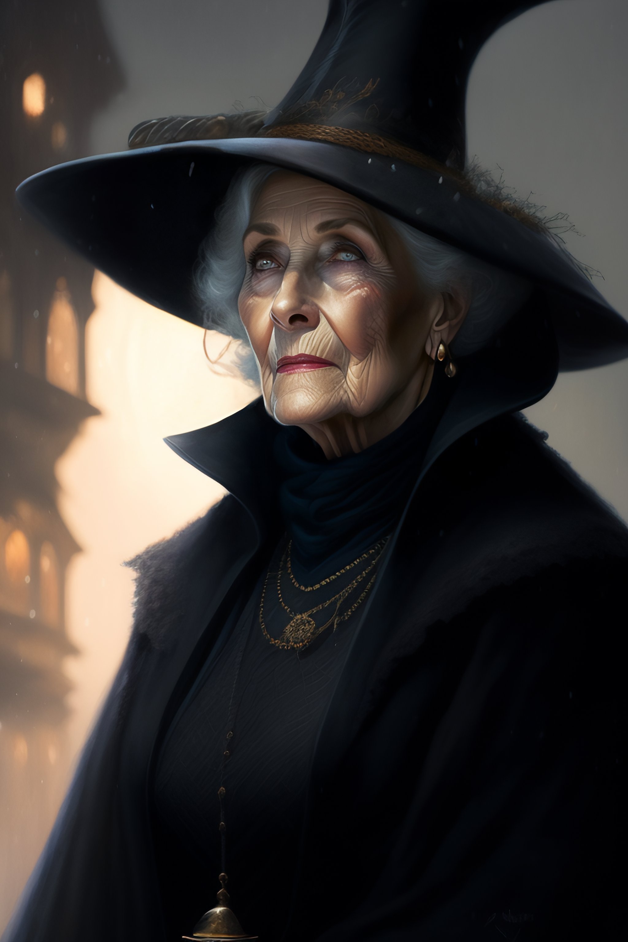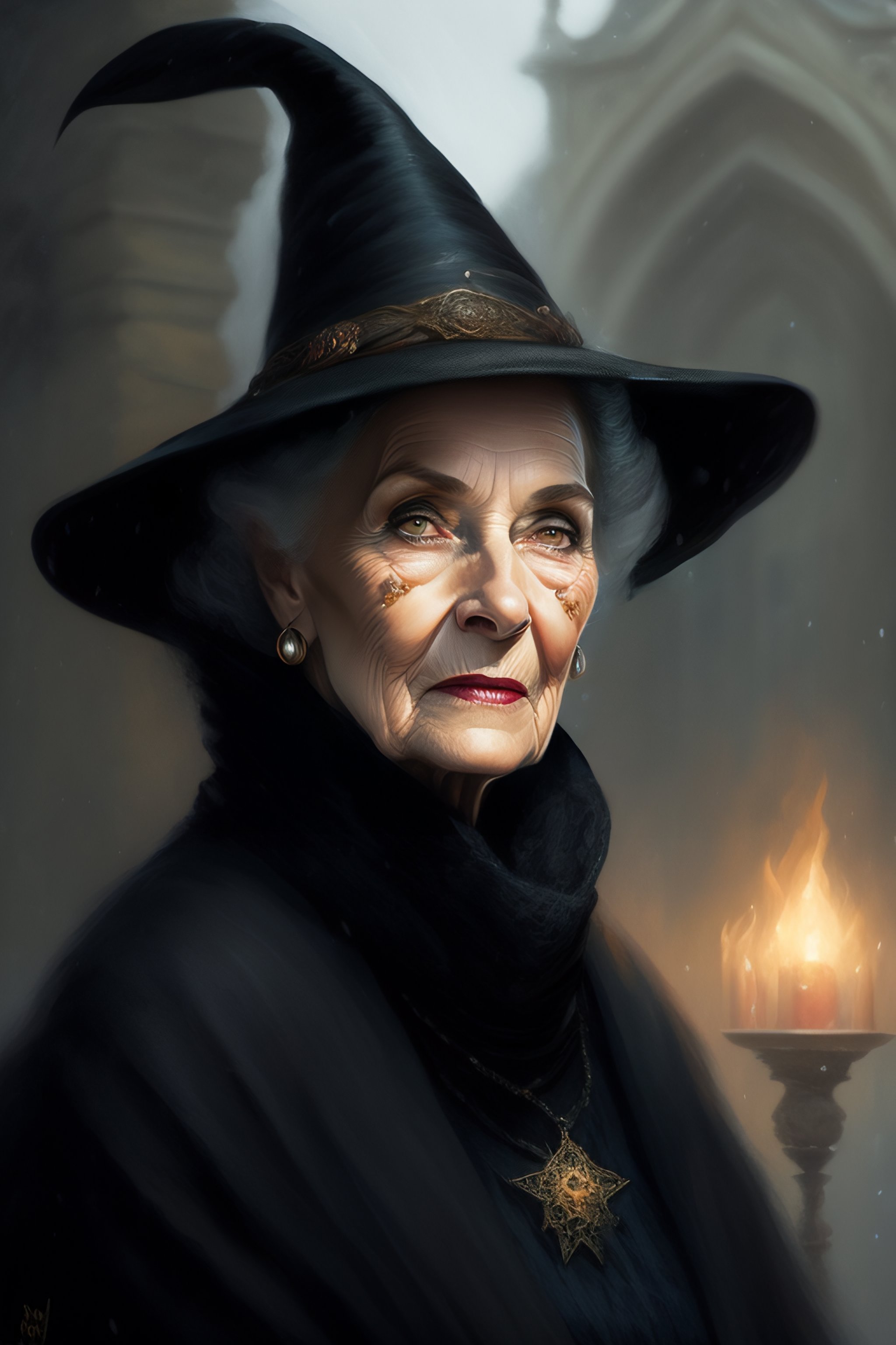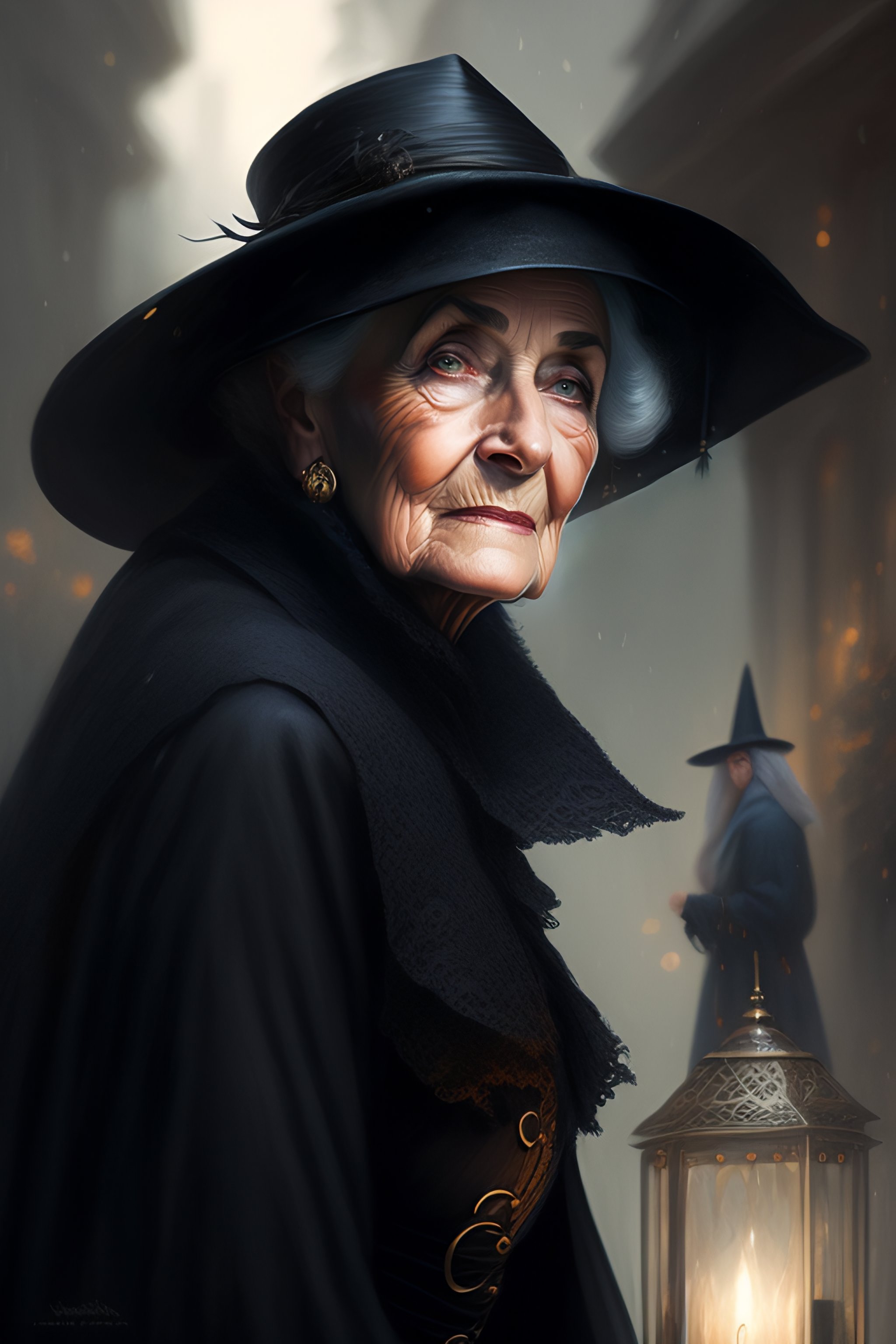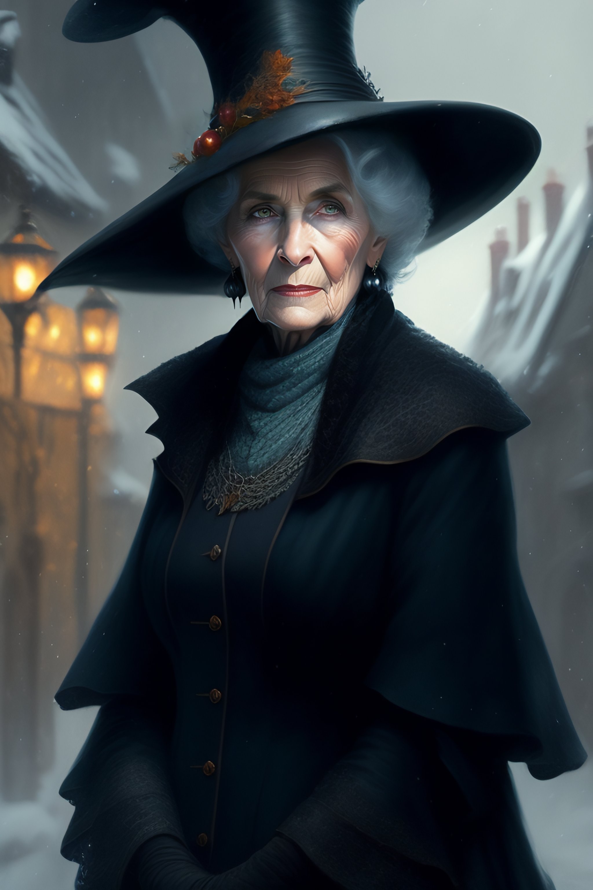 Granny weatherwax, an old lady, a witch, with a wicked expression. she is dressed in a black witch hat. beautiful painting with a very detailed face by greg rutkowski and magali villanueve