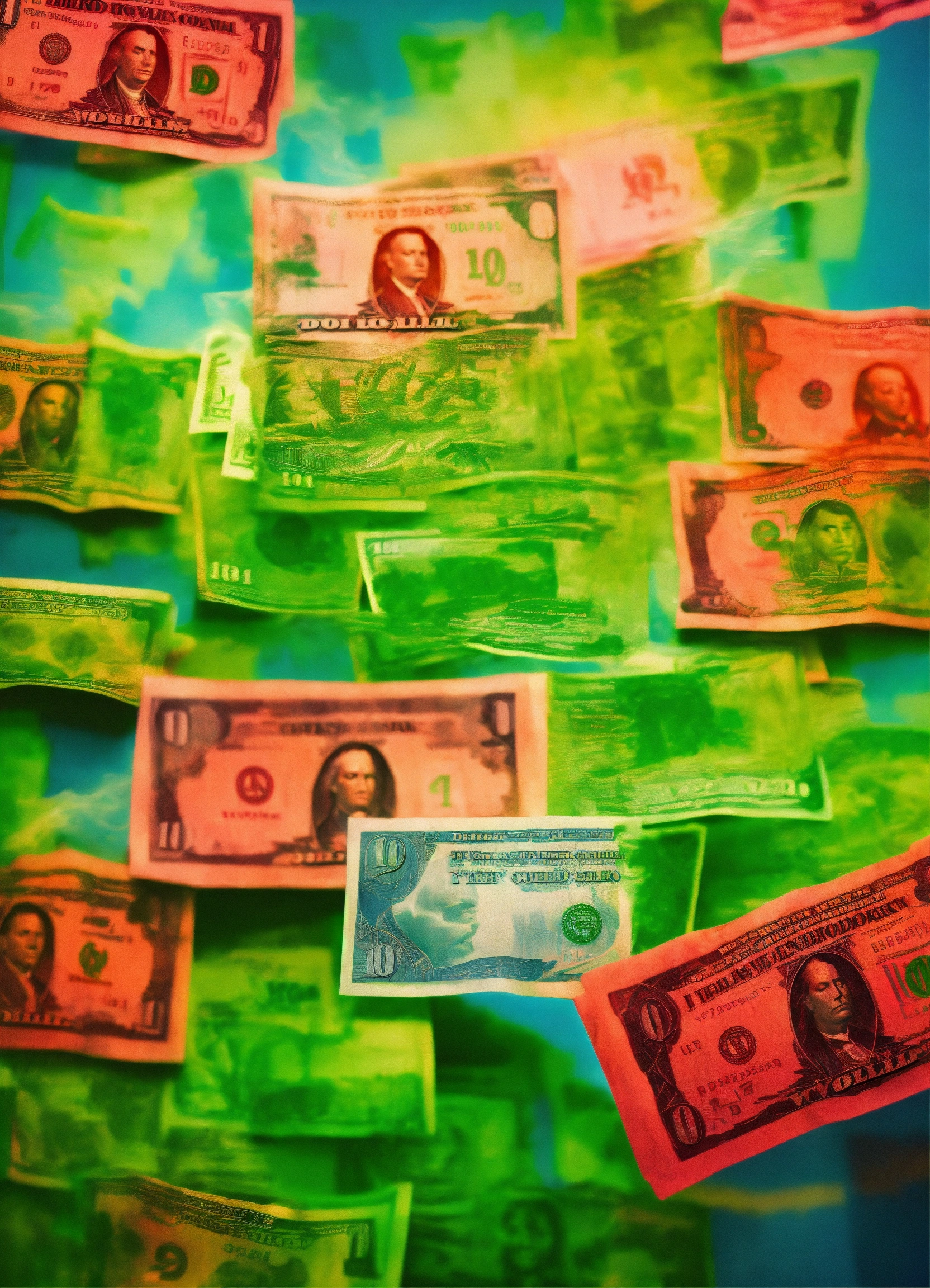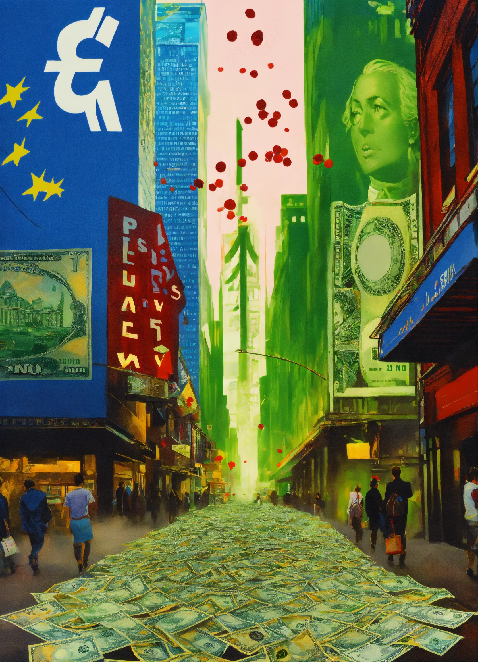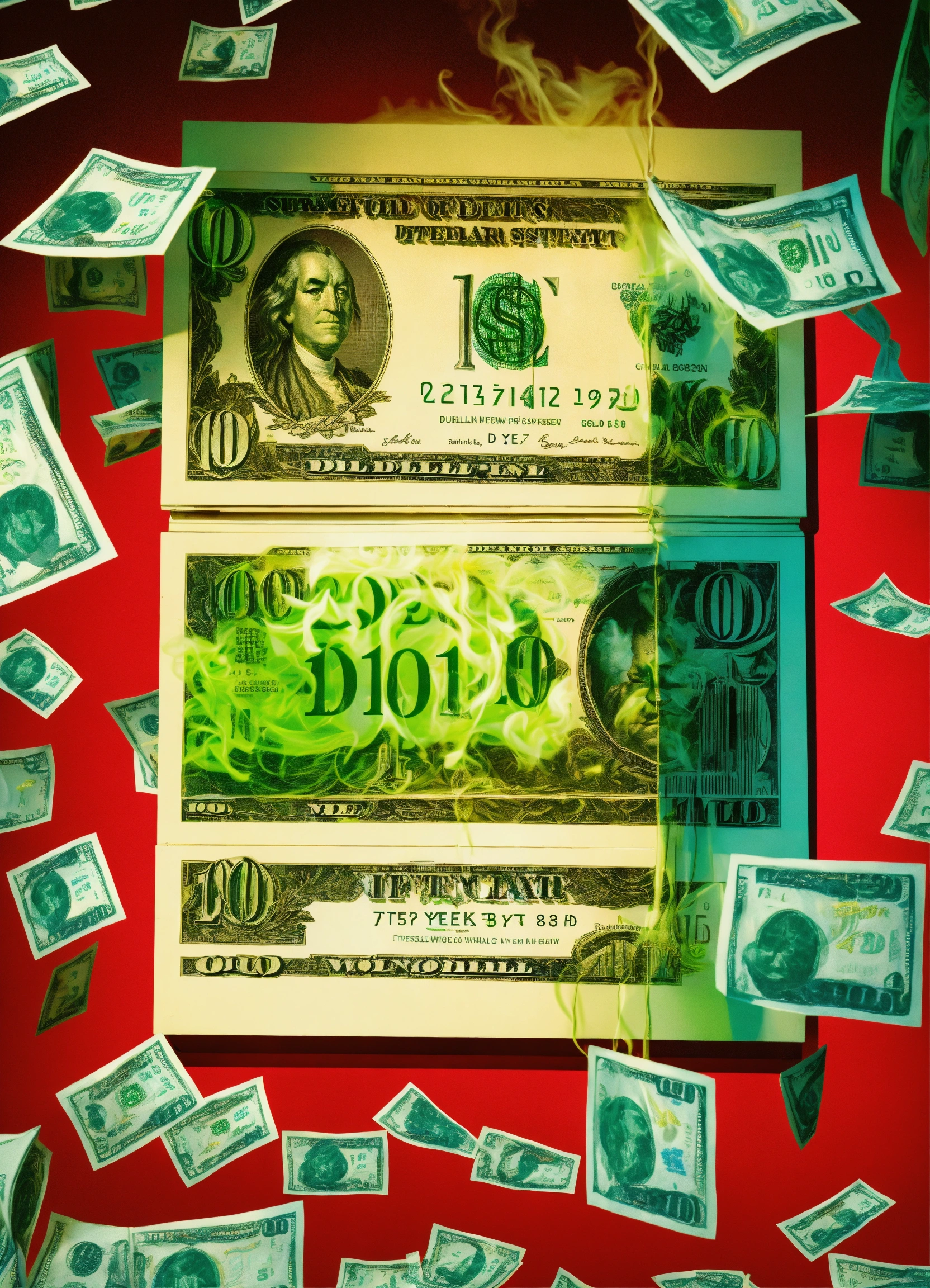 Superrealist style, urban pop art street style, dollar bills floating, different money big symbols, yen, euro, gold, dollar sign, stockmarket indices graphics, wall street style, blue red shadows glowing fluorescent green smoke, white harsh light