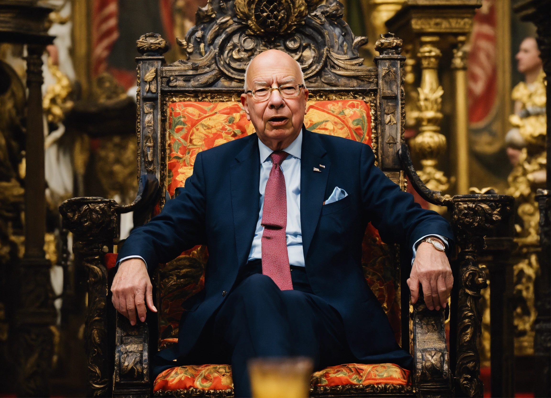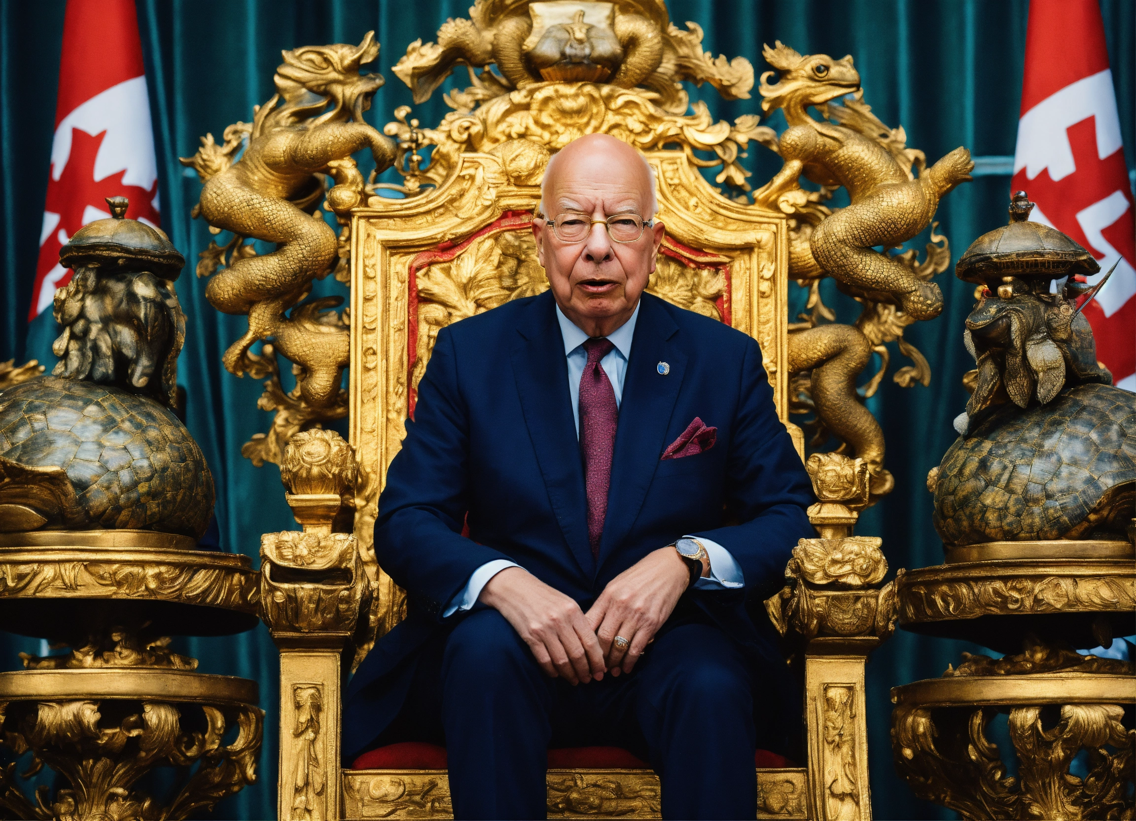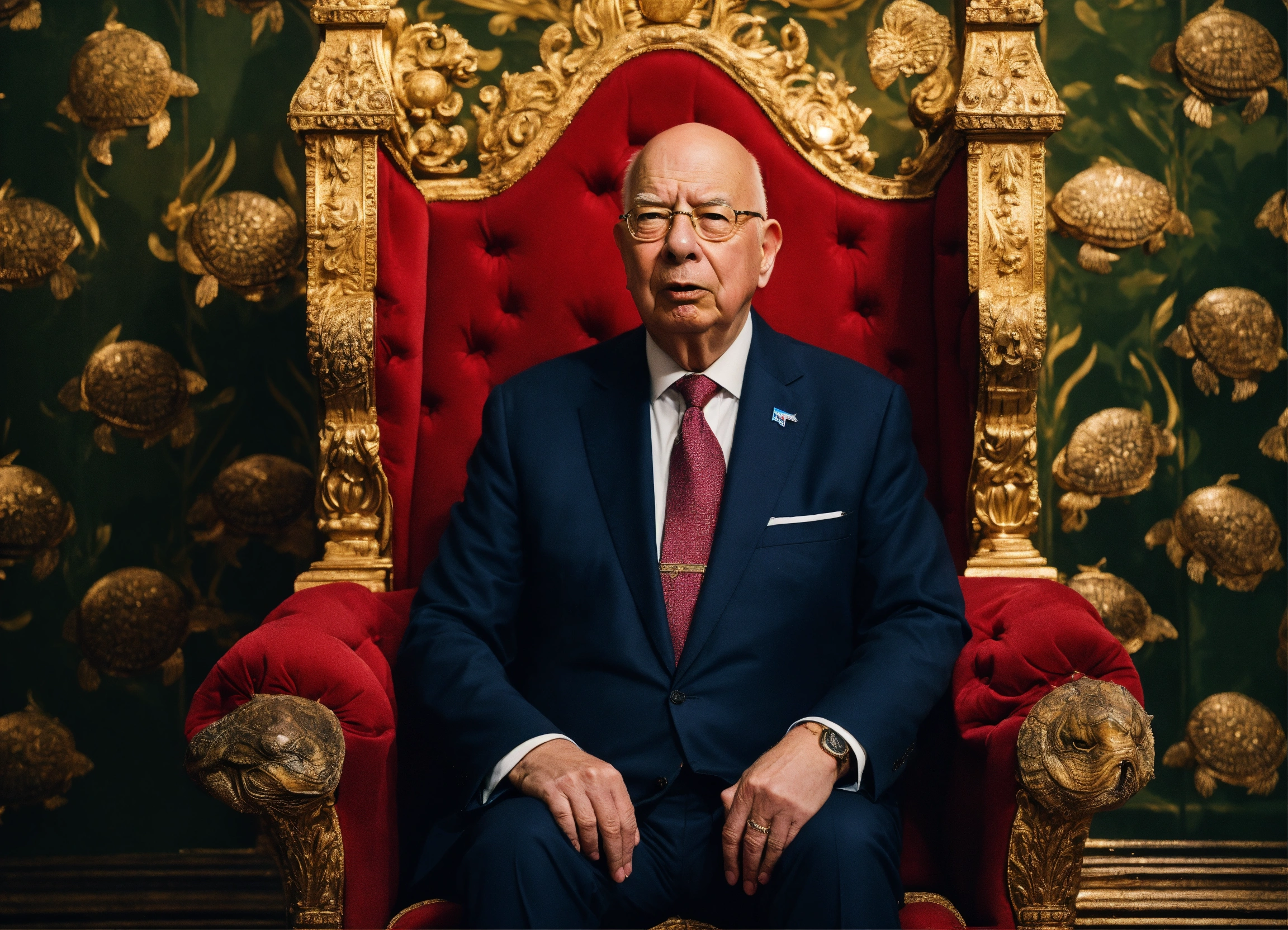 Very old klaus schwab, totally bald, squinting eyes, pointed turtle lip. angry, sitting on a throne, surrounded by hundreds of tiny politicians