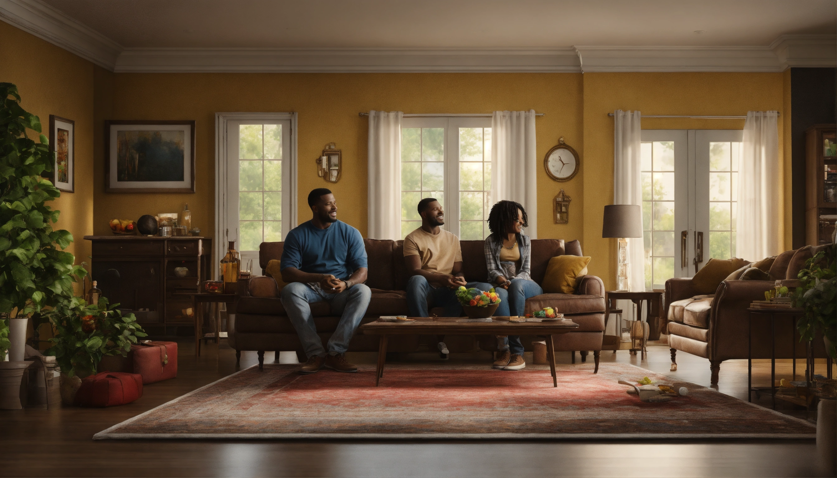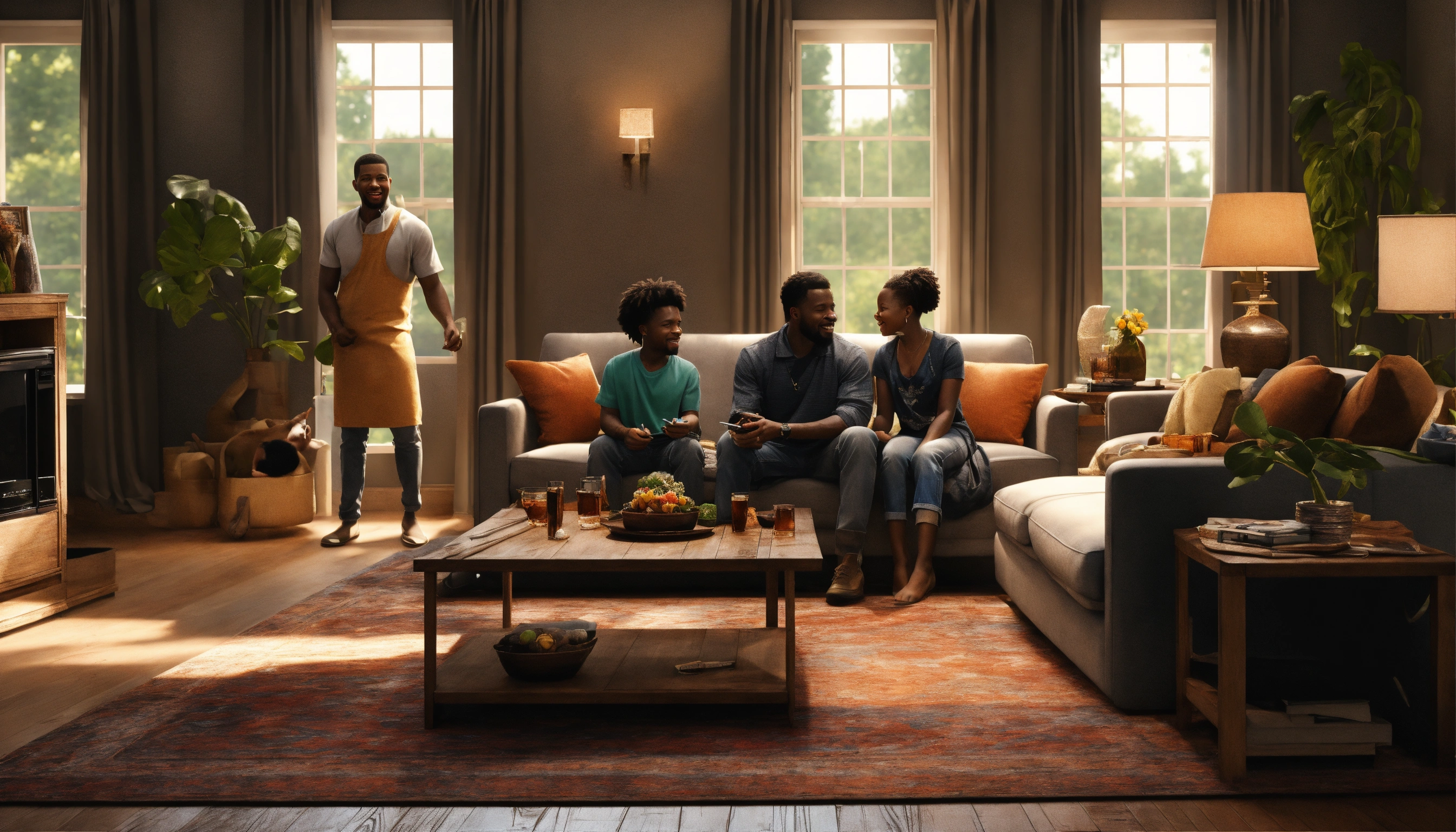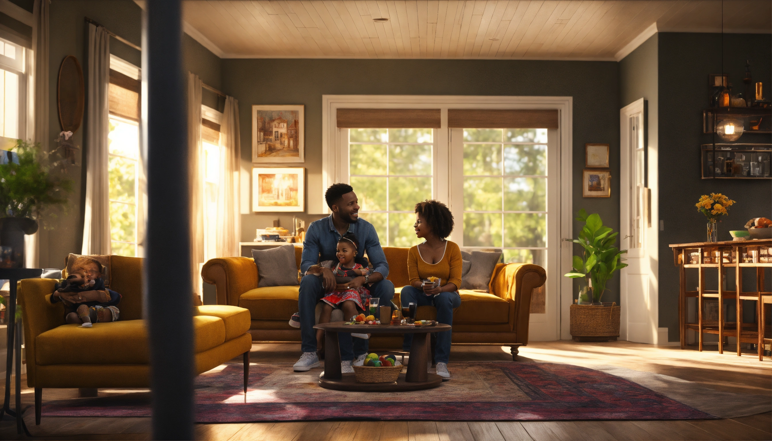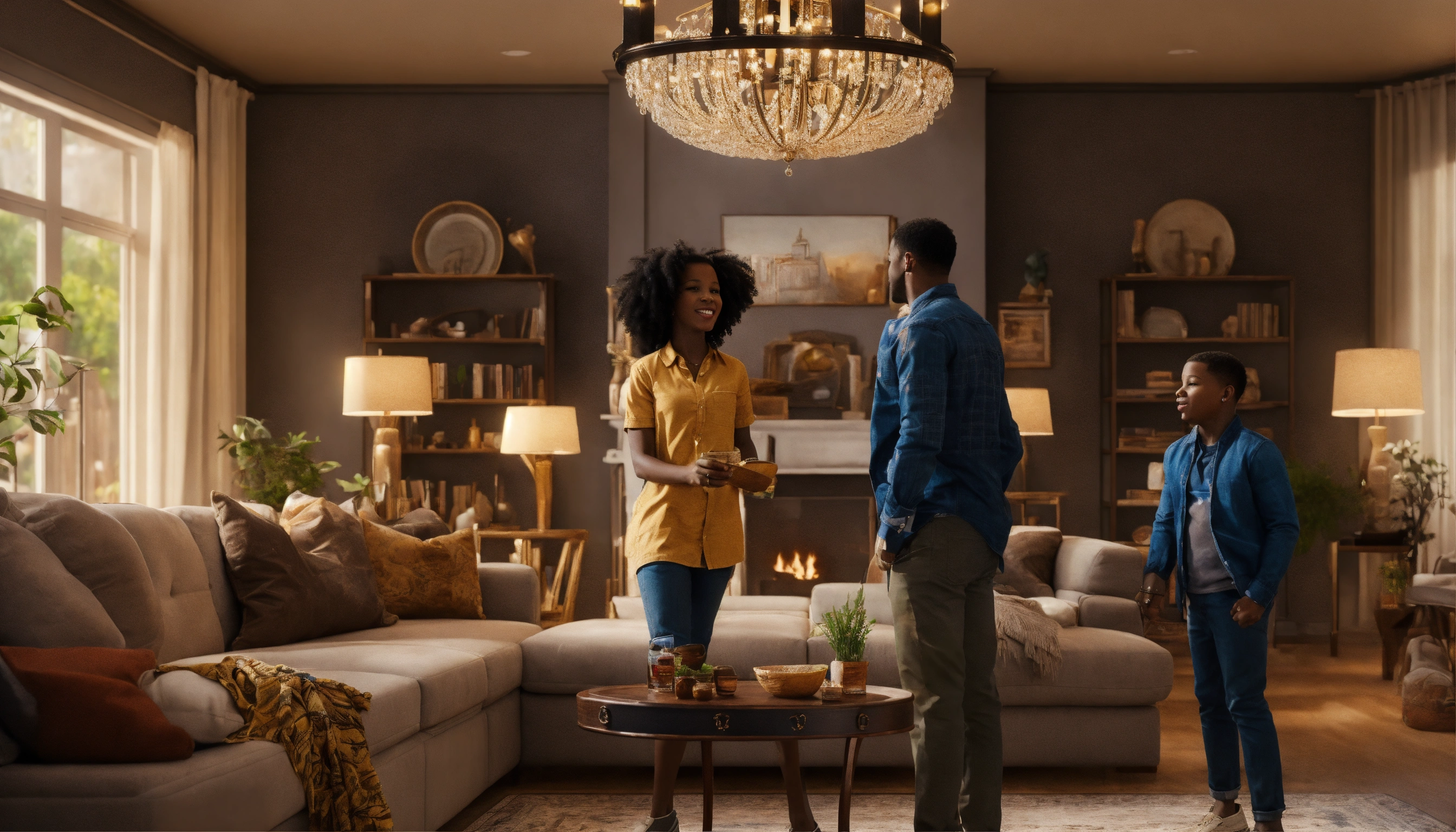 Black husband, black wife, 2 black kids, celebrating inside the house, furnitures in the background, big house, very detailed, extreme realistic, not paint, not art work, 4k, real photos