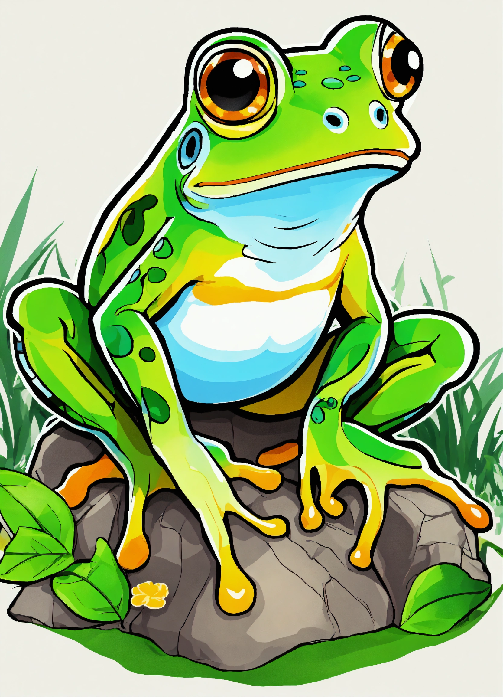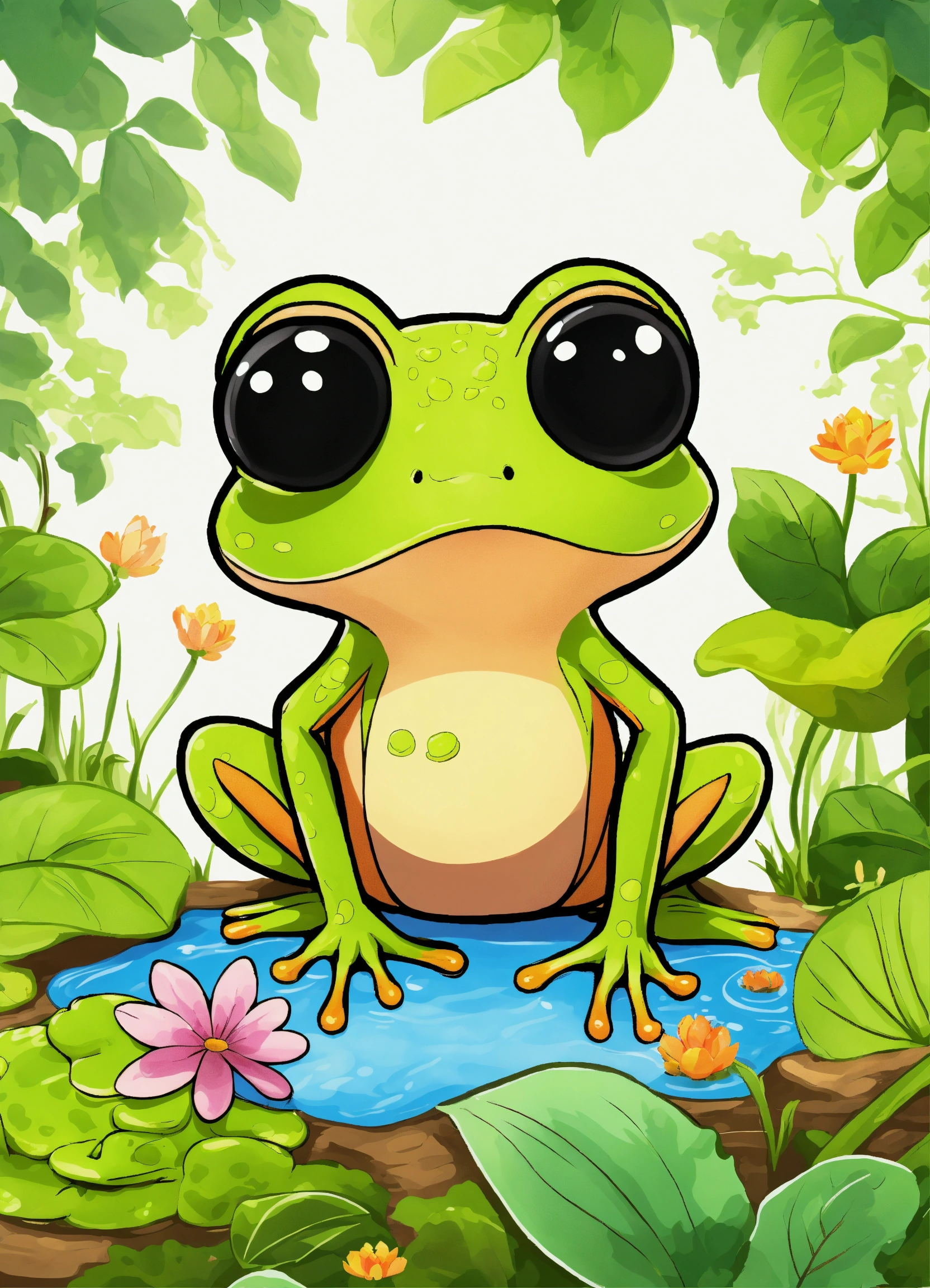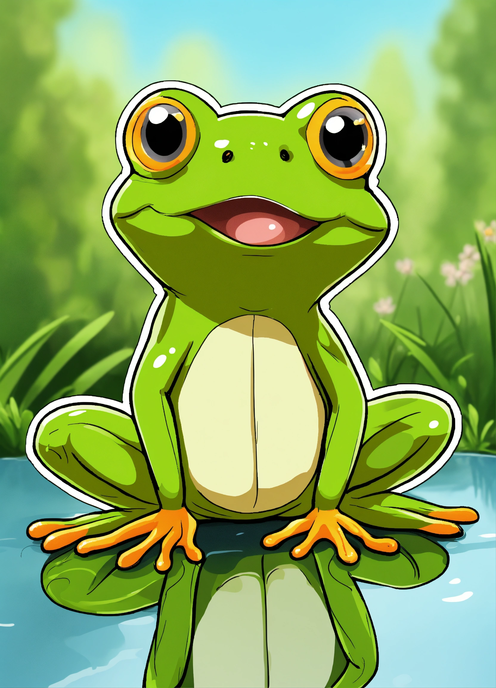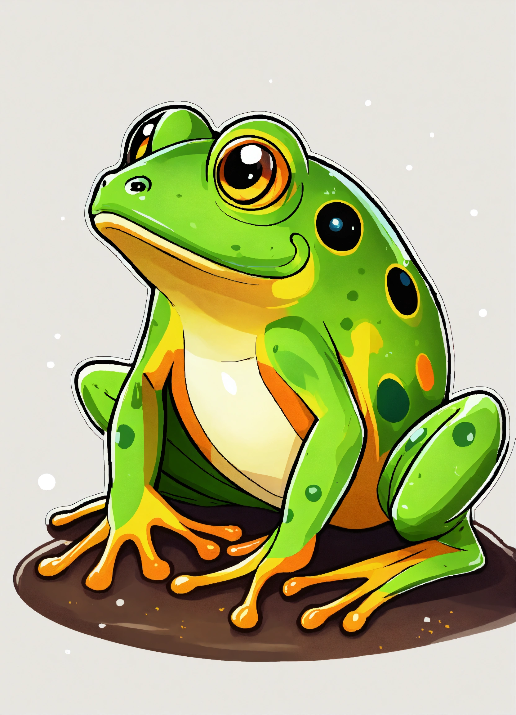 Generate a cute frog of the selve, 4k resolution, cartoon-sticker style with clear lines on a pure white background suitable for a children's coloring book.