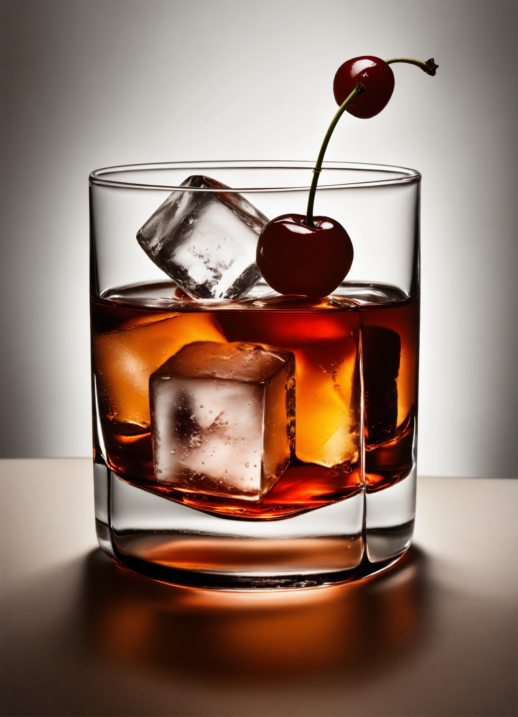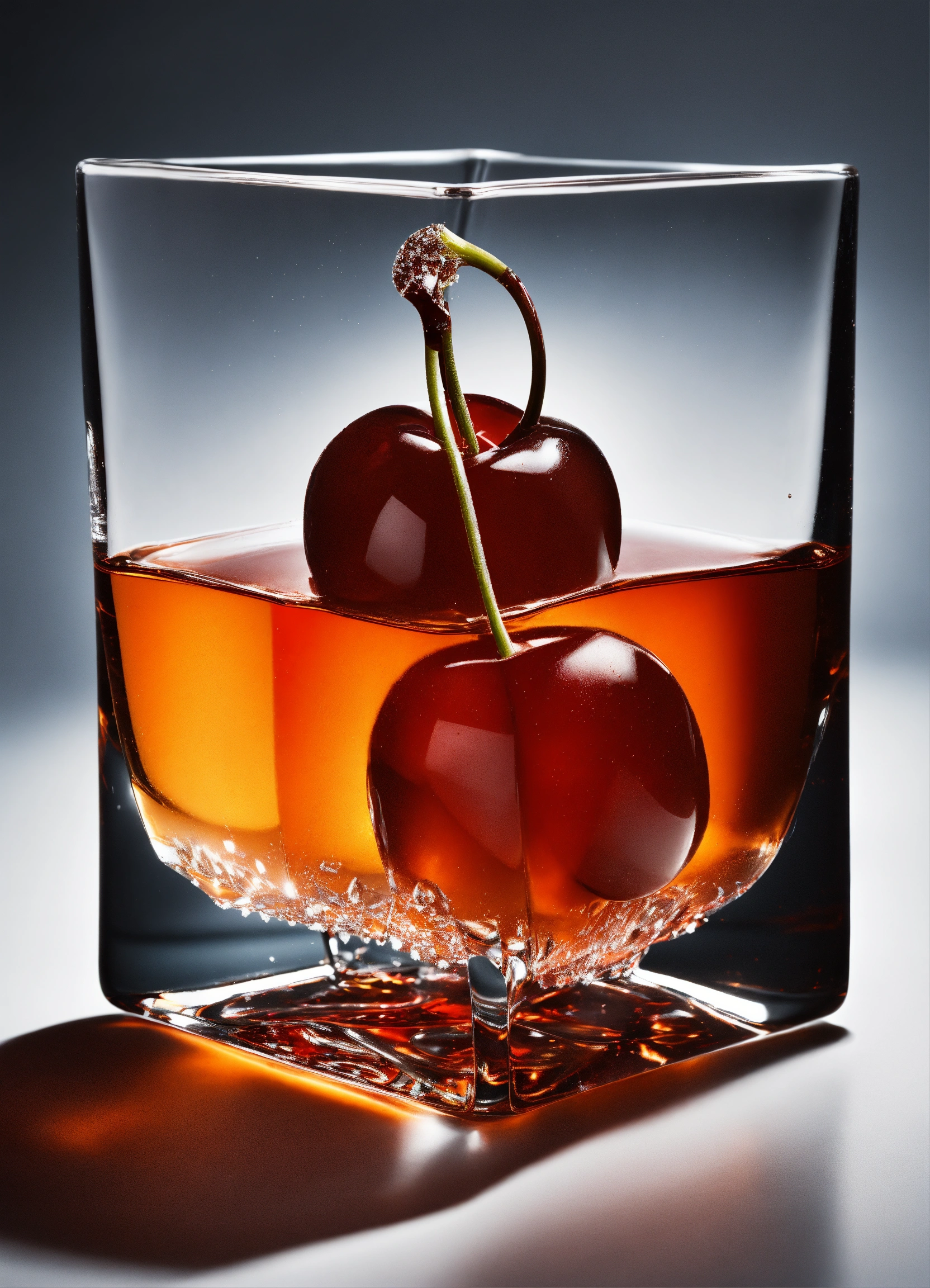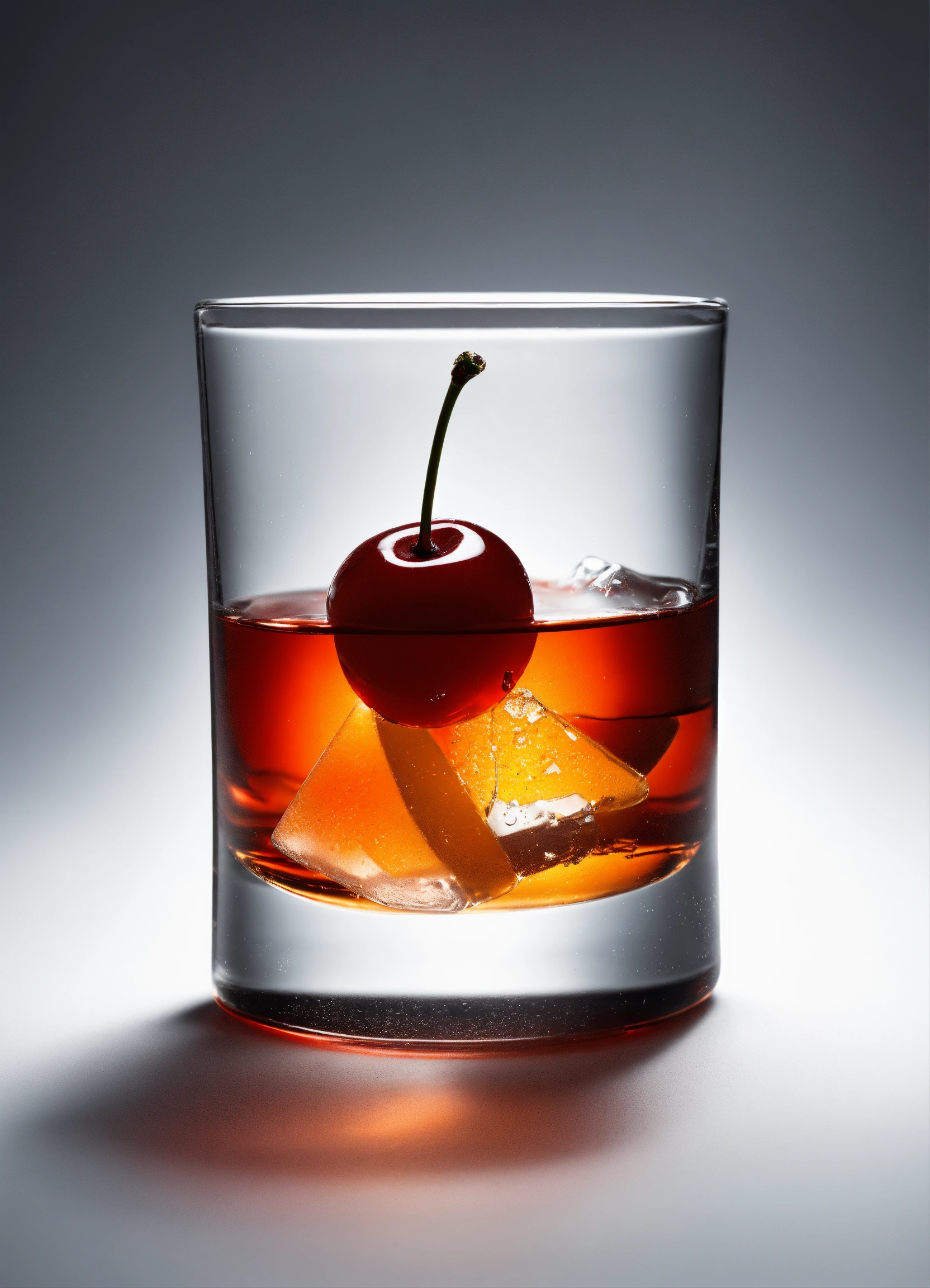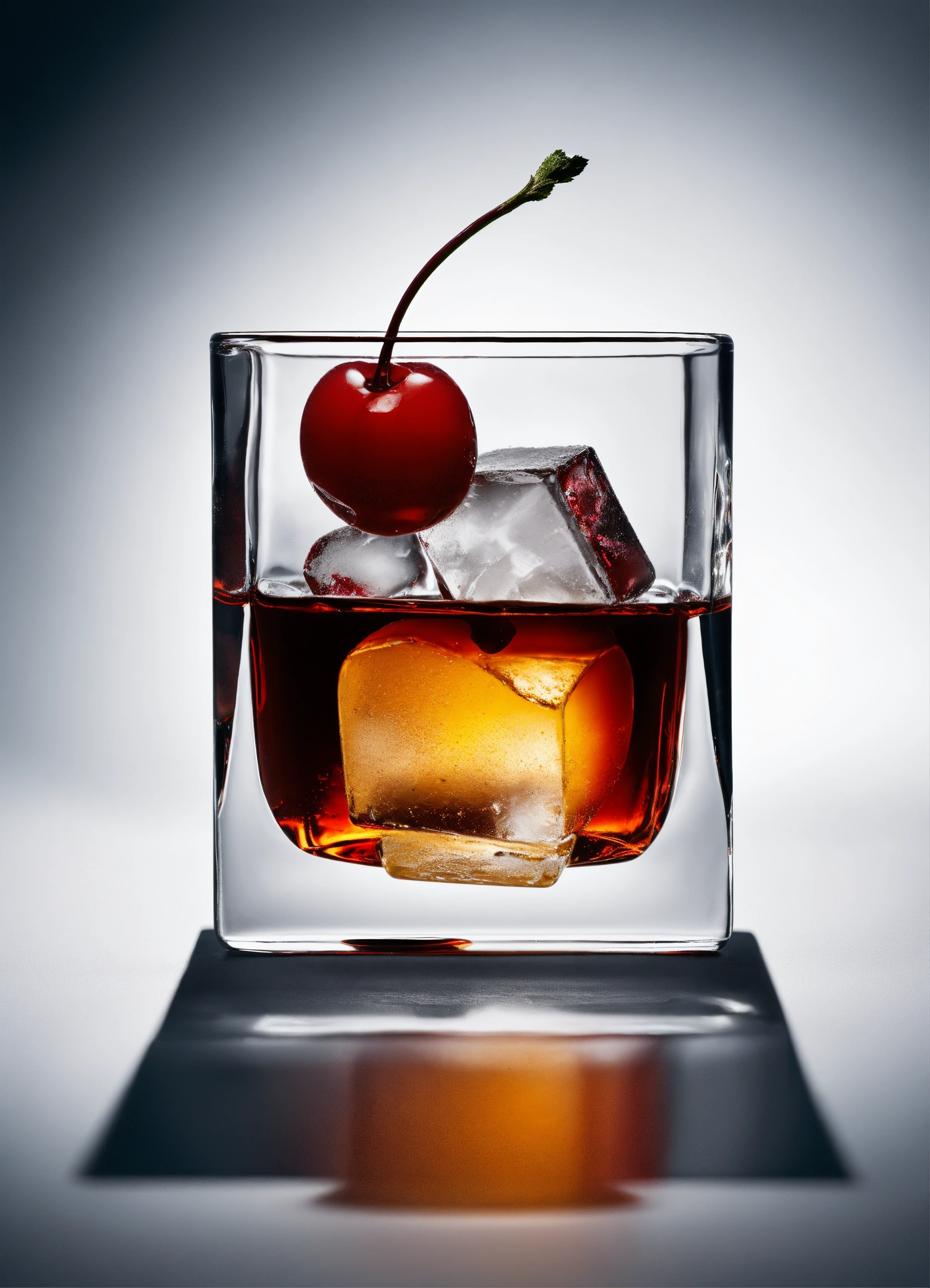 "an elegant, sophisticated, and minimalist representation of a old fashioned and large ice cube and 1 cherry against a clean white background."