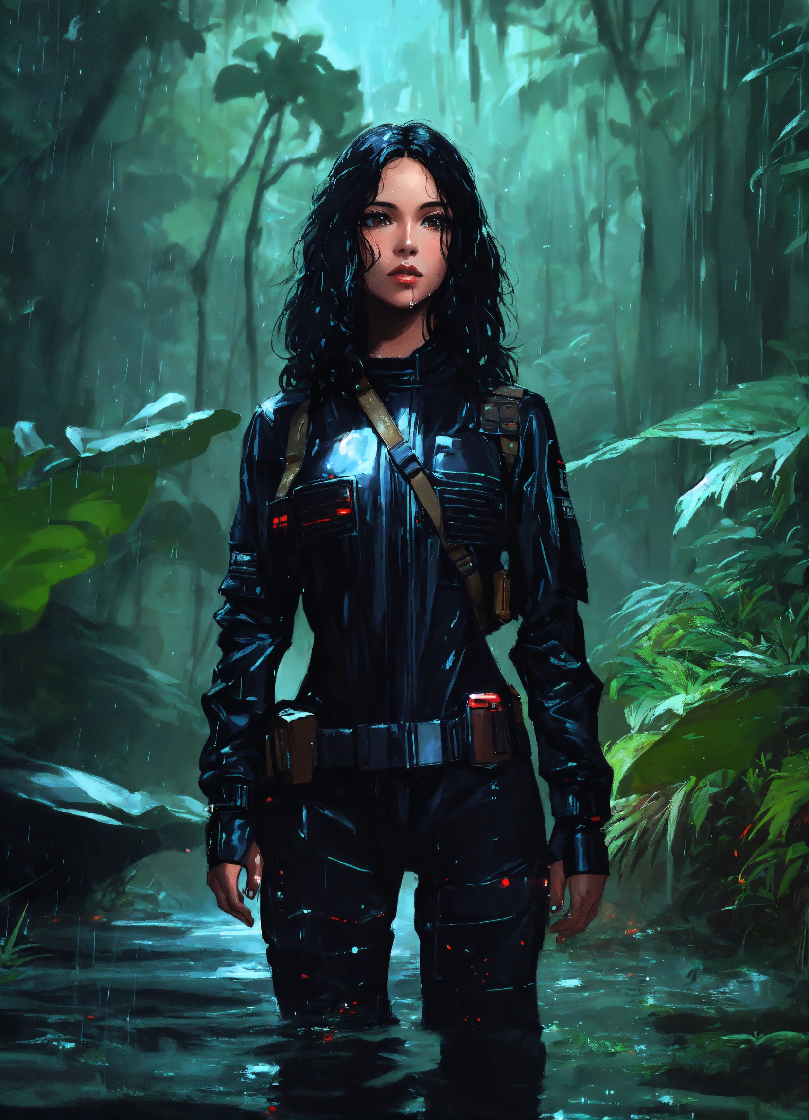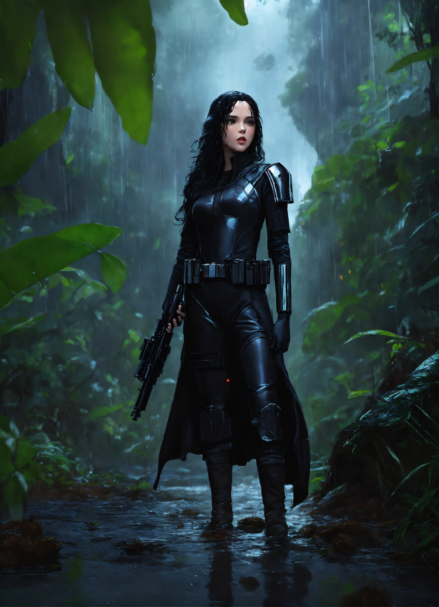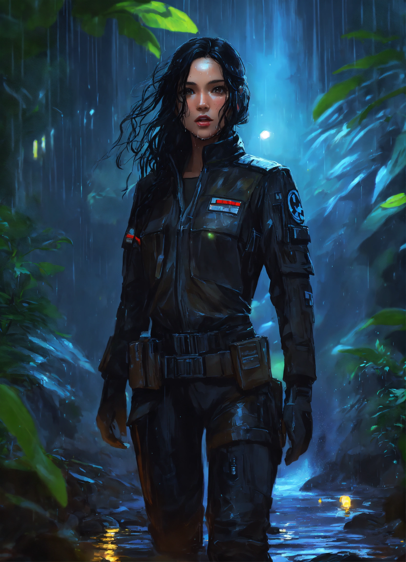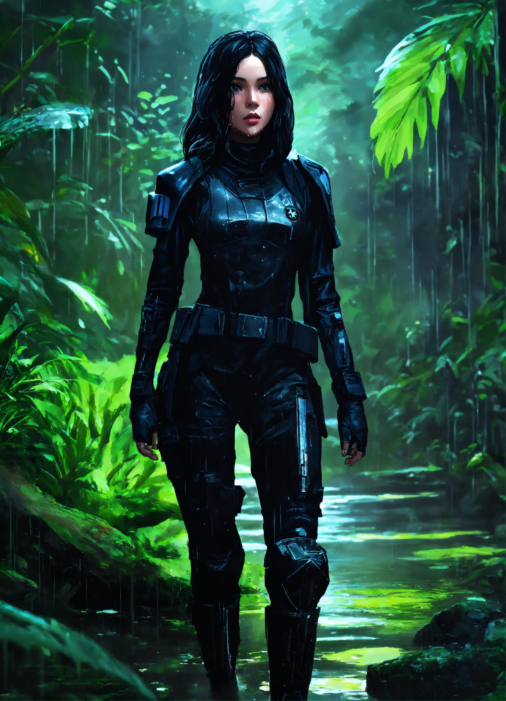Digital art of a female star wars imperial with long wet black hair, in a black flight suit, in the jungle mud and rain at night.