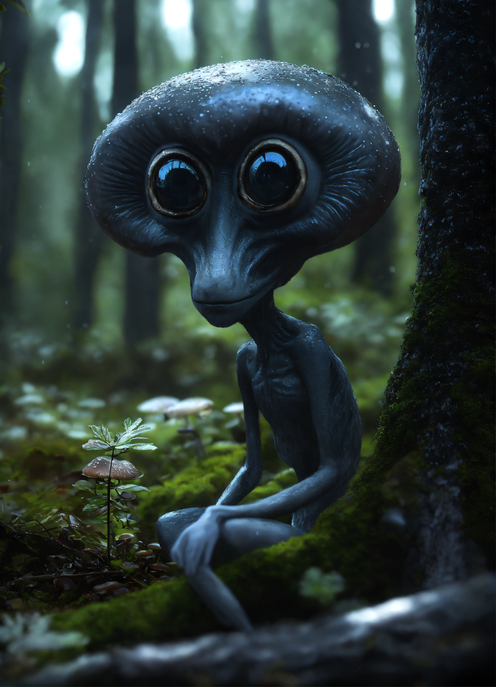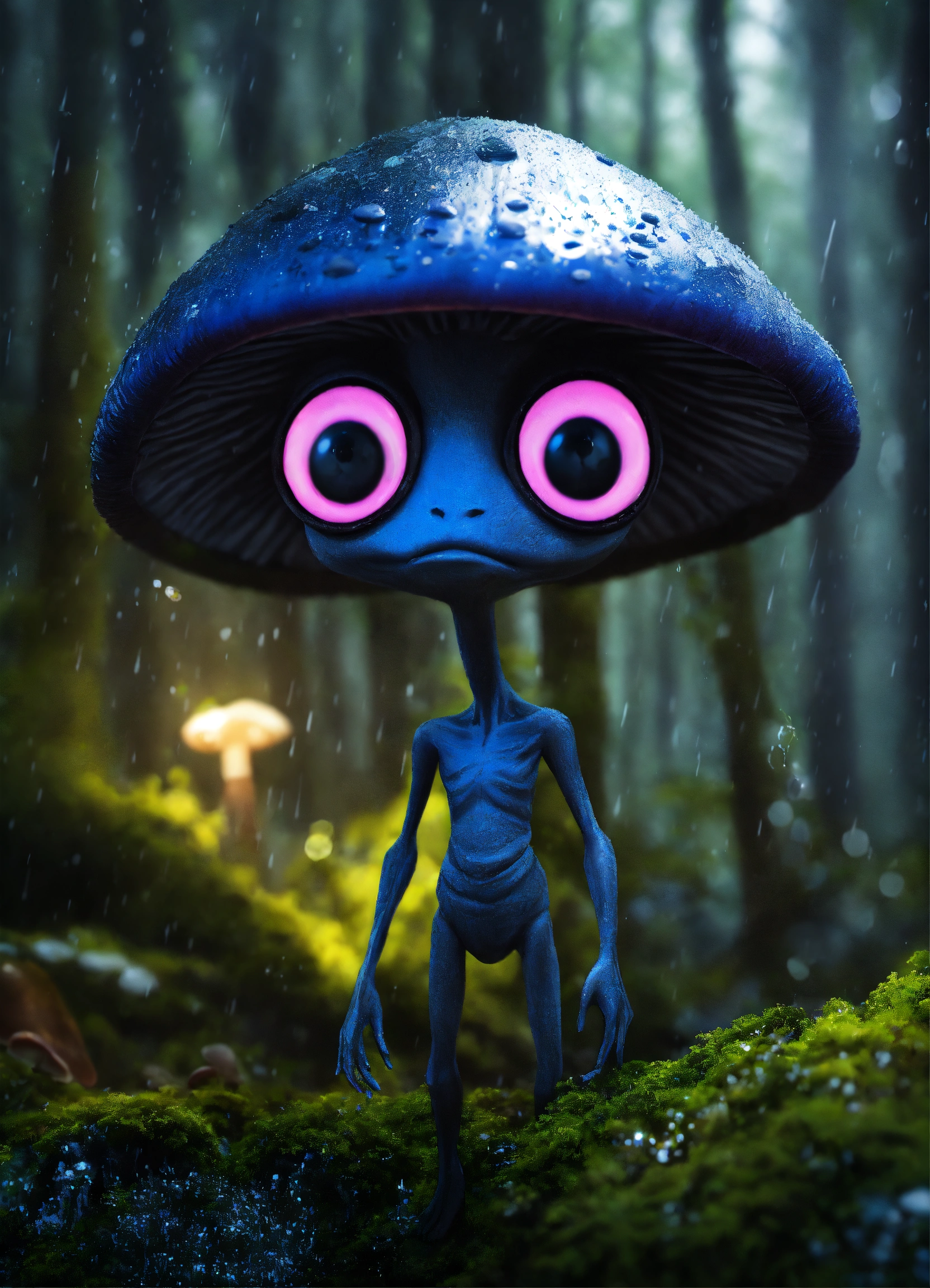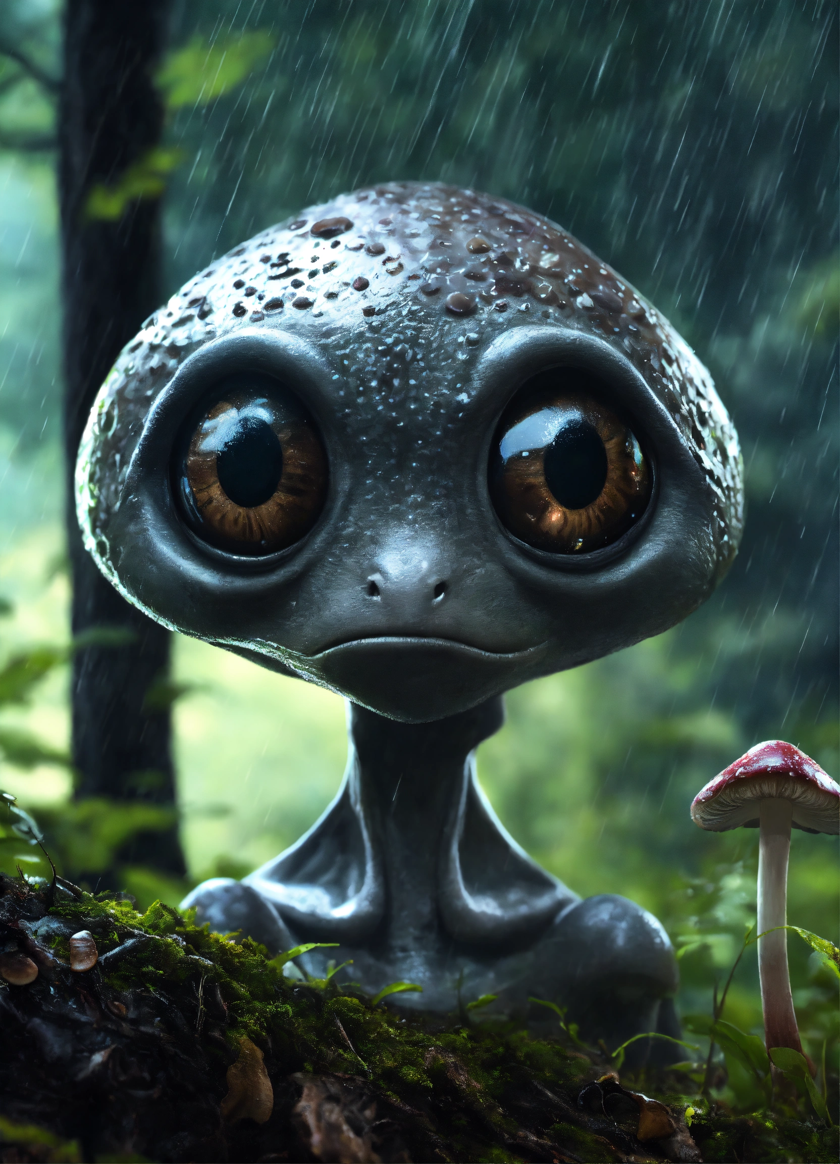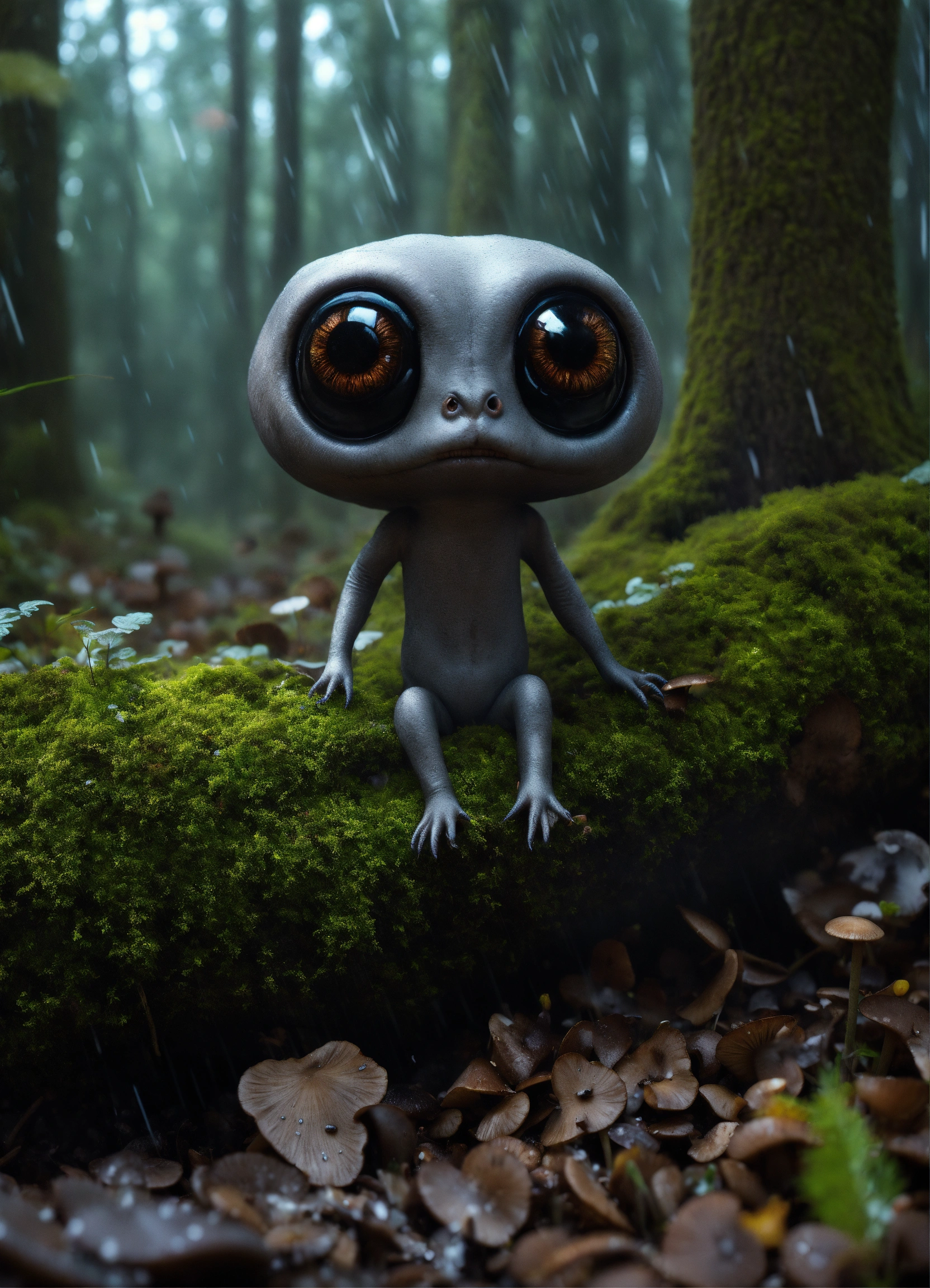 A realiste grey alien, big eyes blacks, mushrooms in trees, nigth, forest rain, hyperrealist, detailed, digital photo 4k --s 50