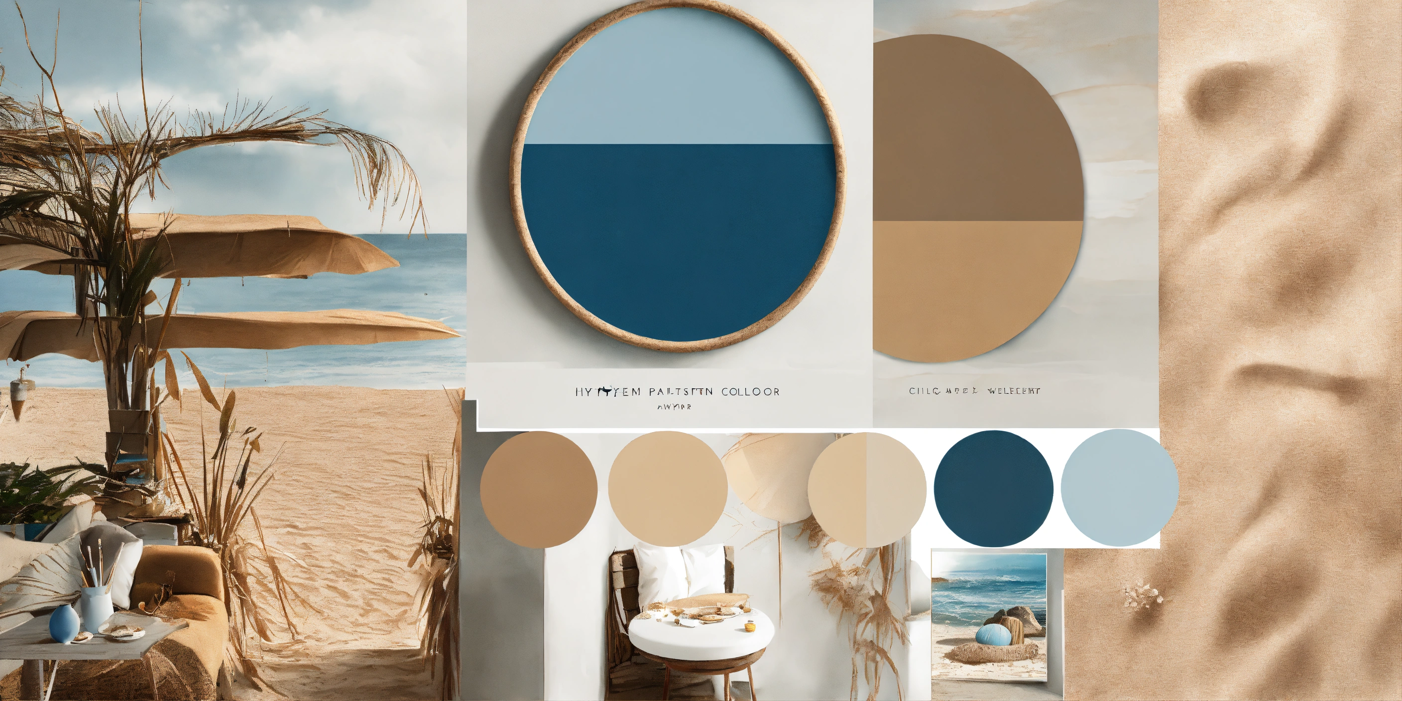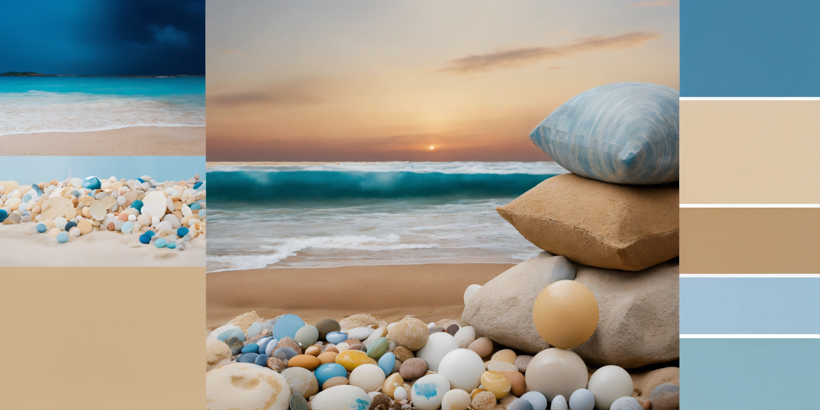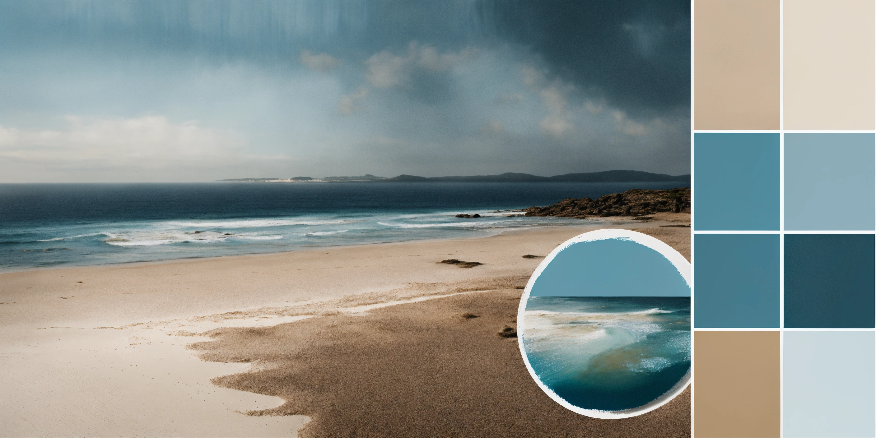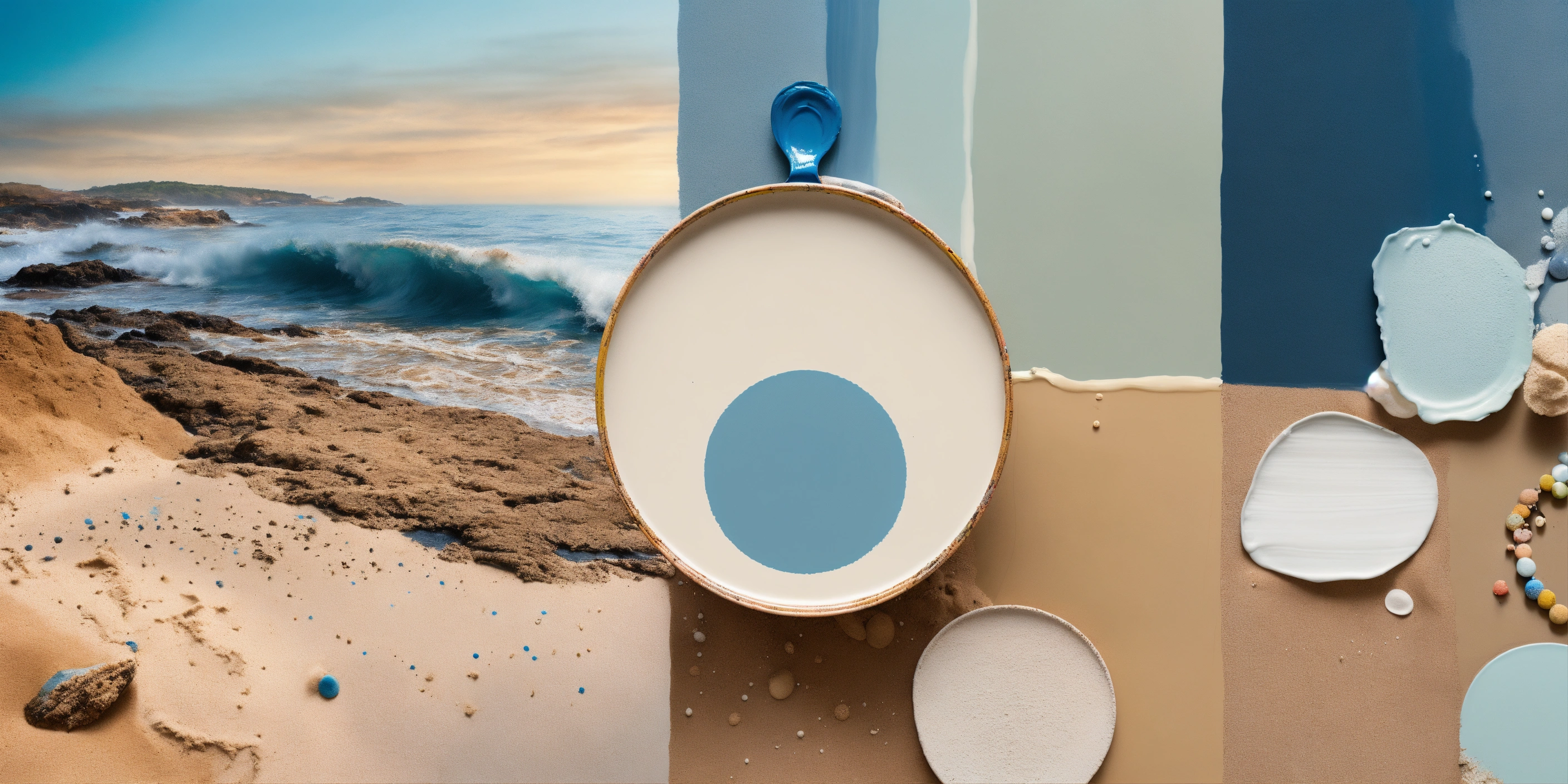 Hyper-realistic paint color palette circle drops moodboard with varying blues and whites and sandy neutrals and beach elements