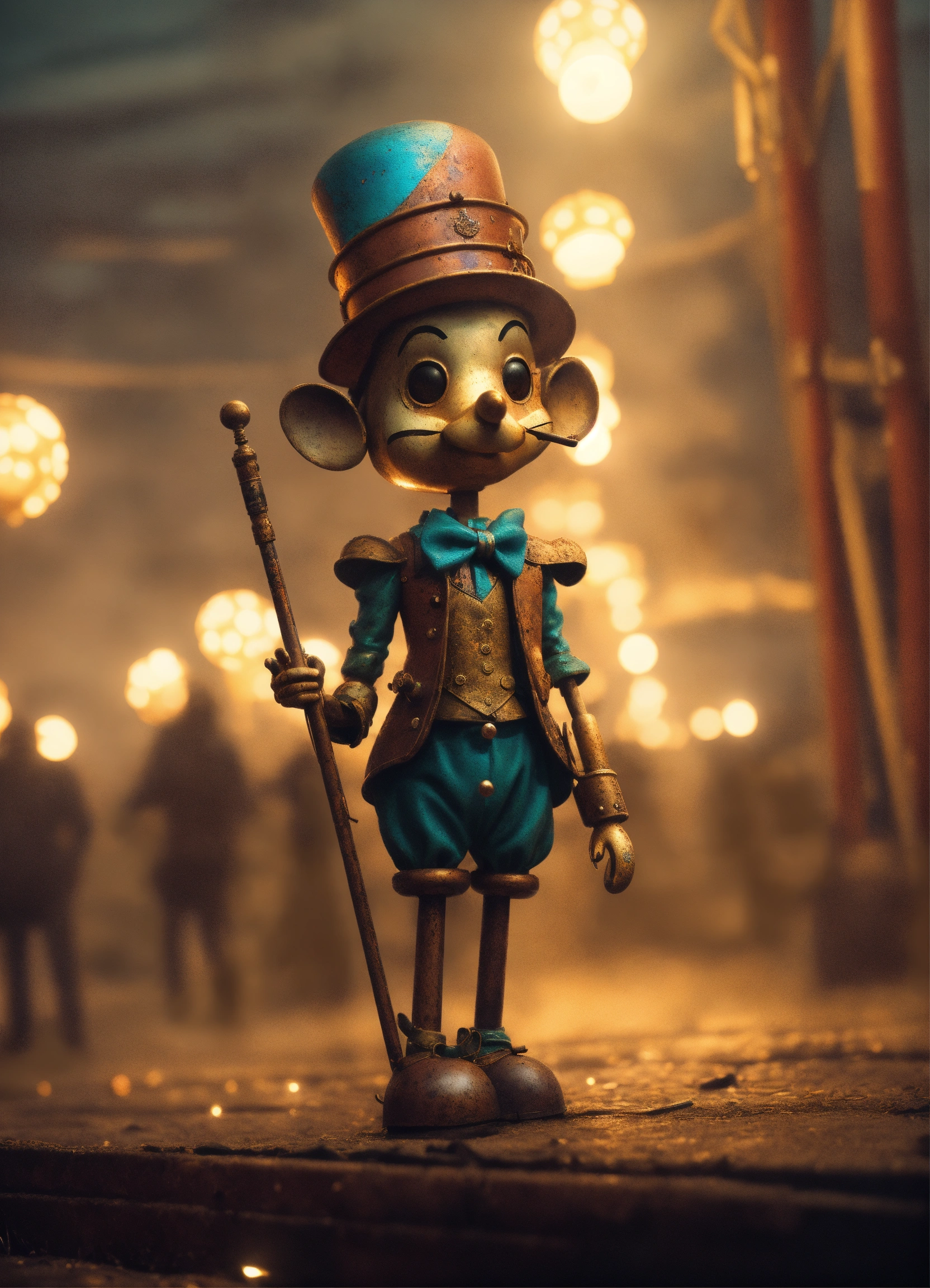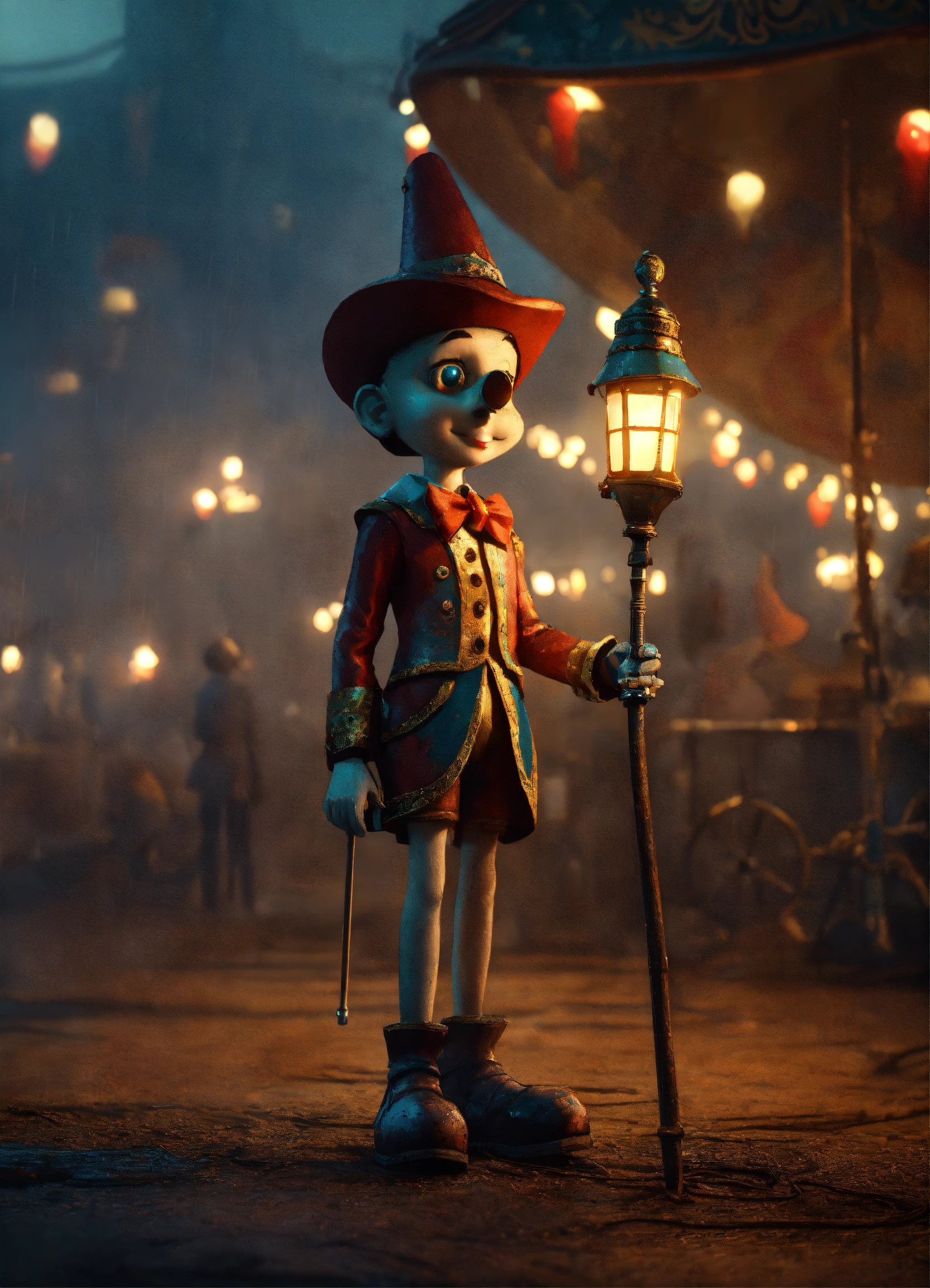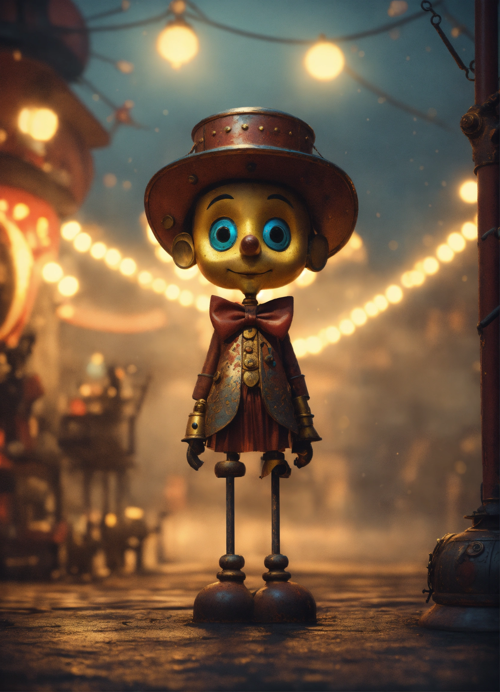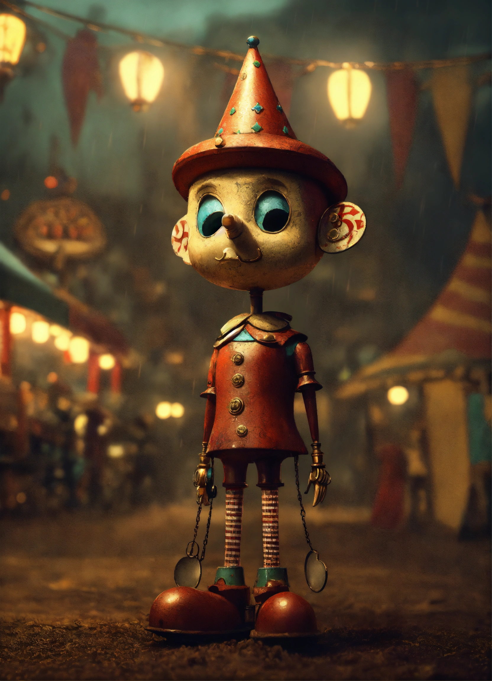 Pinocchio whit a long nose made of rusted metal, vintage circus carnival, foggy weather, night light, intricate, sharf focus, concept art, artstation, fantasy art, octane render, cinematic lighting, otherworldy, by mark ryden