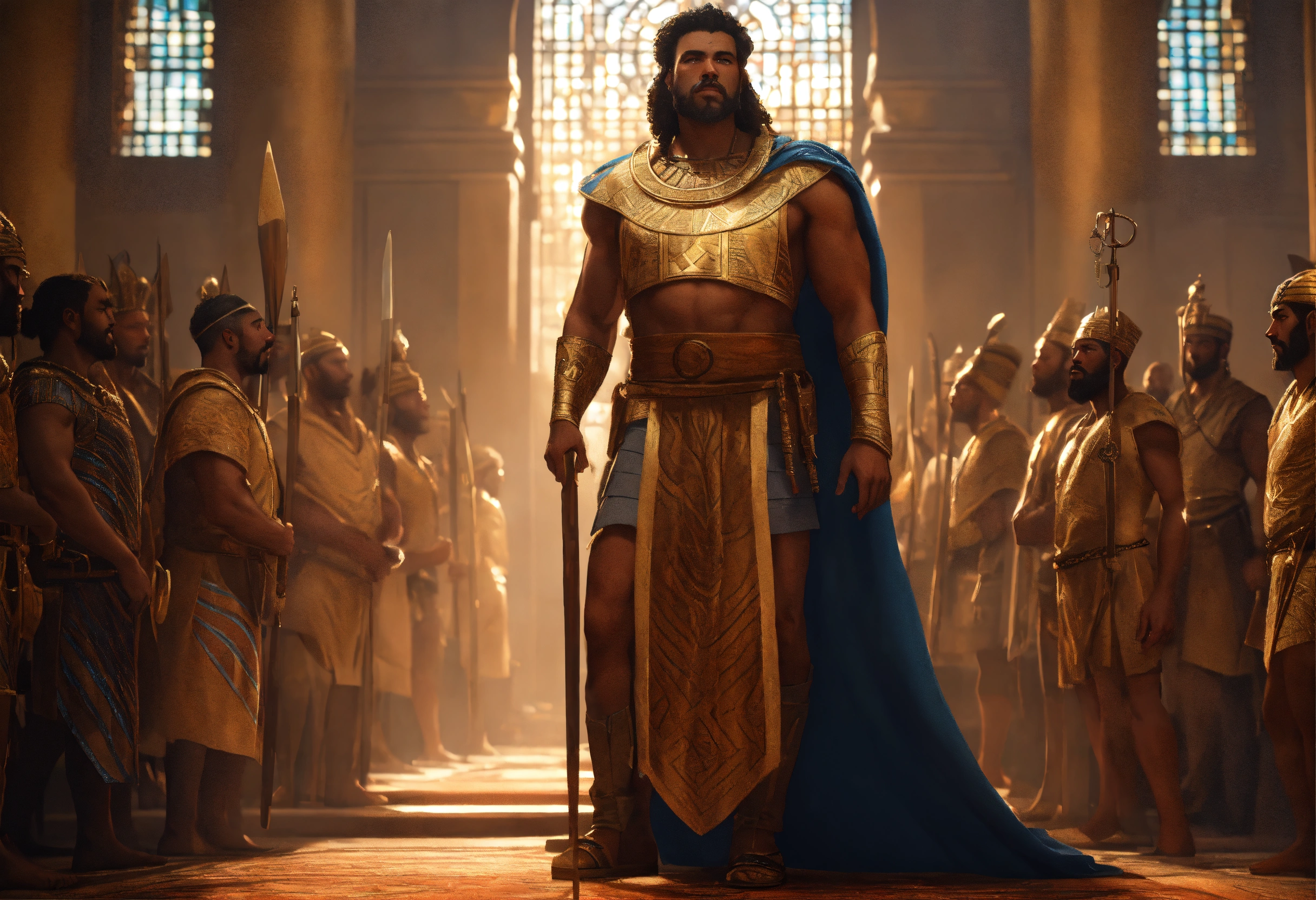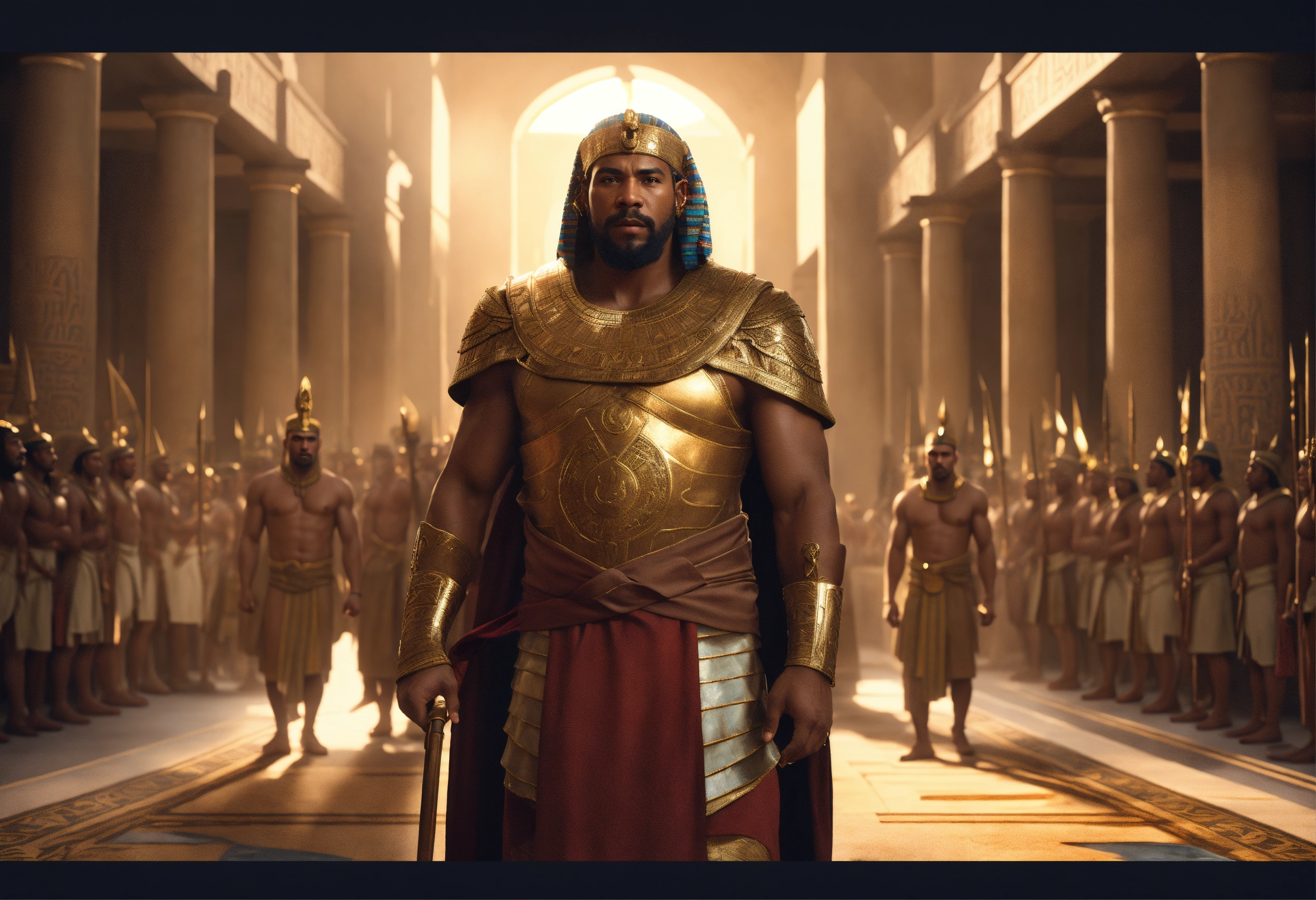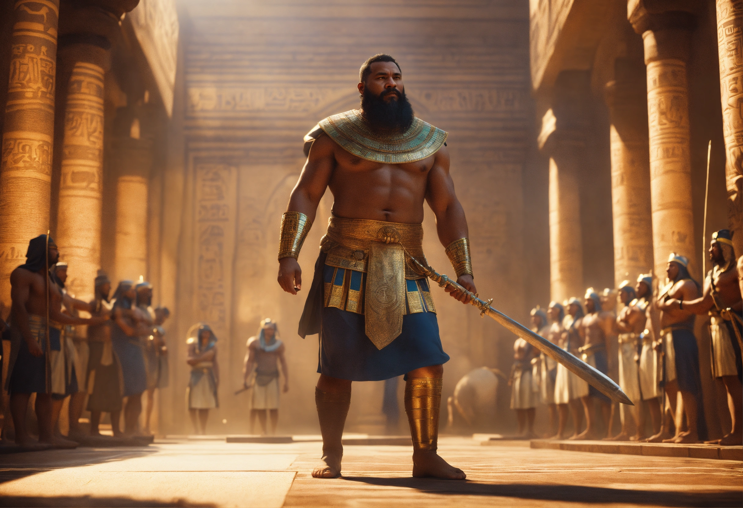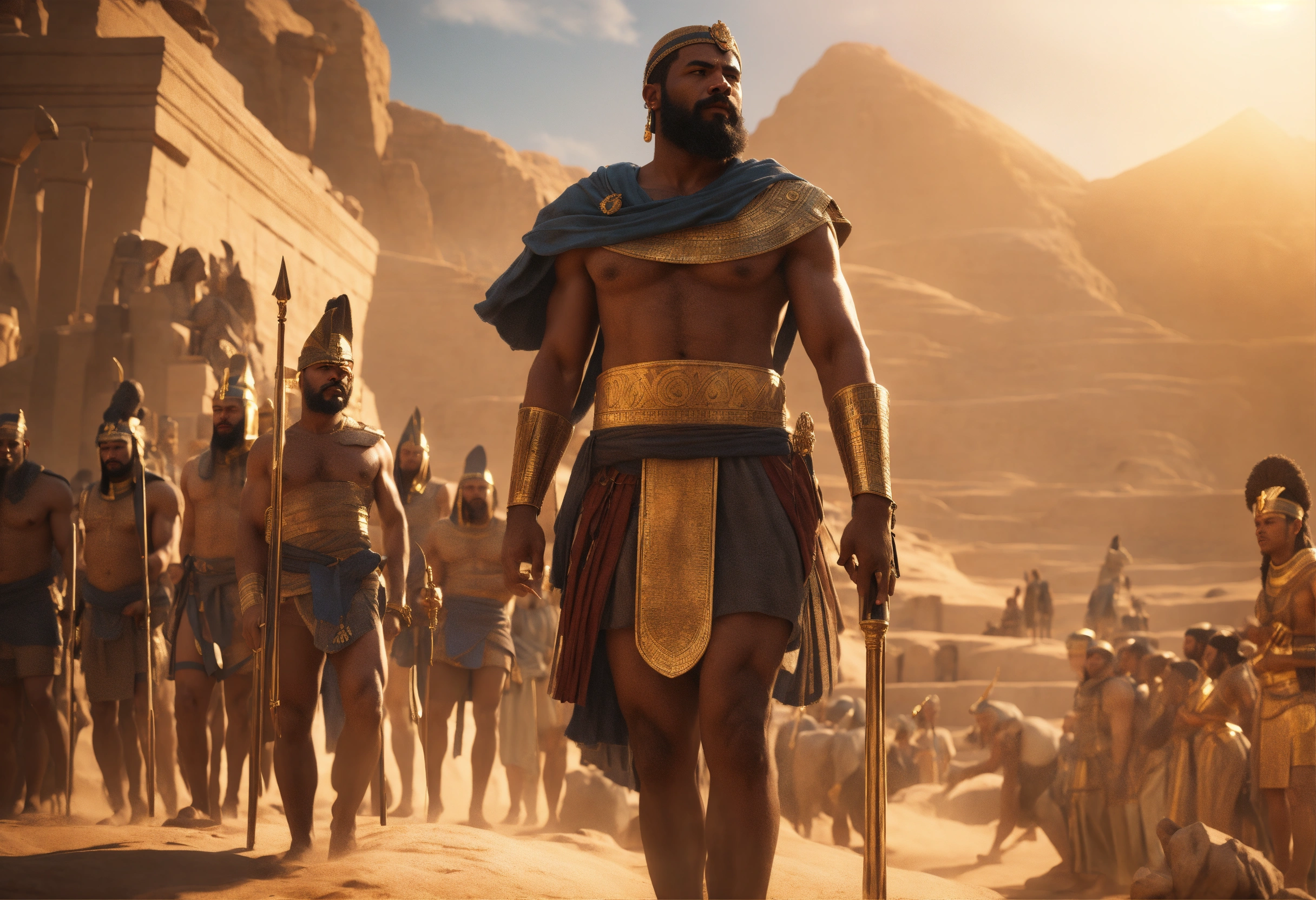 Moses young strong man is arrested by pharaoh's guards, in ancient egypt, cinematic lighting, complex, elegant, super highly detailed, art station, concept art, smooth, sharp focus, no blur, no dof, extreme illustration, unreal engine 5, photorealism, hd quality, 8k resolution, cinema 4d, 3d, beautiful, delicate, art by artgerm and greg rutkowski and alphonse mucha and loish and wlop