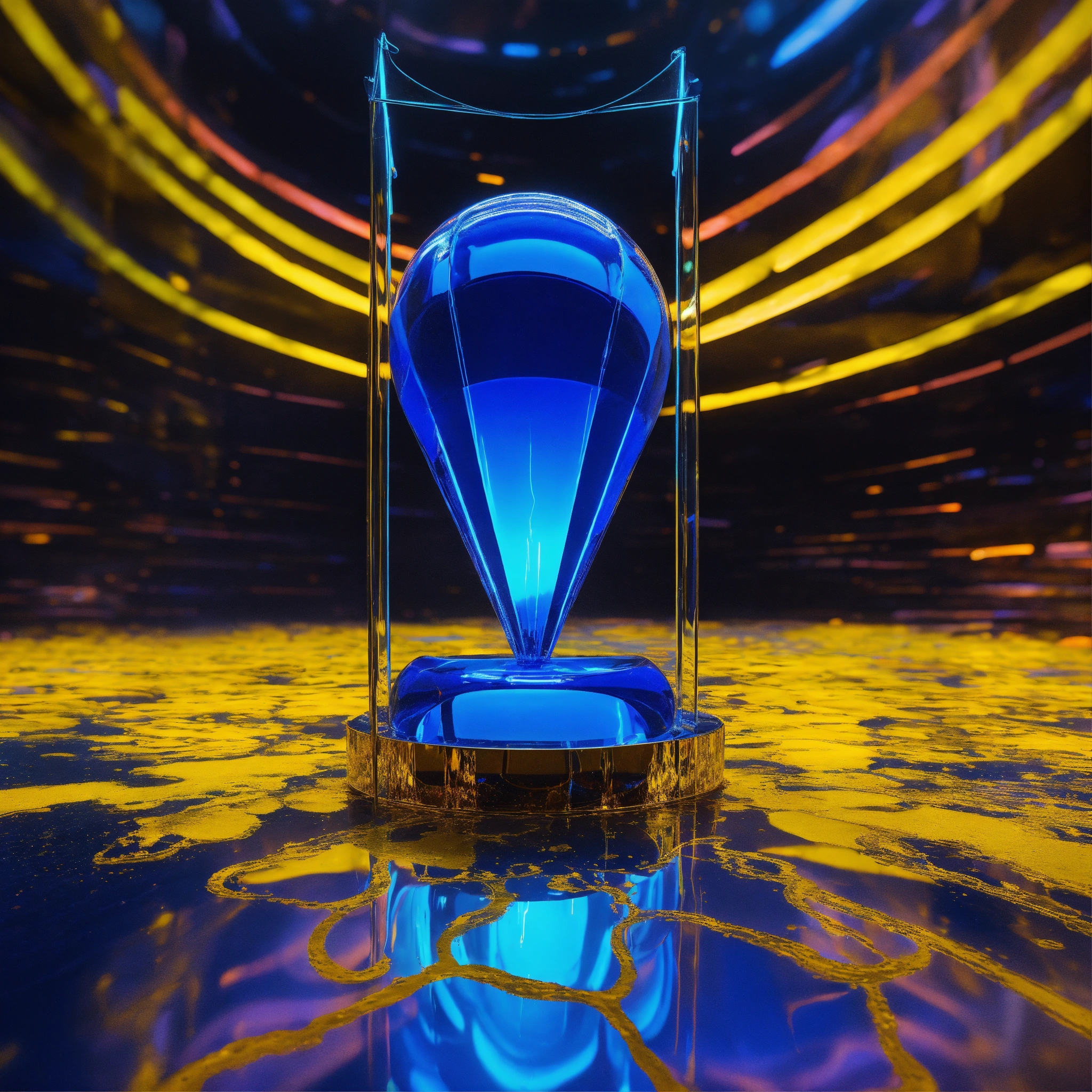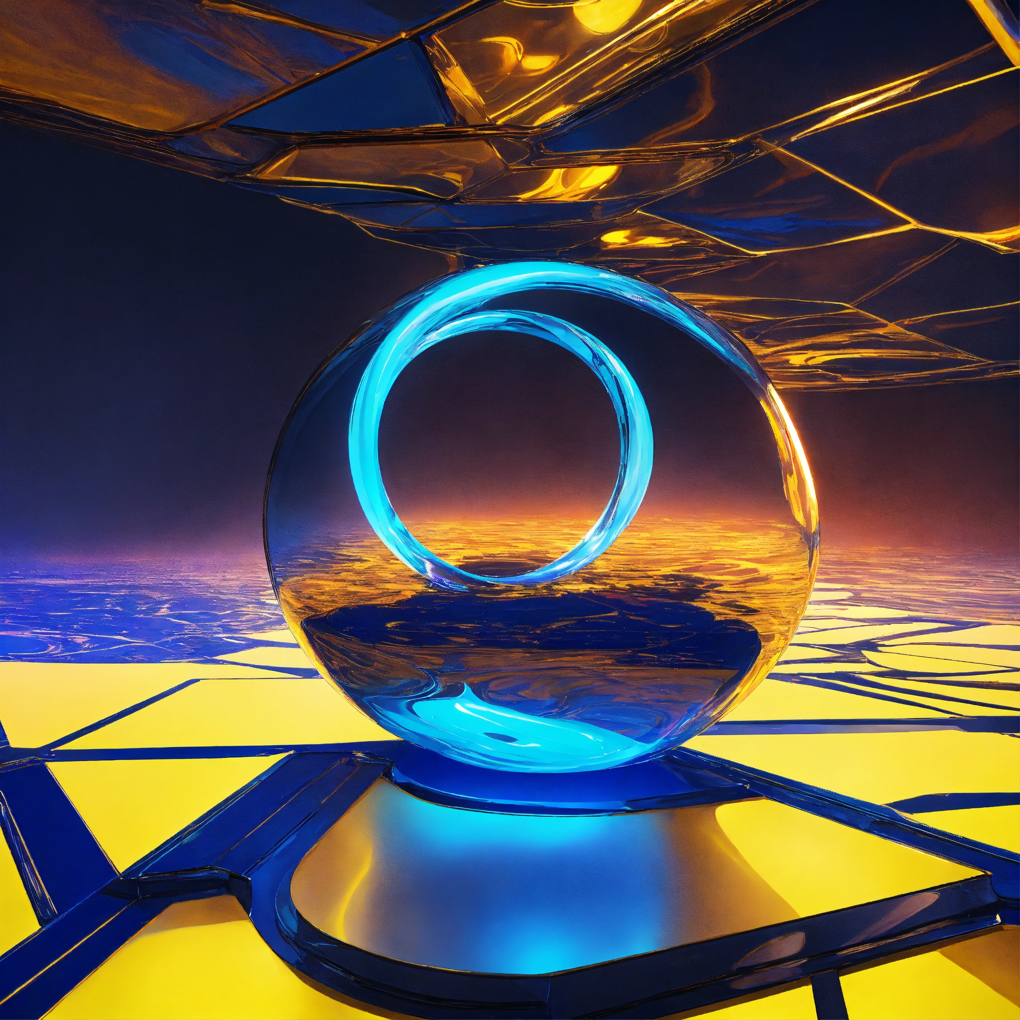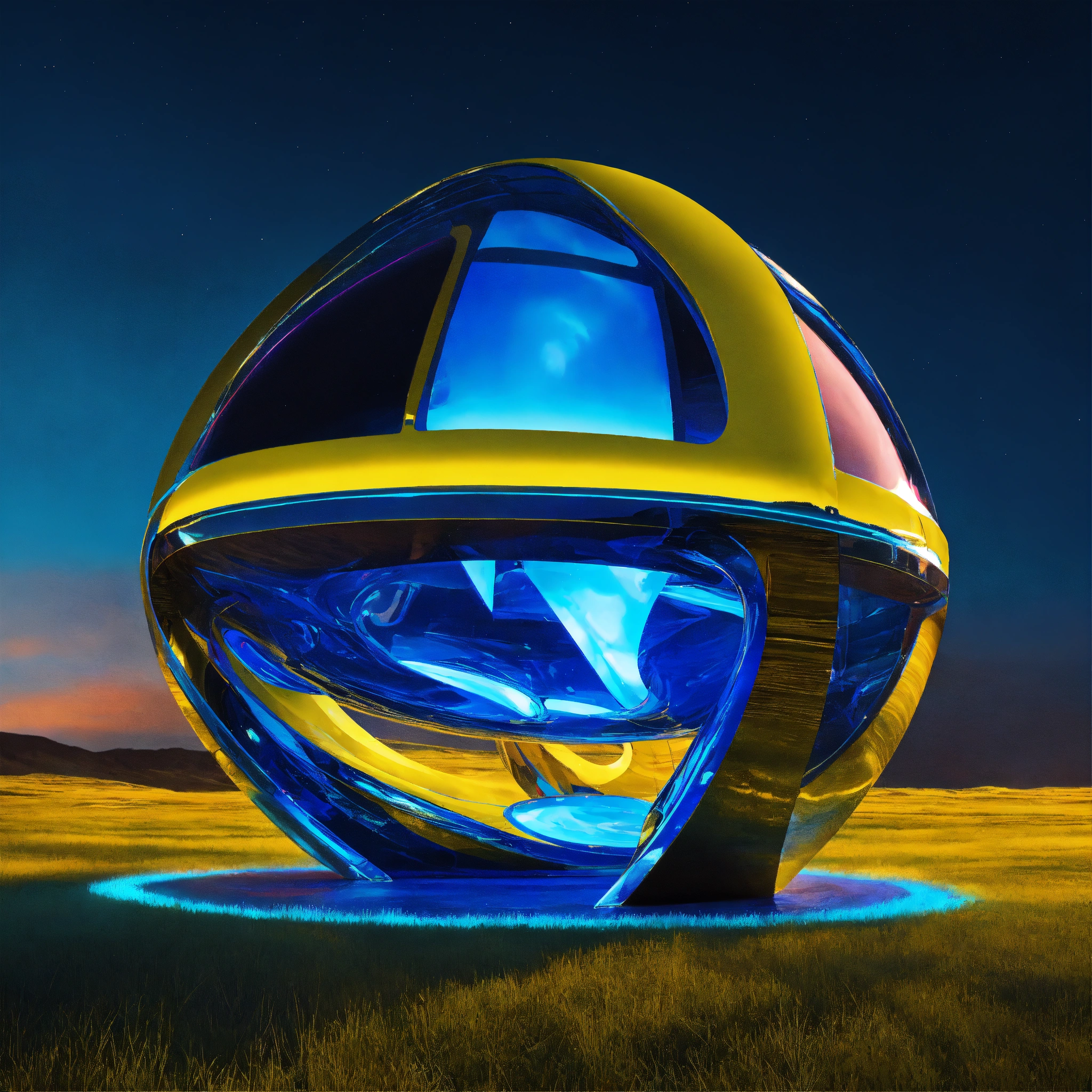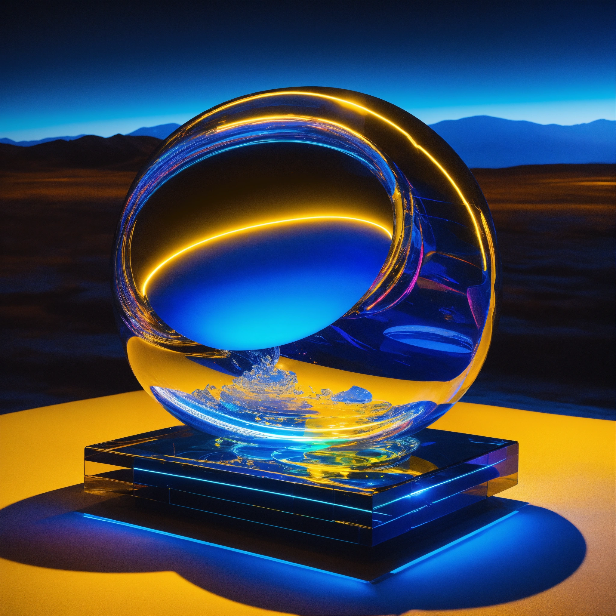 Polished surface just like metallic and glassy, vivid tones of blue and yellow, surreal futuristic neatly object, heavenly and intense neon lights, a glass installation on the open land without little things. background with nothing. symbolizing a portal to another dimension. one abstract representative object floating. --s 1000 --c 15