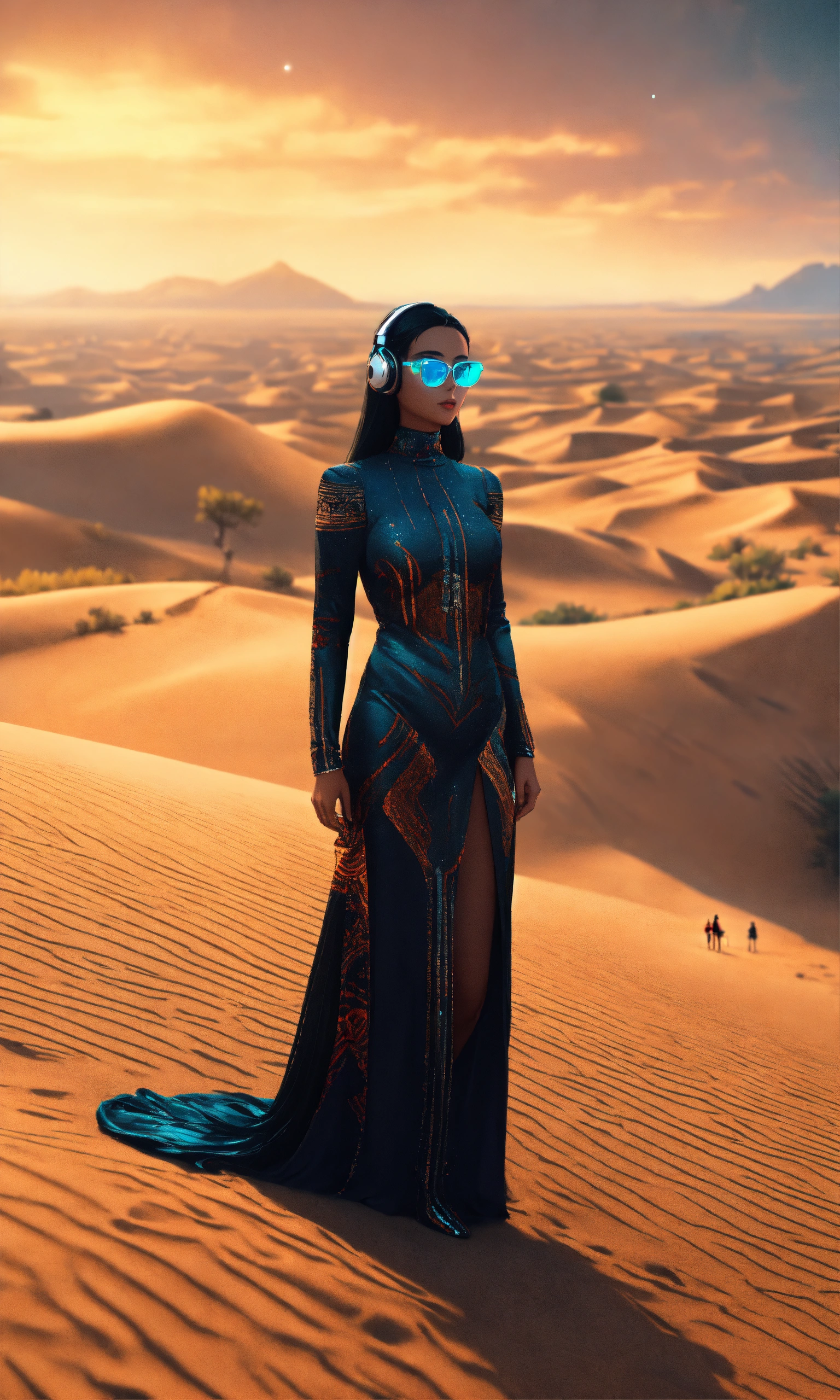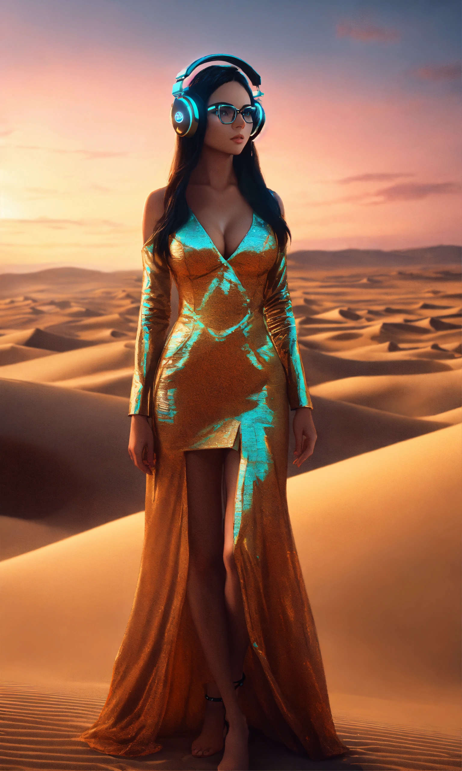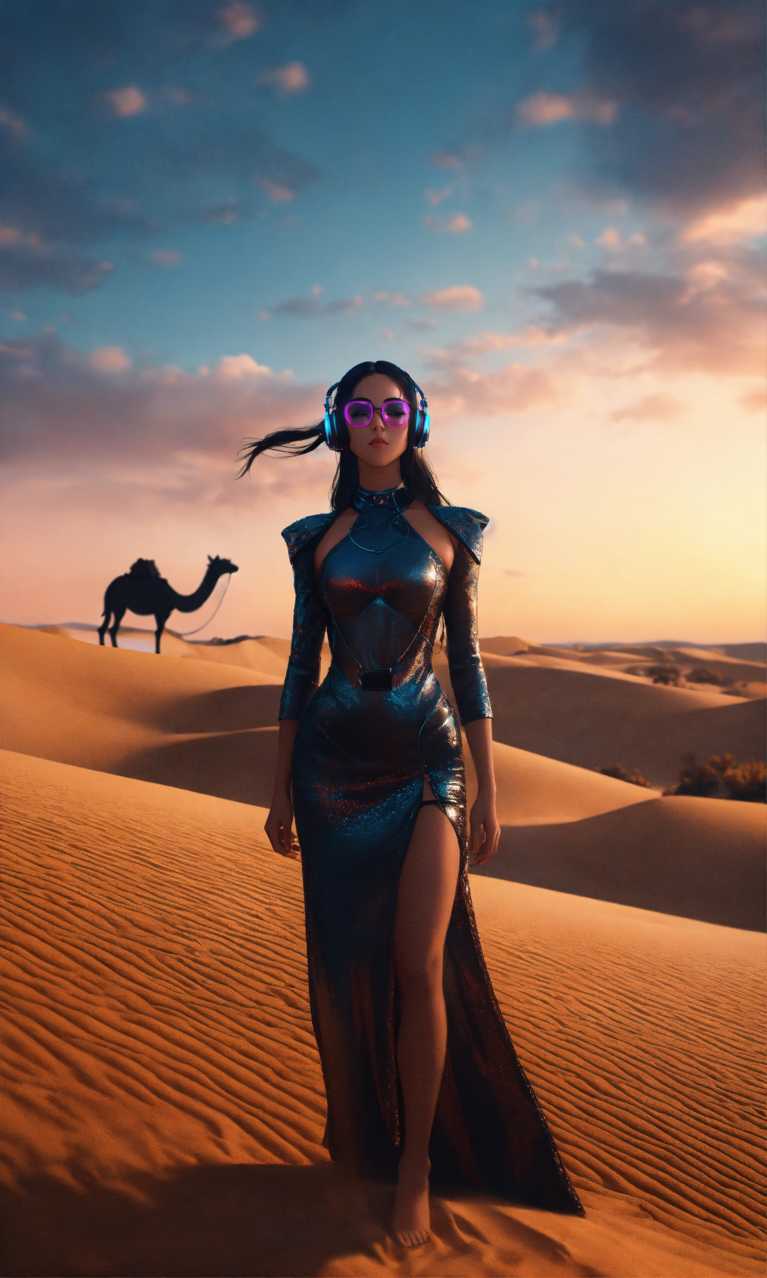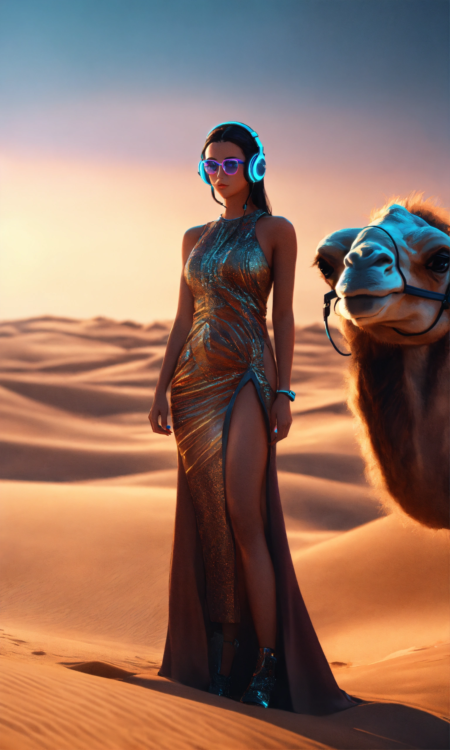 A girl with black long hair in glasses and headphones in an elegant tight dress, stands in the middle of the dunes with a camel, futurism neon, 8k, unreal engine render