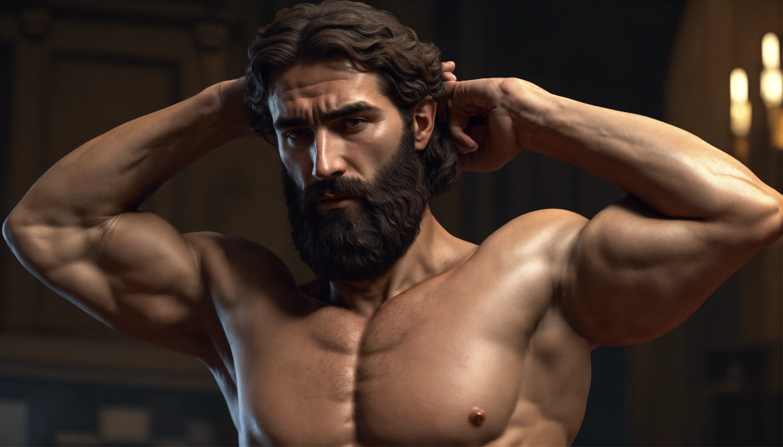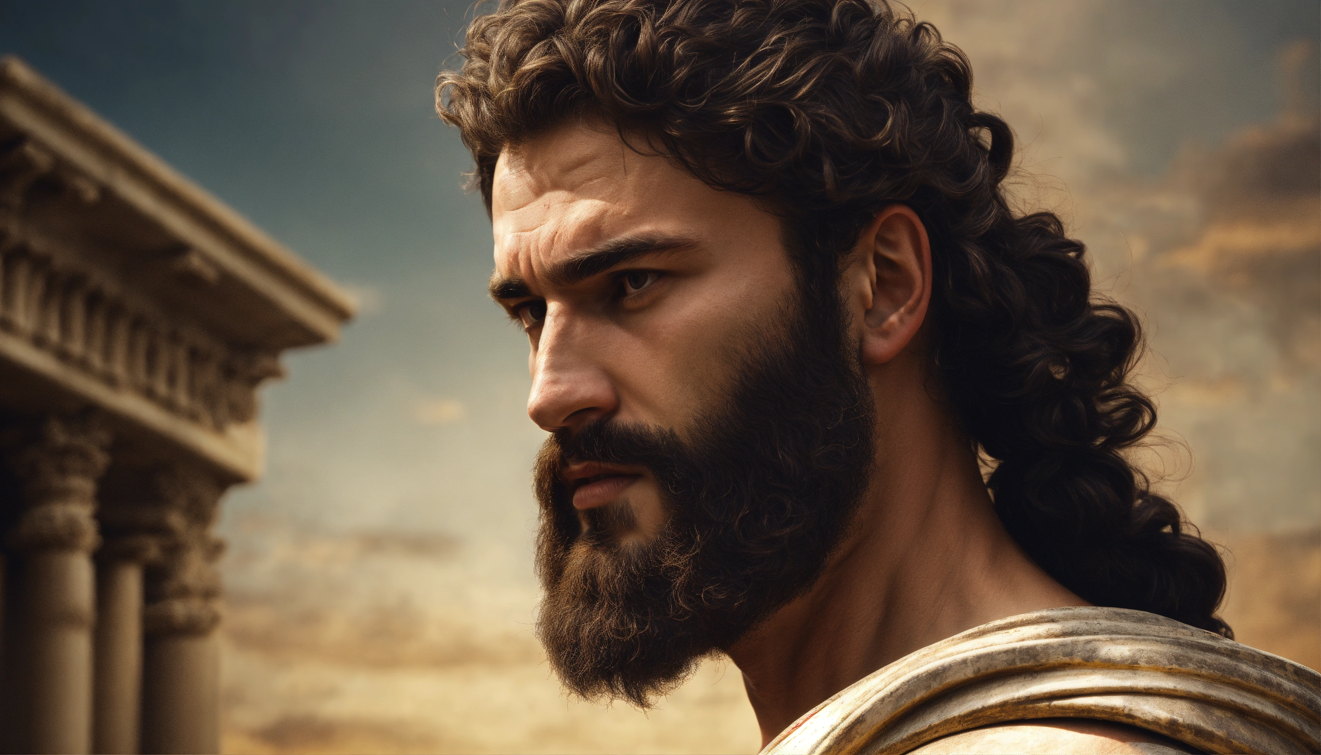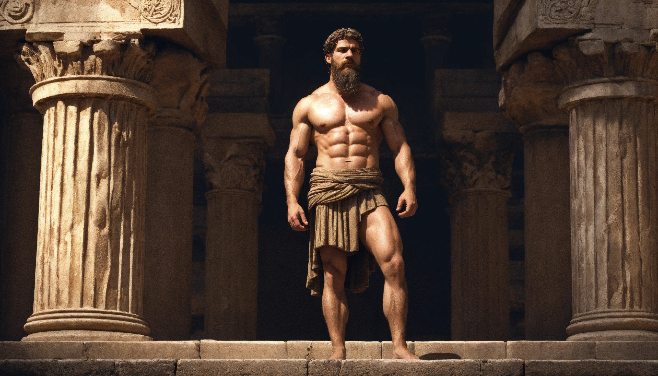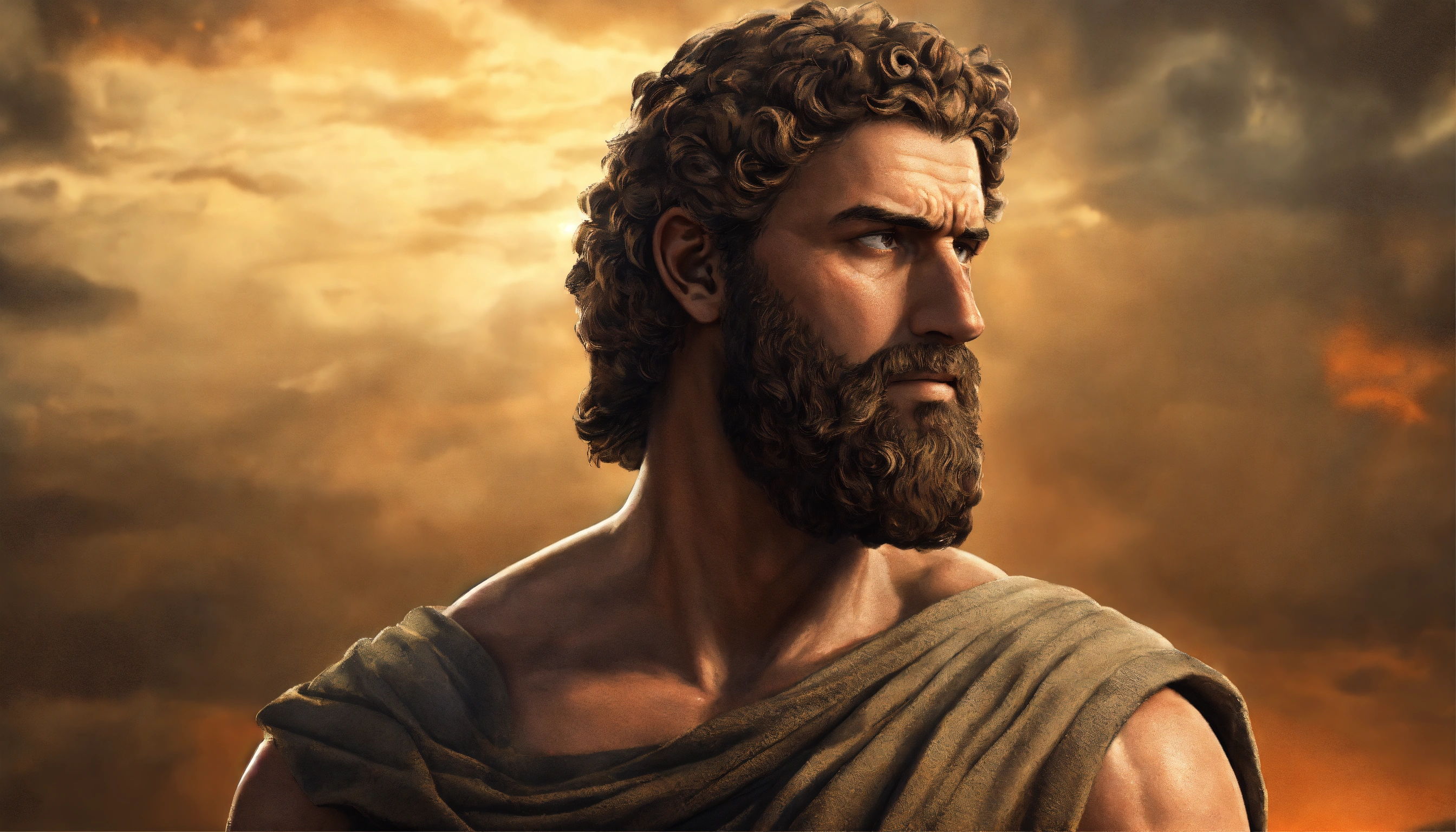 Poor stoic man, strong body, muscle, bearded, with problems, holding his forhead, ancient greece, realistic, 169, 8k