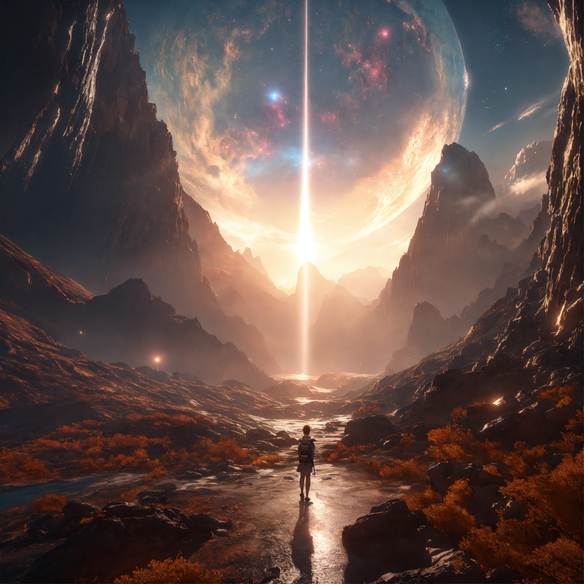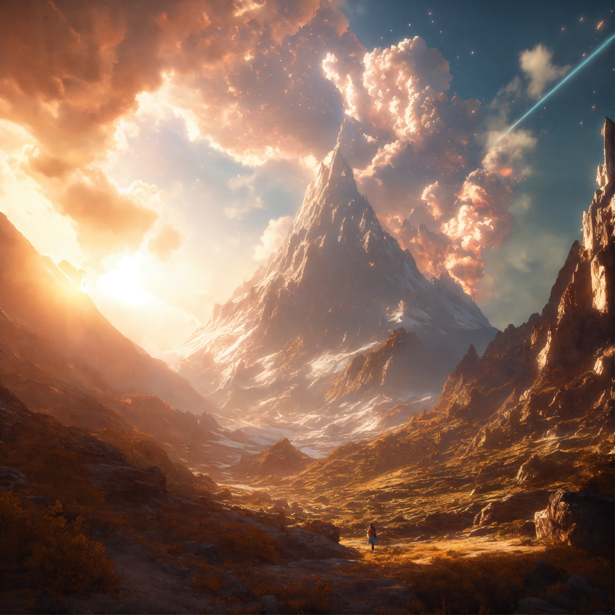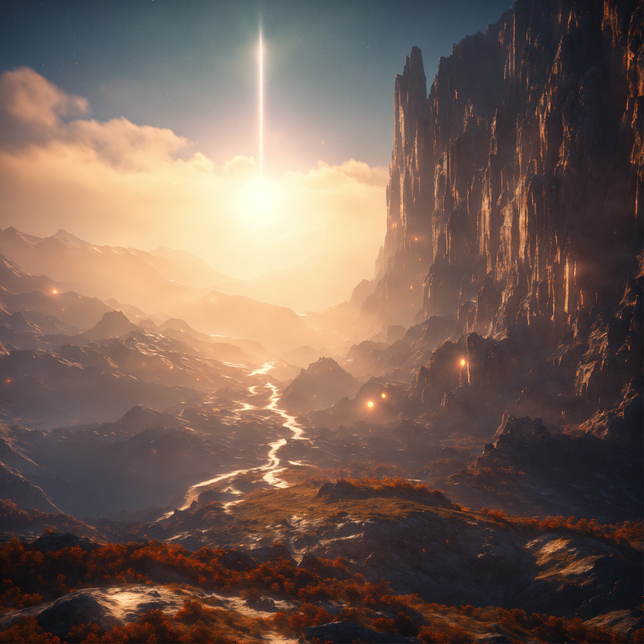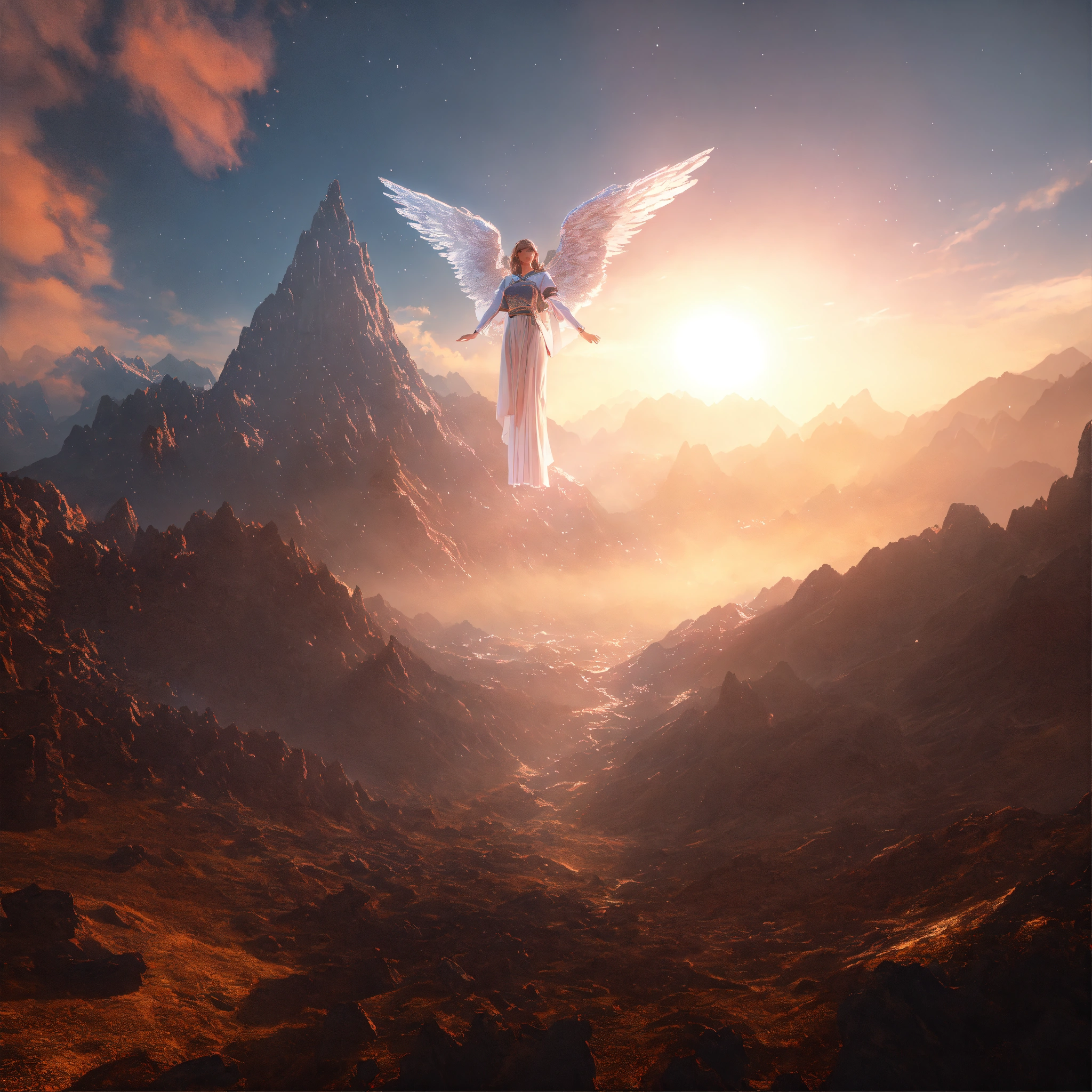 A angel being reincarnated into a new world, sky nebula, artstation scifi 3d scene of a showing mountains, maximalism, ambient occlusion, volumetric light, sun beam, atmospheric haze, unreal engine, hyper realism, realistic shading, cinematic composition, realistic render, octane render, detailed textures, photorealistic, wide shot