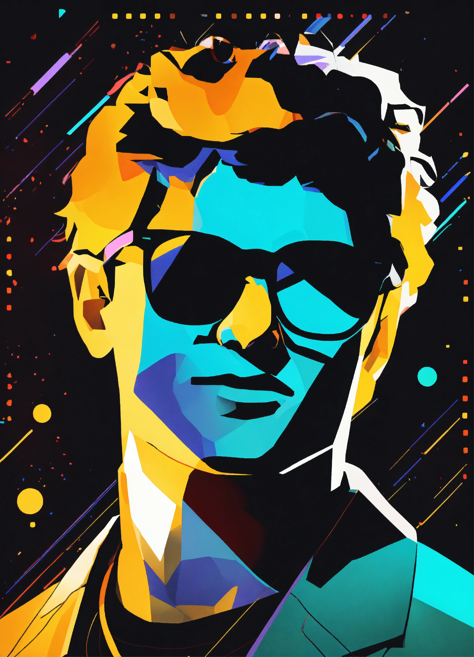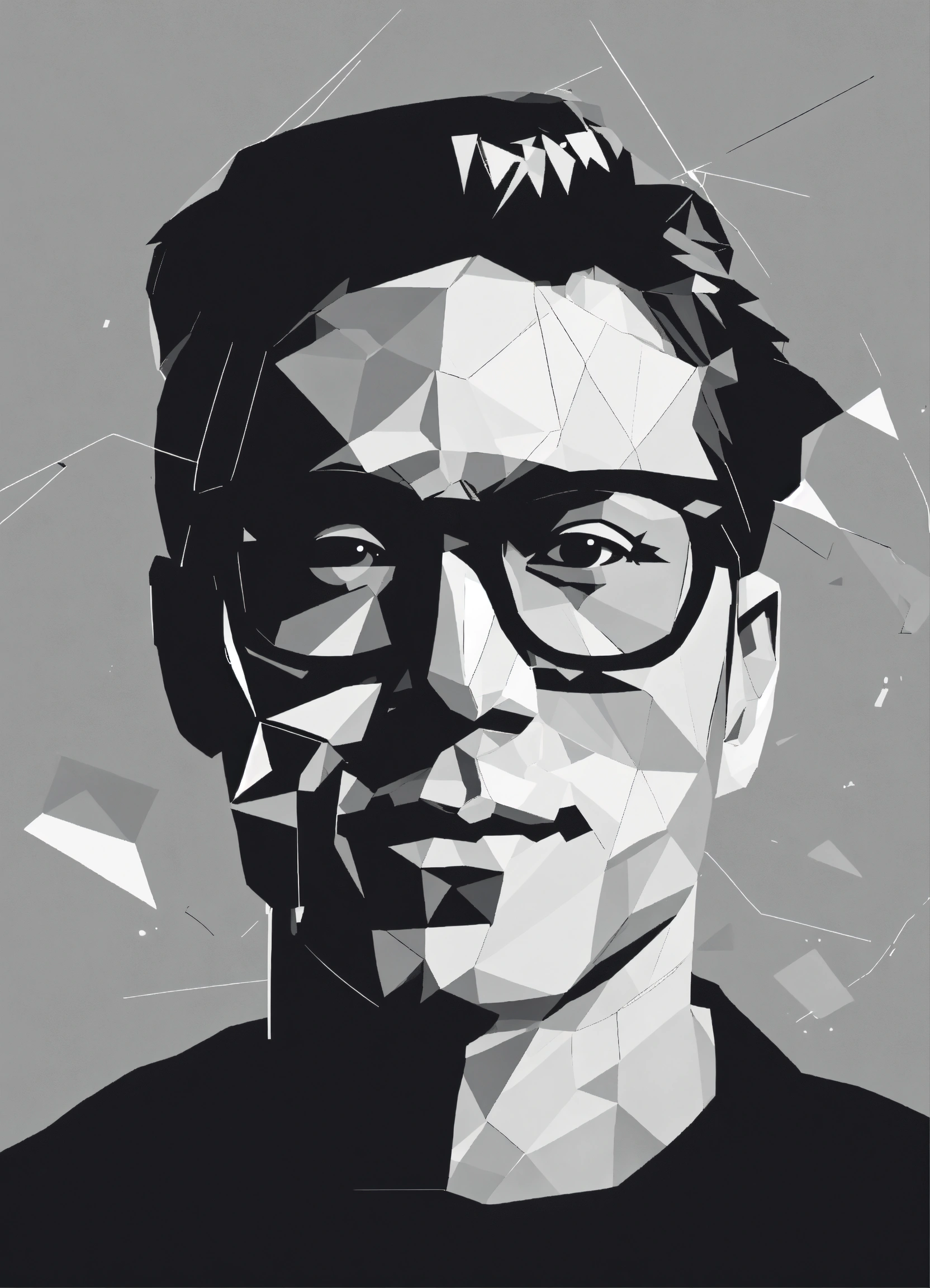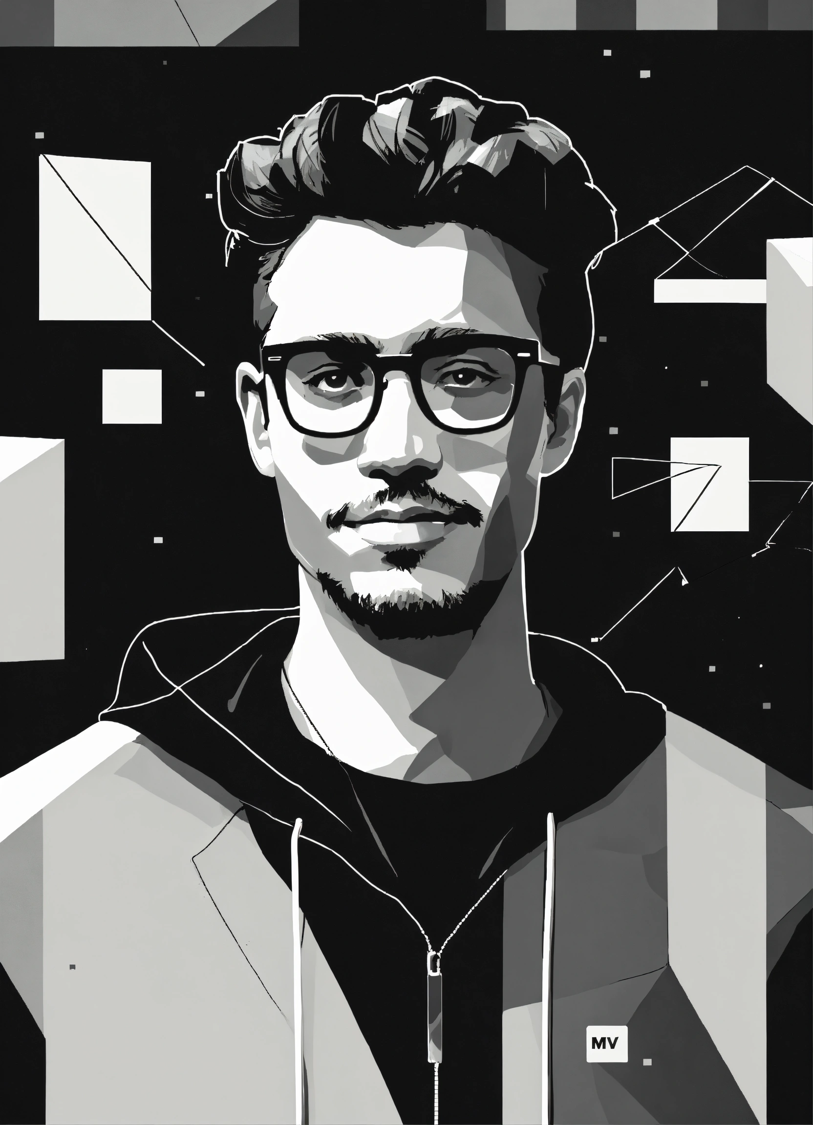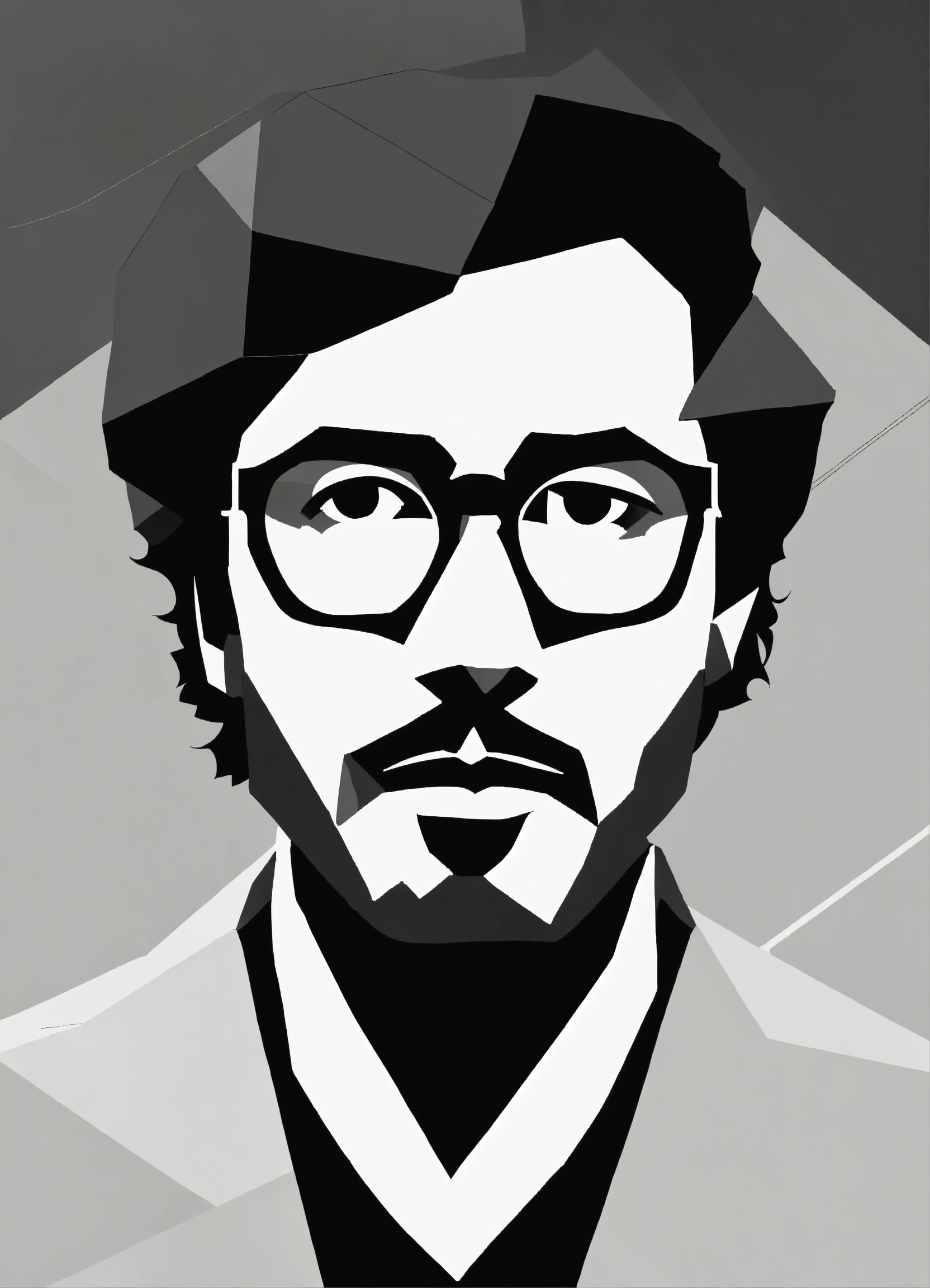 A black and white flat icon of a man with glasses, 90s mtv illustration, icon for a music streaming app, polygon.