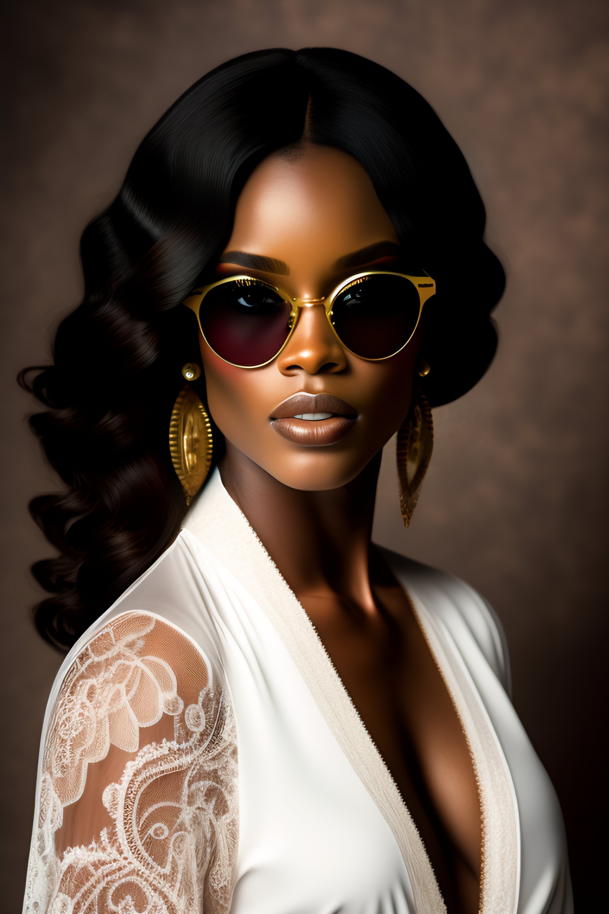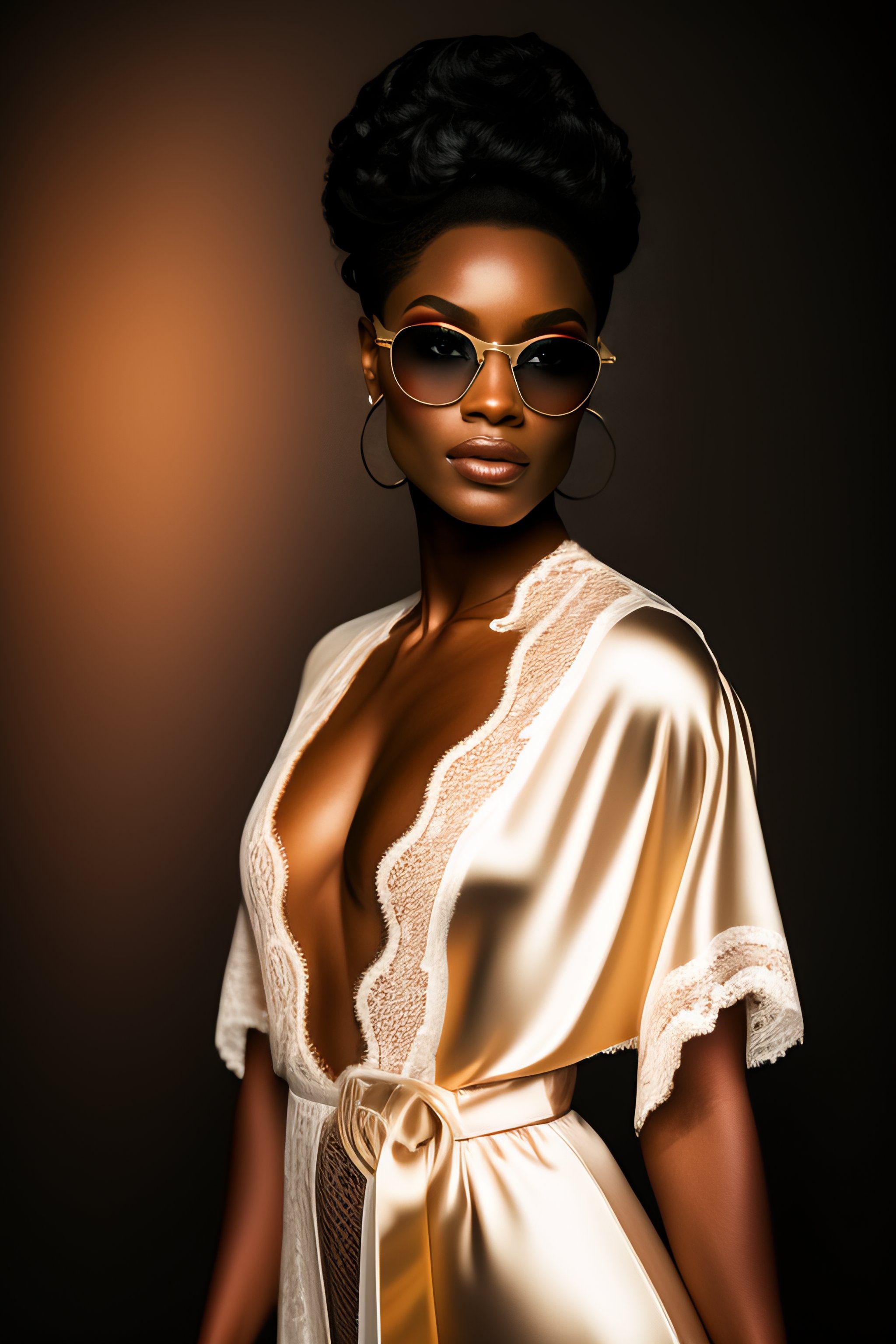Commercial photoshoot. hot attractive female glamour fashion ebony model in photo studio. wearing sexy sunglasses. wearing lace garments and open robe. detailed clear face. no imperfections. highly detailed, centered. 35mm polaroid, ebony skin girl, photorealistic human body