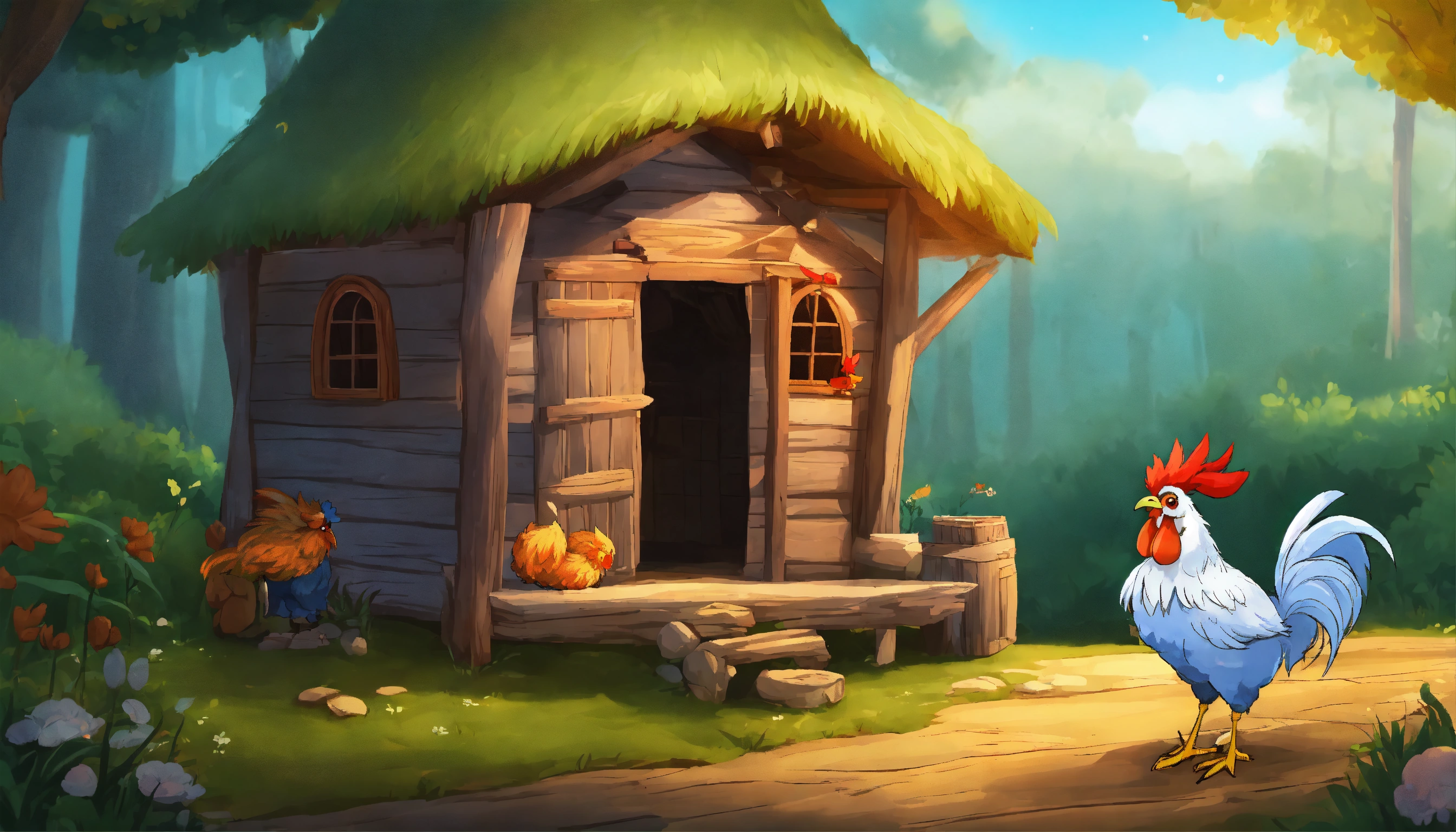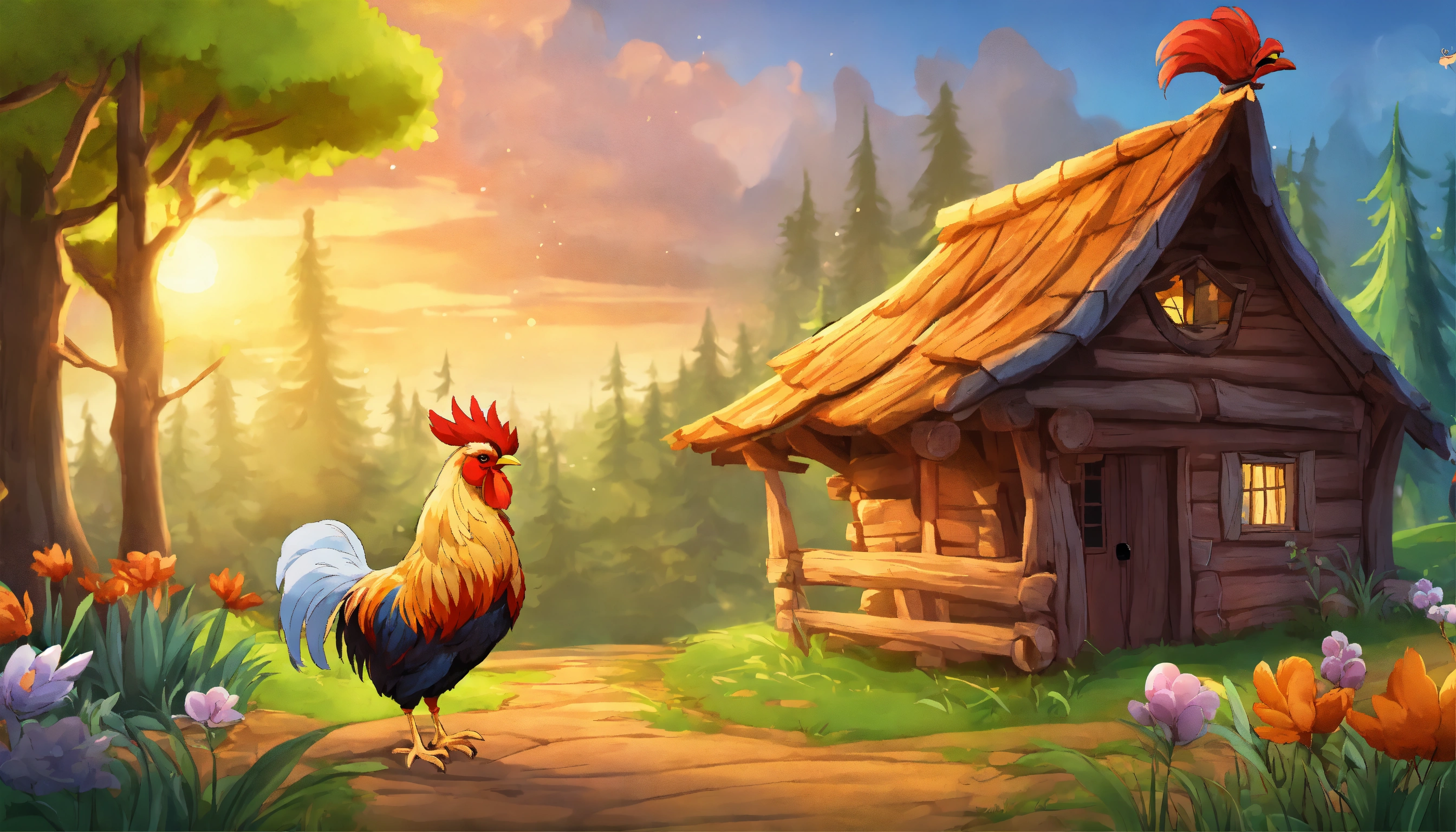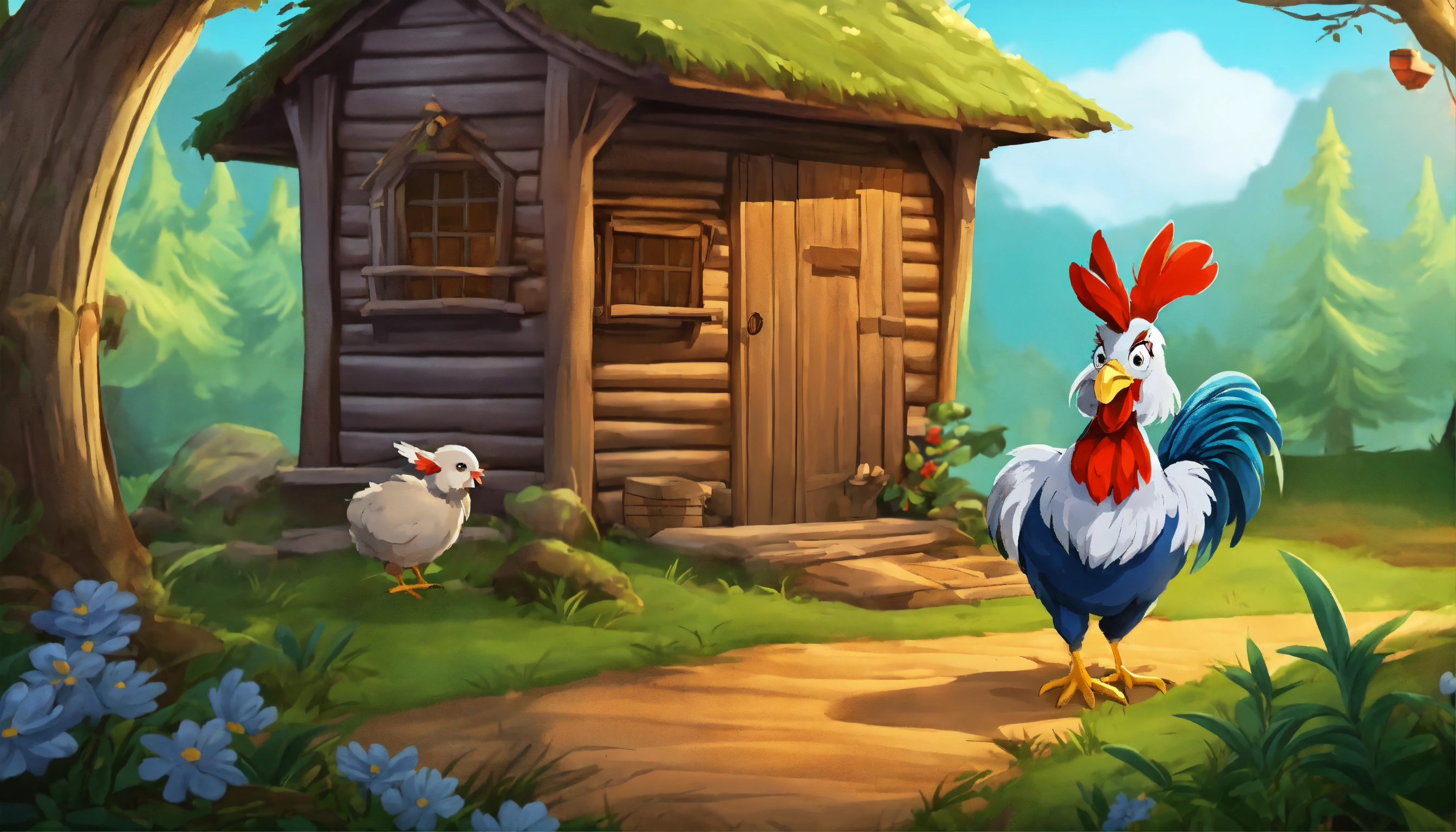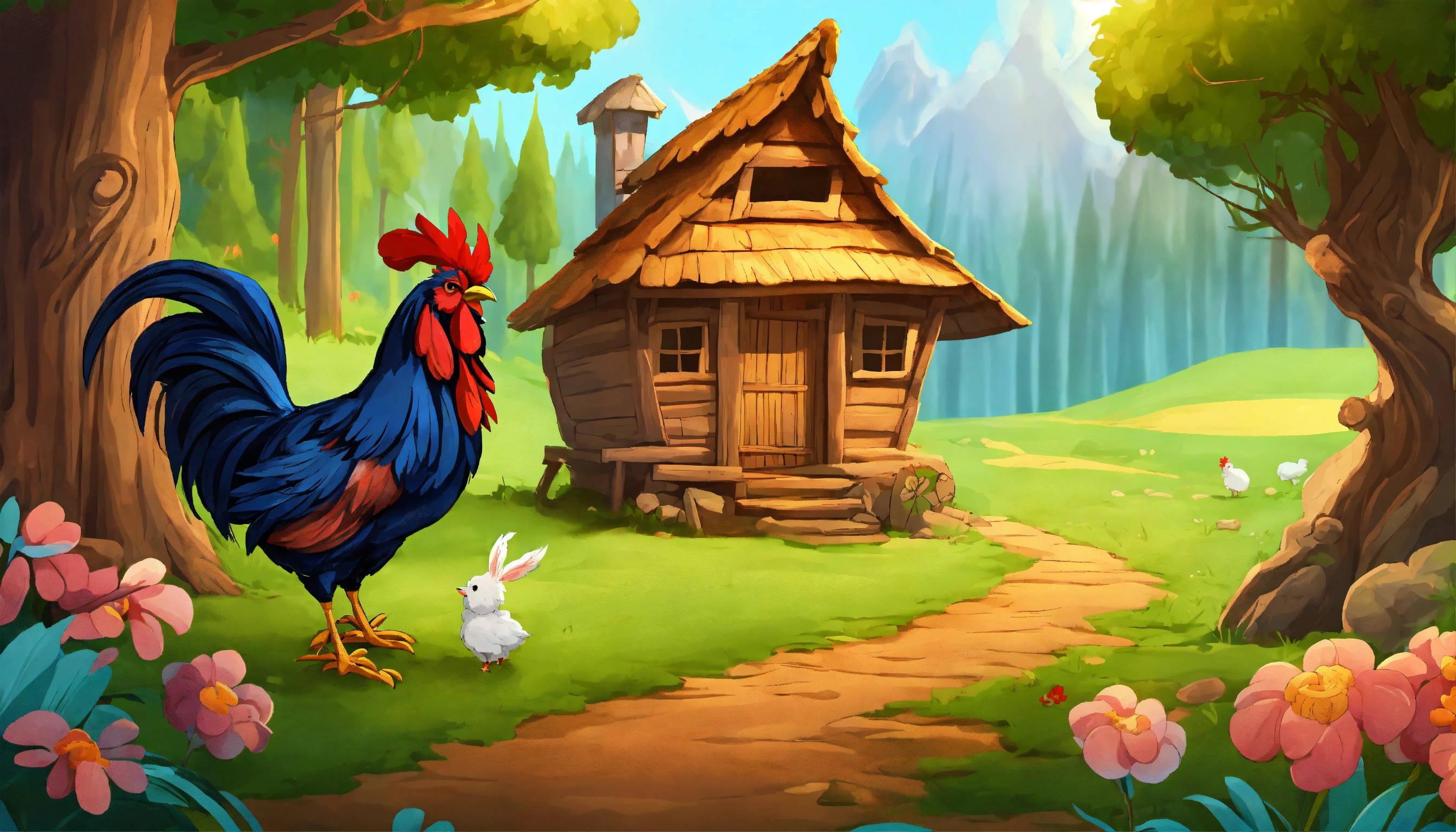Cartoon style a rooster and a grey rabbit near the wooden hut in the magical wood