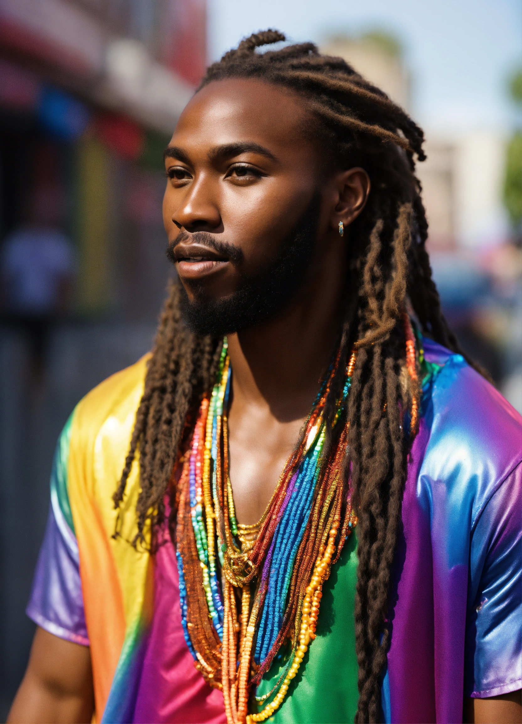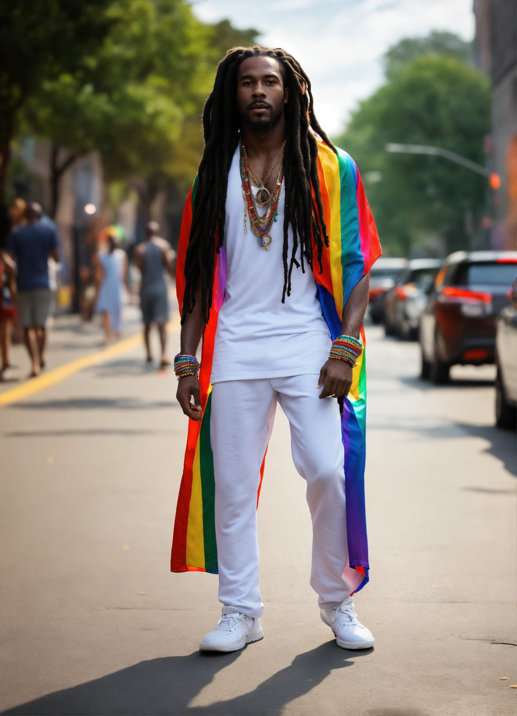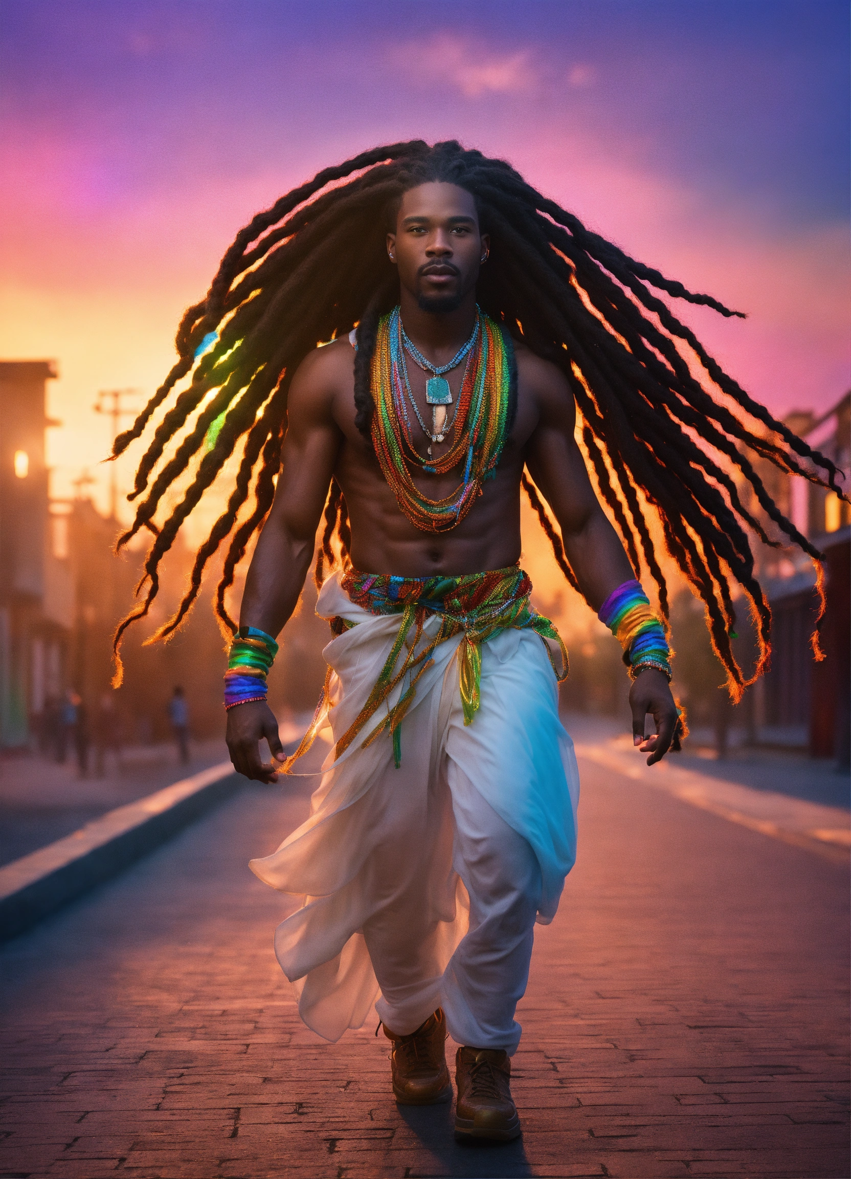 Black man with long flowing dreadlocks, well-built, 6' 5" tall, he has iridescent black skin that reflects all the colors of the rainbow, full body shot, striding up the street confidently, arms outstretched to the sides ready to hug someone, looking directly into camera, wearing all white iridescent clothing, african style white iridescent clothing that reflects all the colors of the rainbow, 3d render