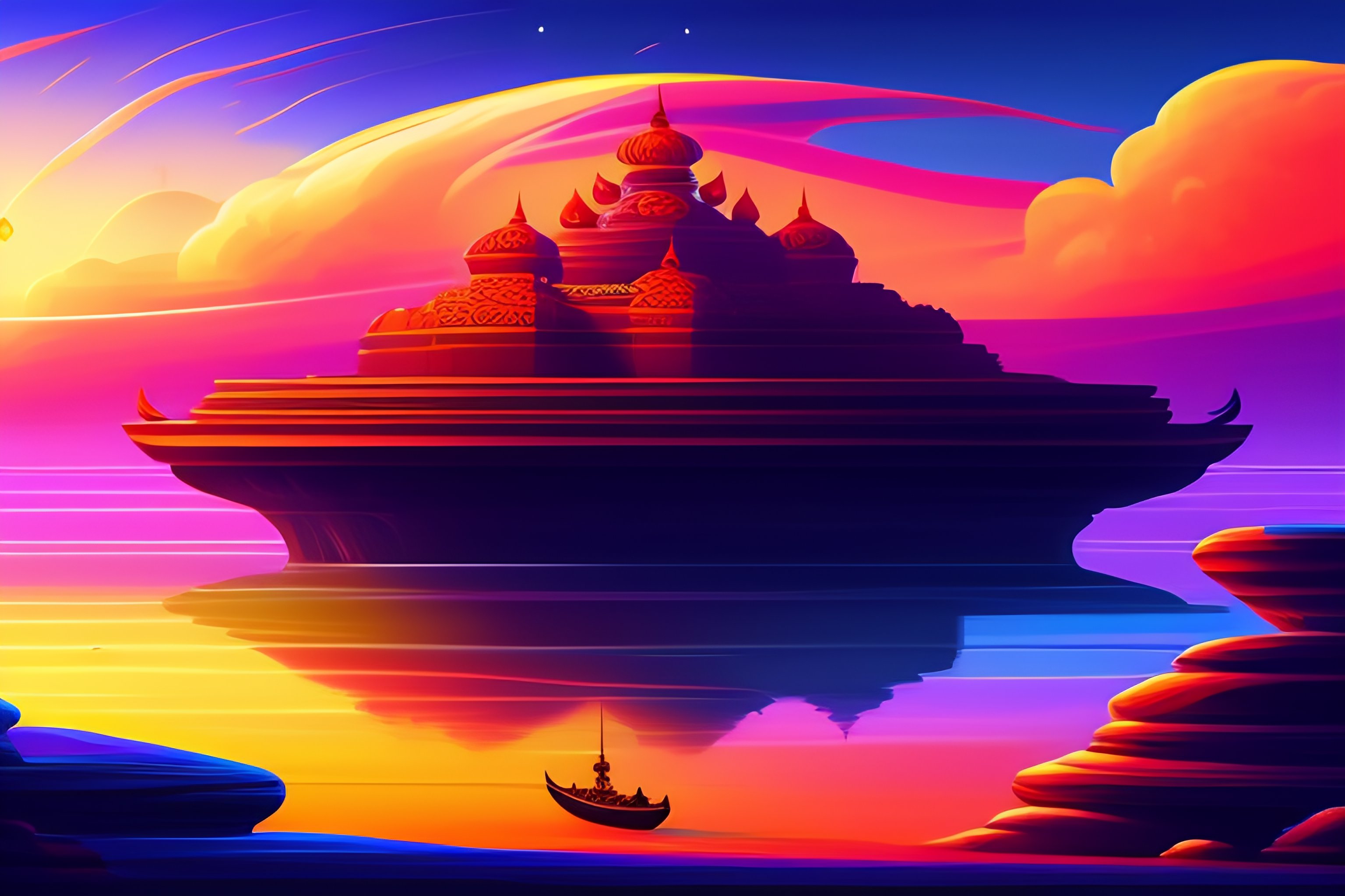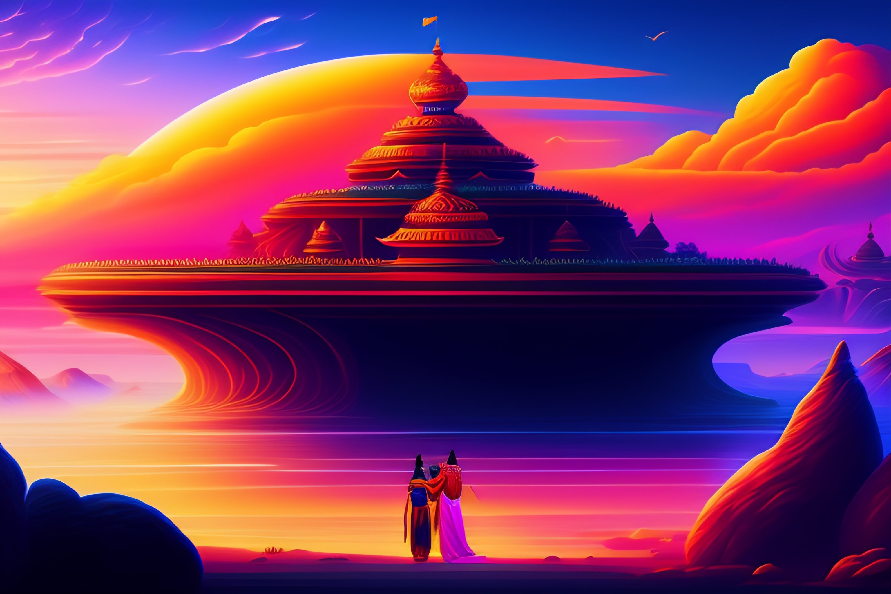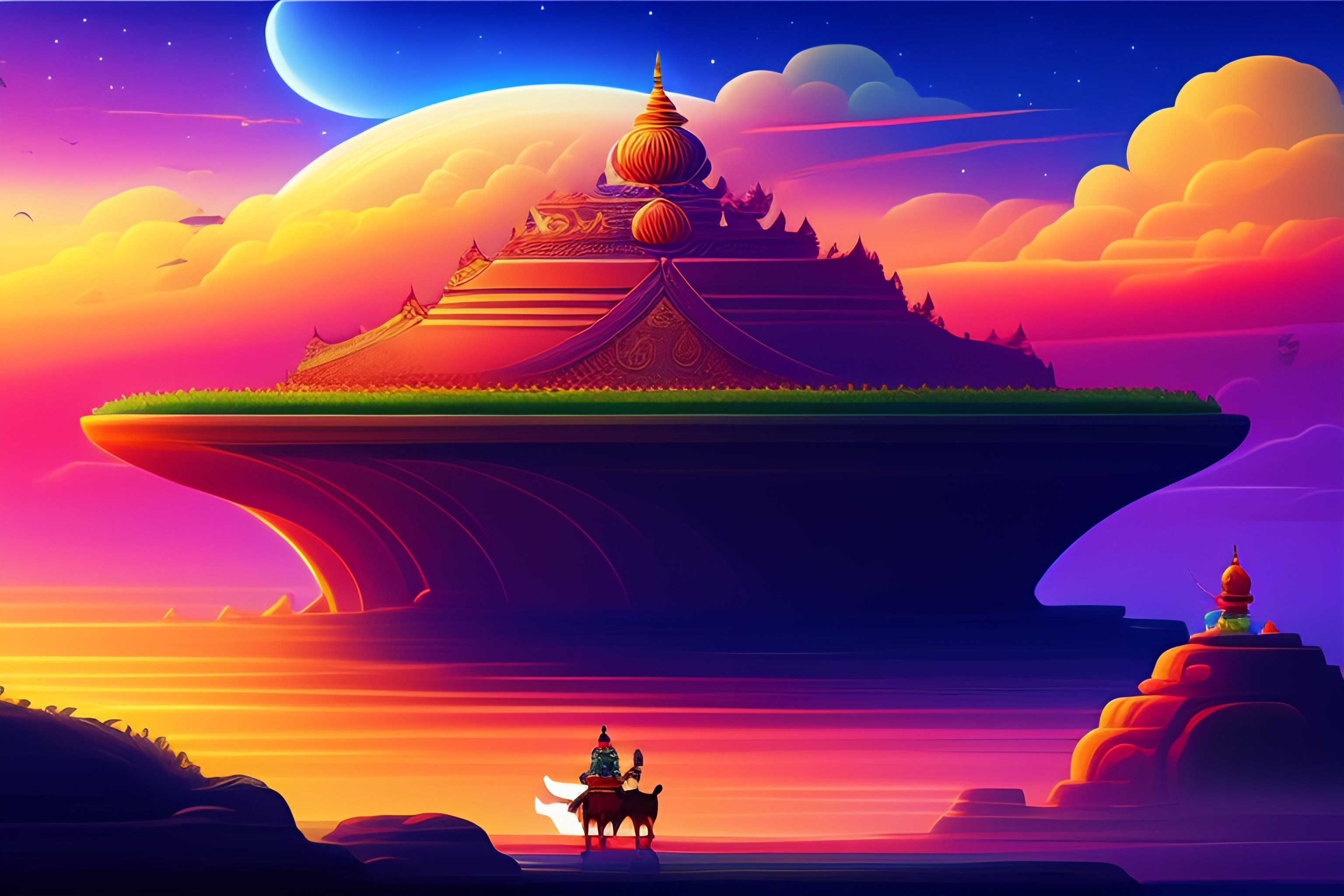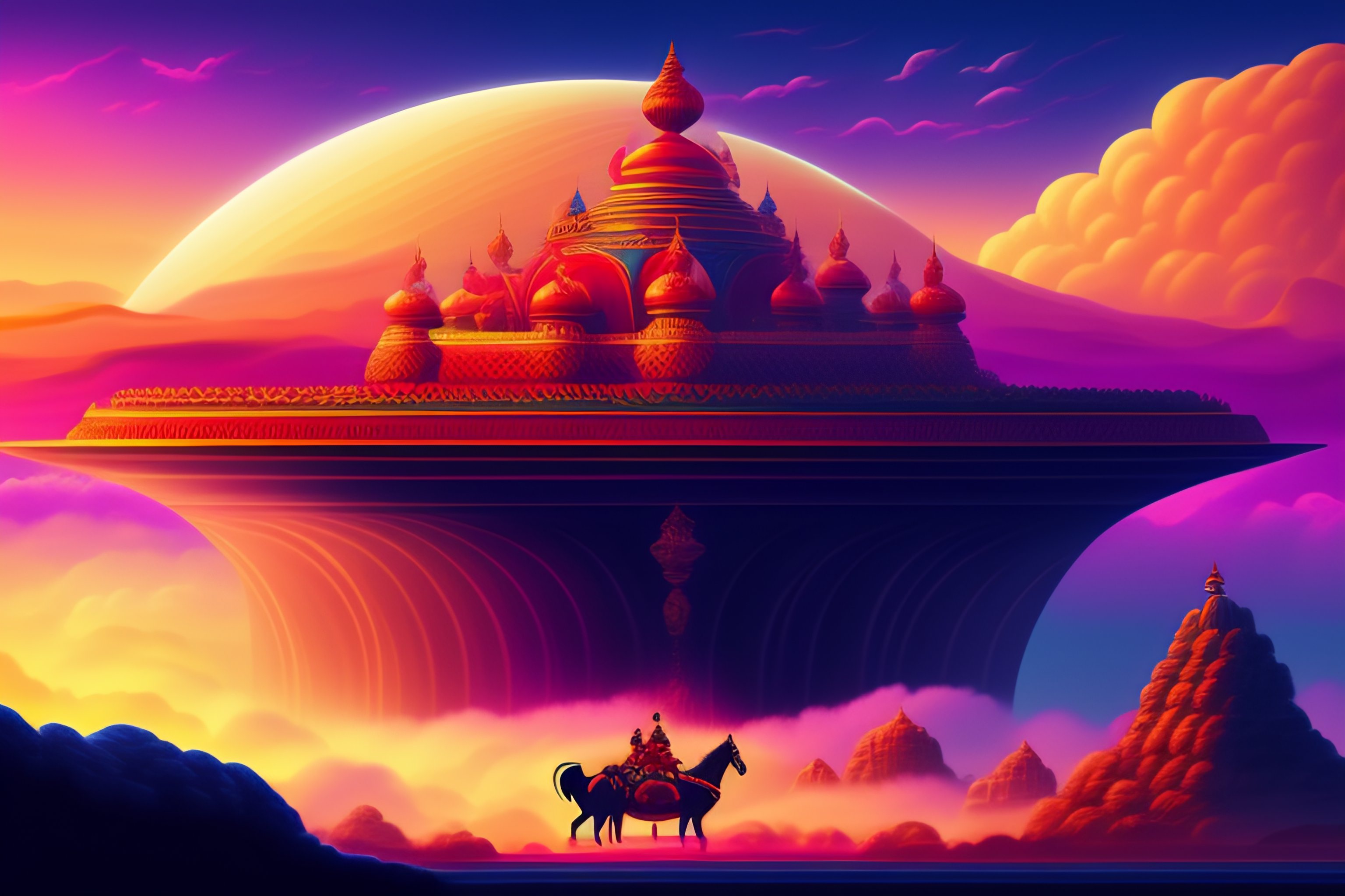 Illustration of ravana kidnapping sita on pushpak viman in an animated style, landscape and vegetation, epic scene, a lot of swirling clouds, high exposure, vibrant colors, detailed, uhd
