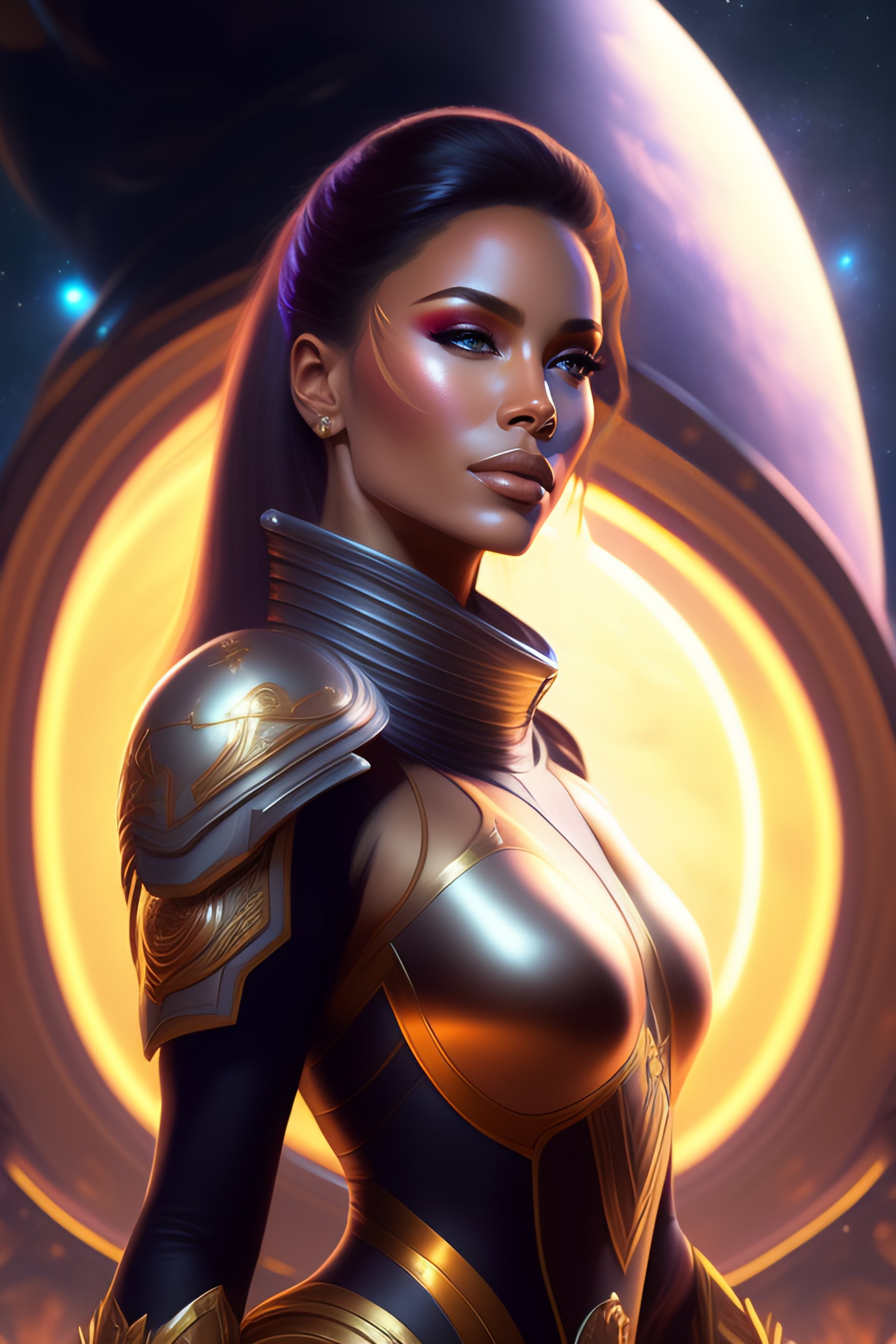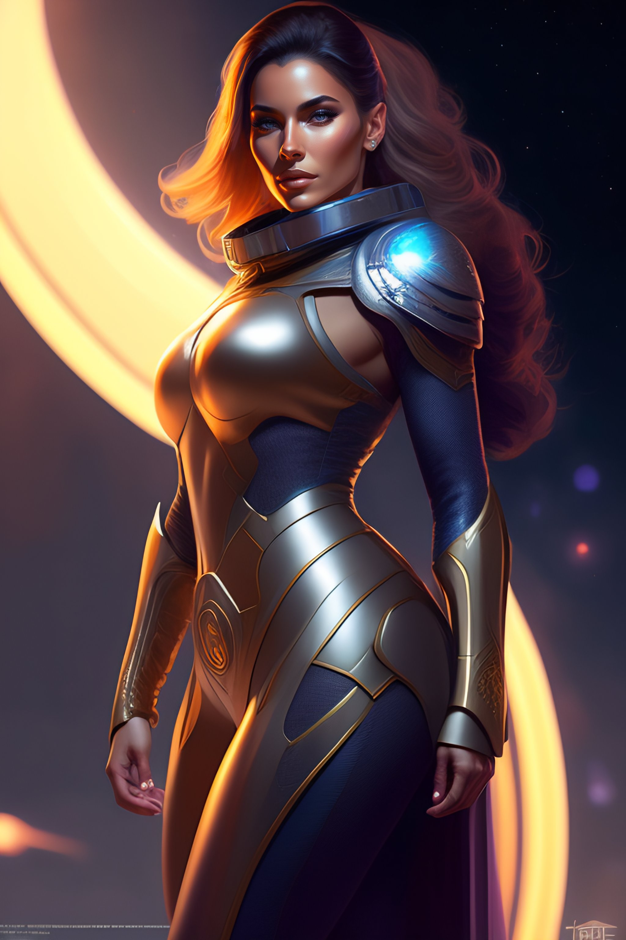 Portrait of a beautiful full body female space captain default pose, d & d, fantasy, front light, intricate, muscular, highly detailed, digital painting, artstation, concept art, smooth, sharp focus, illustration, art by simon bisley and greg rutkowski and alphonse mucha, 8 k, spaceship bridge on background