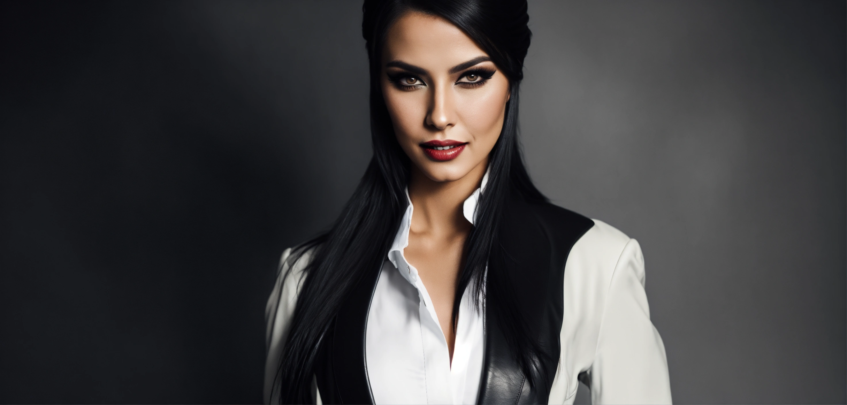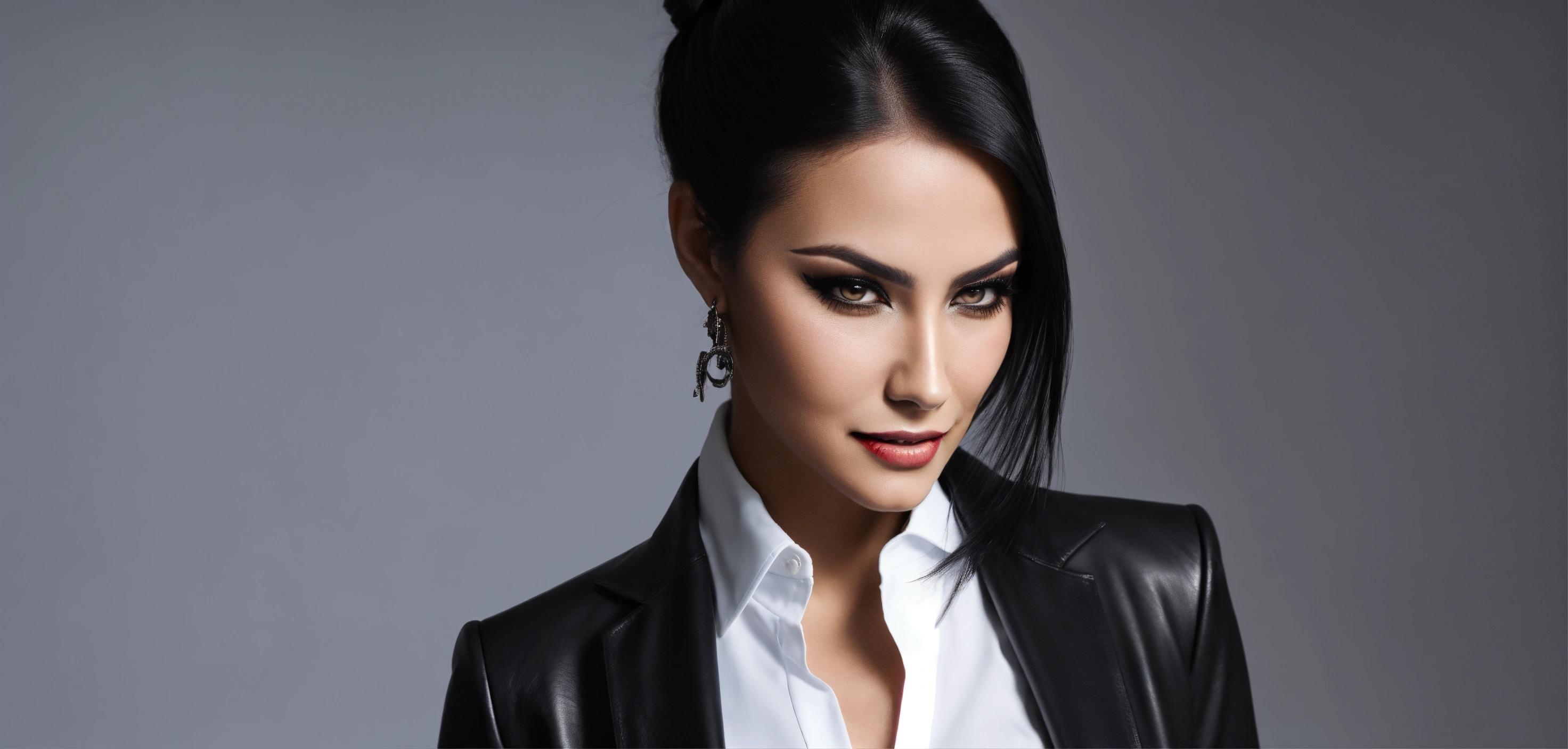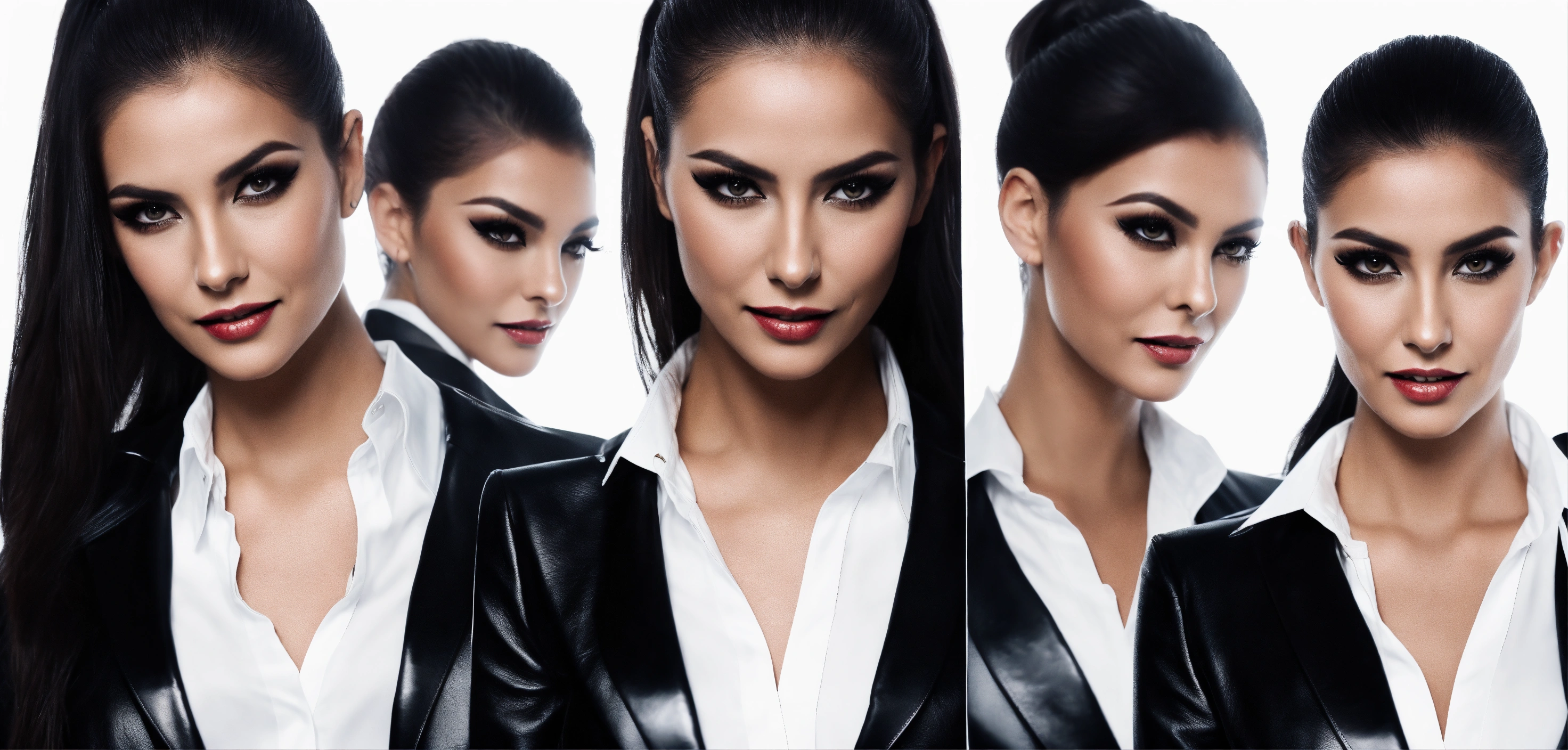 Cinematic look, stunning arab seductress woman business fashion model, arrogant evil smile from above, black straight hair very high ponytail, black leather business blazer jacket, white office shirt, eyeliner makeup, underworld vampire movie style, ultra-realistic; solid white background; no background