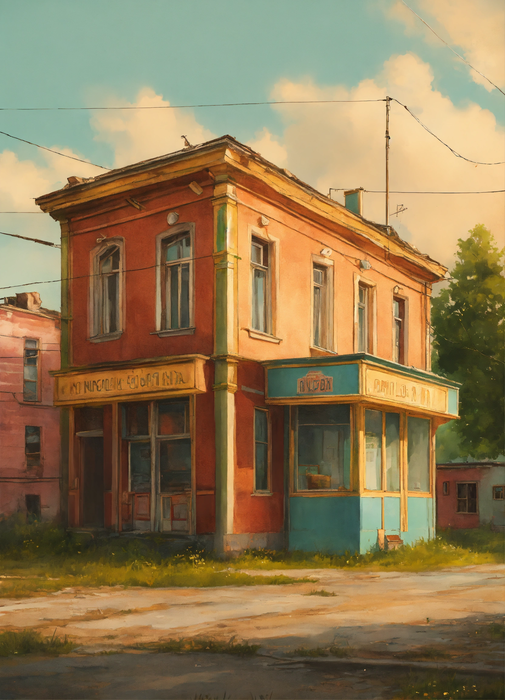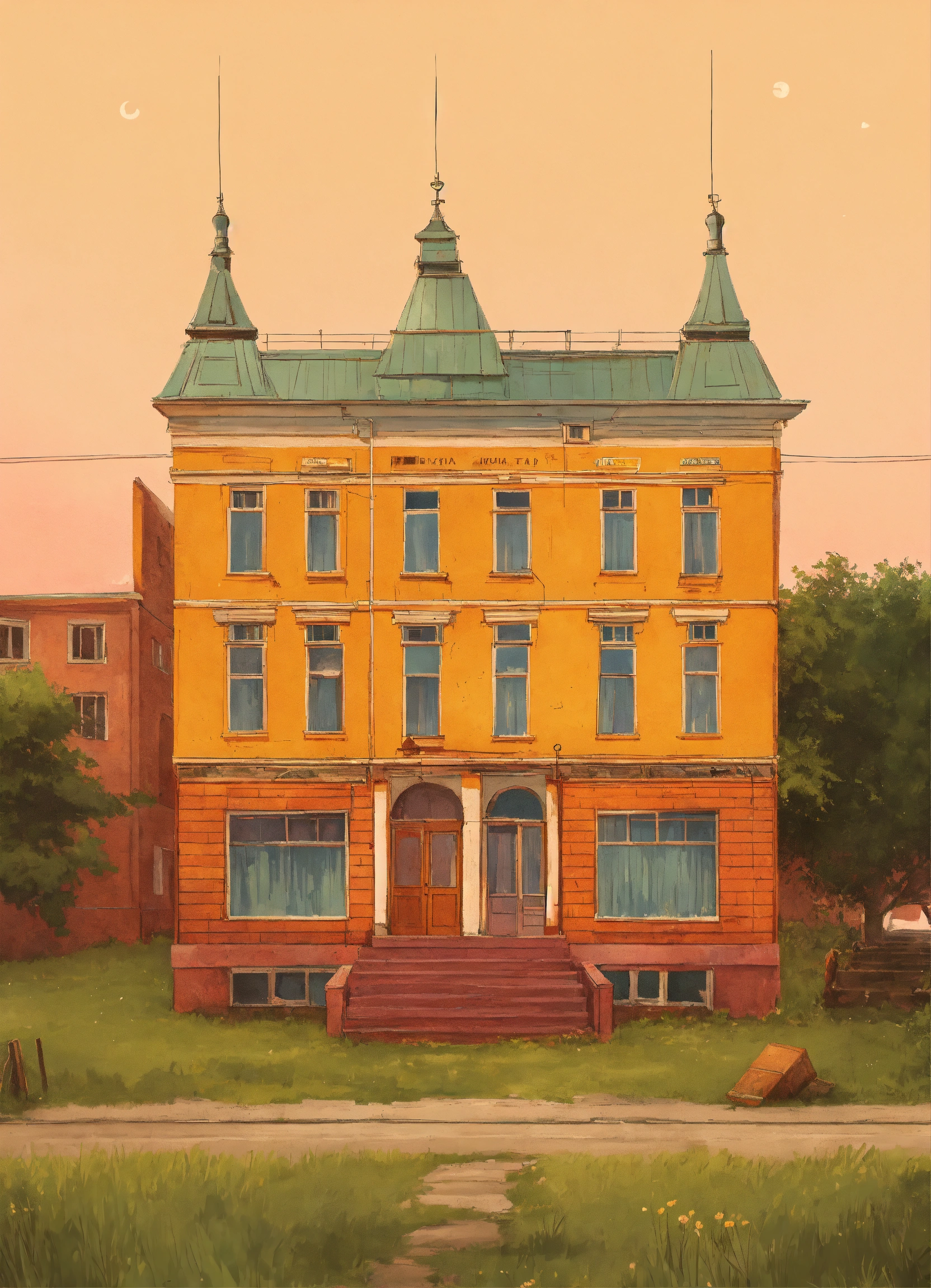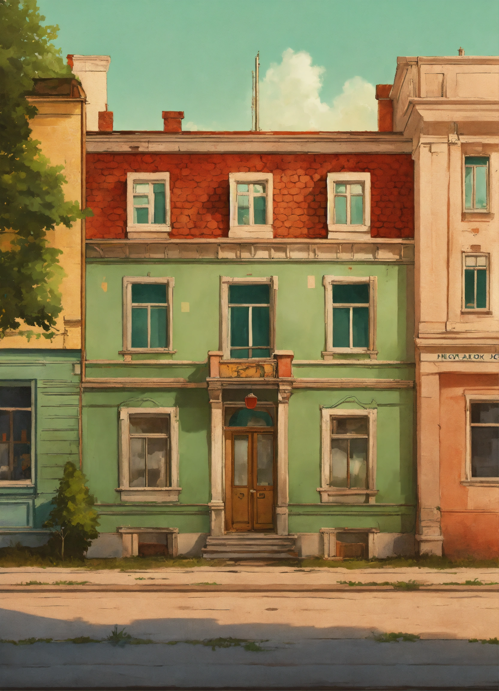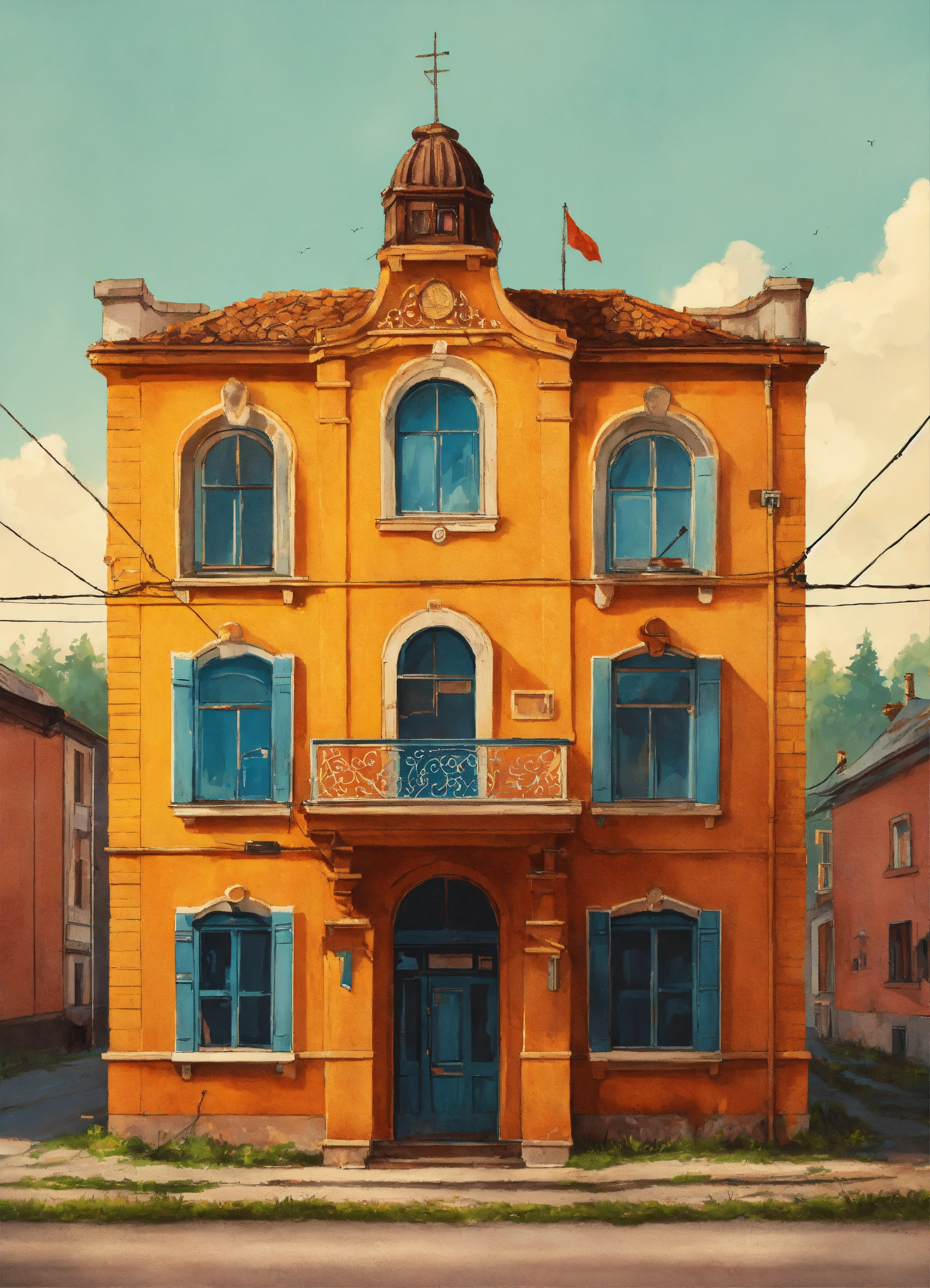 A background for a book cover in the style of wes anderson, something you can find in an abandoned, small town in east europe.
