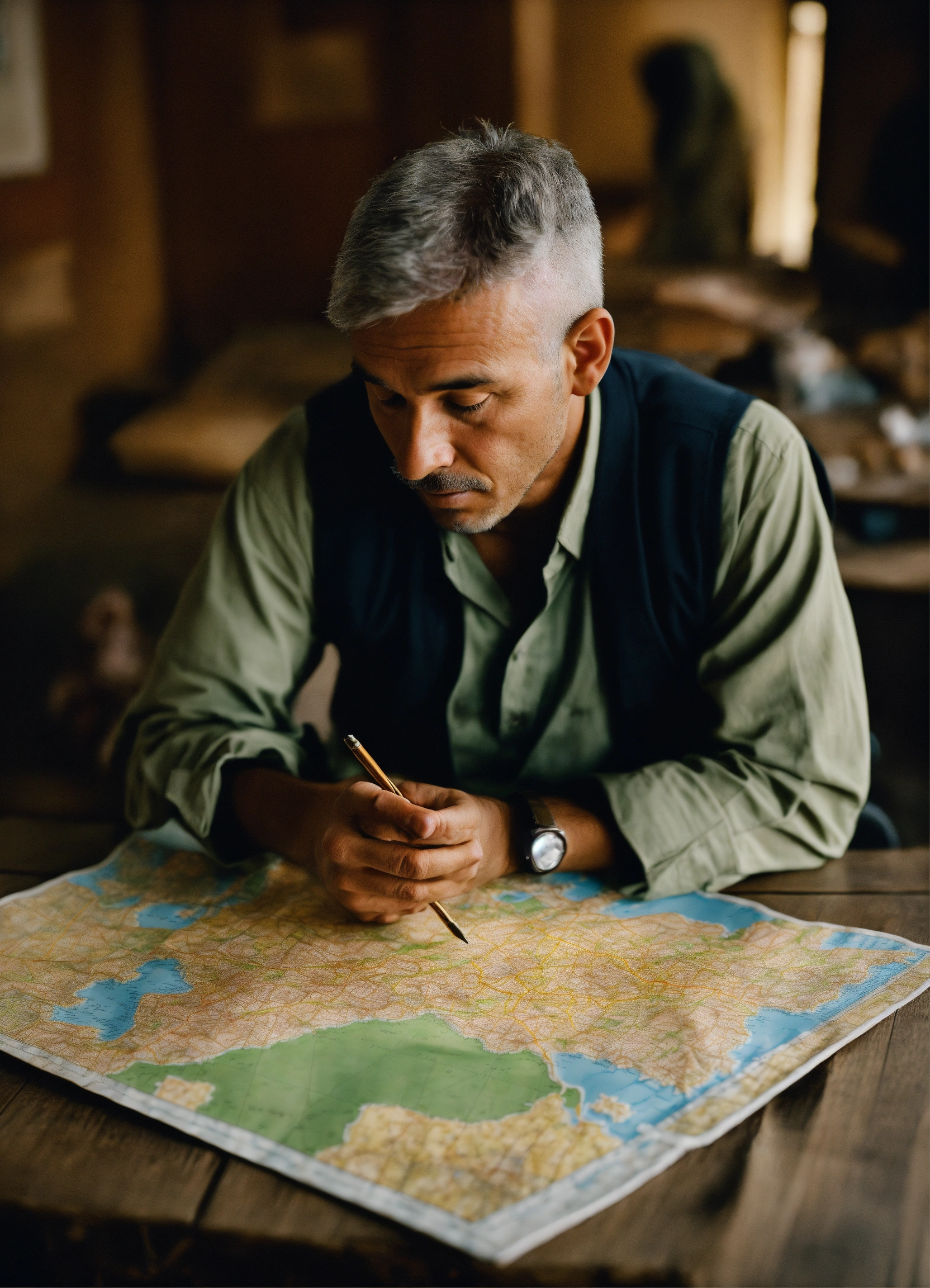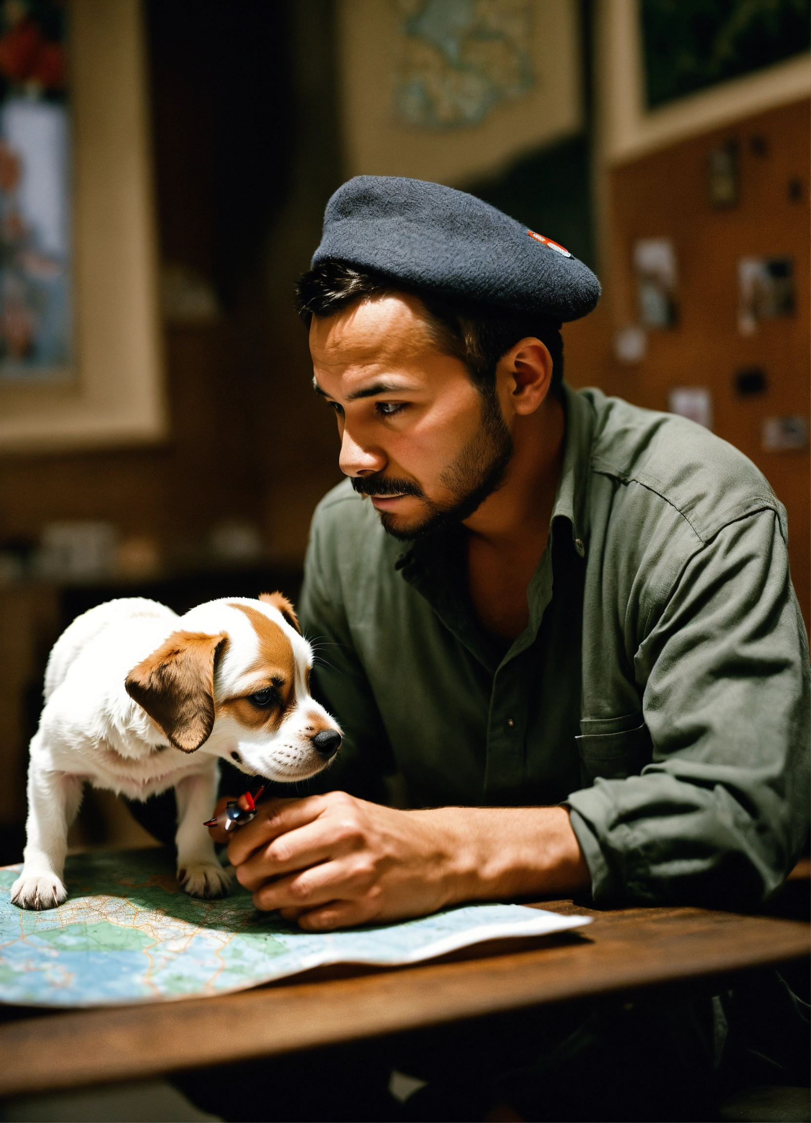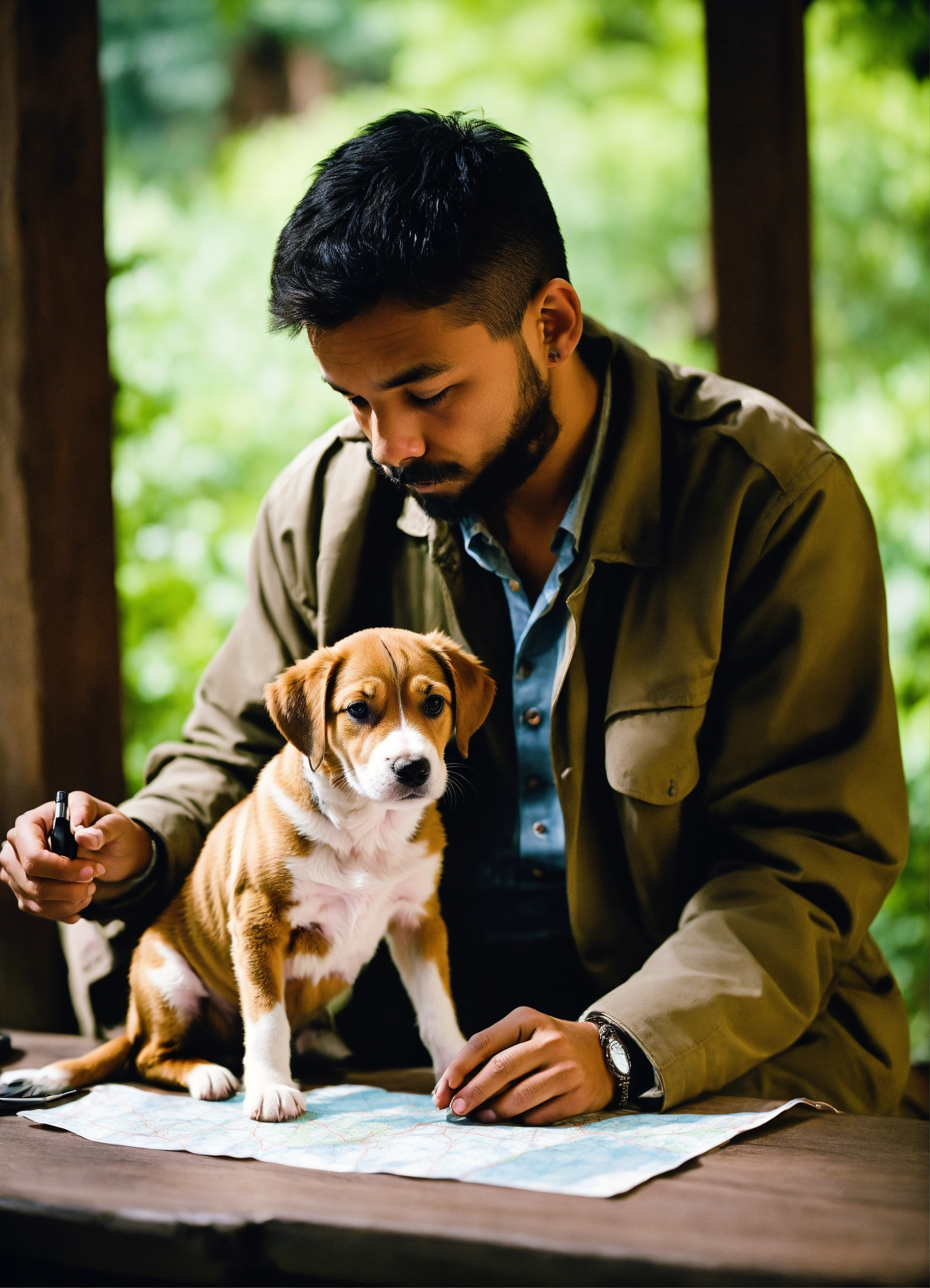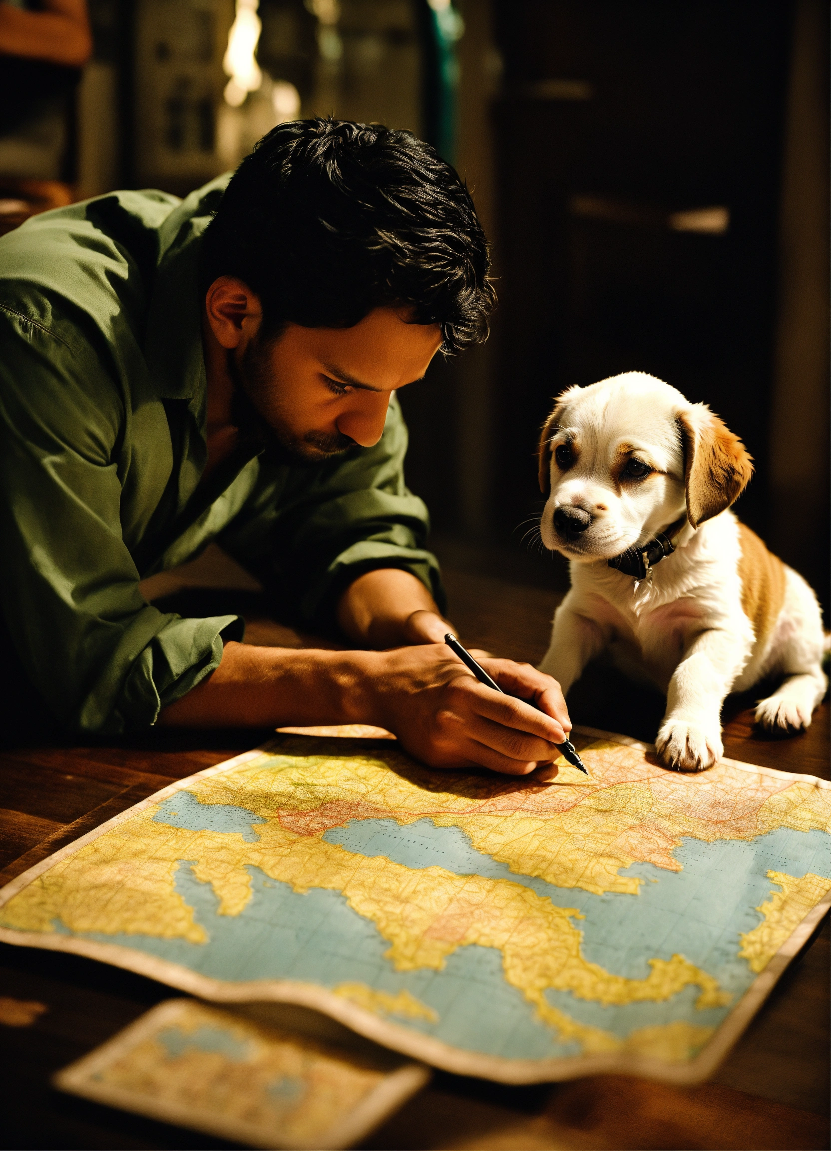 Generate a portrait photograph a man consults a map, the map is on a table; on the table, near the map, there is a very cute puppy. the image should emulate being taken with a medium format film camera. the style and composition should be reminiscent of works by steve mccurry.
