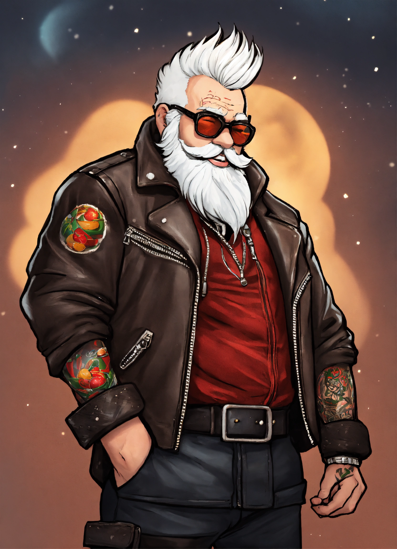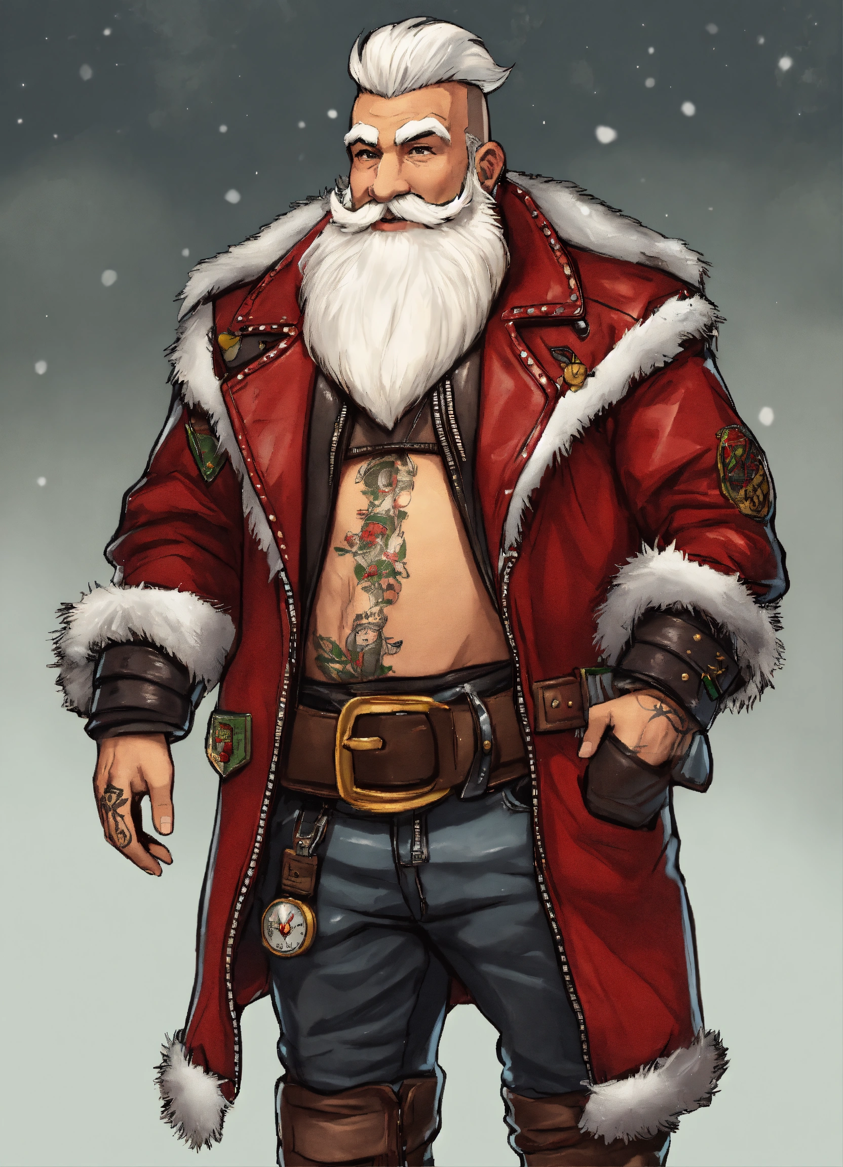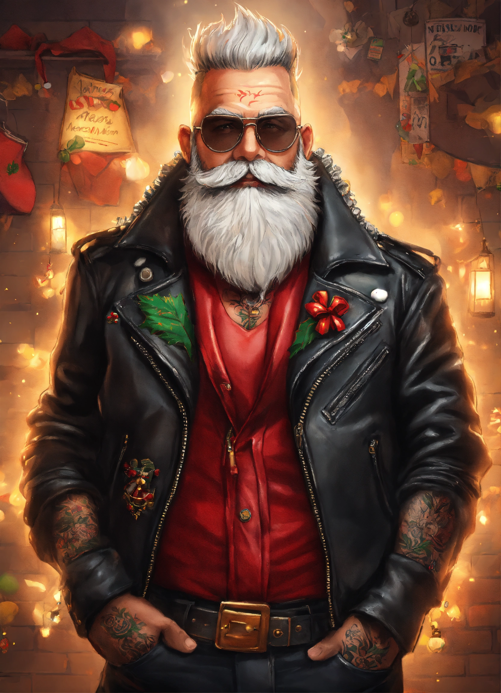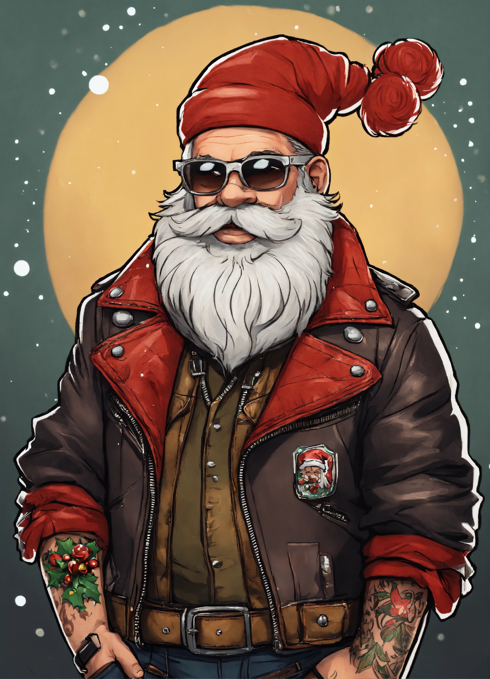Santa clause wearing leather jacket with tattoos and a mohawk cartoon