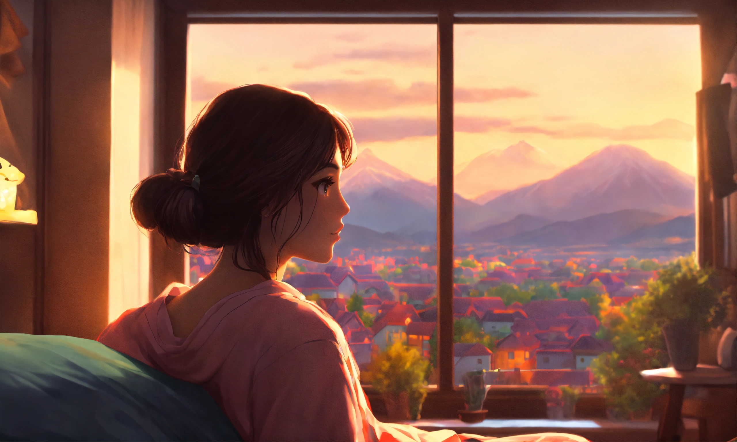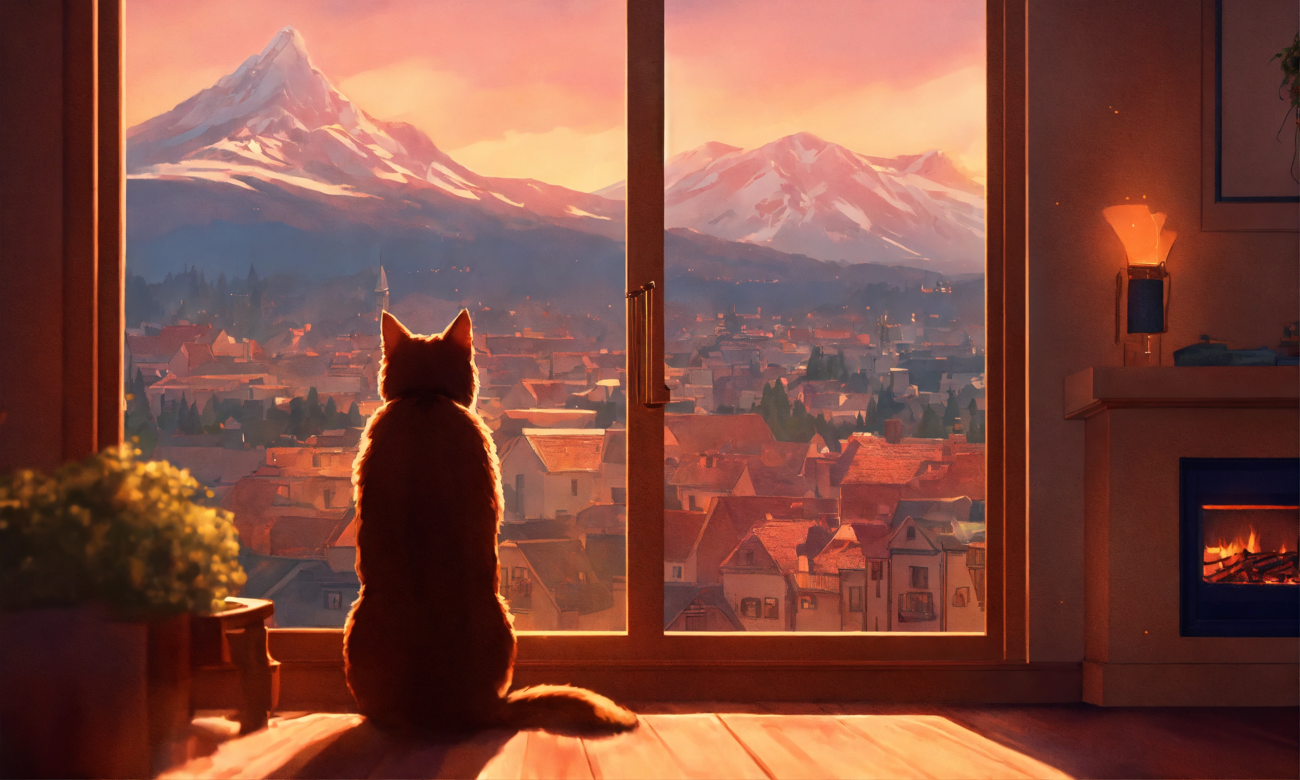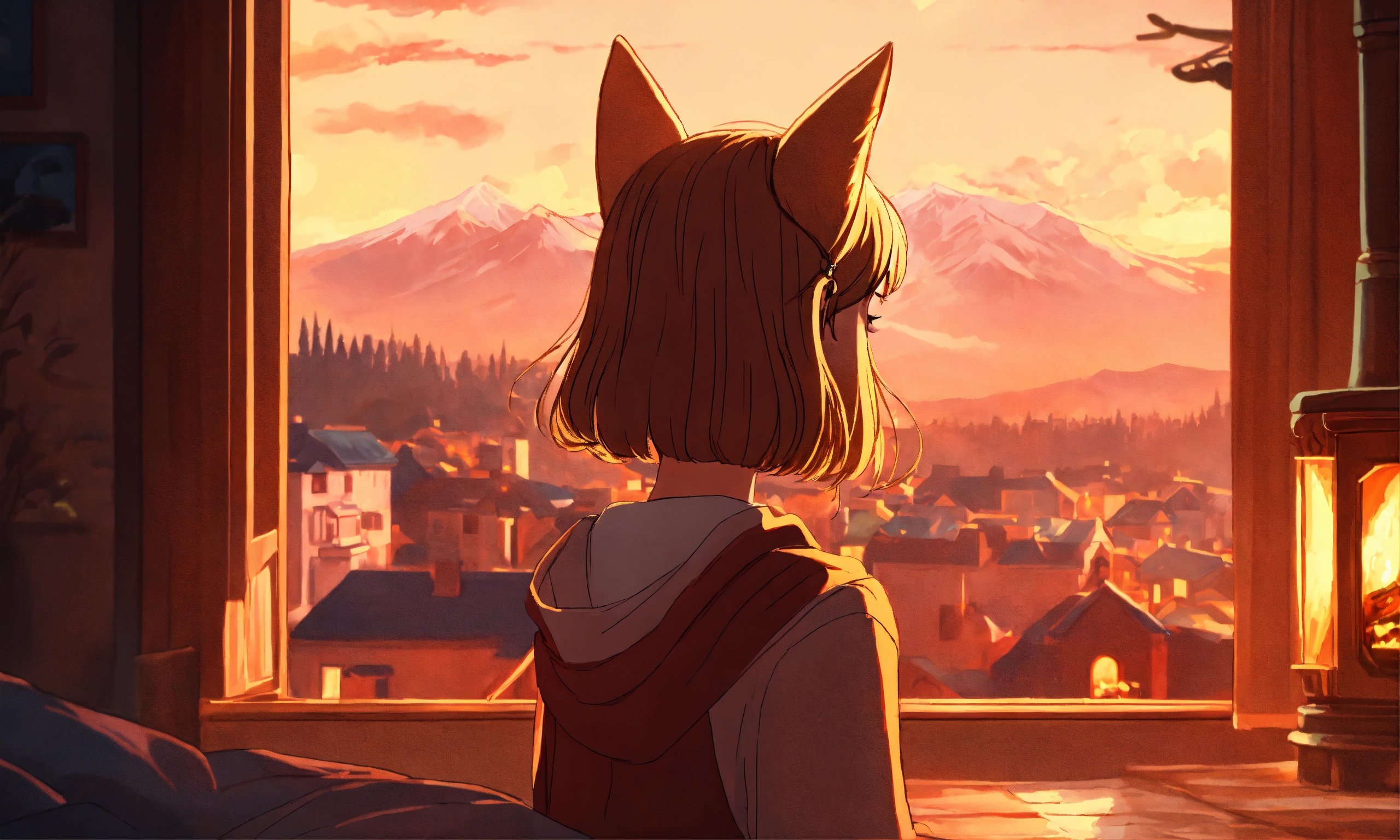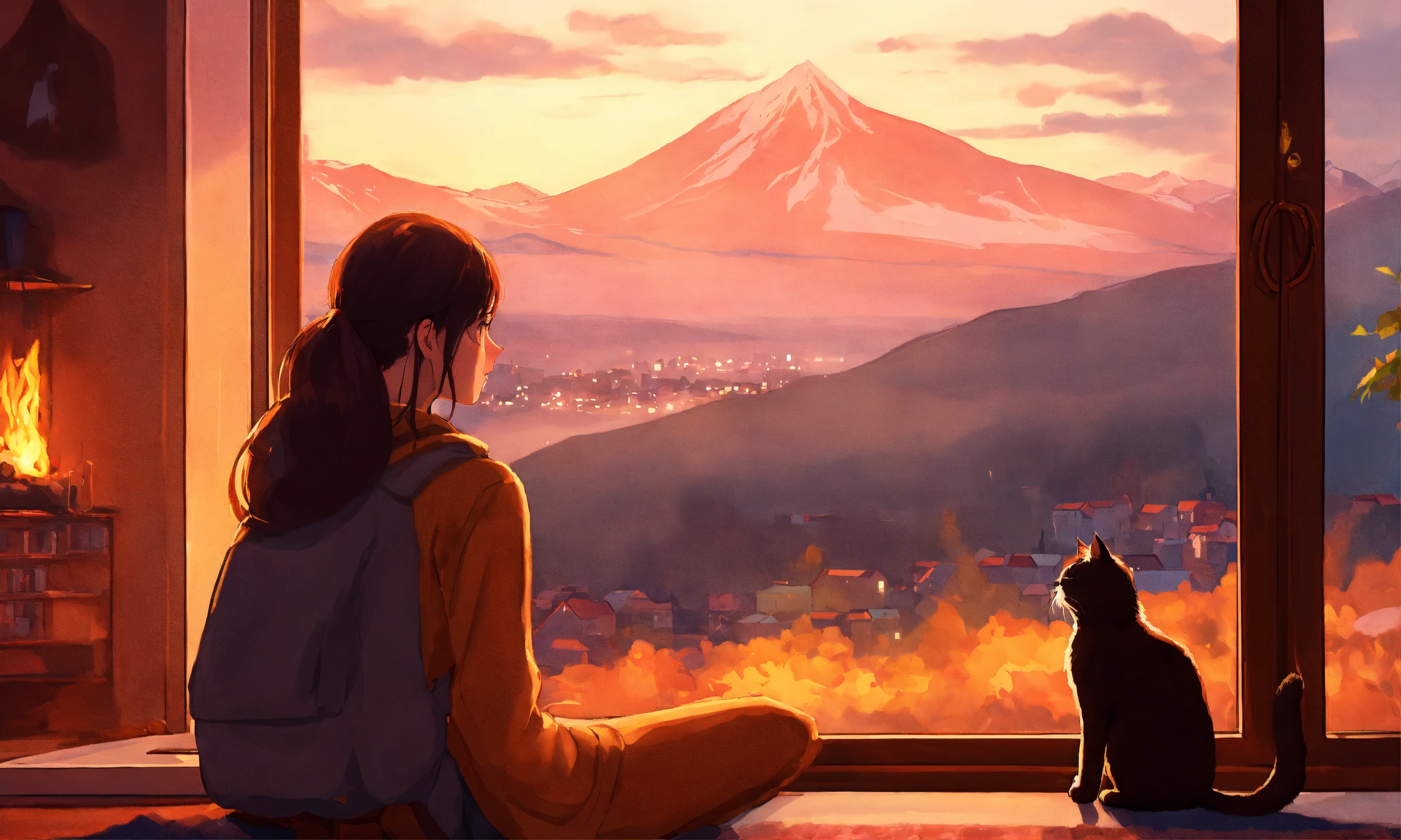 Lofi image with a beauty girl (the face from the side - it means more near) and cat in a kids room, with a fireplace, thru the window you can see mountains and a city, 8k, high quality