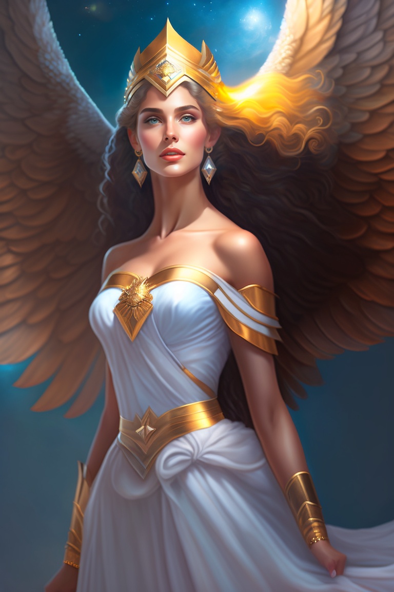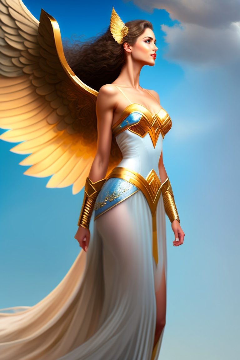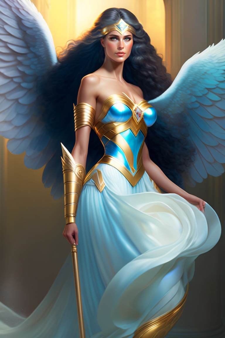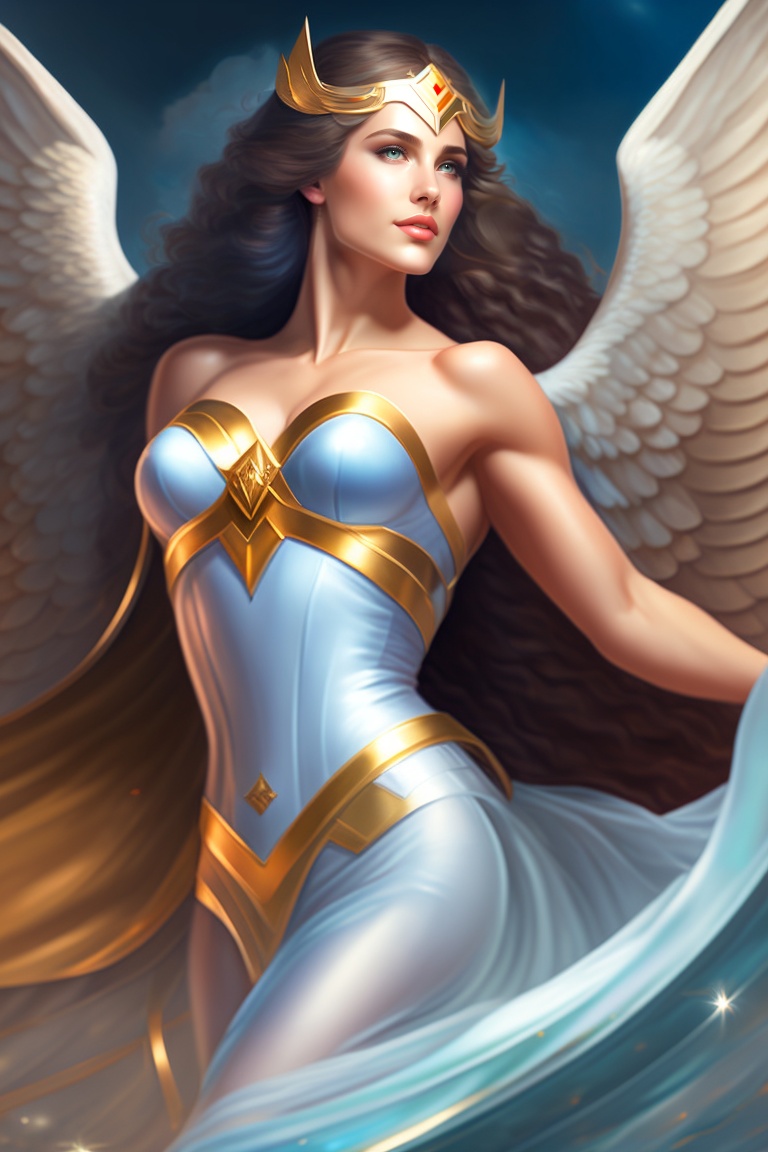 Serenity-angel goddess-beautiful young face-young woman-outstanding-transparency-painting-detail-mythological-creature-wonder woman attire-full body, 8k