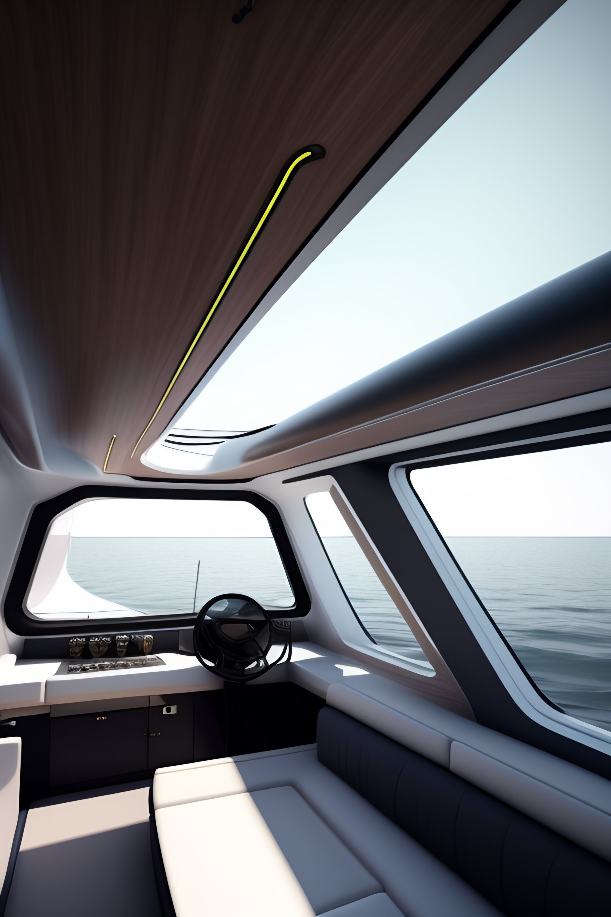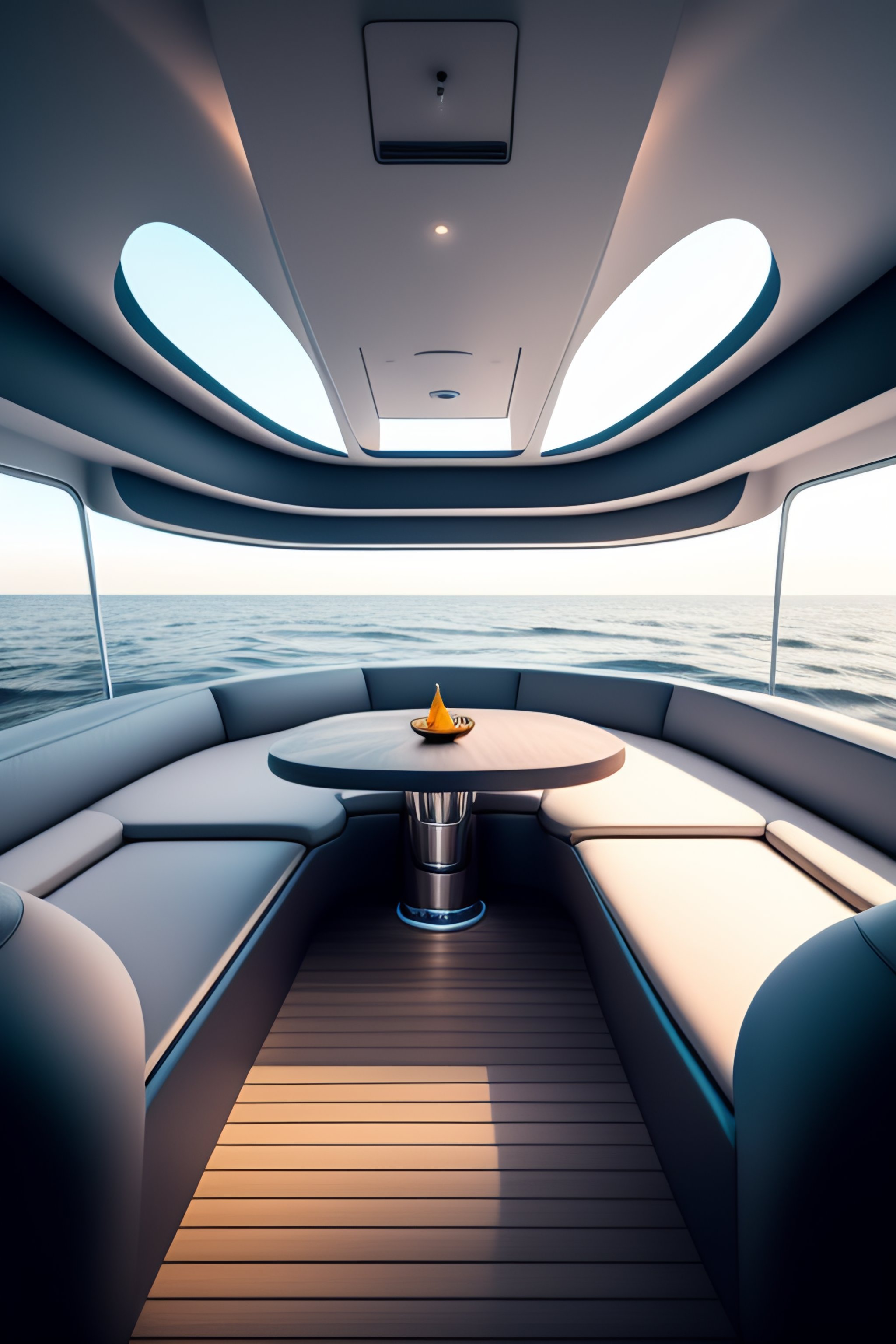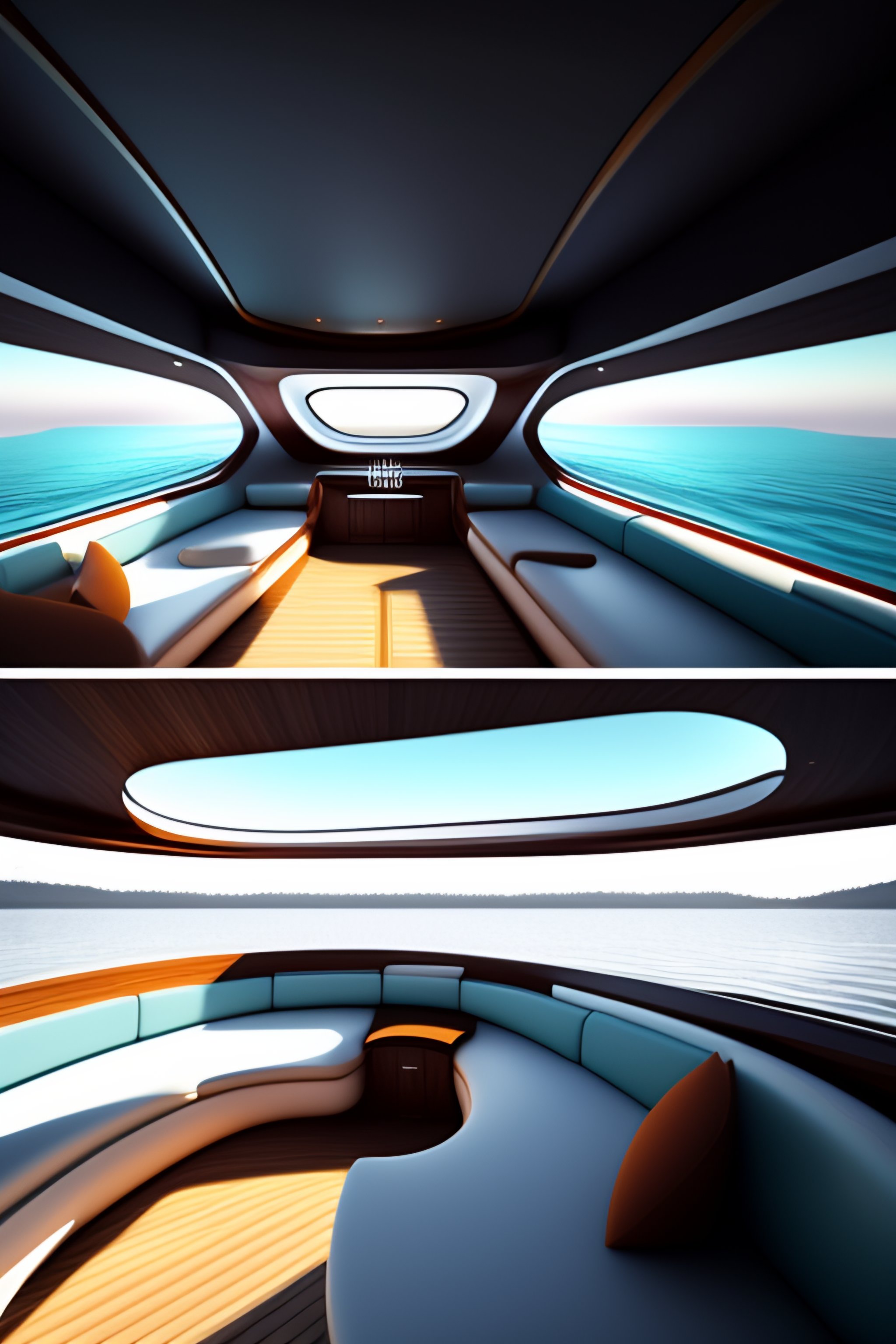 Seamless equirectangular projection of a 360 view inside of a boat made by zaha hadid and people inside not scary