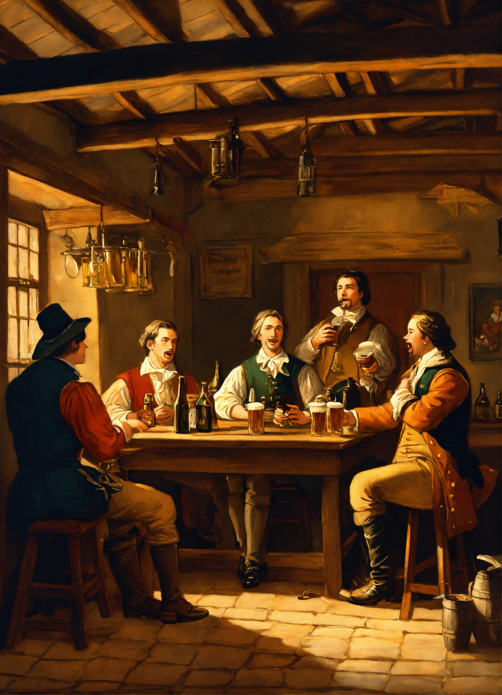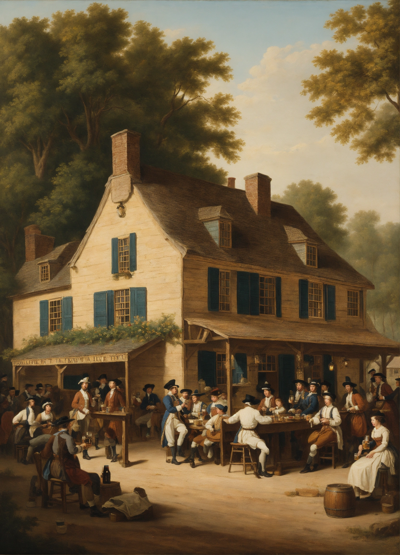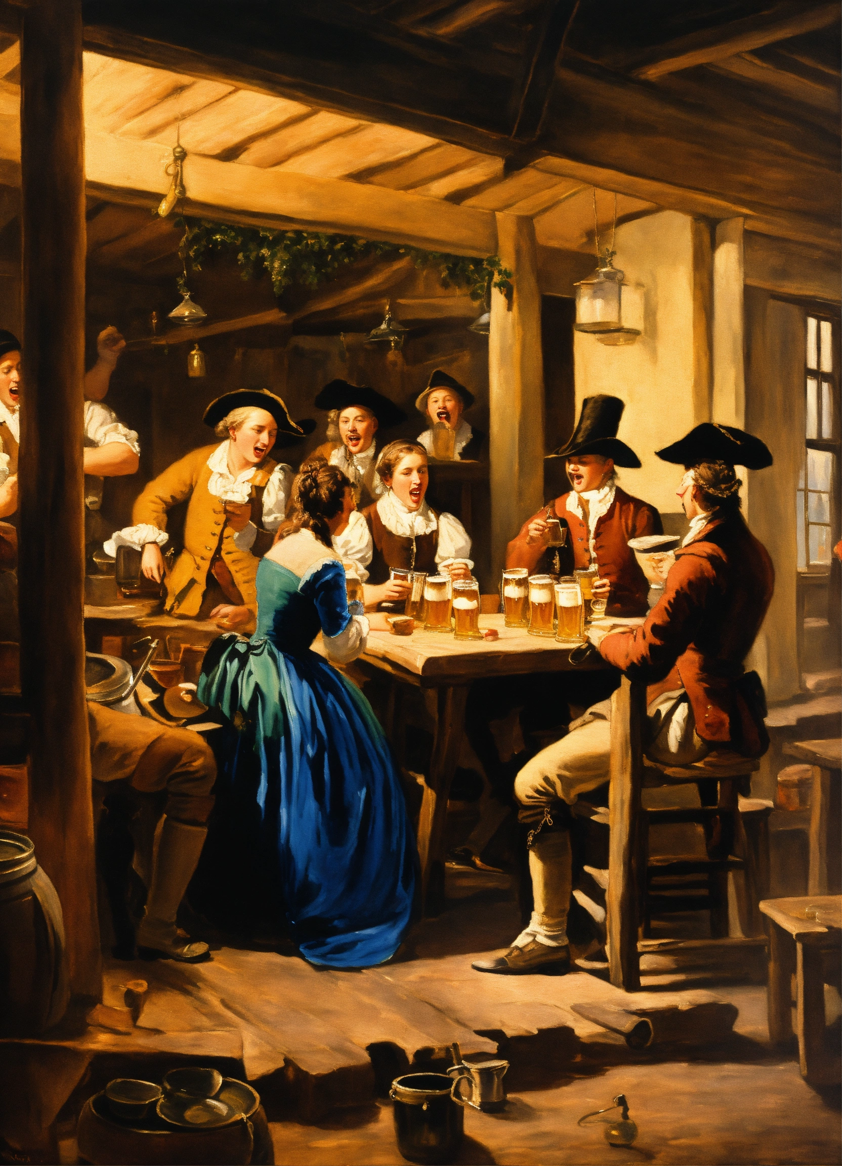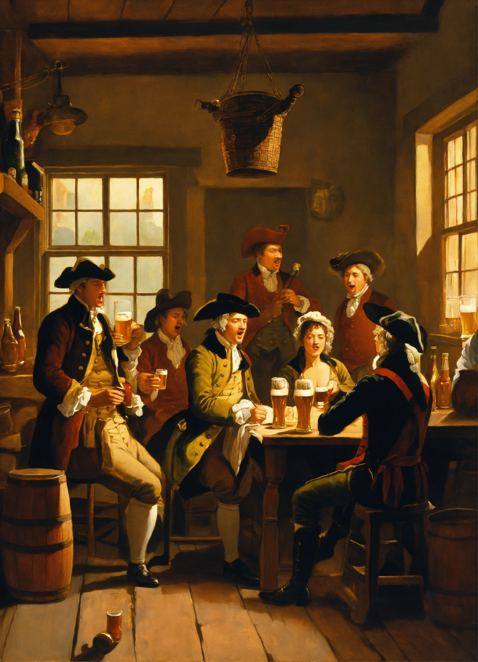 A painting of a colonial tavern with people drinking beer and singing